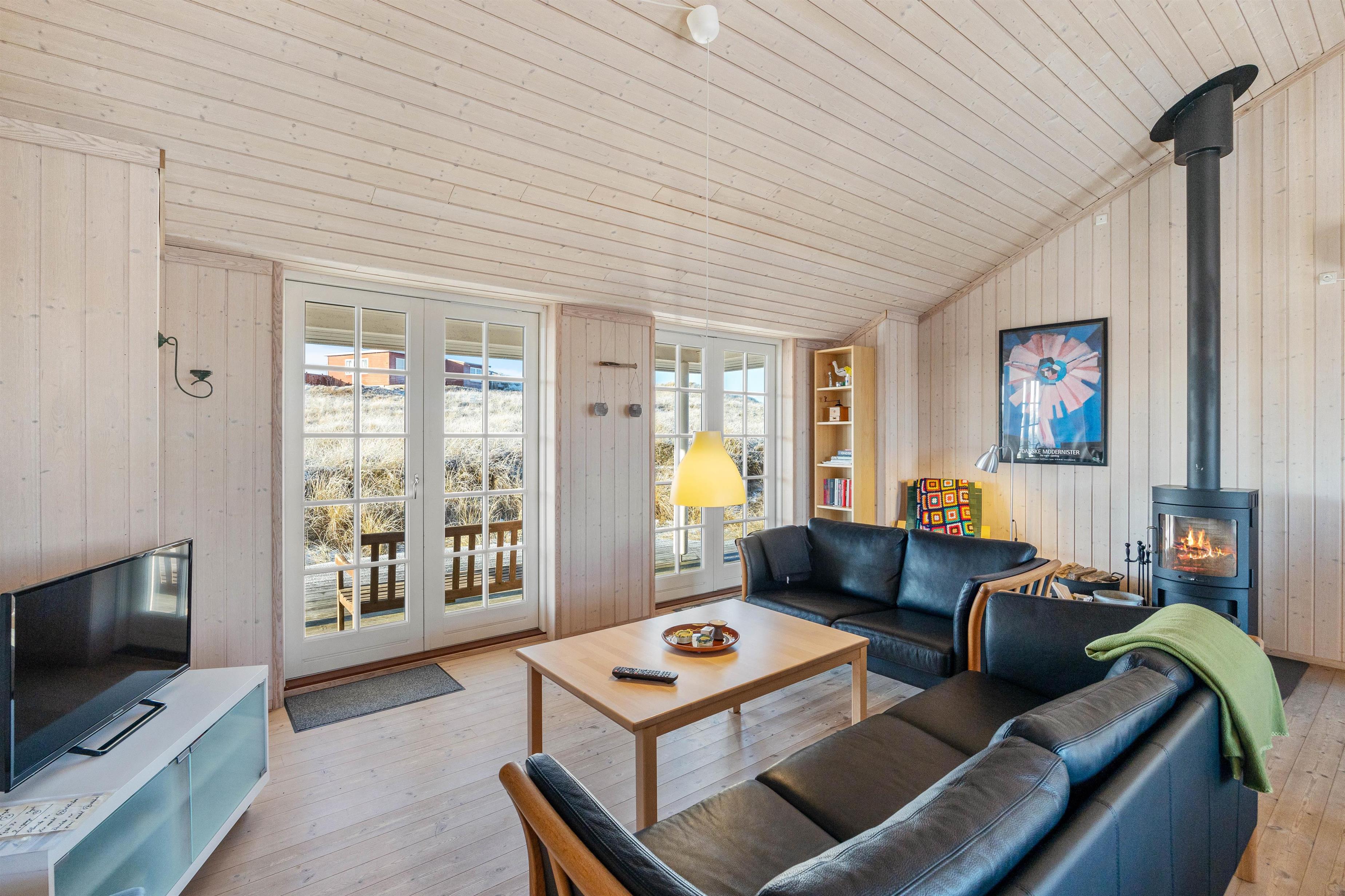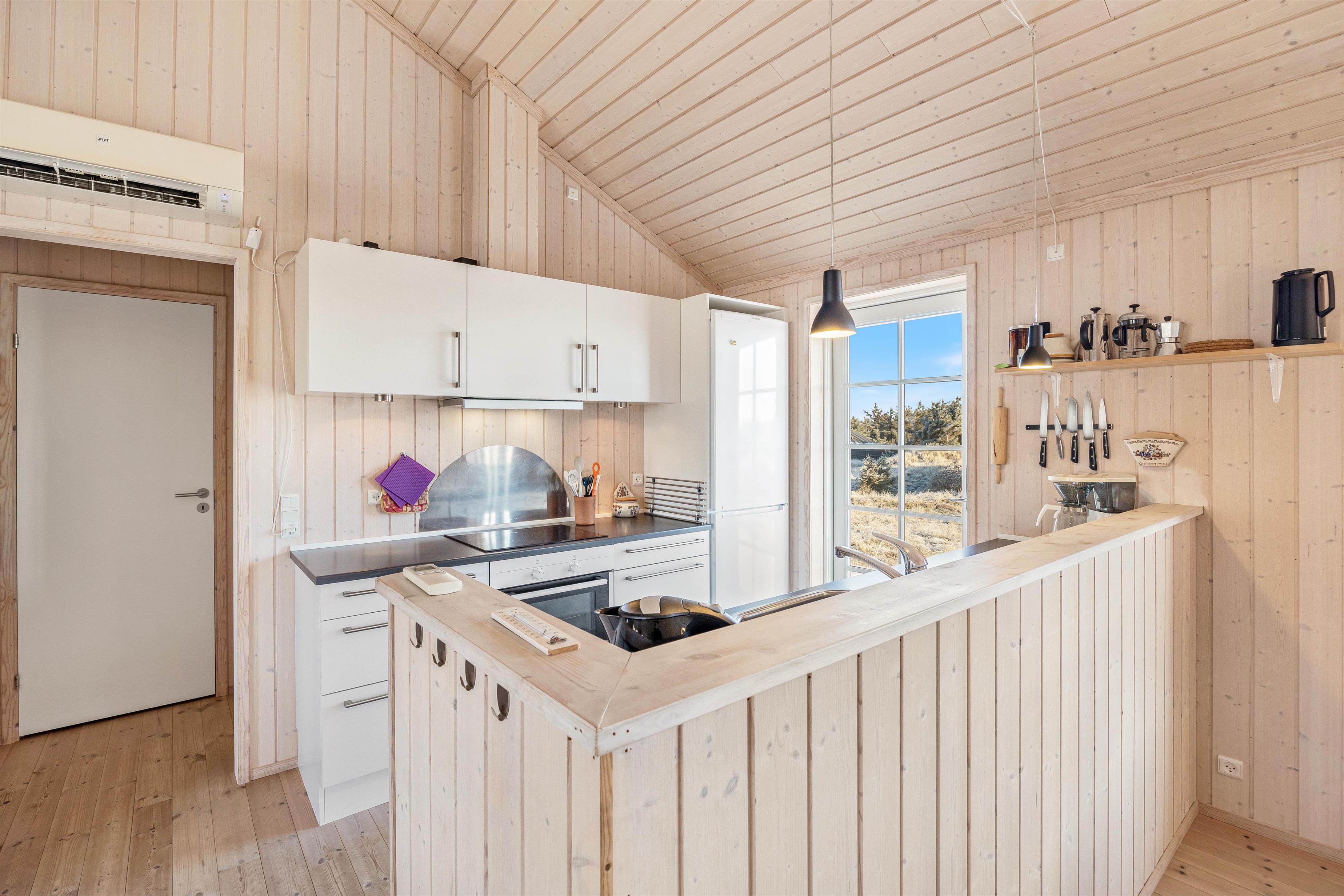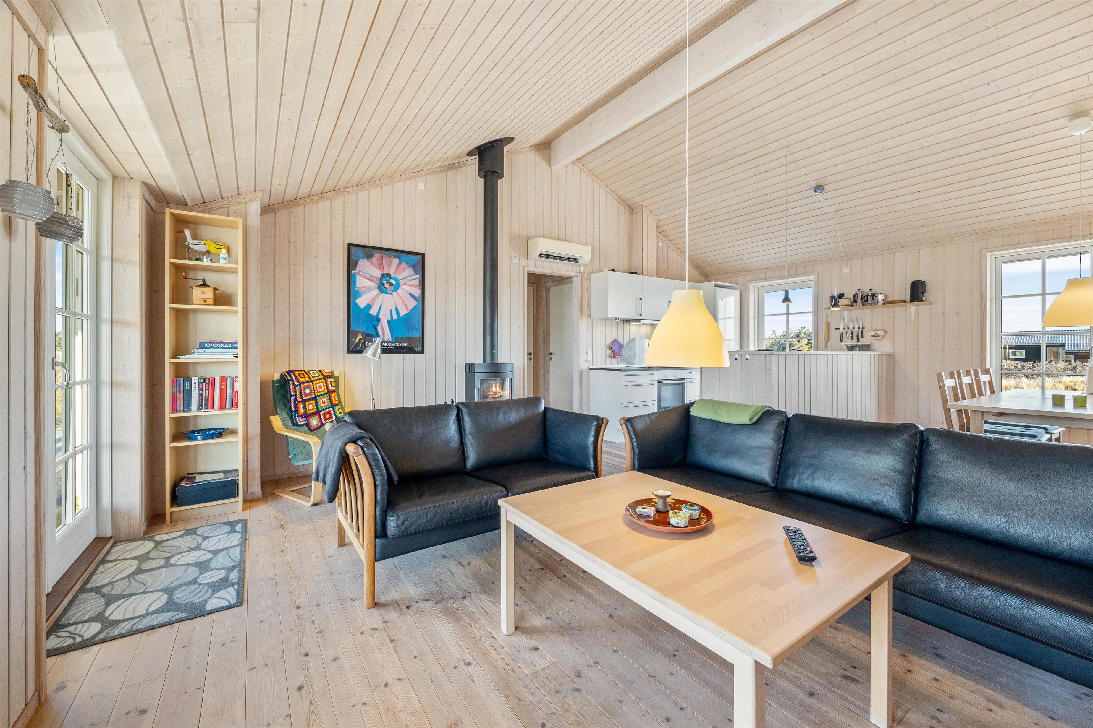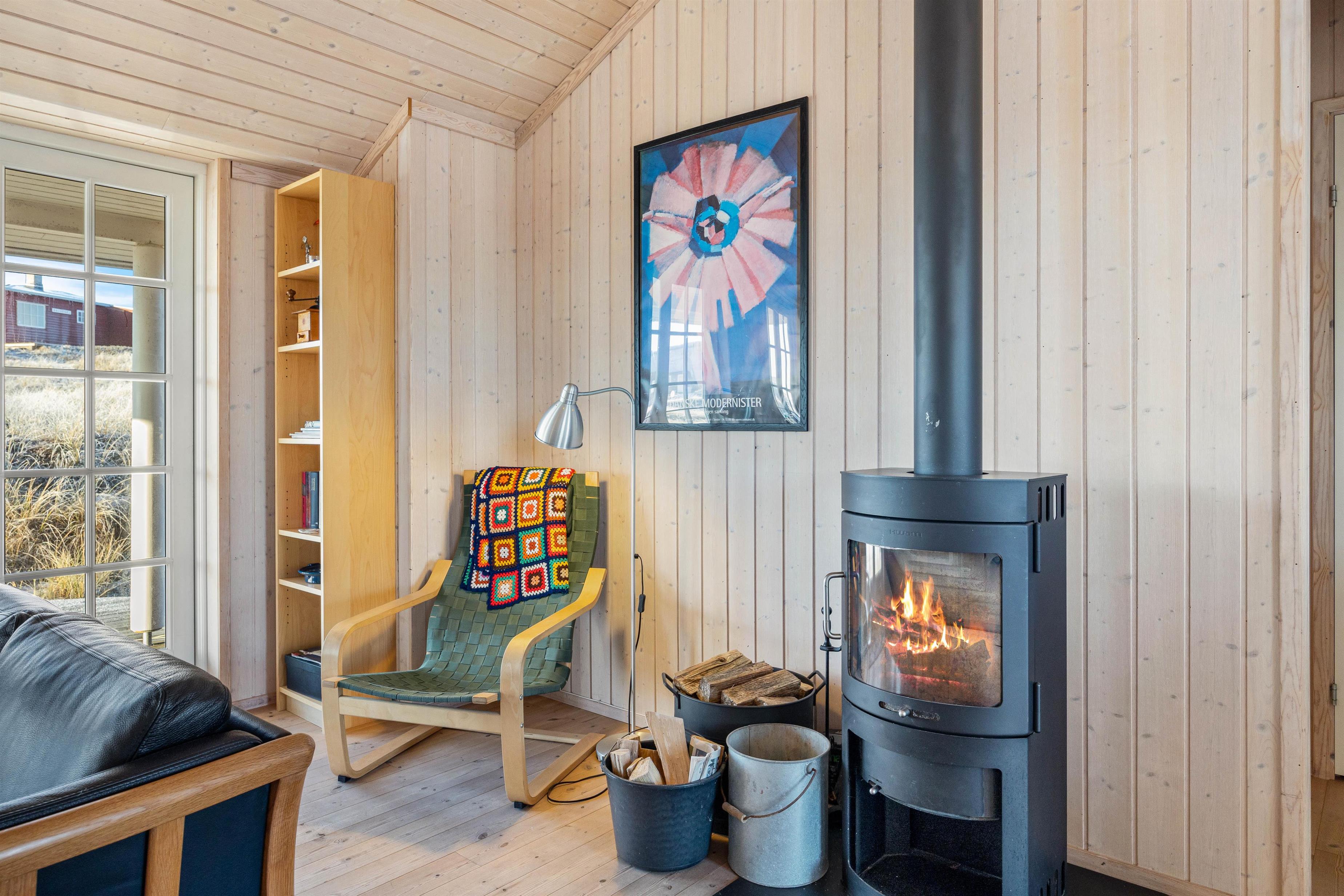 Sommerhuset har tre gode og lyse soveværelse og et stort badeværelse med vaskemaskine. Midt i huset ligger stue og køkken/alrum, et stort og flot rum med masser af lys. Her er tilmed også loft til kiå, hvilket gør rummet endnu mere attraktivt og indbydende. Det er også her I stuen, hvor I finder husets brændeovn, som altid er klar til at skabe en hyggelig og varm atmosfære. Hvis I ikke ønsker at bruge brændeovnen, er den effektive luft-til-luft varmepumpe for et behageligt indeklima året rundt.