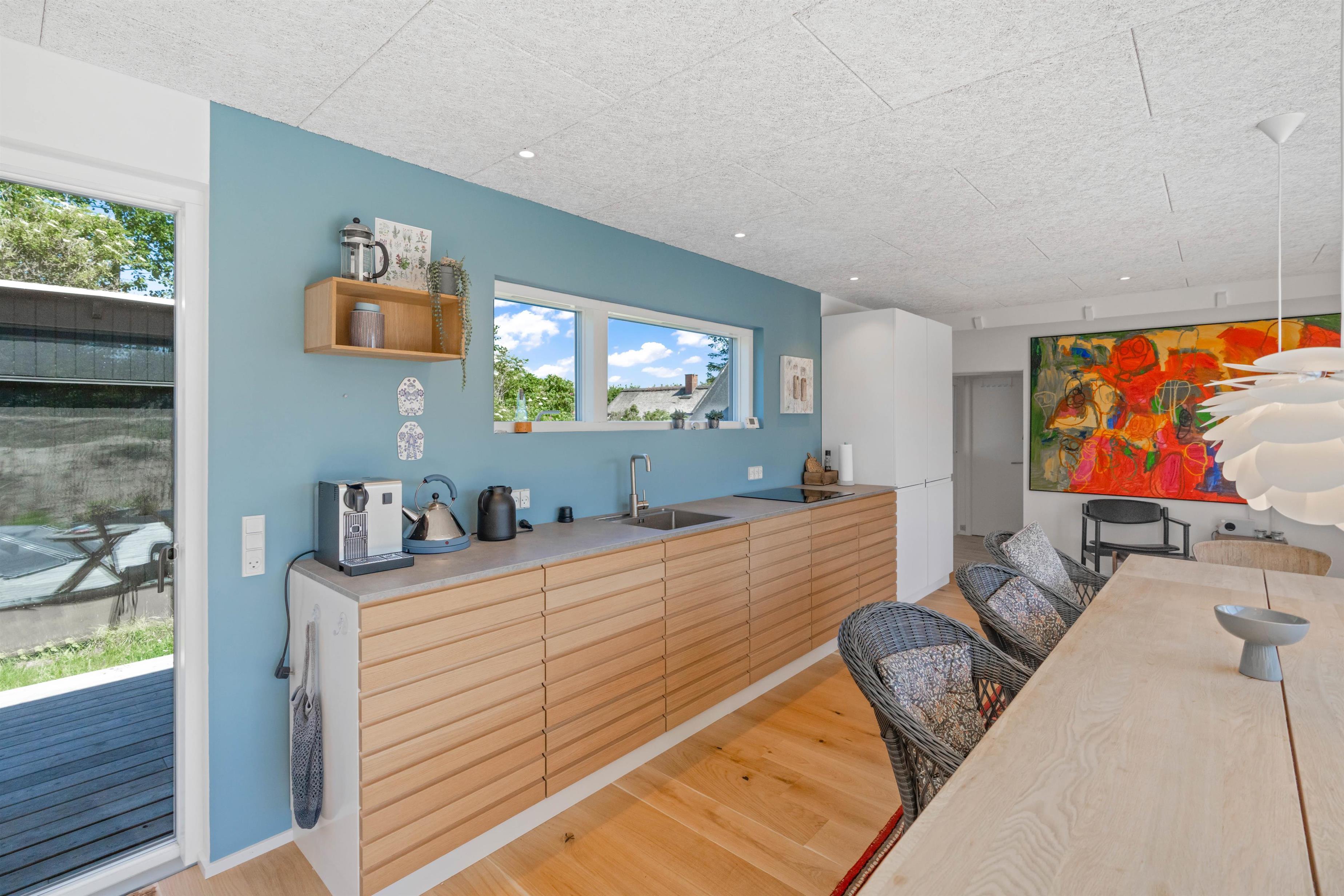 Køkkenet og spisepladsen i sommerhuset ligger i åben forbindelse med stuen, som tilsammen udgør alrummet, der er feriehusets hjerte. I kommer utvivlsomt til at nyde mange dejlige stunder sammen her, hvor I kan lave mad, spille spil og meget mere, mens brændeovnen knitrer i baggrunden.