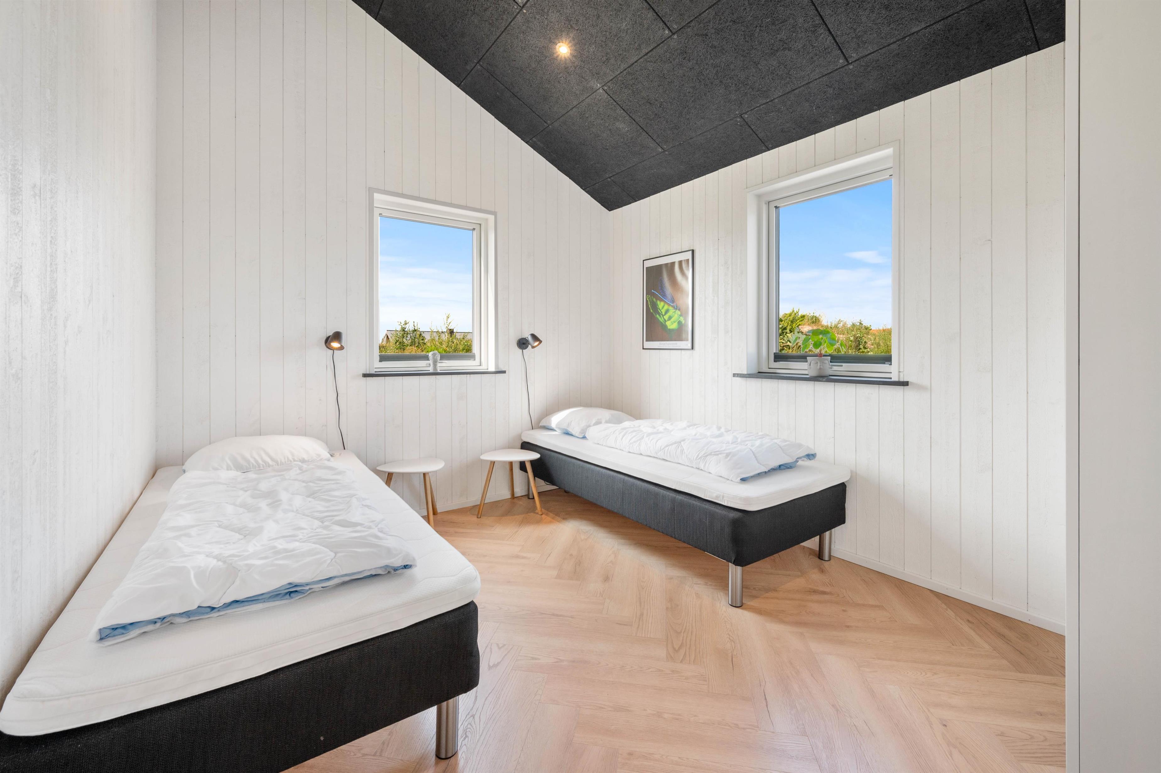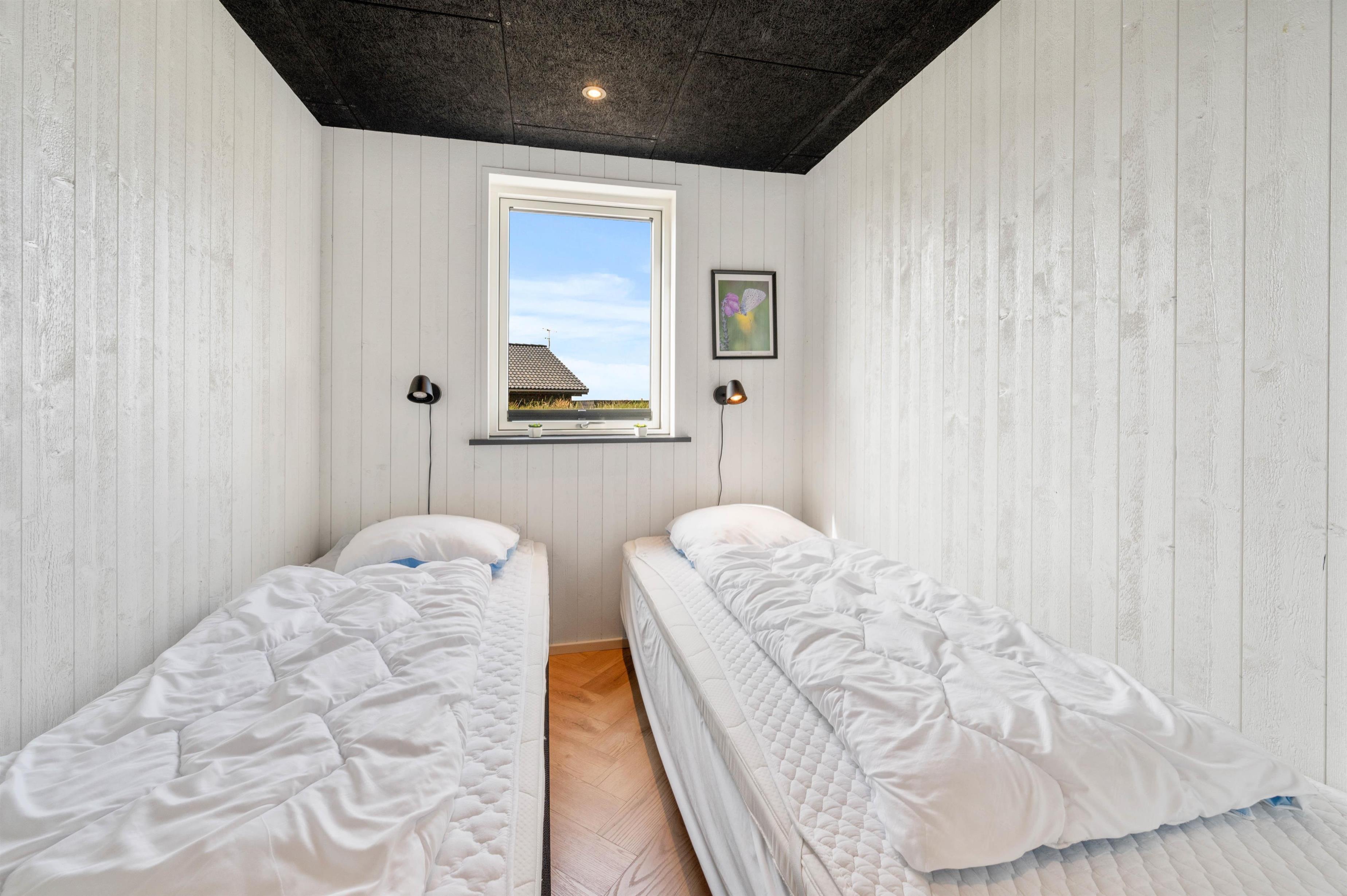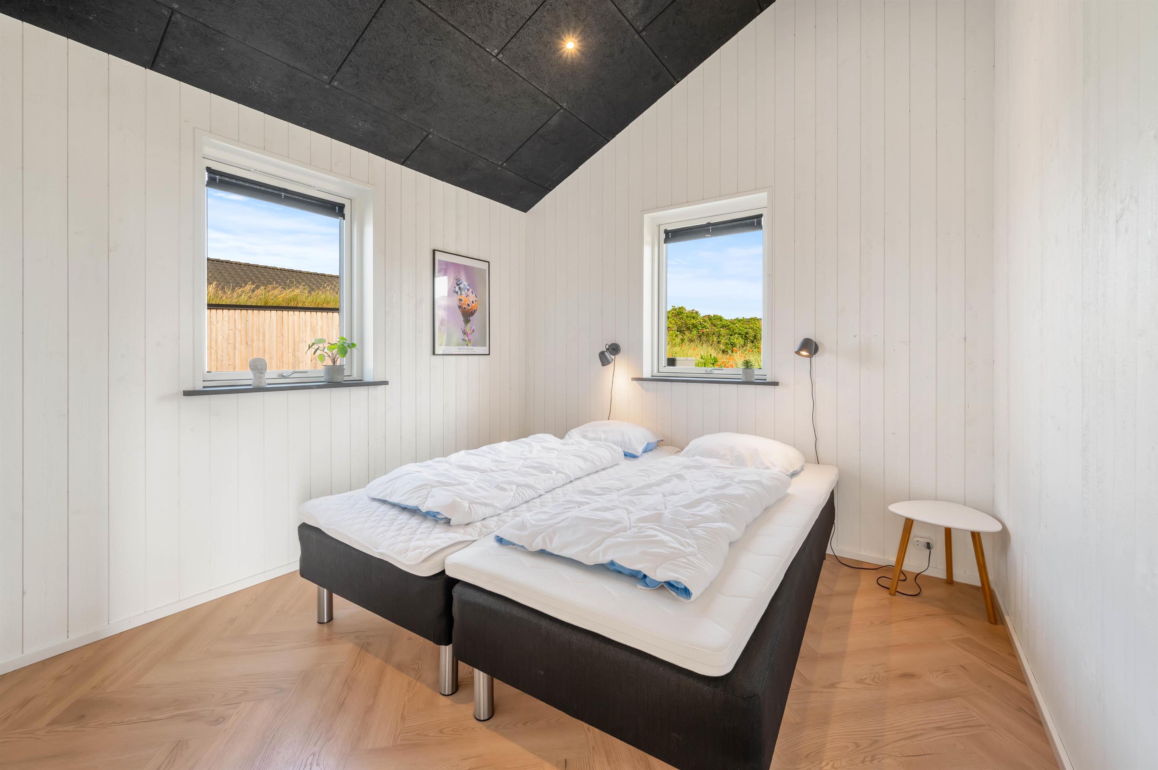 De 10 sovepladser fordeler sig på fem gode soveværelser, som er placeret i feriehusets sydlige og nordlige ende sammen med hver sit badeværelse. En energibesparende varmepumpe sørger desuden for, at I altid har et behageligt indeklima.