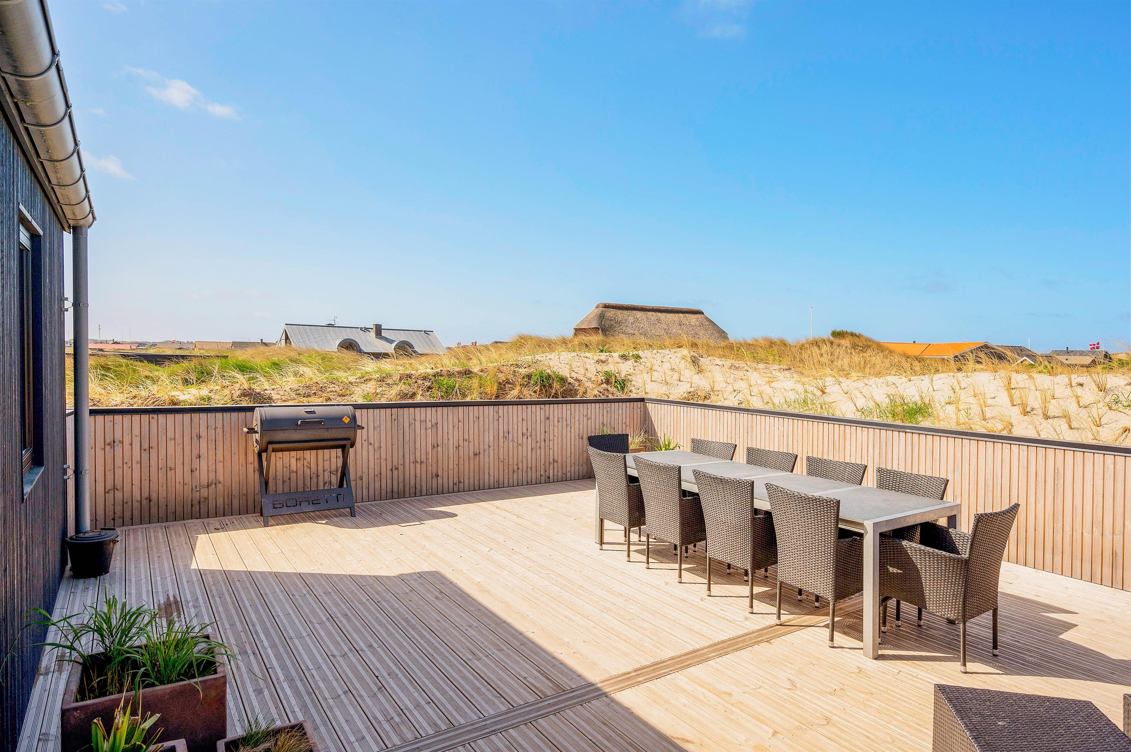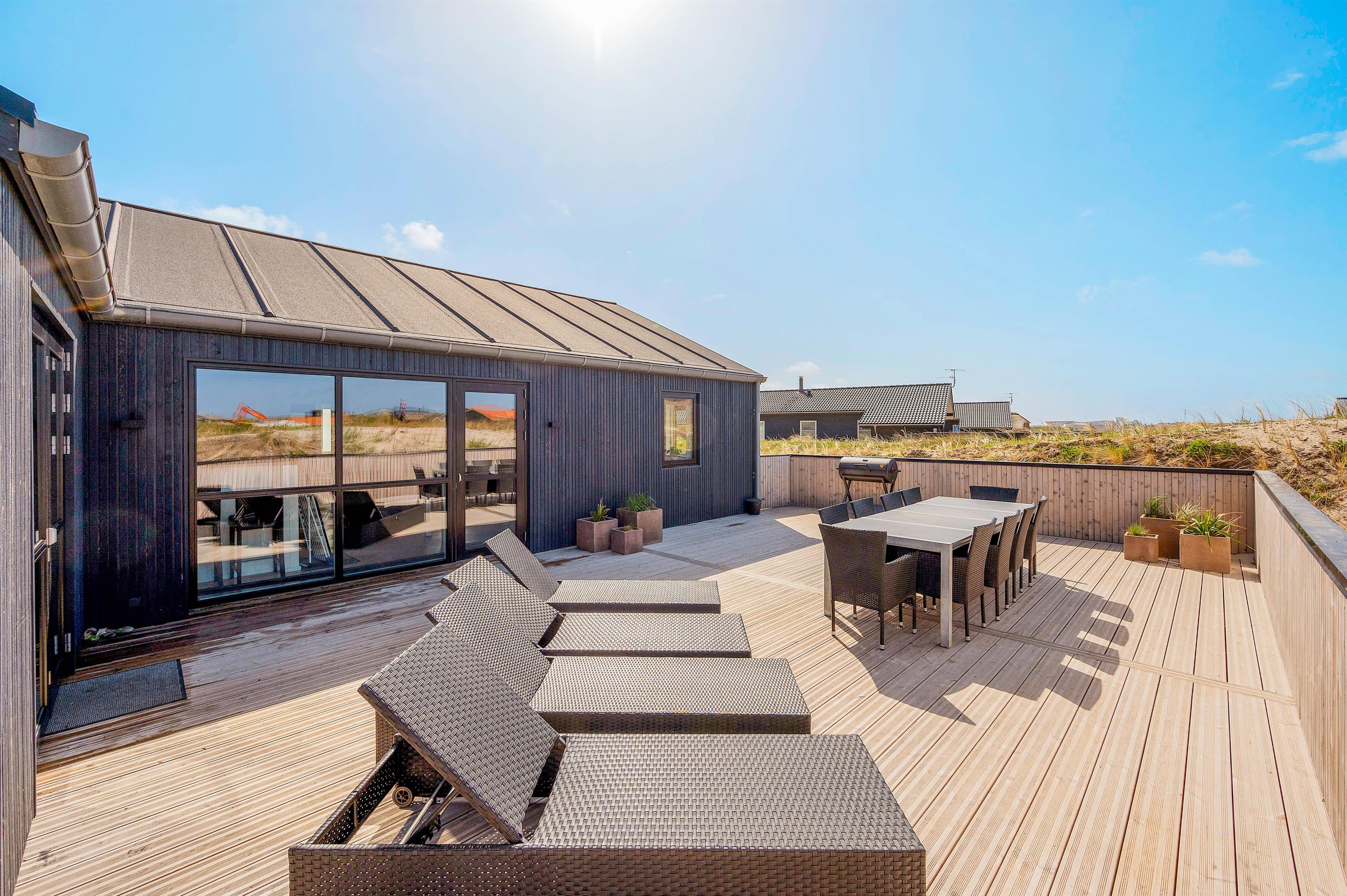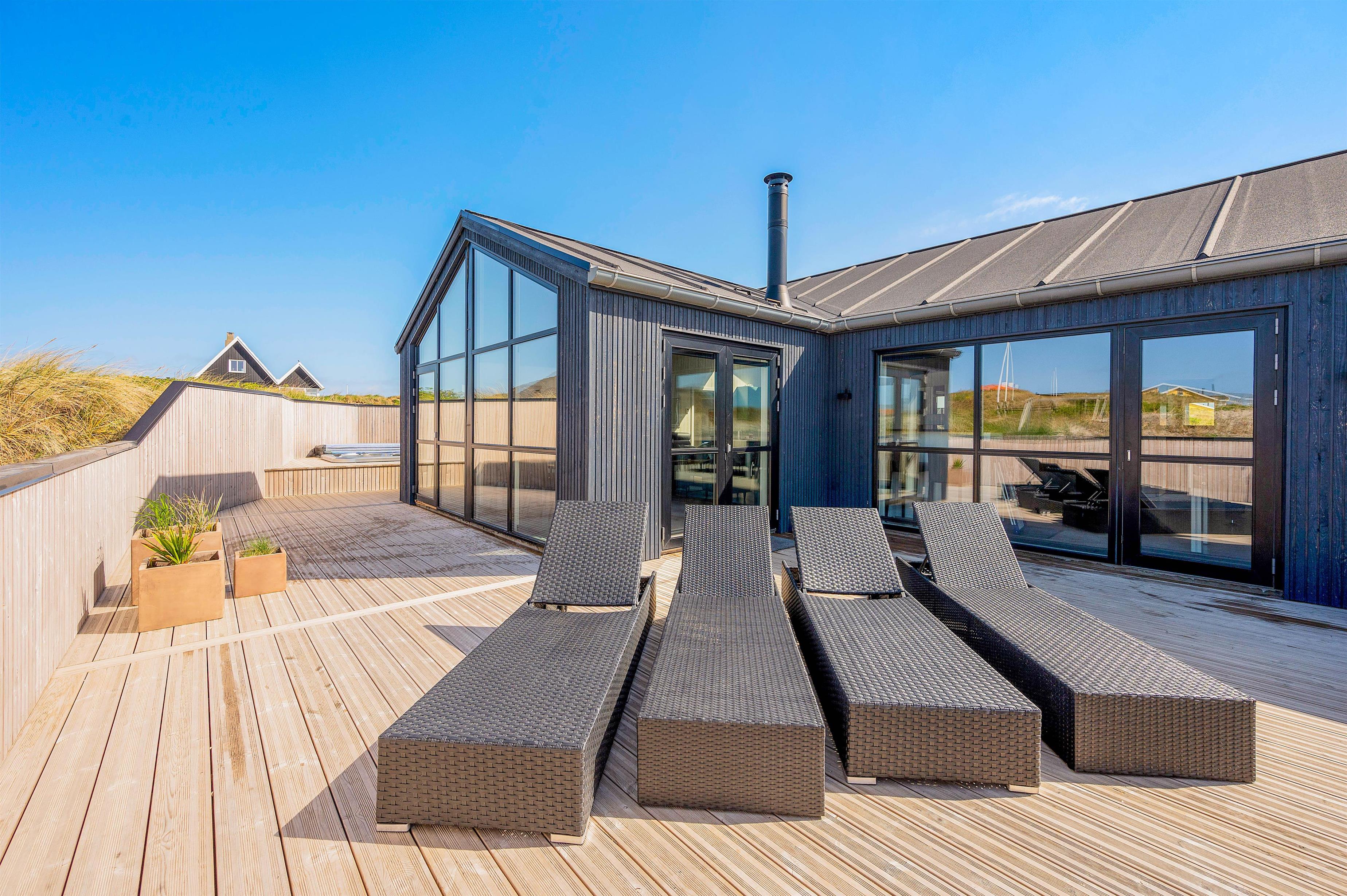 Rundt om sommerhuset løber en stor, lukket terrasse, hvor der er masser af plads til at nyde udelivet. Her finder alle 10 feriegæster uden problemer en solrig plet, og hvis I har hundene med på ferie, kan I også roligt lade dem snuse rundt på den lukkede terrasse, mens I lukker øjnene for en stund i liggestolene eller læner jer tilbage i udespaen.