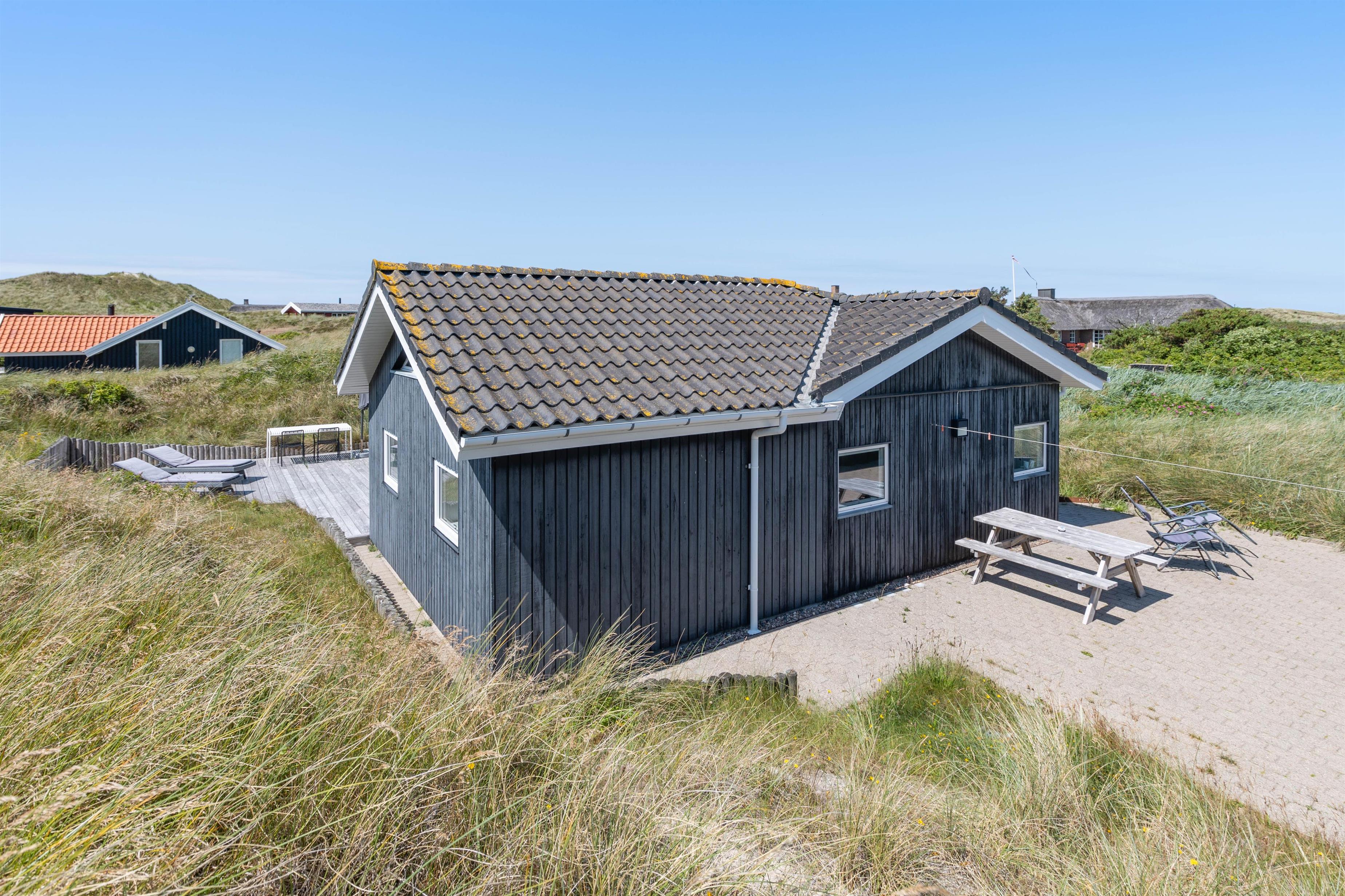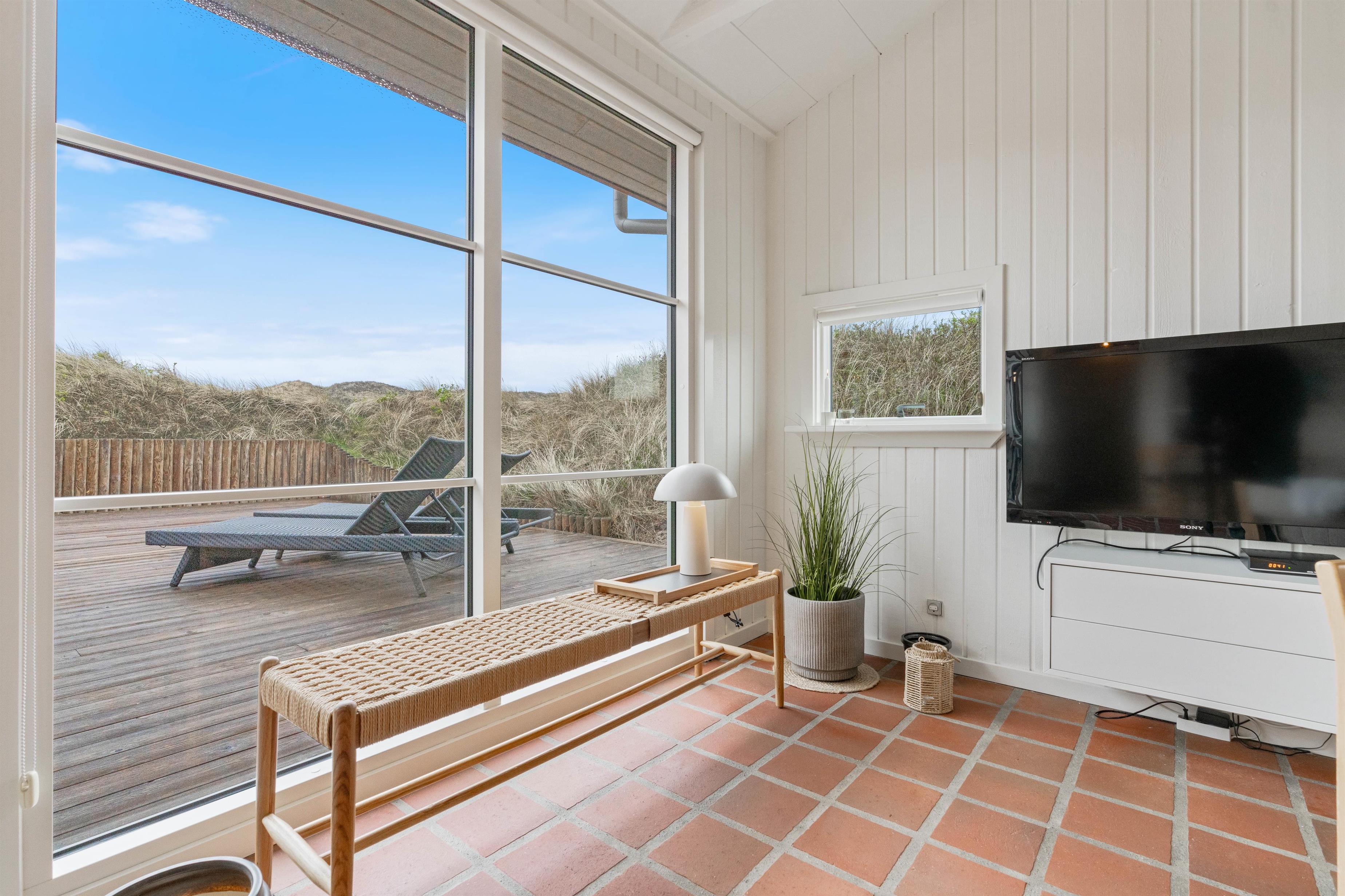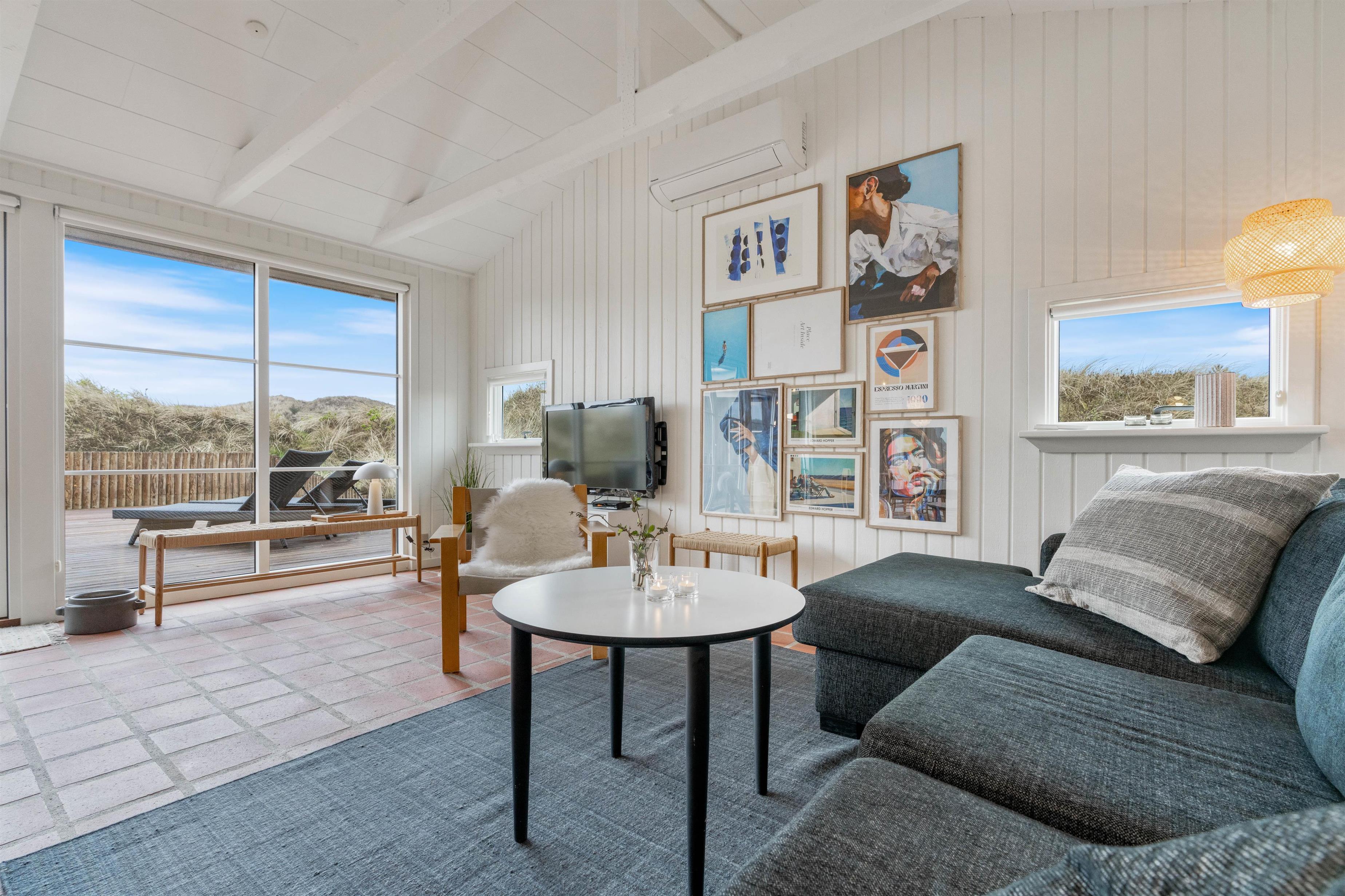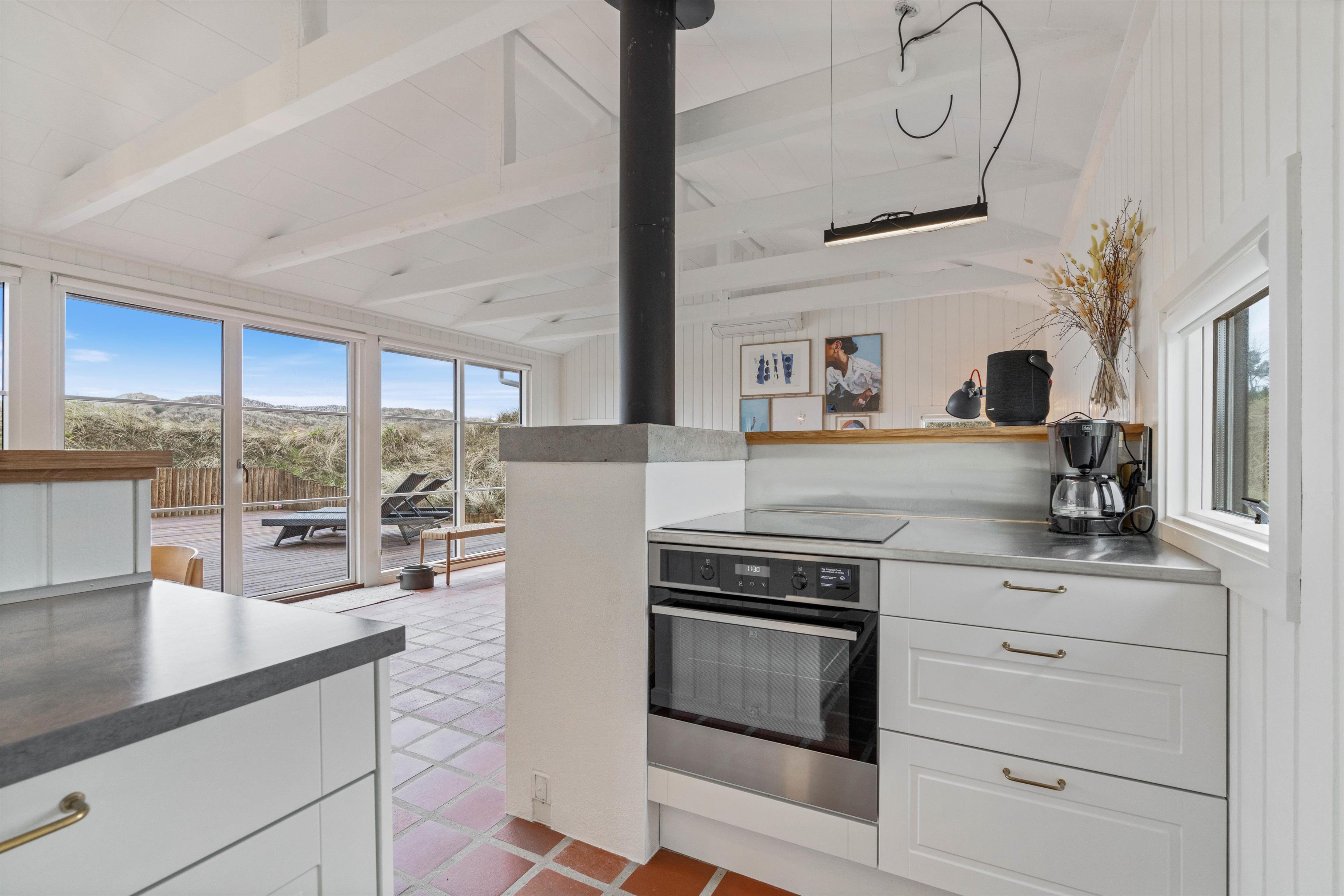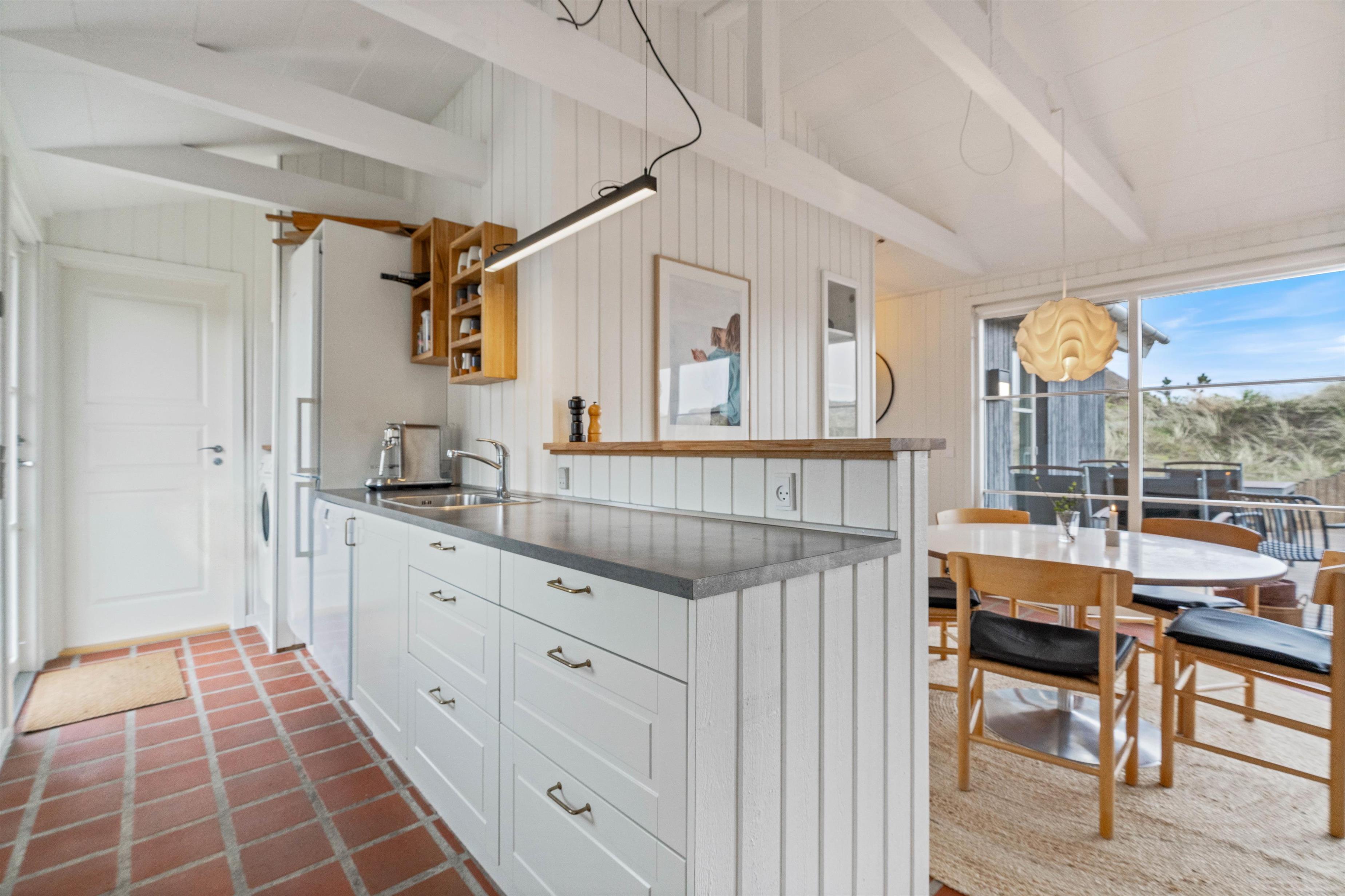 Husets hvidmalede vægge og spær og smagfulde indretning, kombineret med det varme klinkegulv, giver en stemning, så I, som gæster, hurtigt vil føle jer godt tilpas. Huset er dermed udstyret med et splinternyt køkken, hvor i sammen kan lave mad. Stuen er, på grund af det store vinduesparti, meget lys og venlig. Udsigten til klitterne gør, at man også indenfor føler, at man er tæt på naturen. Store dobbeltsenge i 2 af husets soverum og en 140 cm bred seng i det 3. giver garanteret plads til en god nattesøvn efter en dag med masser af frisk havluft.