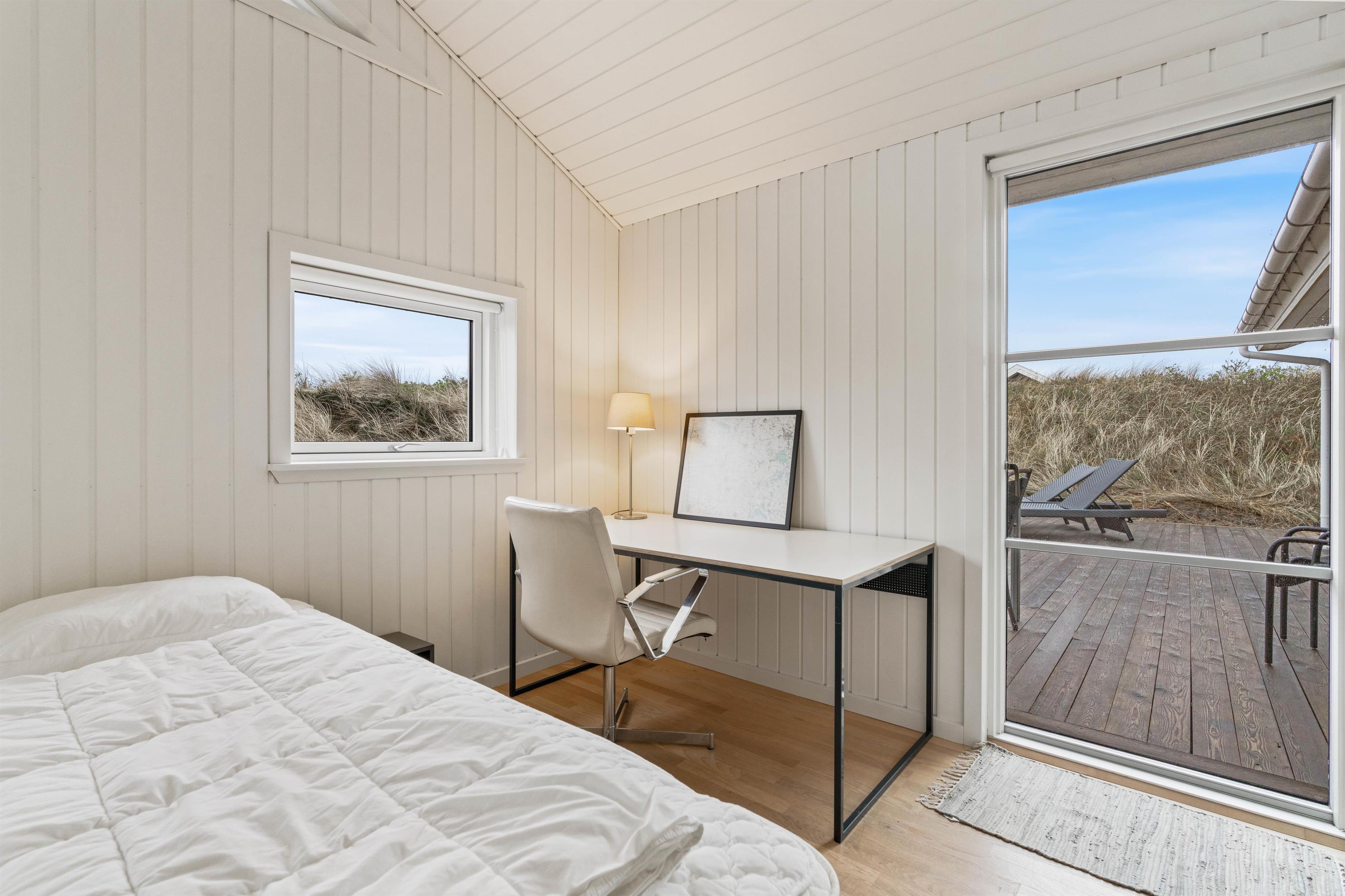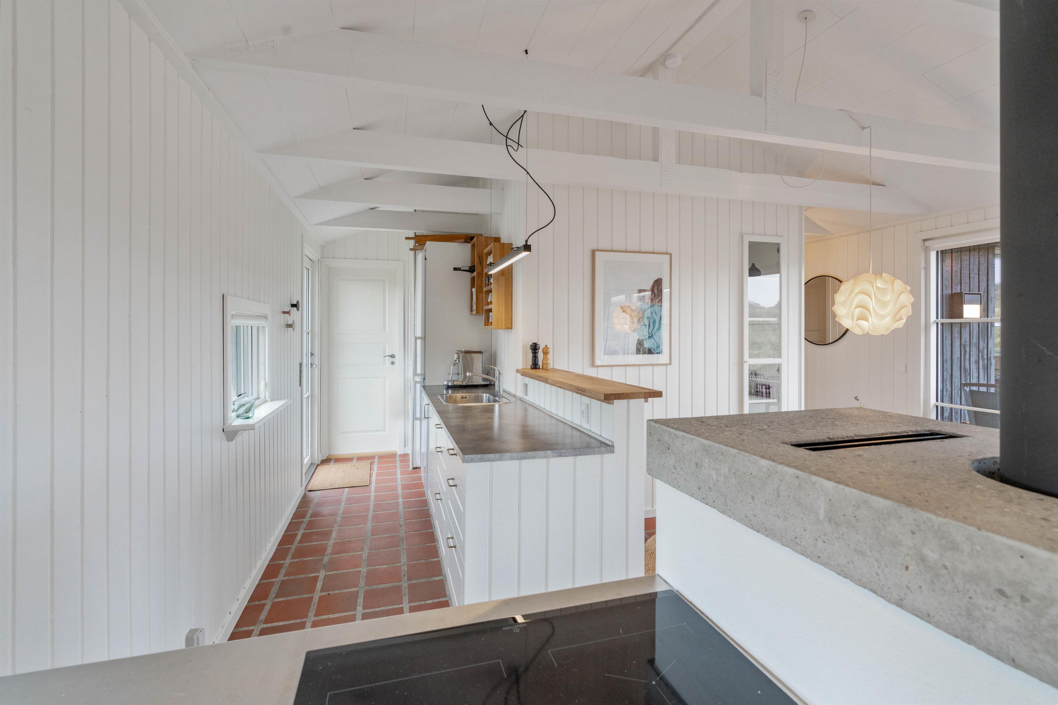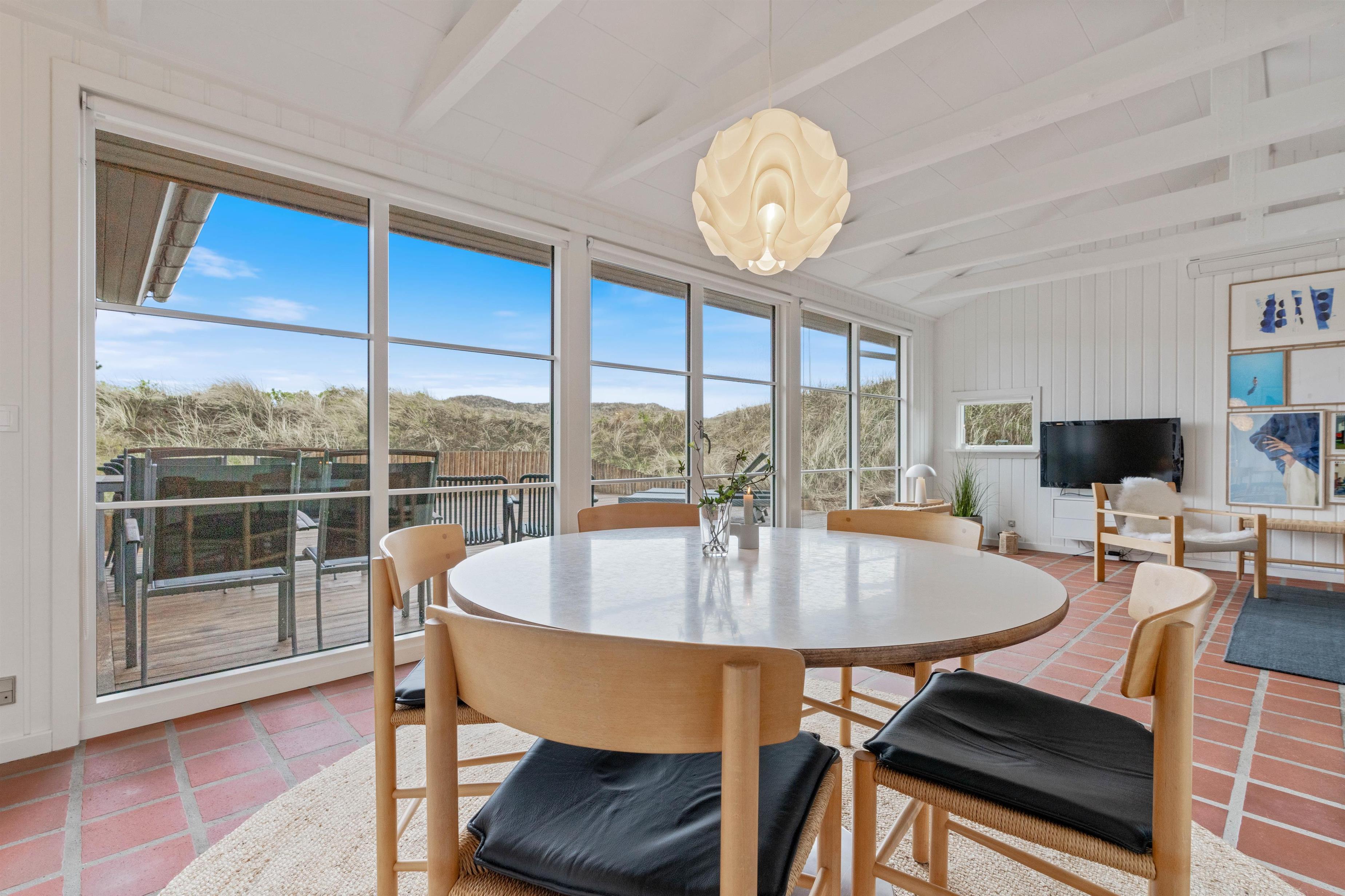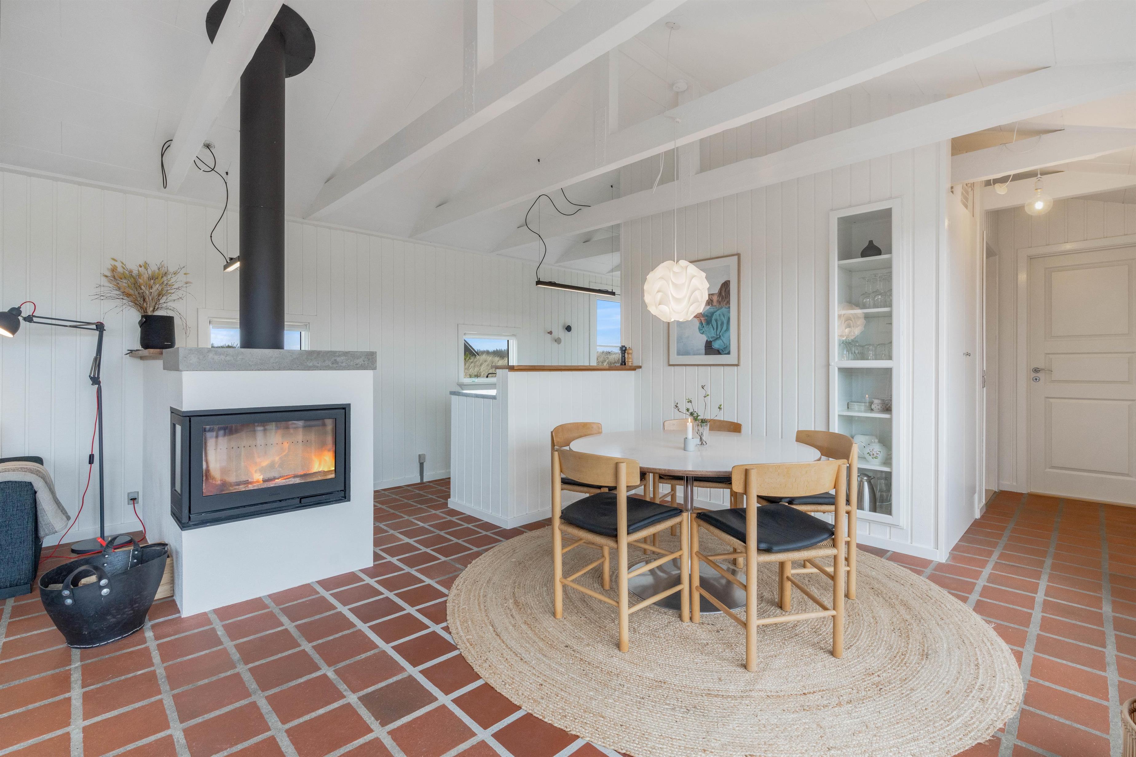 Husets hvidmalede vægge og spær og smagfulde indretning, kombineret med det varme klinkegulv, giver en stemning, så I, som gæster, hurtigt vil føle jer godt tilpas. Huset er dermed udstyret med et splinternyt køkken, hvor i sammen kan lave mad. Stuen er, på grund af det store vinduesparti, meget lys og venlig. Udsigten til klitterne gør, at man også indenfor føler, at man er tæt på naturen. Store dobbeltsenge i 2 af husets soverum og en 140 cm bred seng i det 3. giver garanteret plads til en god nattesøvn efter en dag med masser af frisk havluft.