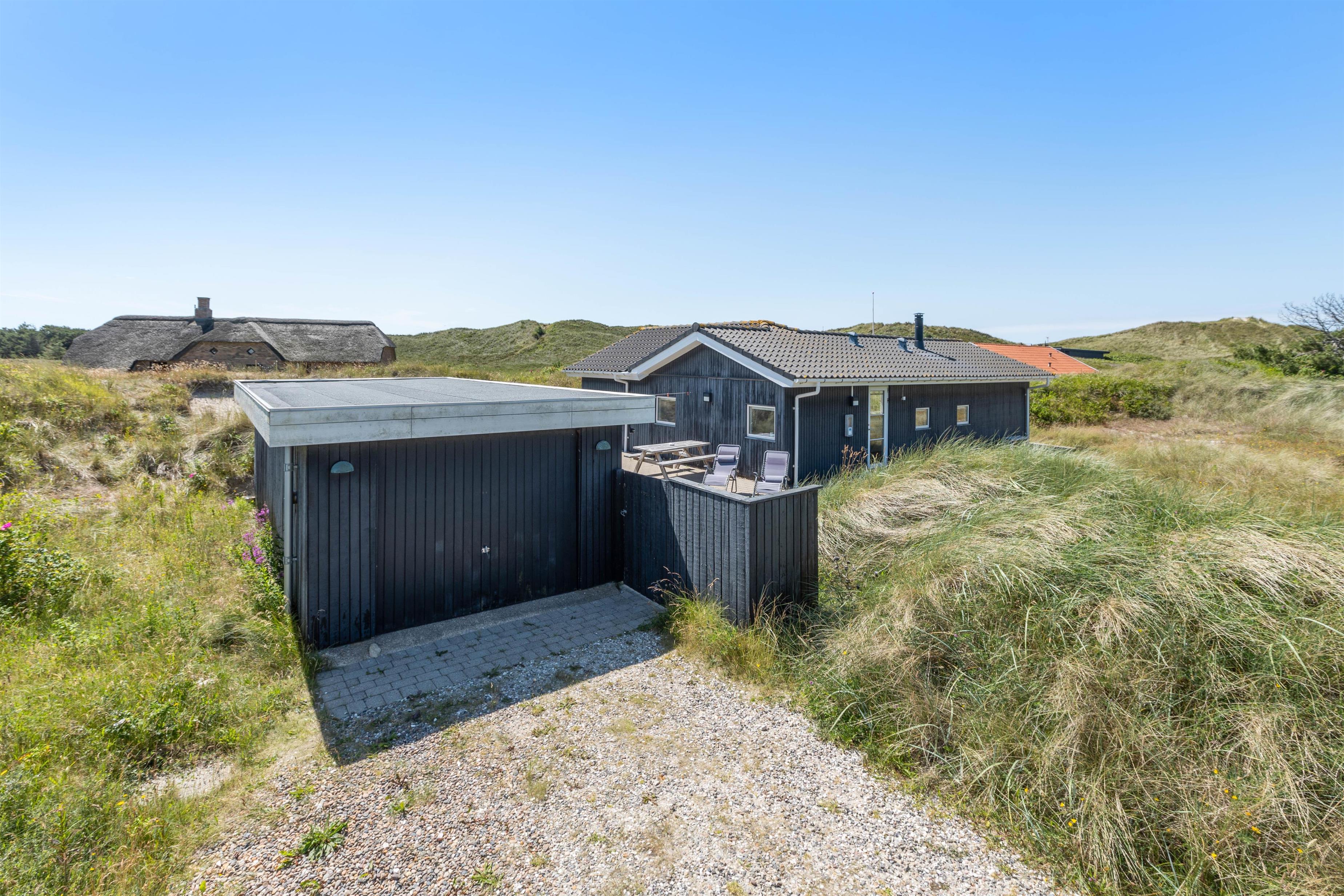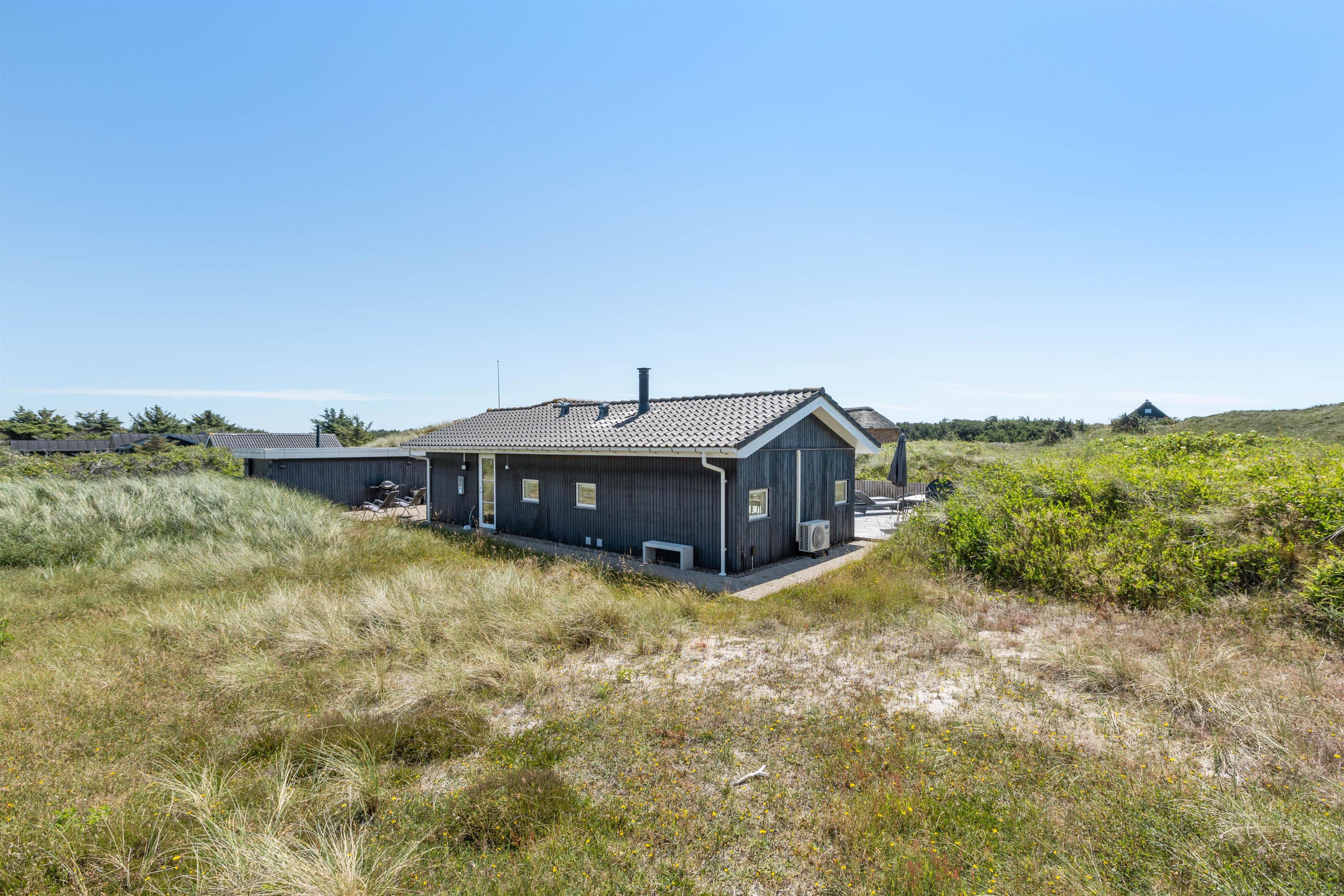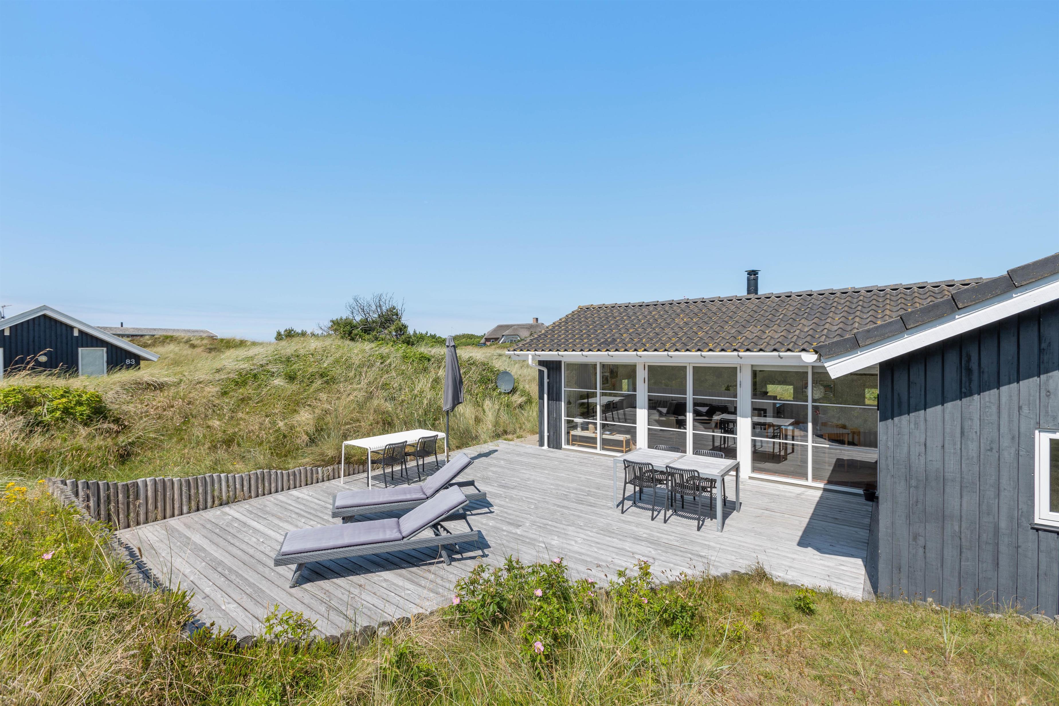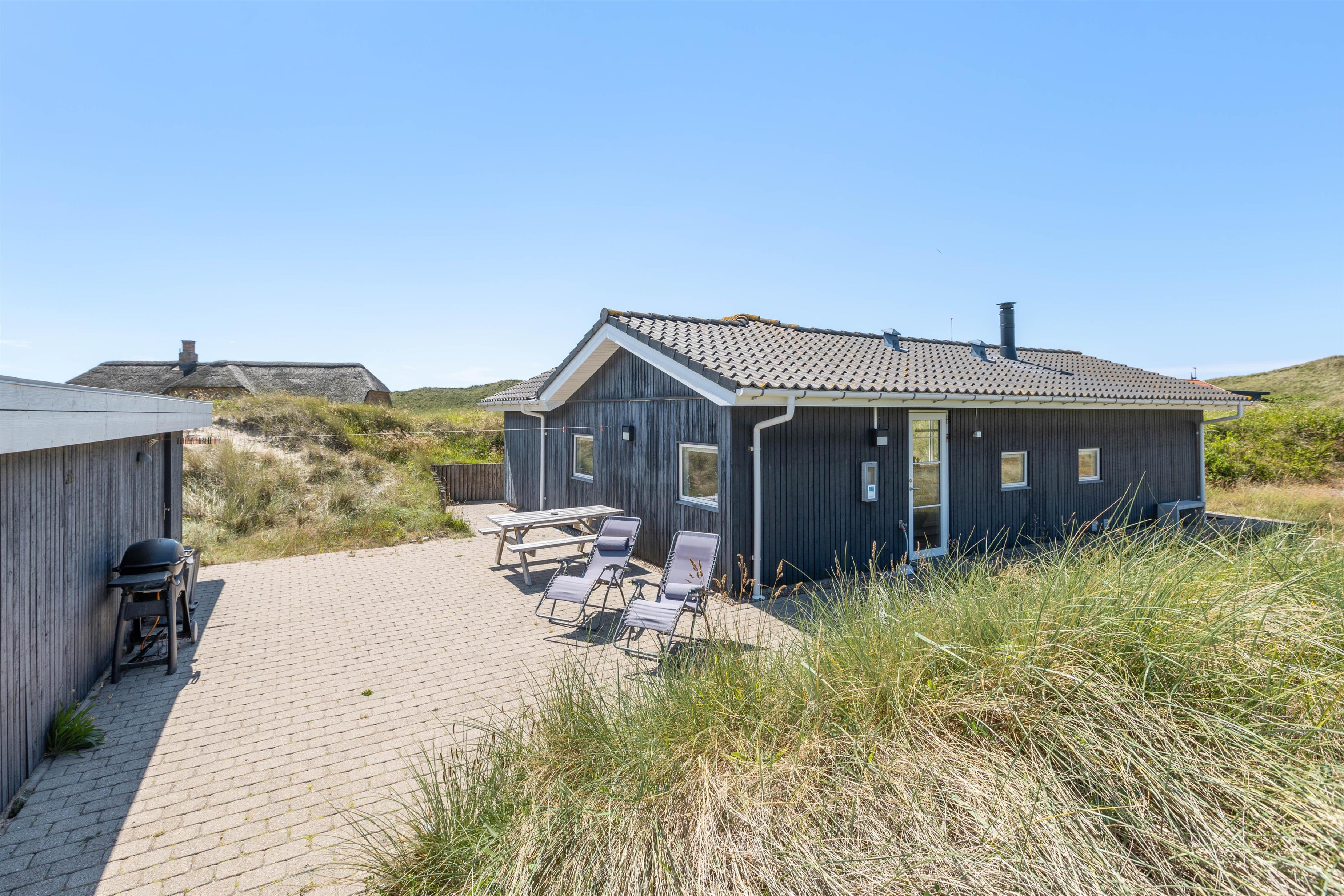 Så I til enhver tid kan nyde husets ugenerte beliggenhed midt i den skønne natur, er der flere terrasser rundt om huset. Når der rigtigt skal slappes af, er den 70m2 store sydvendte solterrasse et hit. Her er god plads til solvognene, og I ligger dejligt i læ af klitten med den fortryllende duft af hav, lyng og marehalm i næsen. Når dagen går på hæld, kan I tænde op i grillen og nyde lidt godt mad, imens solen går ned bag klitterne og de første stjerne titter frem.