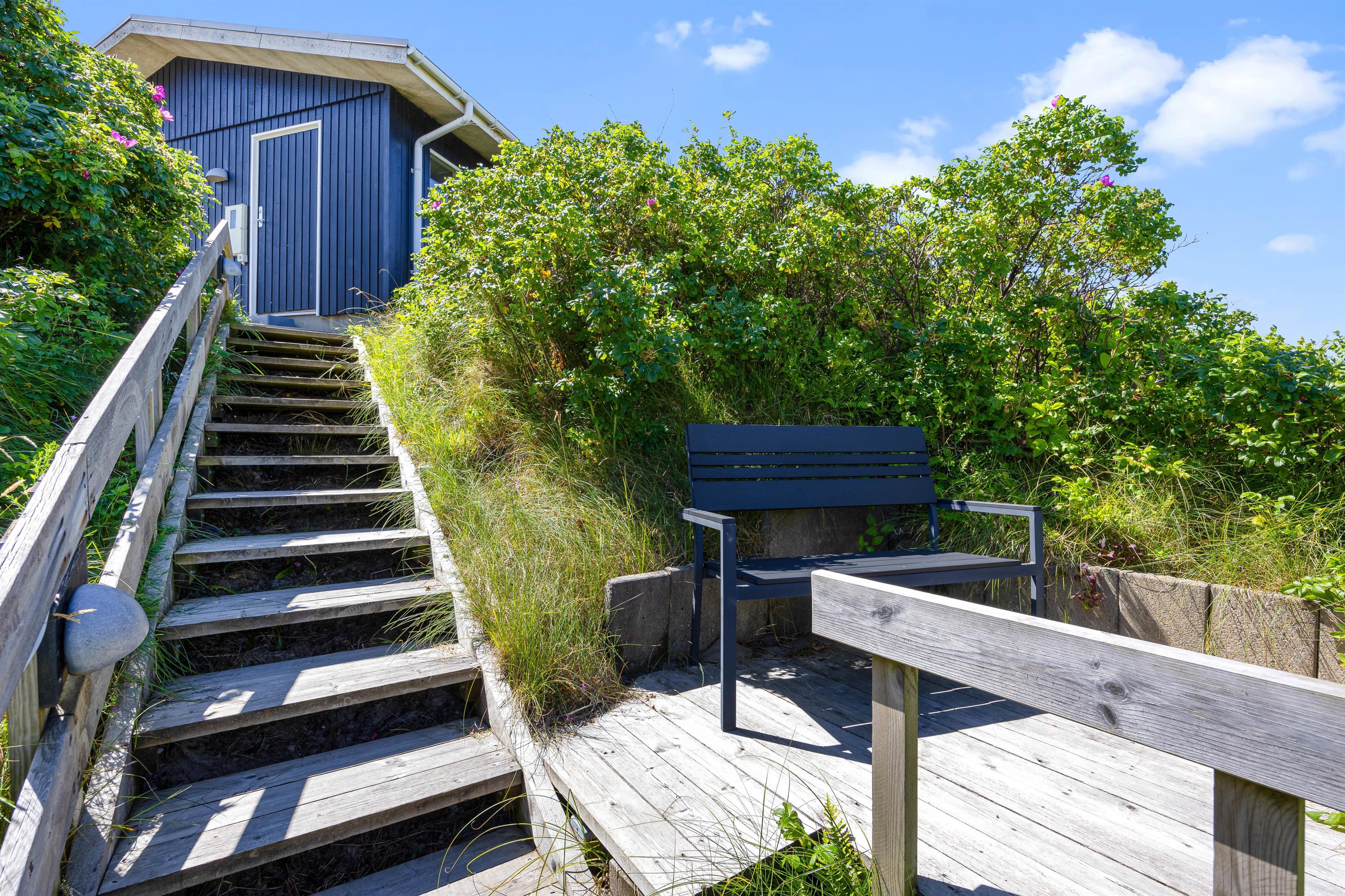 Sommerhusets beliggenhed fås ikke meget bedre. Huset ligger på toppen af en klit, hvilket giver masser af privatliv, men ikke mindst nogle fantastiske udsigter. I kan derfor med ro i maven sætte jer til rette enten indendørs i de behagelige møbler, eller udendørs i de mange små hyggelige kroge, der findes rundt om huset. Om sommeren kan det også anbefales at tage dyne og pude med ud i sommerhusets shelter, og have en eller flere nætter ude i den friske havluft. Bemærk venligst også, at grundet sommerhusets beliggenhed, så parkerer man 25 meter fra sommerhuset, og sommerhuset kan kun tilgås via trapperne