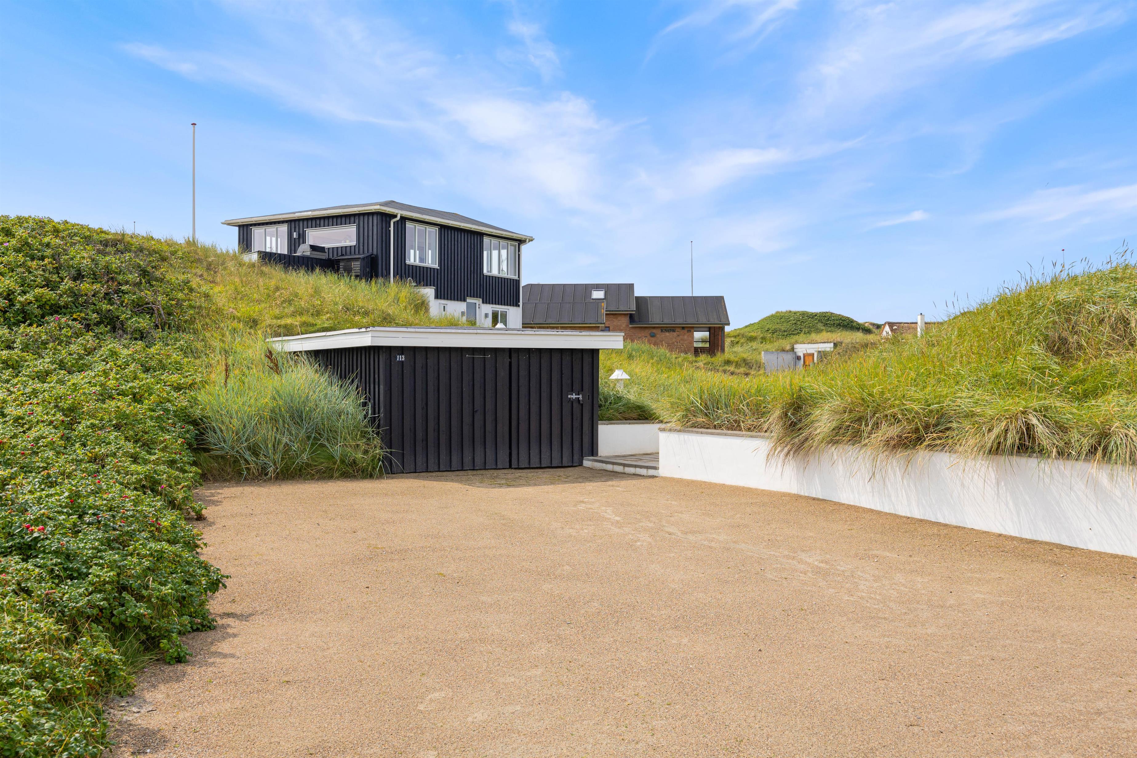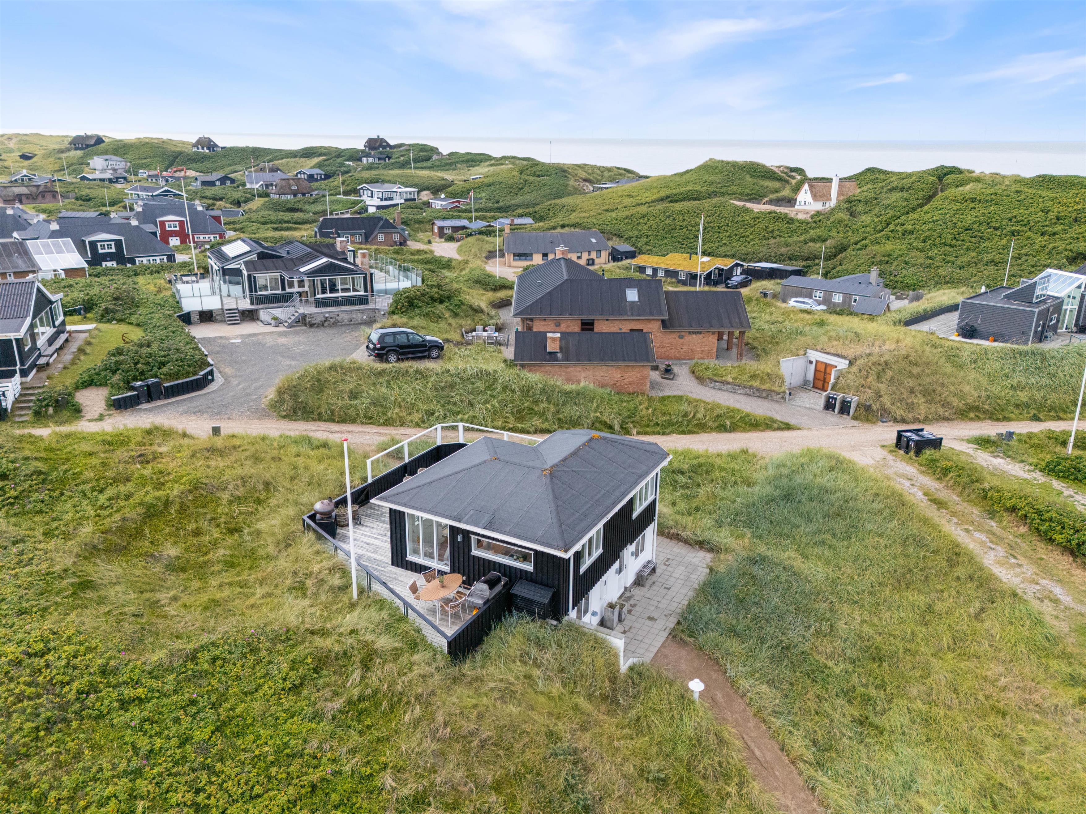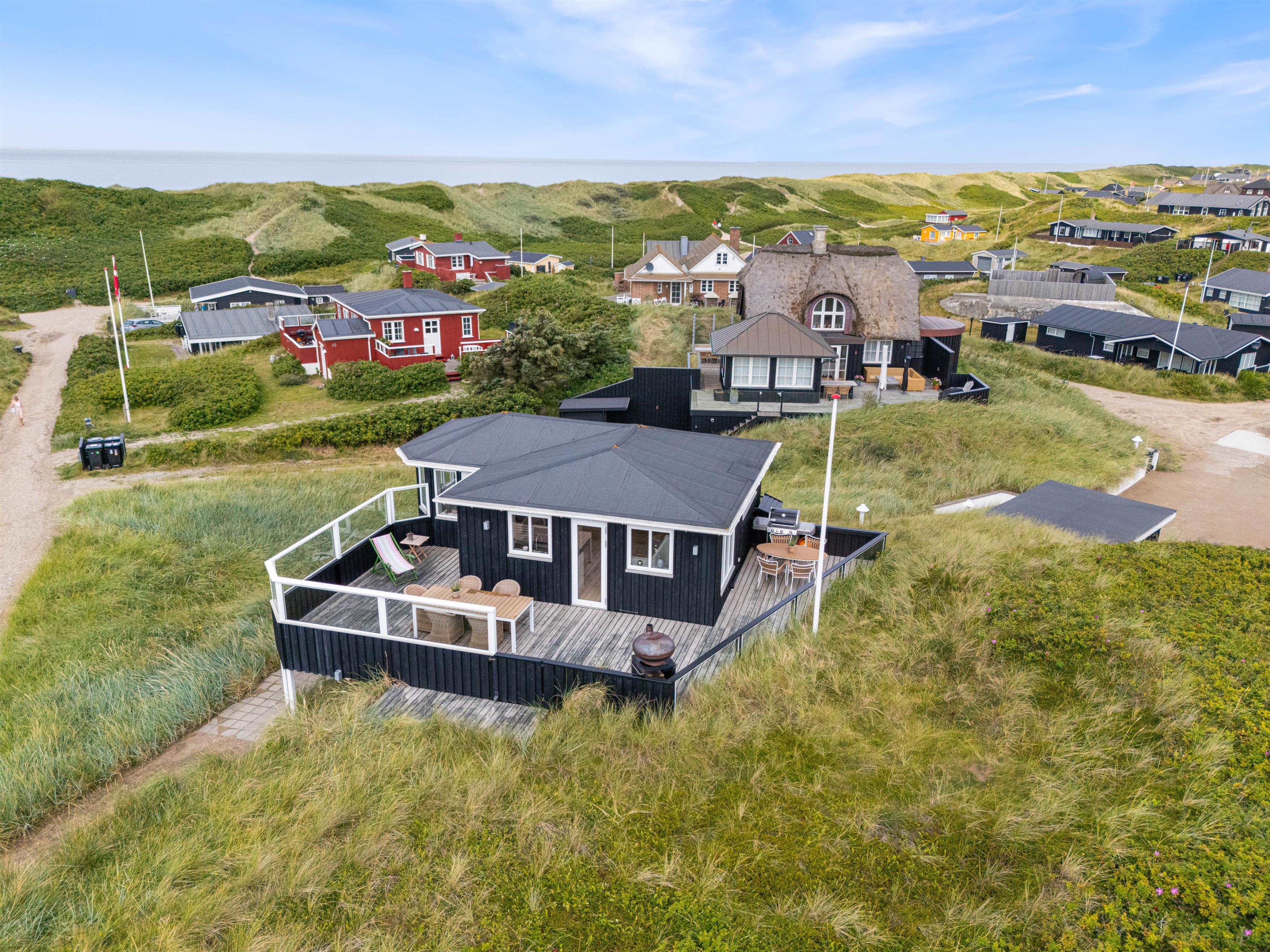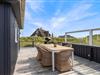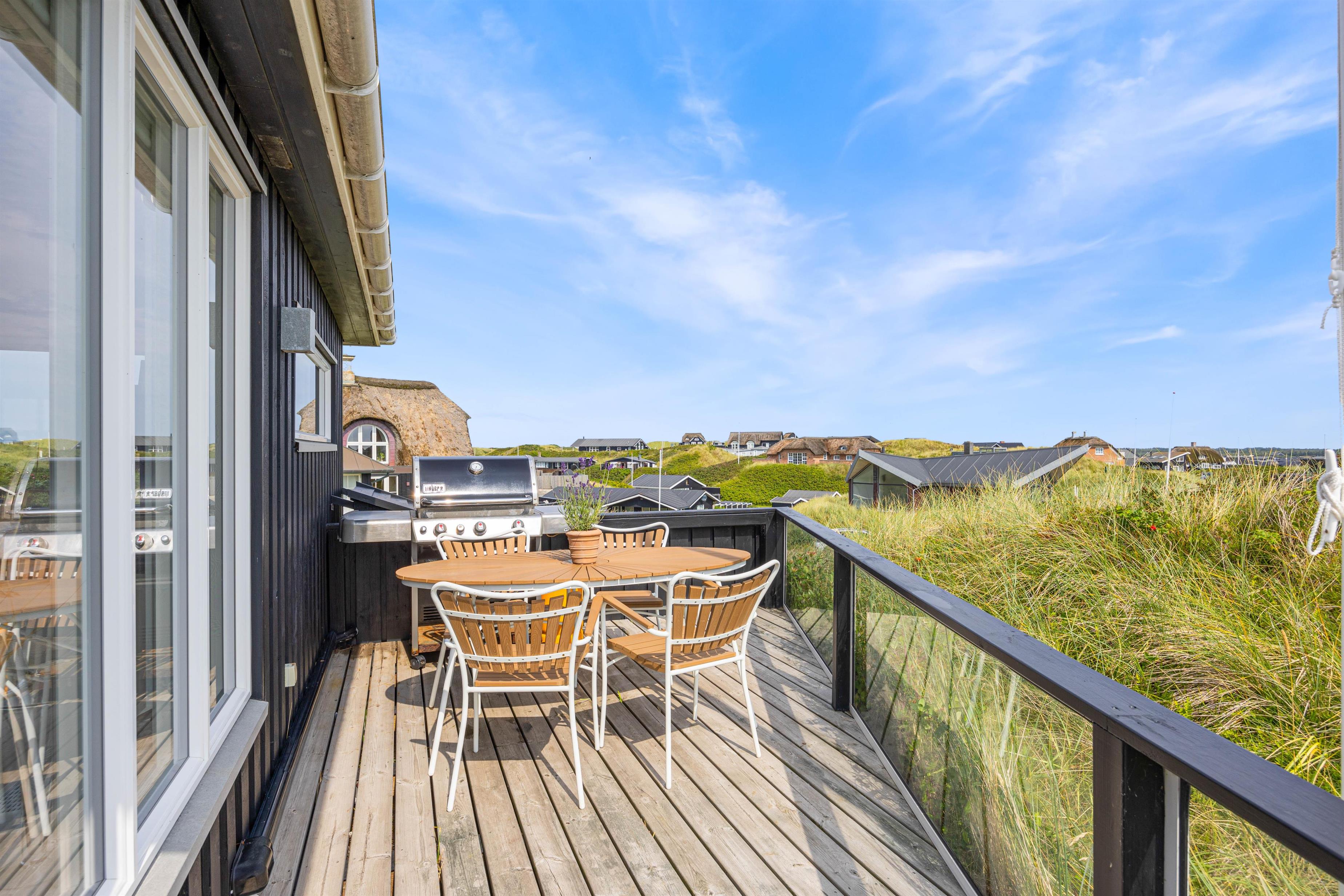 Feriehusets udendørs område er pænt og velindrettet. Terrassen er afskærmet og lukket, men på samme tid har i en fantastisk panoramaudsigt, direkte ud til klitterne. Selv hvis vejret ikke viser sig fra sin pæne side, har i mulighed for at tilbringe tid udenfor, under det overdækkede område. Havemøblerne står klar til jer, og når solen står højt, er det oplagt at lægge sig på solsengen og nyde solens varme stråler. Om aftenen kan I tilberede jeres aftensmad på gasgrillen, mens I lytter til lyden af Vesterhavet.