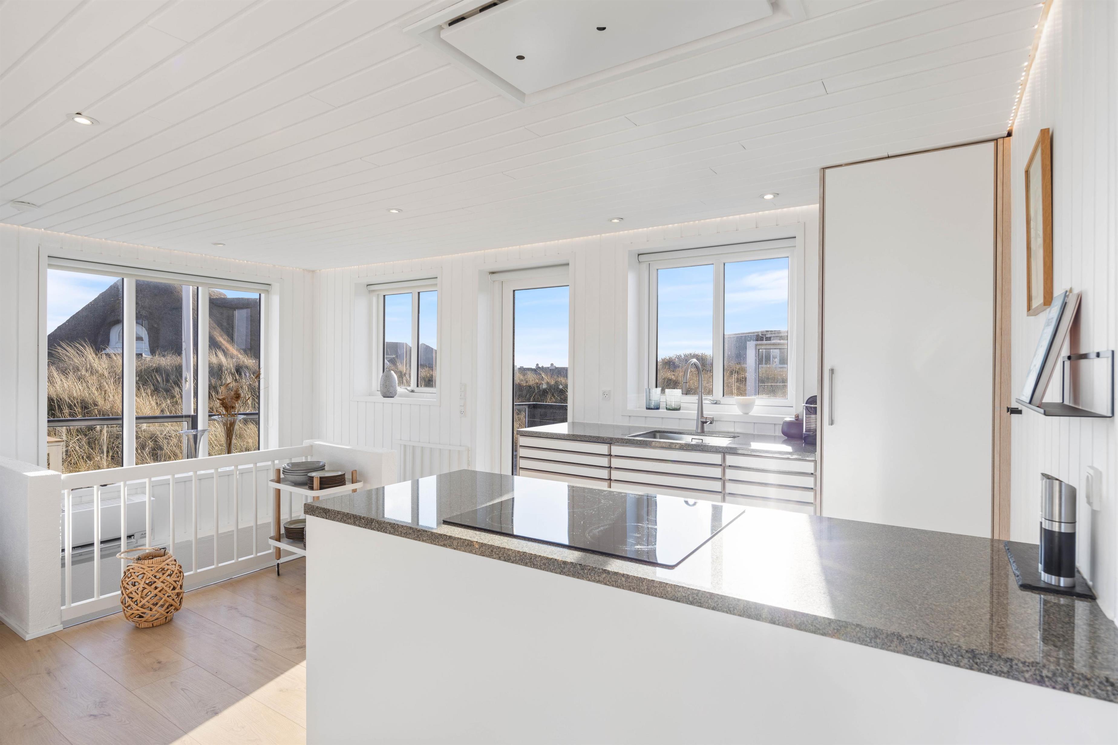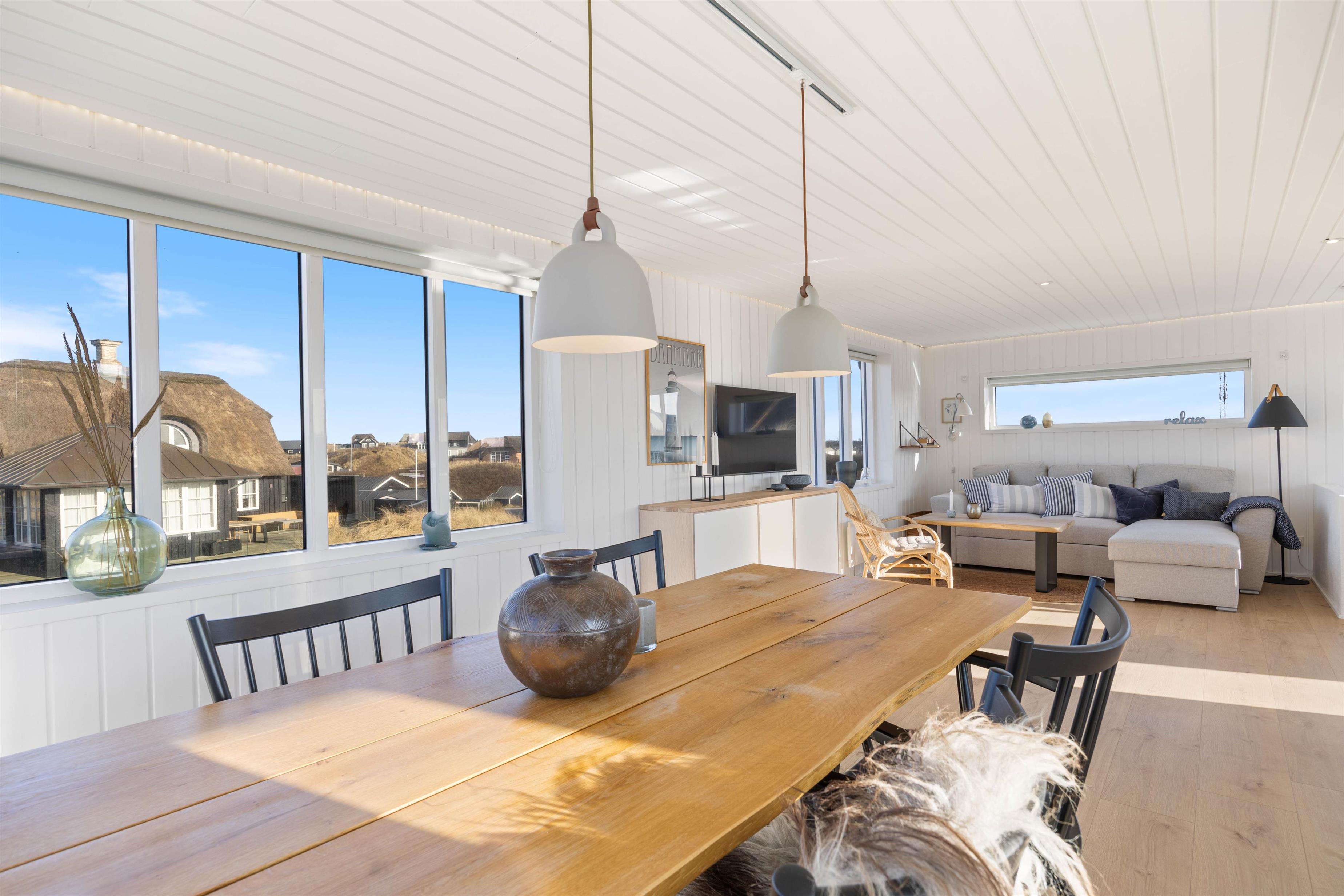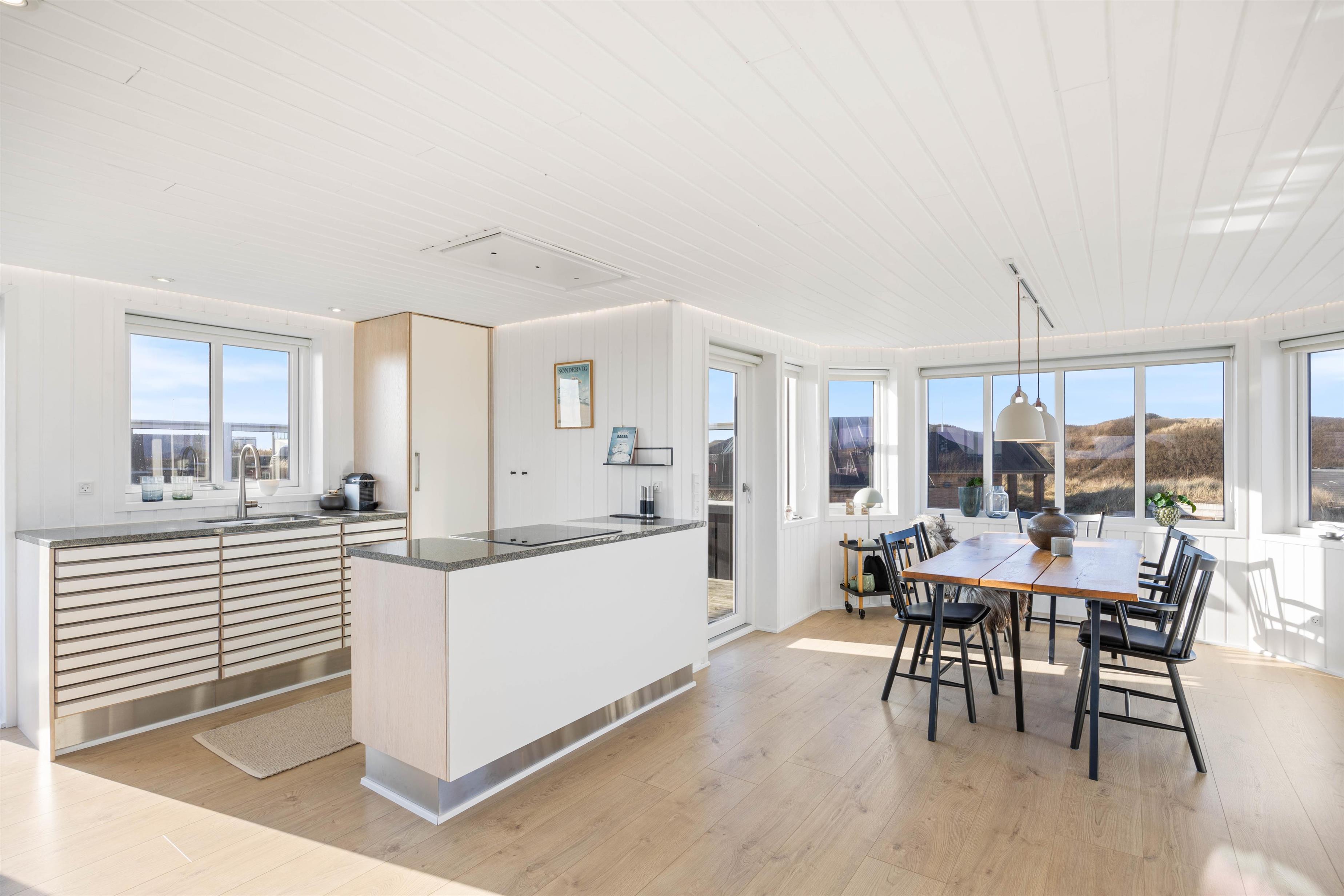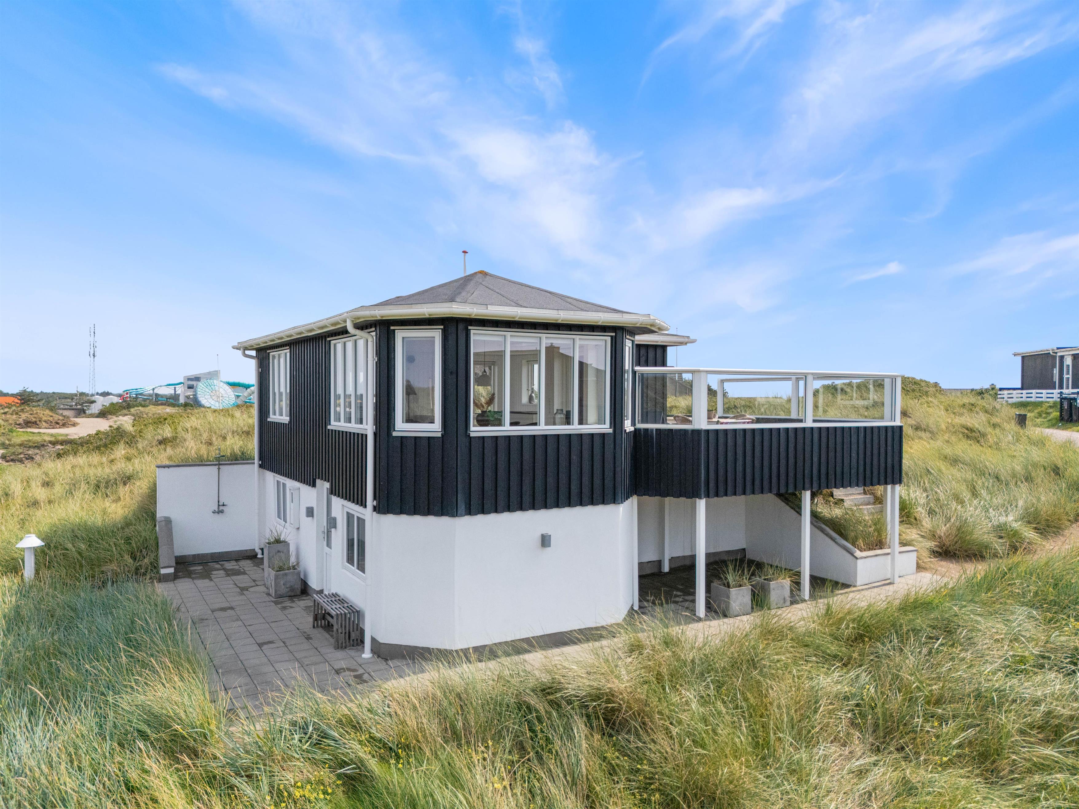 Feriehusets udendørs område er pænt og velindrettet. Terrassen er afskærmet og lukket, men på samme tid har i en fantastisk panoramaudsigt, direkte ud til klitterne. Selv hvis vejret ikke viser sig fra sin pæne side, har i mulighed for at tilbringe tid udenfor, under det overdækkede område. Havemøblerne står klar til jer, og når solen står højt, er det oplagt at lægge sig på solsengen og nyde solens varme stråler. Om aftenen kan I tilberede jeres aftensmad på gasgrillen, mens I lytter til lyden af Vesterhavet.