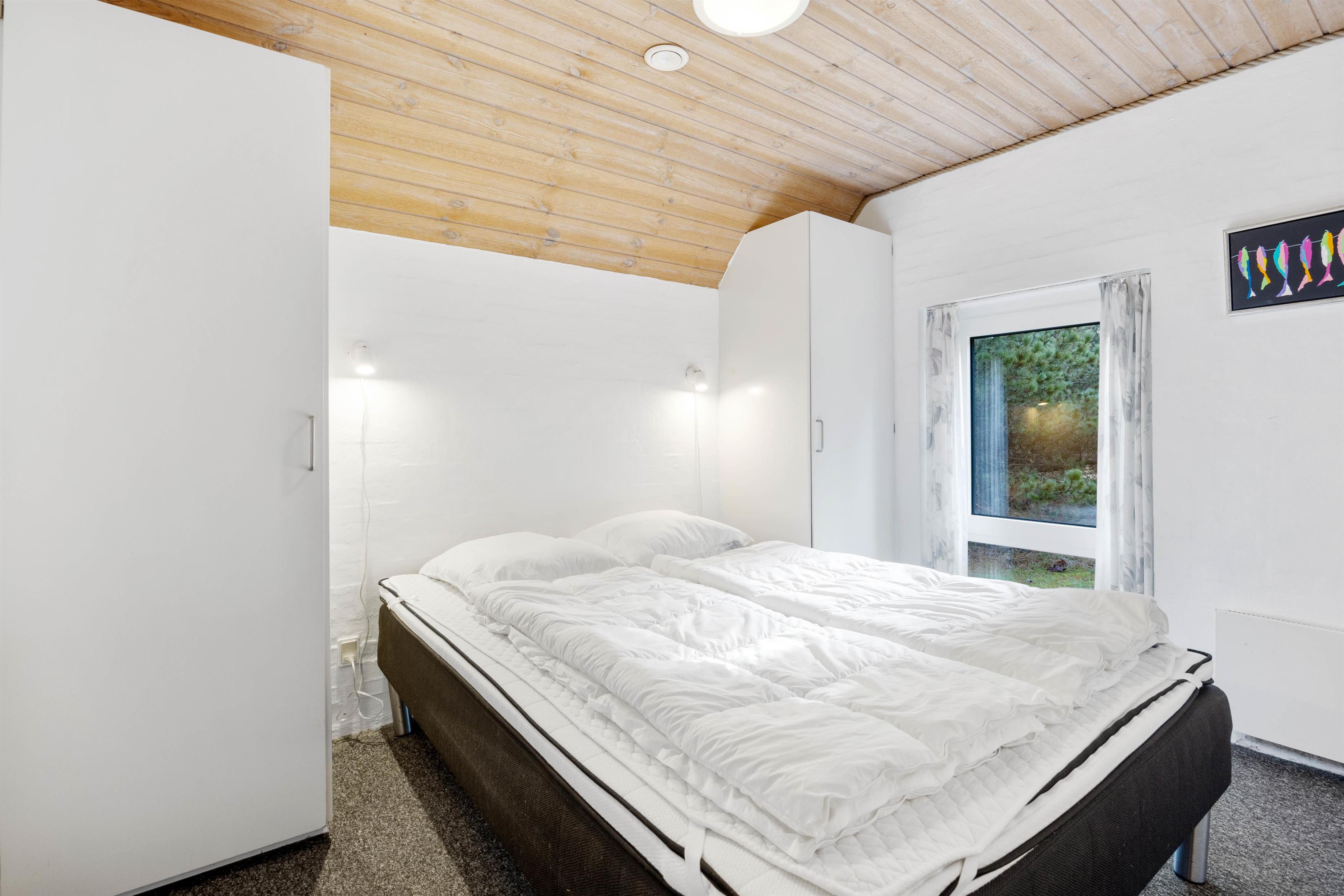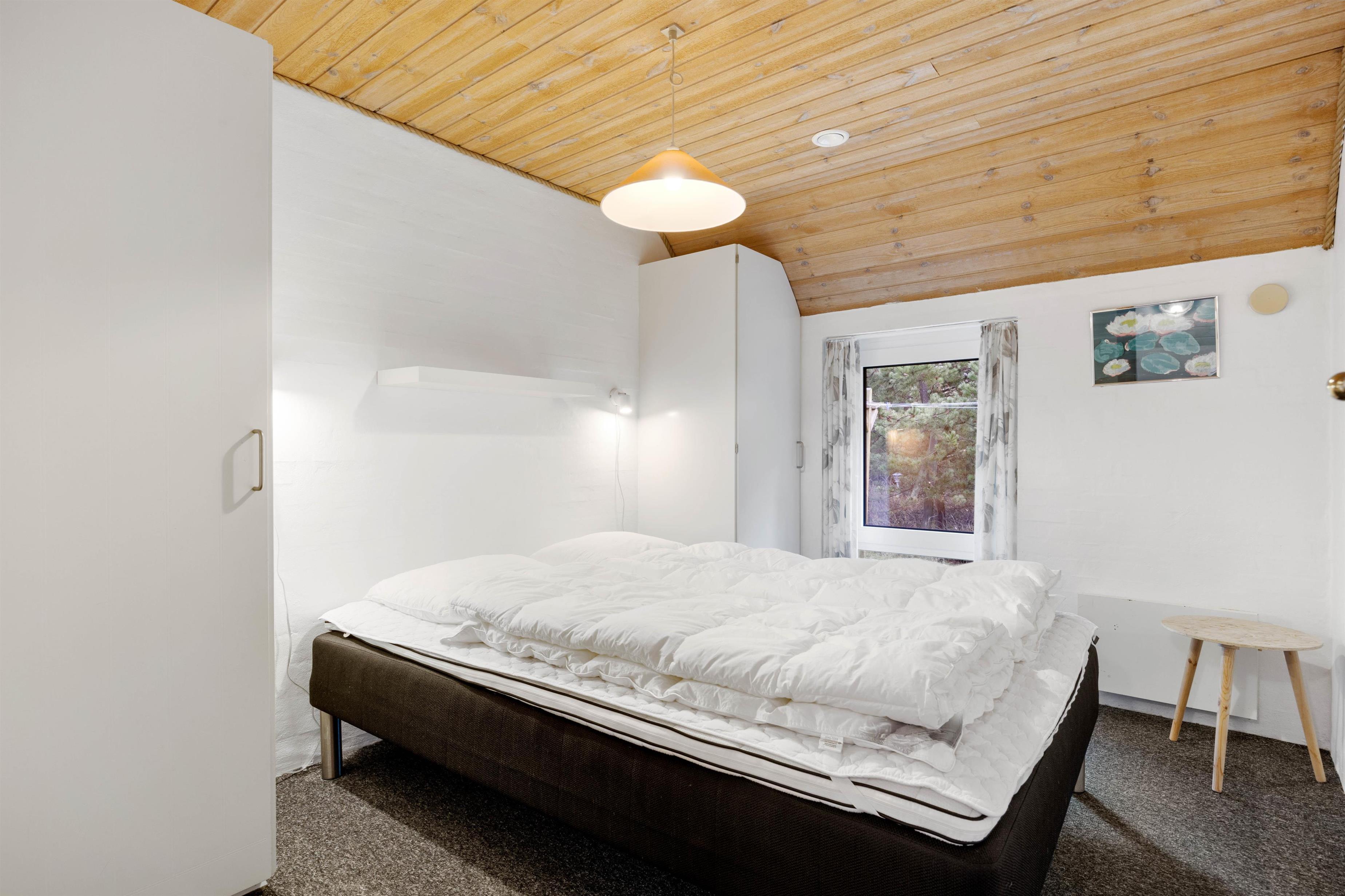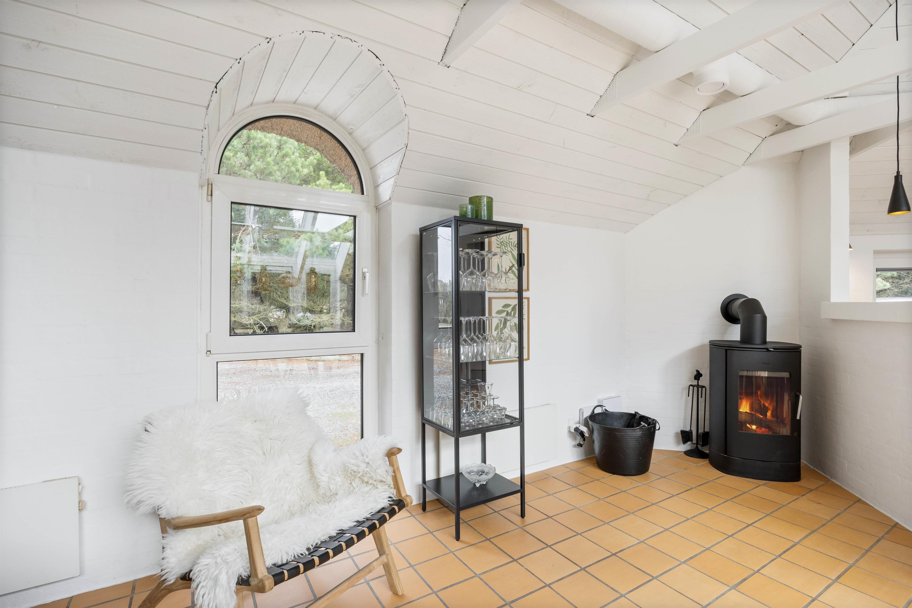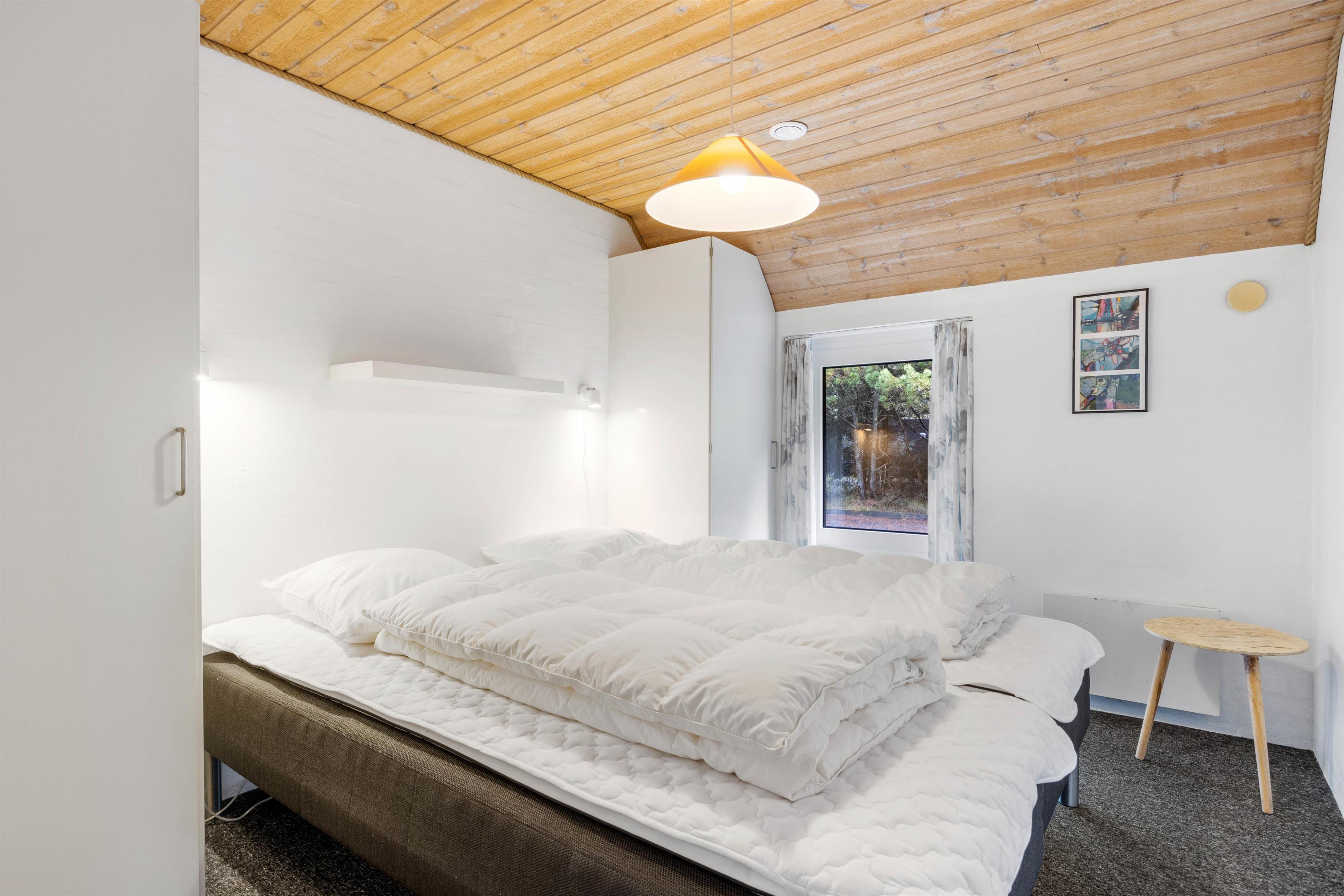 Husets hjerte, er den store stue som står i åben forbindelse med køkkenet. Her er hyggeligt og pænt indrettet med komfortable møbler, klinkegulve med gulvvarme, bordfodbold, fladskærm, brændeovn og så har du direkte kig ind til swimmingpoolen, så du kan holde øje med ungerne mens du hygger dig i stuen. I husets soveafdeling er der 4 virkelig pæne soveværelser, alle indrettet med dobbeltseng og skabsplads. Her er også det ene af husets 2 badeværelser, med gulvvarme og bruseniche. På den store hems er der 4 sovepladser, og der også er et TV til spil. I huset råder du også over en gratis trådløs internetforbindelse.