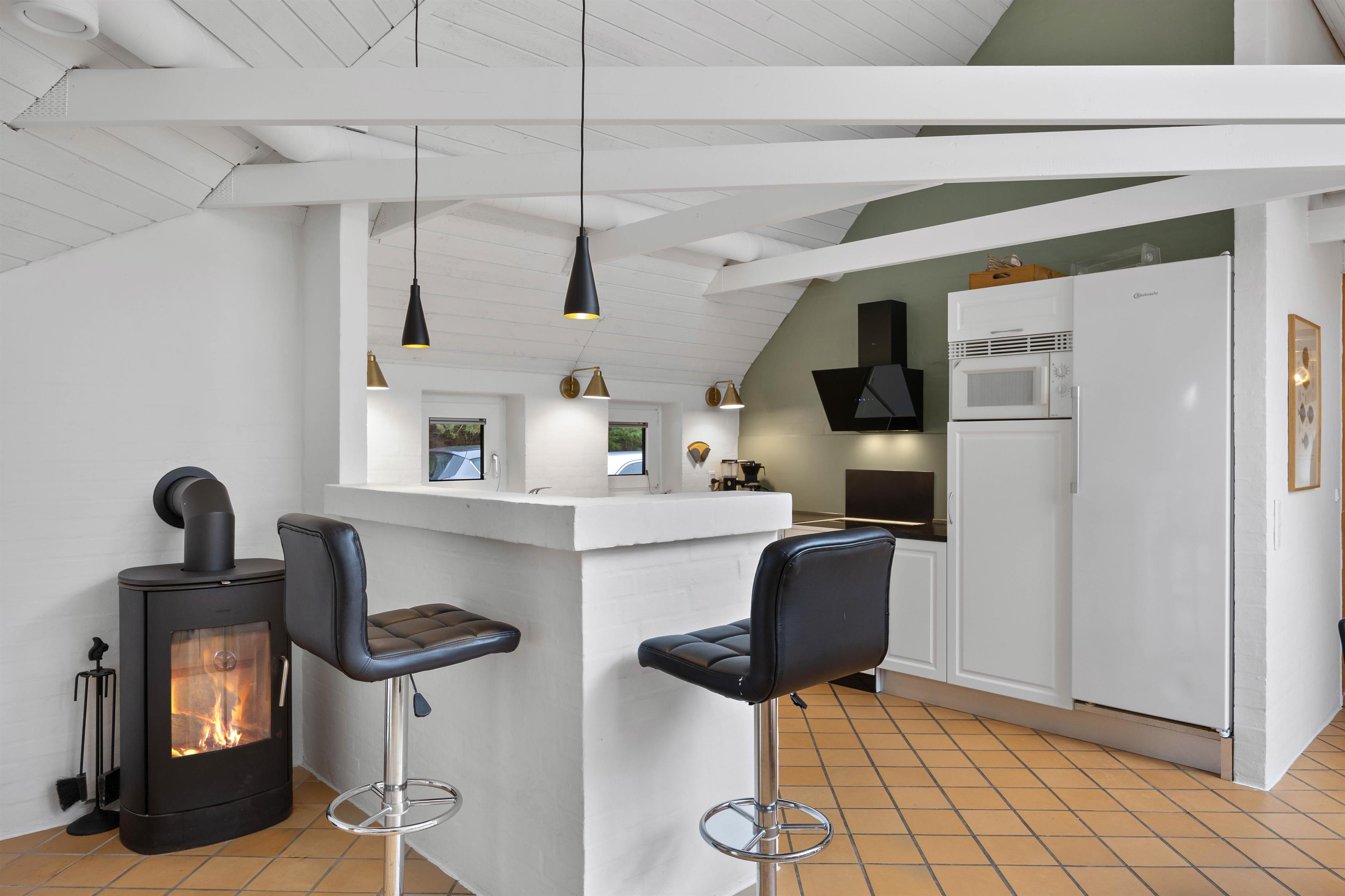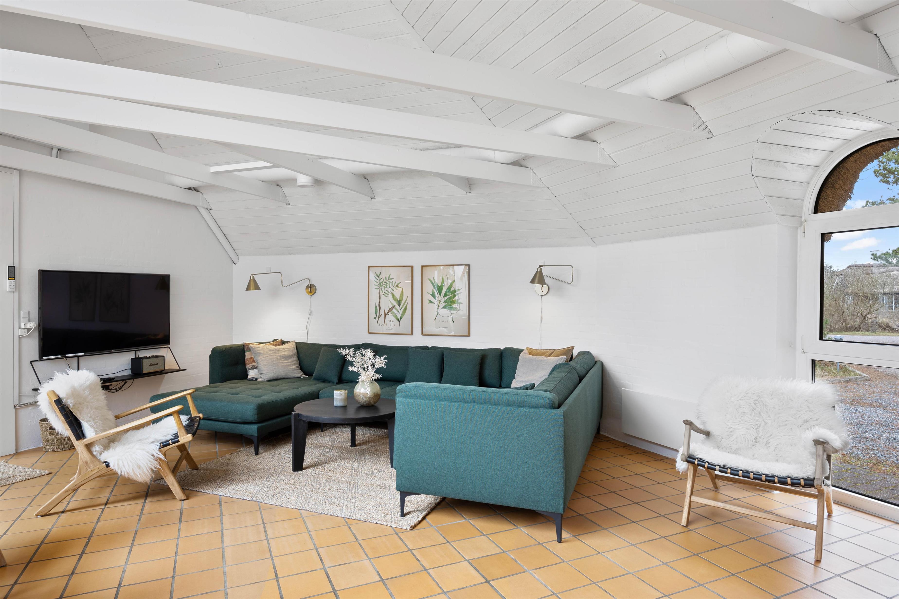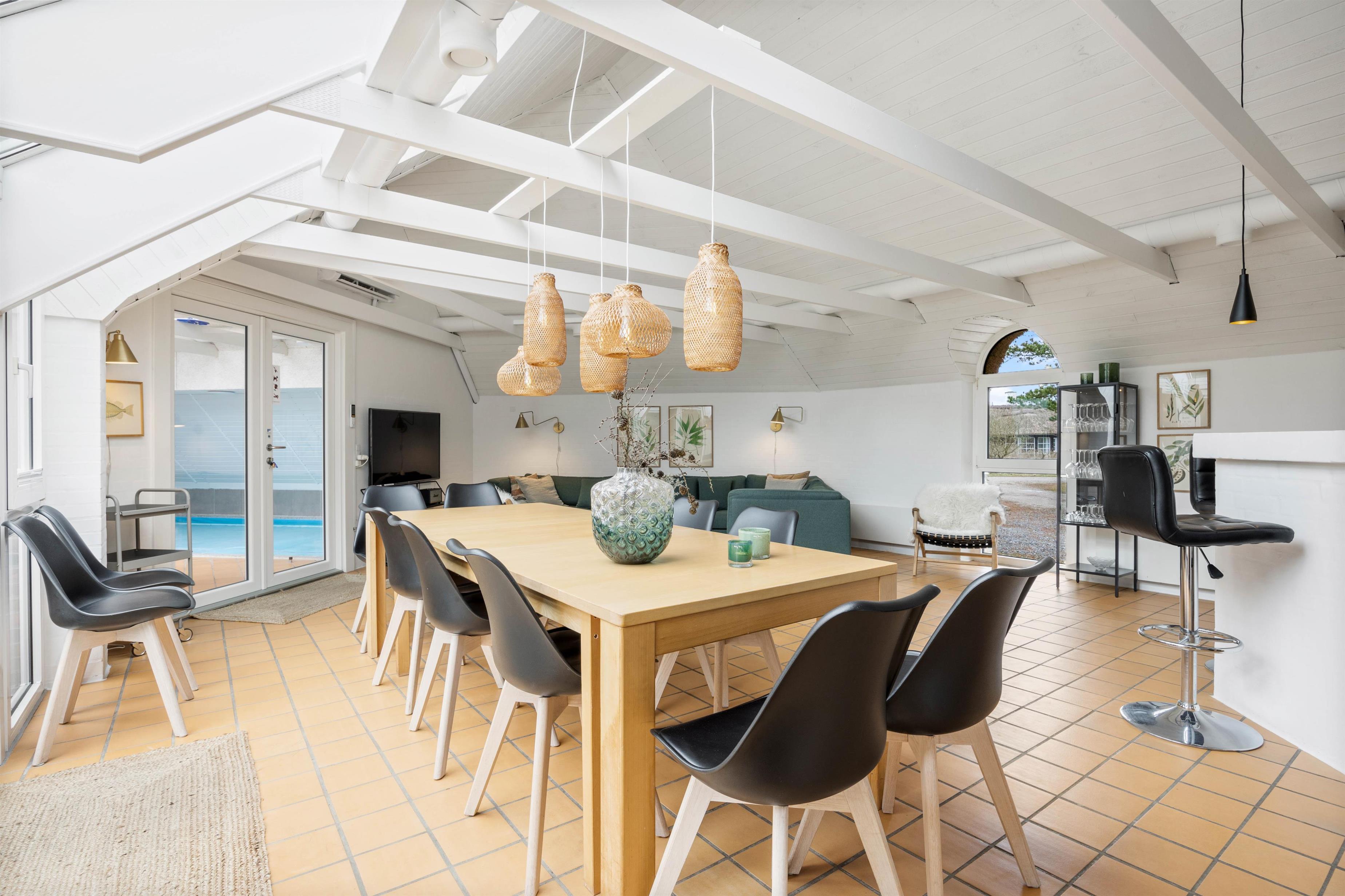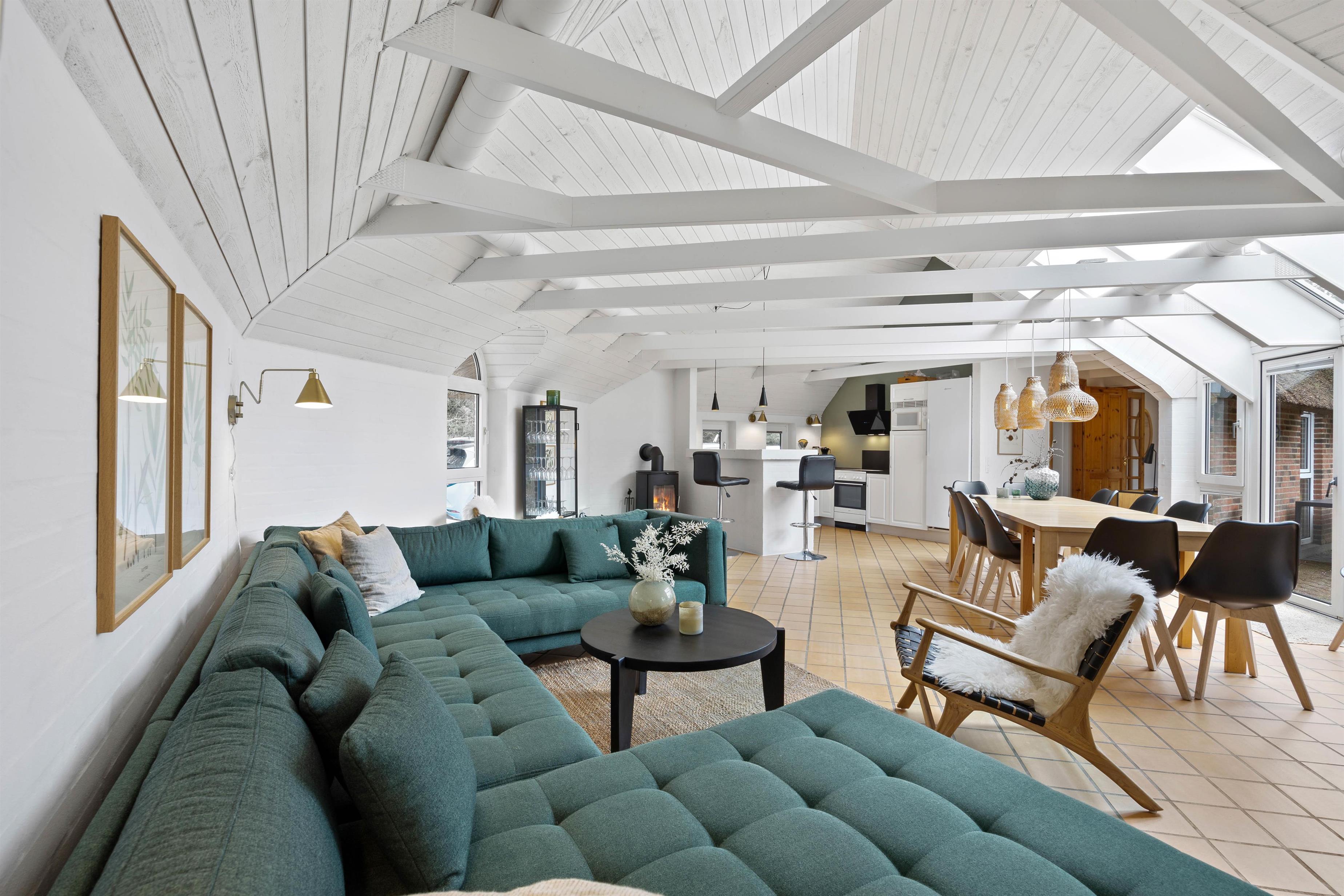 Husets hjerte, er den store stue som står i åben forbindelse med køkkenet. Her er hyggeligt og pænt indrettet med komfortable møbler, klinkegulve med gulvvarme, bordfodbold, fladskærm, brændeovn og så har du direkte kig ind til swimmingpoolen, så du kan holde øje med ungerne mens du hygger dig i stuen. I husets soveafdeling er der 4 virkelig pæne soveværelser, alle indrettet med dobbeltseng og skabsplads. Her er også det ene af husets 2 badeværelser, med gulvvarme og bruseniche. På den store hems er der 4 sovepladser, og der også er et TV til spil. I huset råder du også over en gratis trådløs internetforbindelse.