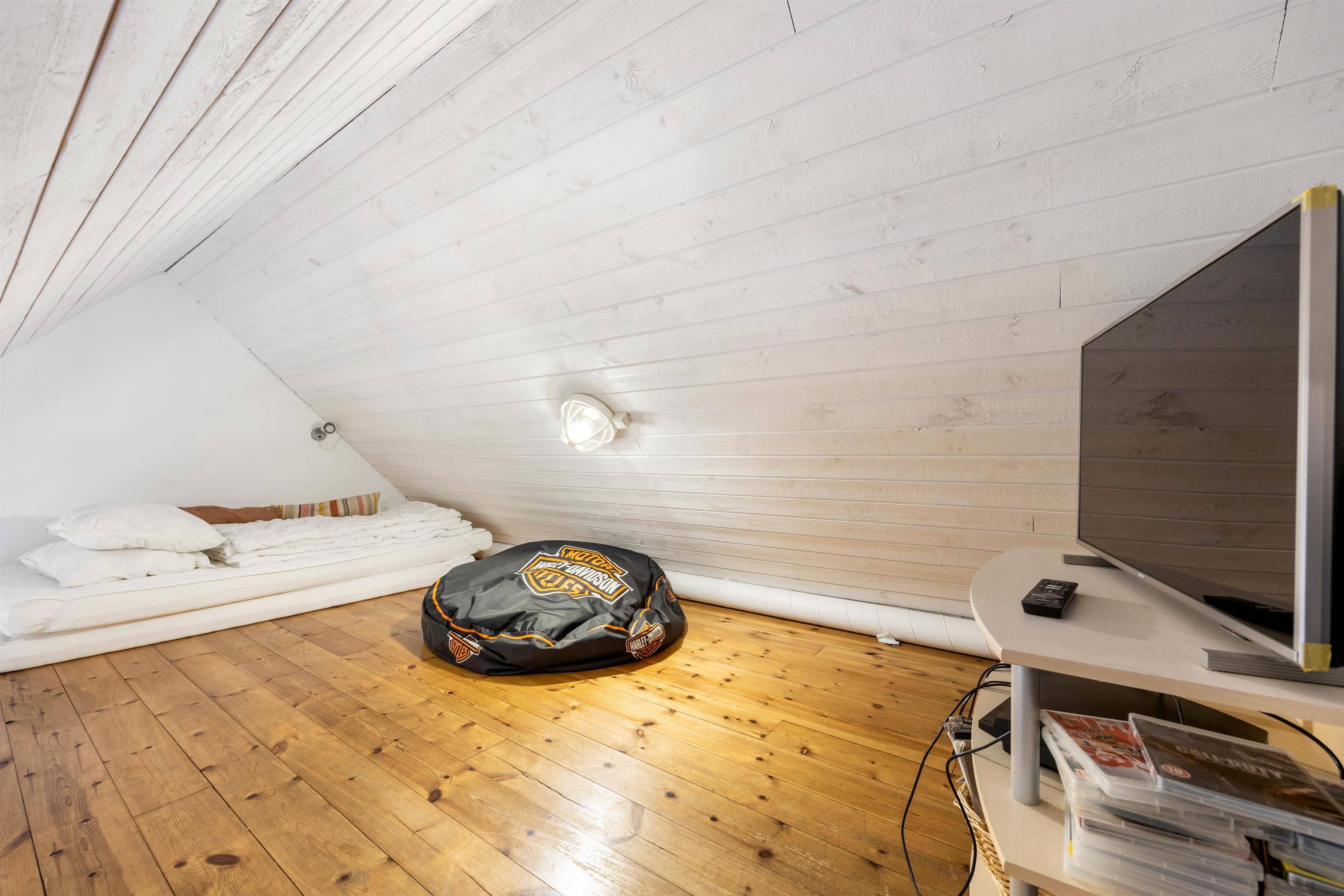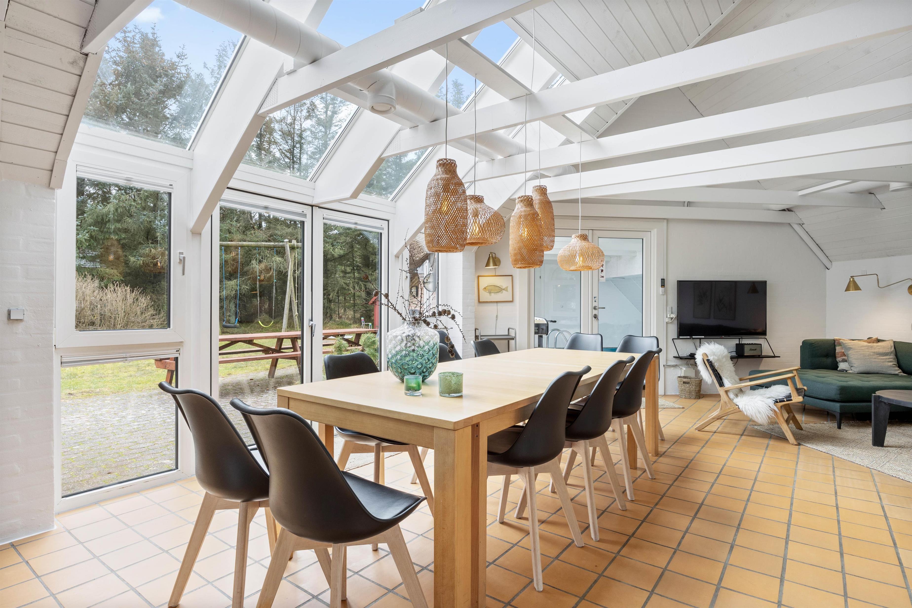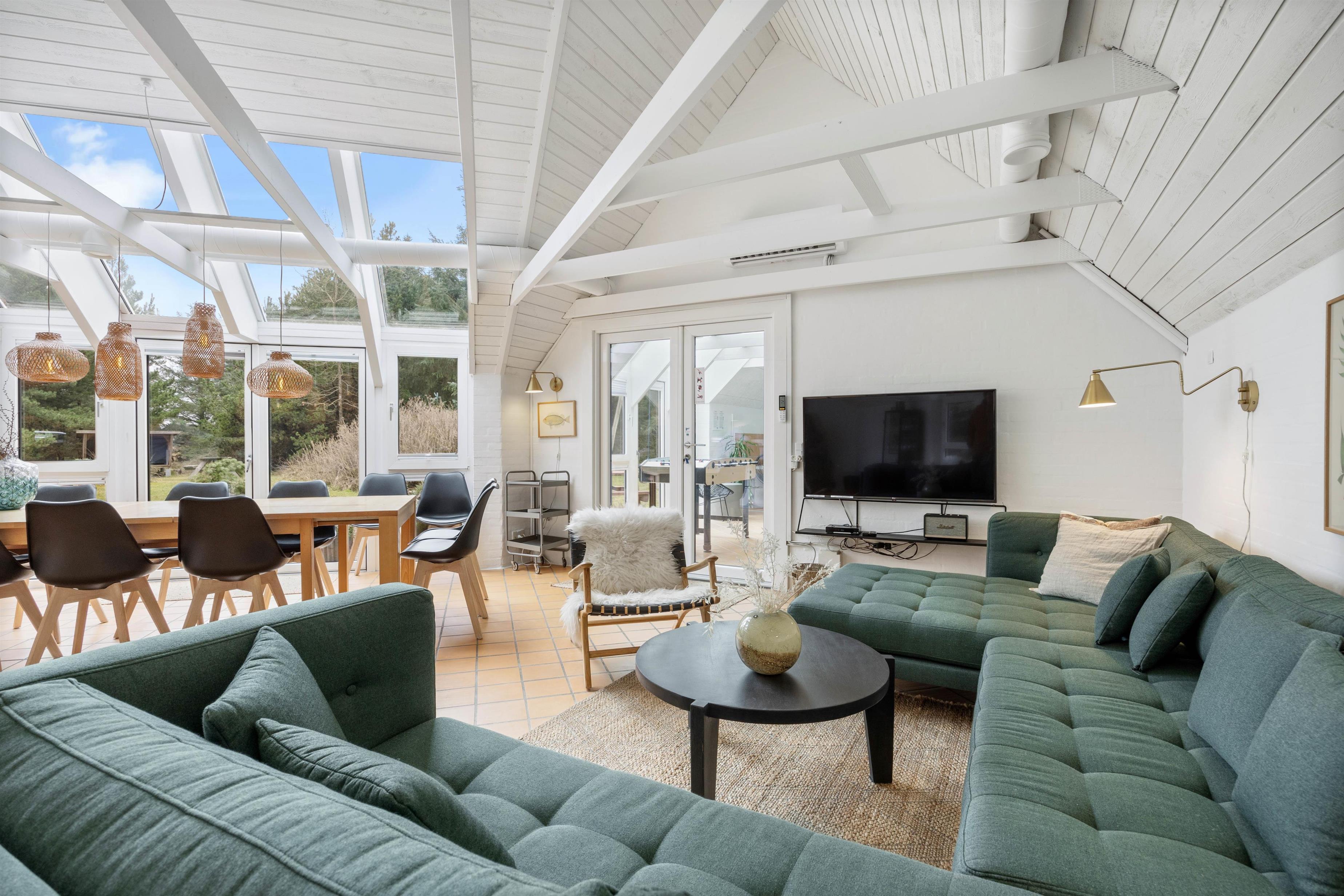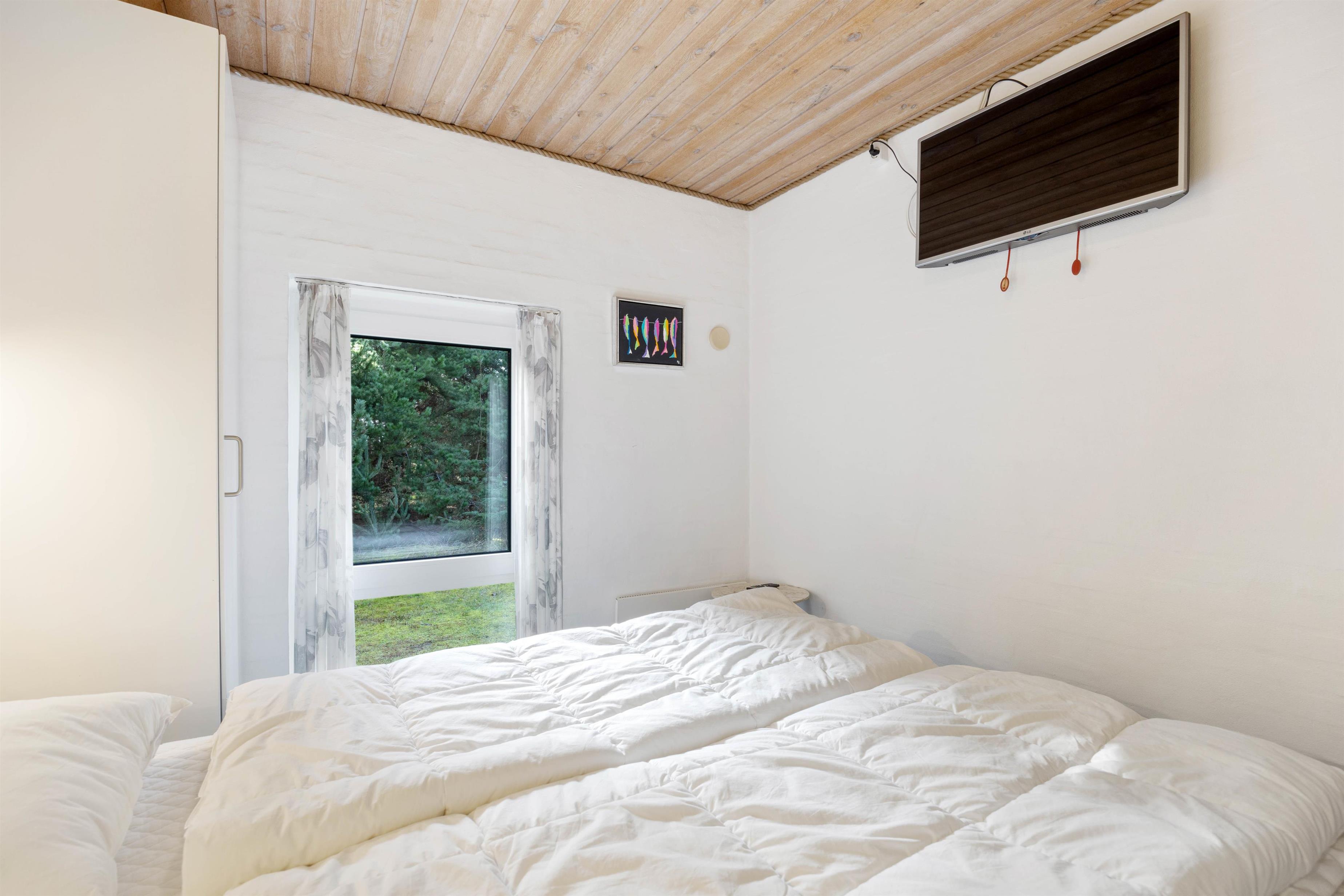 Husets hjerte, er den store stue som står i åben forbindelse med køkkenet. Her er hyggeligt og pænt indrettet med komfortable møbler, klinkegulve med gulvvarme, bordfodbold, fladskærm, brændeovn og så har du direkte kig ind til swimmingpoolen, så du kan holde øje med ungerne mens du hygger dig i stuen. I husets soveafdeling er der 4 virkelig pæne soveværelser, alle indrettet med dobbeltseng og skabsplads. Her er også det ene af husets 2 badeværelser, med gulvvarme og bruseniche. På den store hems er der 4 sovepladser, og der også er et TV til spil. I huset råder du også over en gratis trådløs internetforbindelse.