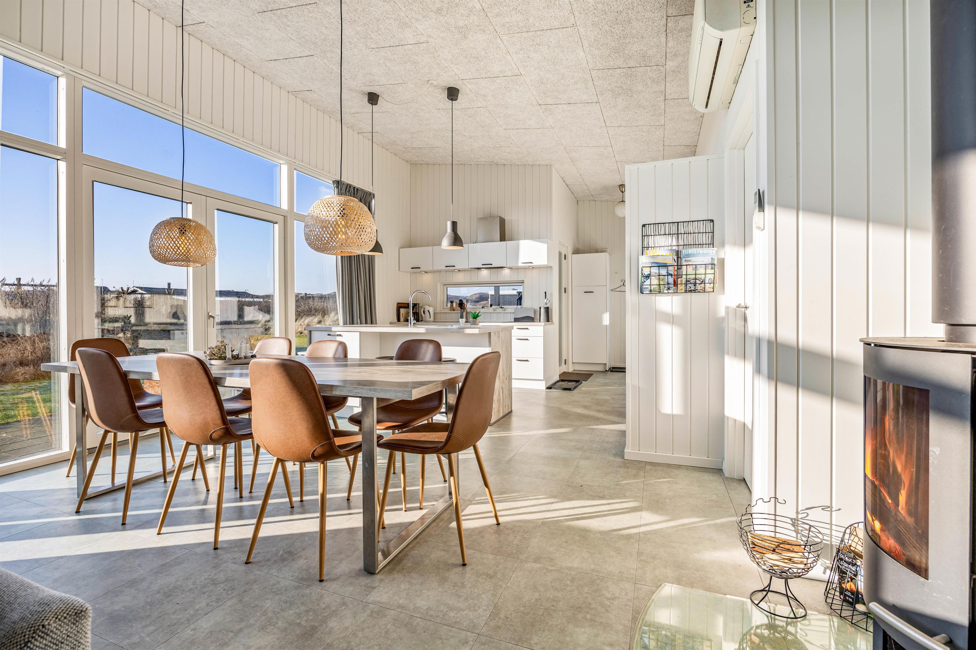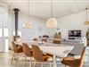 Det veludstyrede køkken-alrum ligger i åben forbindelse med stuen, hvor store vinduespartier skaber et behageligt og naturligt lysindfald. Mens nogle tilbereder måltider, kan andre hygge sig med brætspil ved spisebordet, uden at I går glip af samværet. Stuen er udstyret med en brændeovn, der både giver varme og skaber ægte sommerhusstemning. Alternativt kan I tænde for den energibesparende luft-til-luft varmepumpe, som sikrer et behageligt indeklima året rundt.