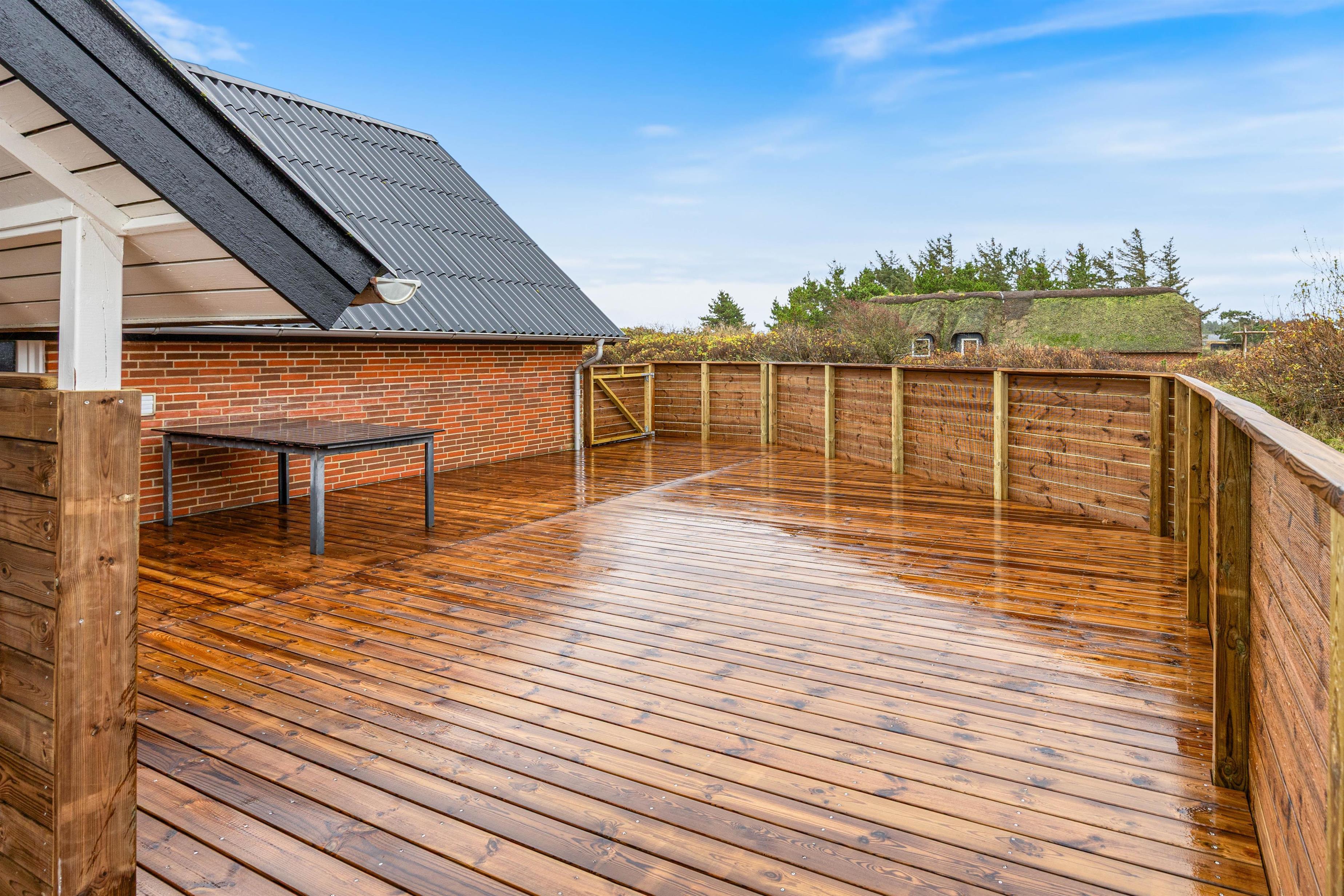 Sommerhuset er omgivet af en træterrasse med flere hyggelige kroge, hvor I kan nyde kaffen alt efter solens placering på himlen. Hele grunden måler 2.000 kvadratmeter, så der er masser af plads til at boltre sig, spille kongespil, petanque eller fodboldtennis.