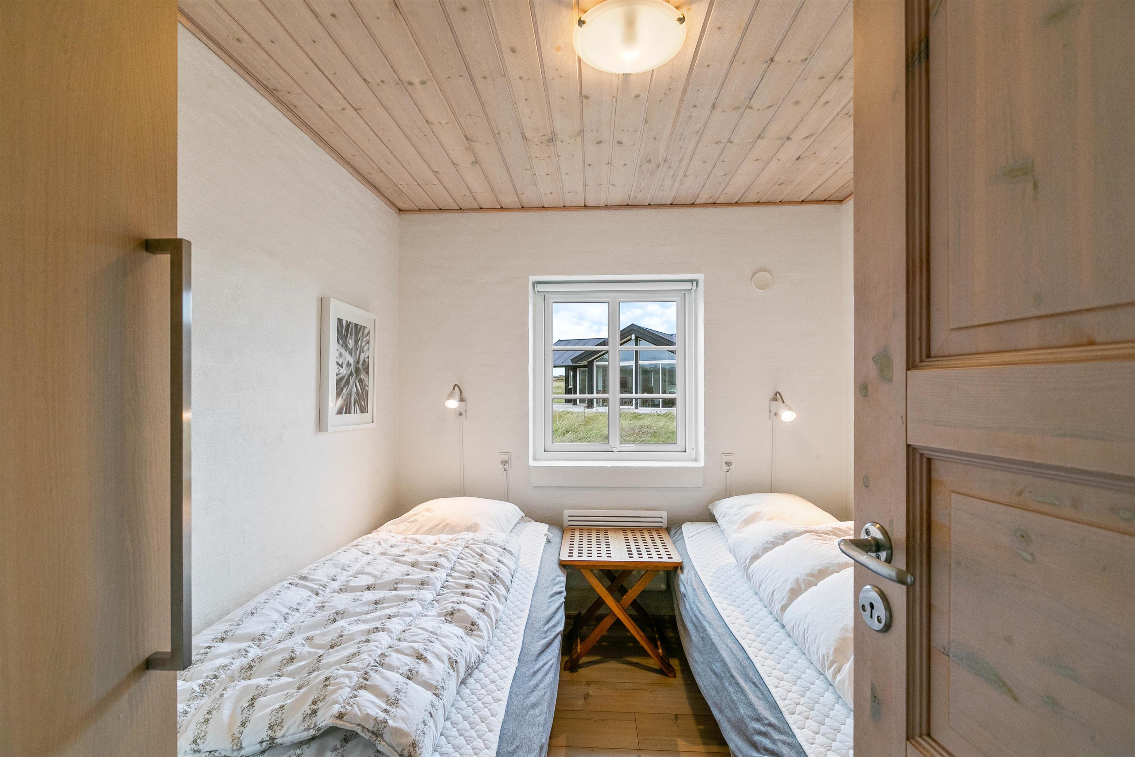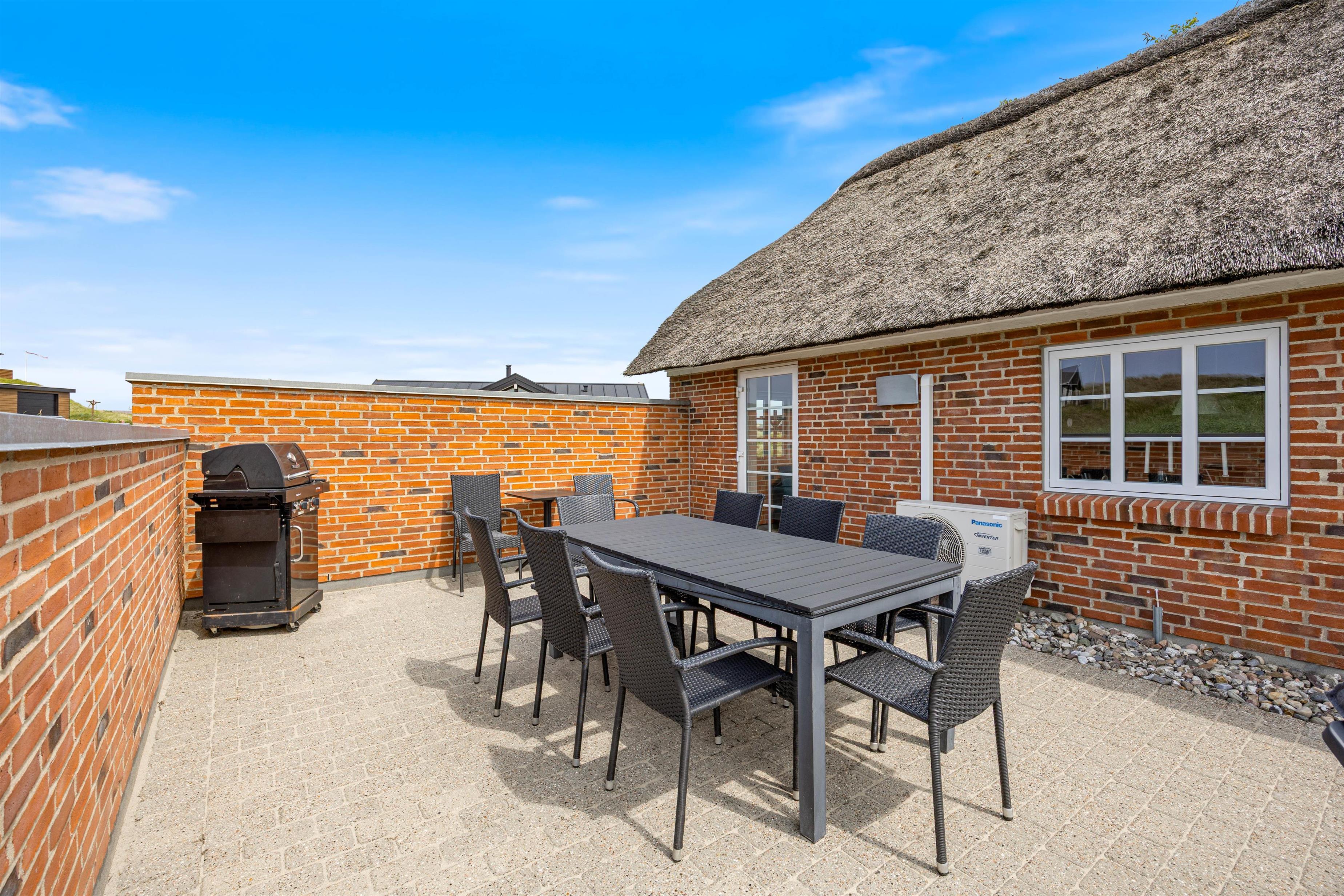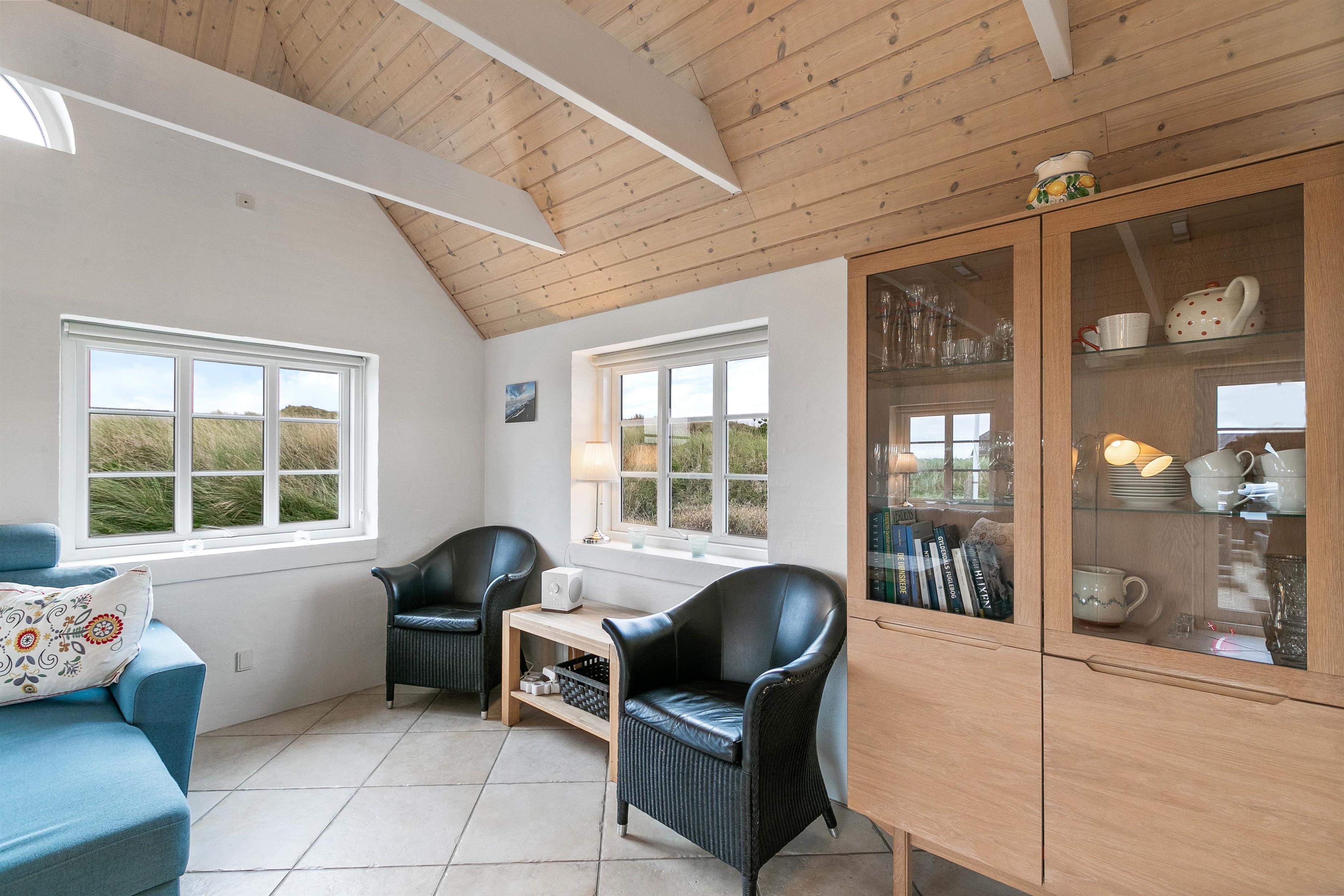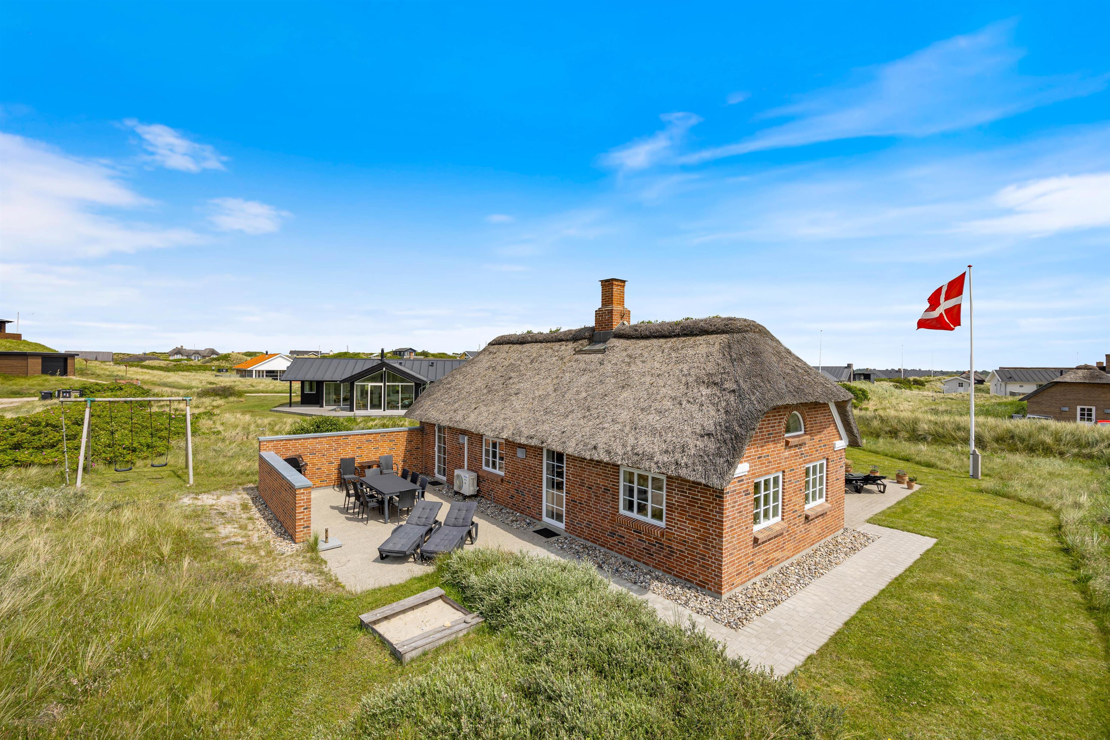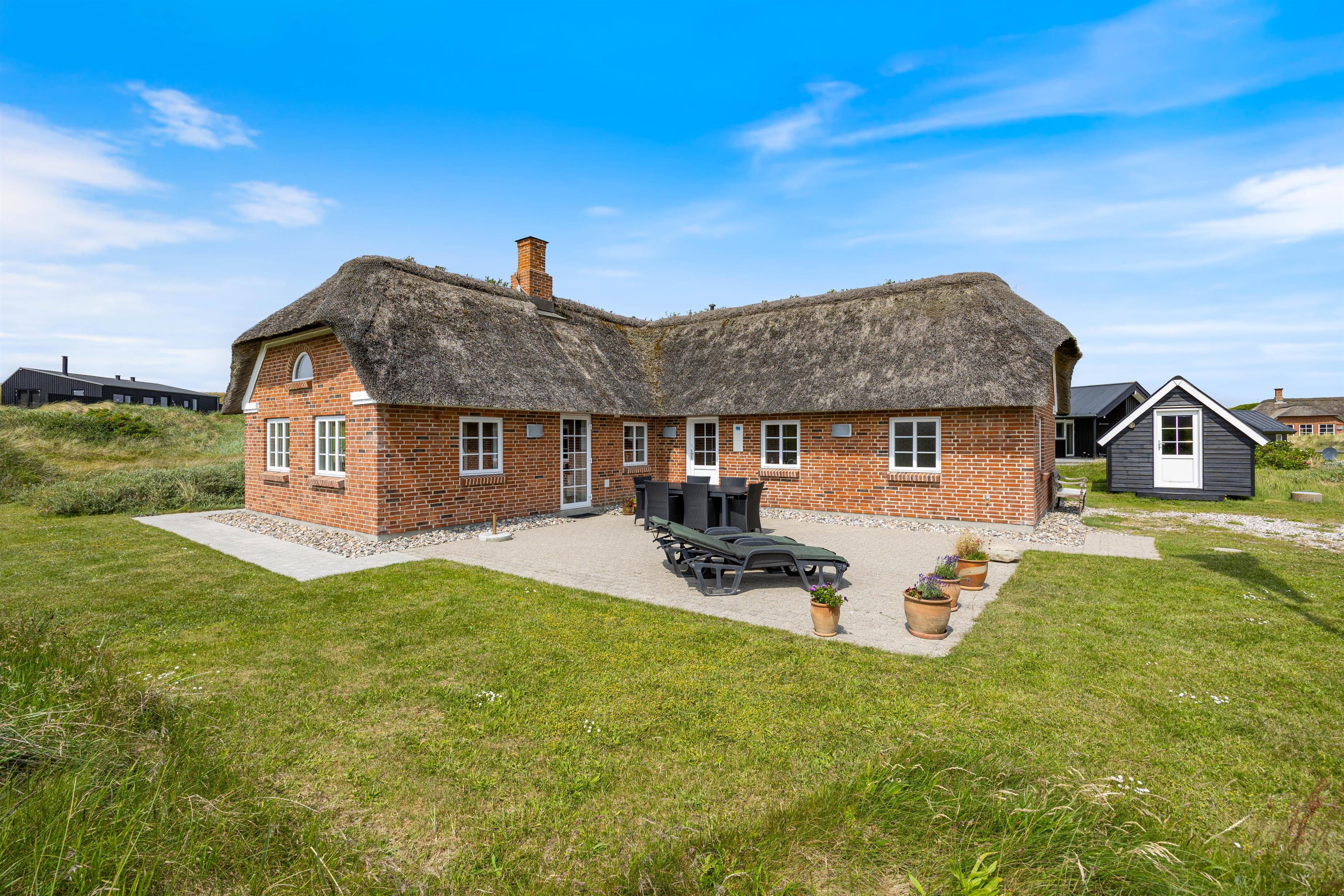 Dette smukke murstenshus med hvide sprossevinduer og stråtag ligger smukt på en rolig vej tæt på et fredet naturområde. Og er indbegrebet af et rigtigt sommerhus i Vestjylland. Huset er fantastisk dejligt og indbydende og bygget i førsteklasses materialer. Der plads til 8 personer i 3 skønne soveværelser og en hyggelig hems. Alle værelser er med trægulve. I to af værelserne er der dobbeltsenge og i det sidste 2 enkeltsenge. Der er to lækre badeværelser begge med gulvvarme bruseniche. Stuen er lys og venligt med loft til kip og synlige bjælker, og særdeles smagfuldt indrettet.