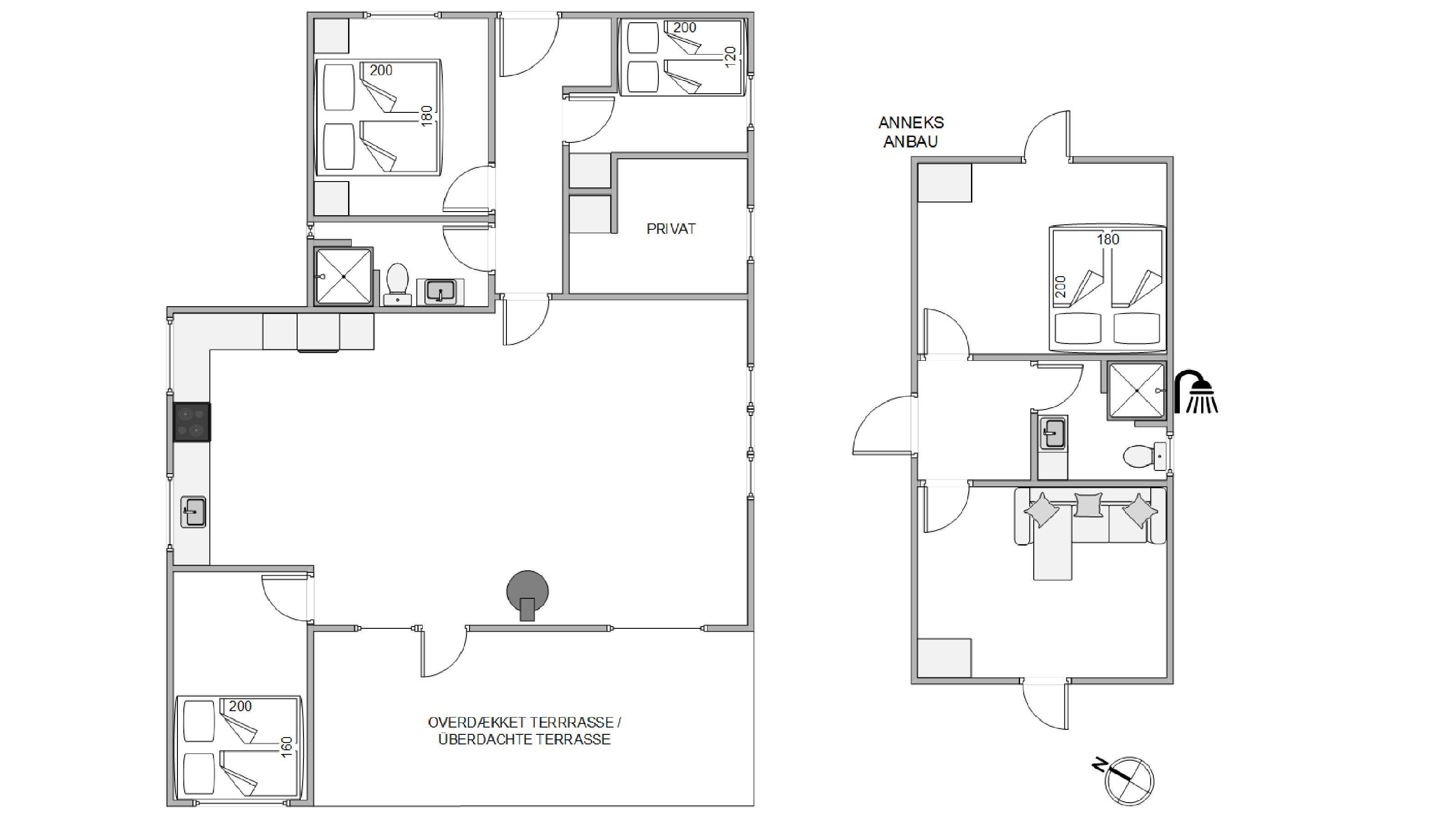 Huset indeholder 3 soveværelse inde i huset, samt et anneks med plads til fire opredninger og eget toilet. Annekset fra 2017 er perfekt enten til teenagerne eller, hvis man er flere par, der holder ferie sammen, for i annekset findes også eget badeværelse. Feriehuset og annekset er forbundet af den dejligeste træ terrasse.