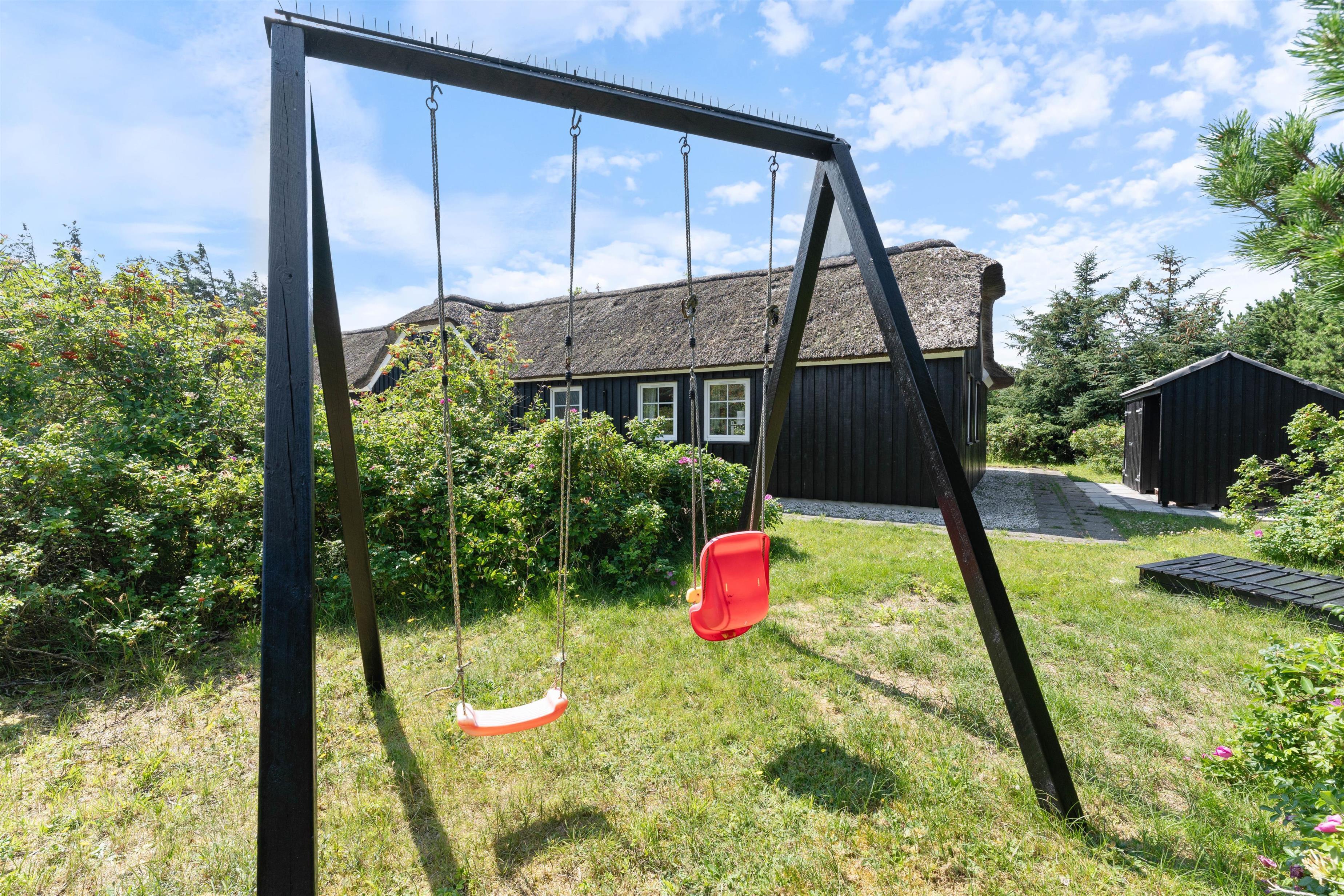 Med dette sommerhus får i en skøn beliggenhed på en naturgrund tæt på både hede og strand. På den dejlige terrasse mod syd er der havemøbler og liggestole, hvor de voksne rigtigt kan læne sig tilbage, mens børnene frit kan lege i sandkassen eller på gyngen. Sommerhuset har desuden en carport, hvor jeres bil kan stå beskyttet.