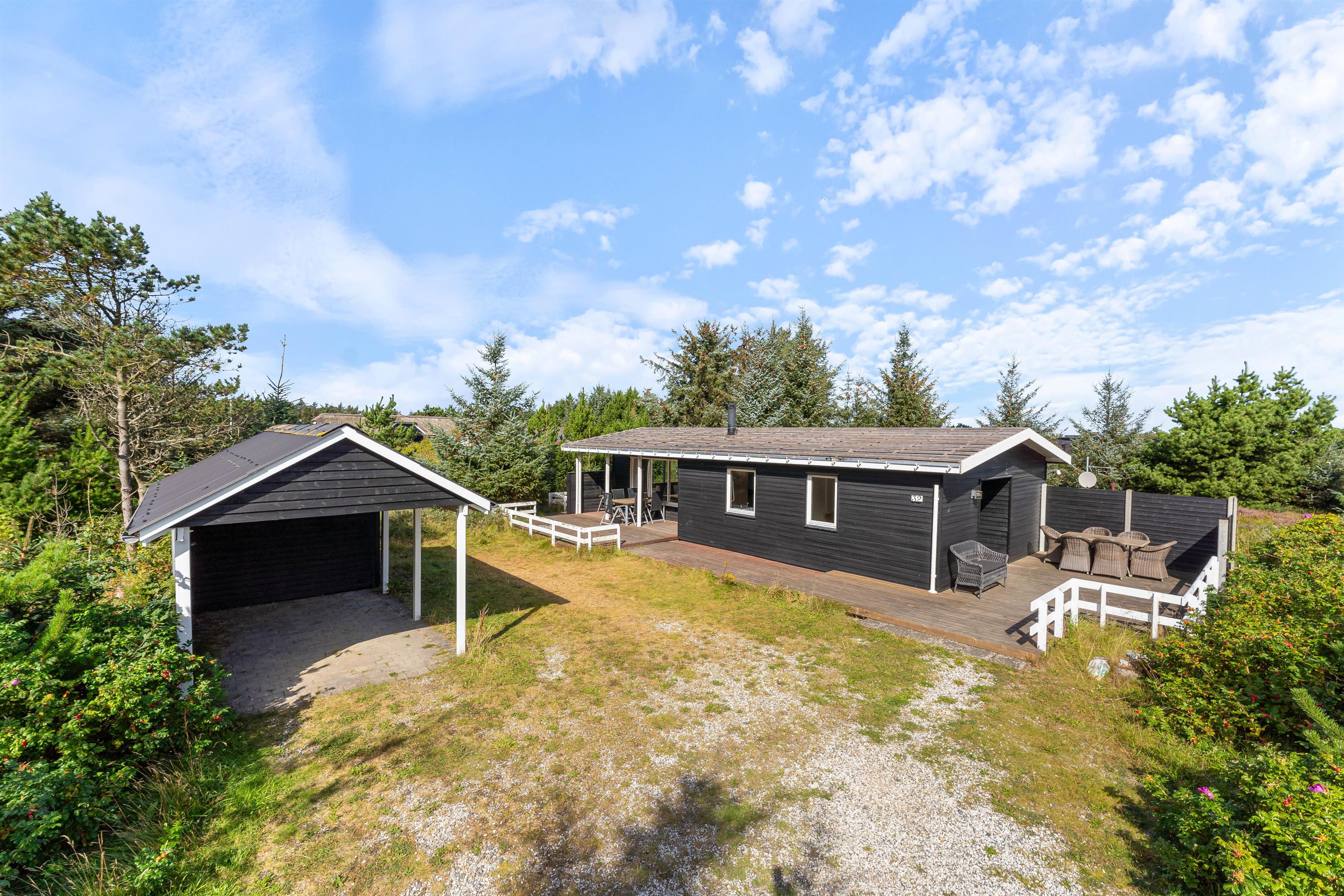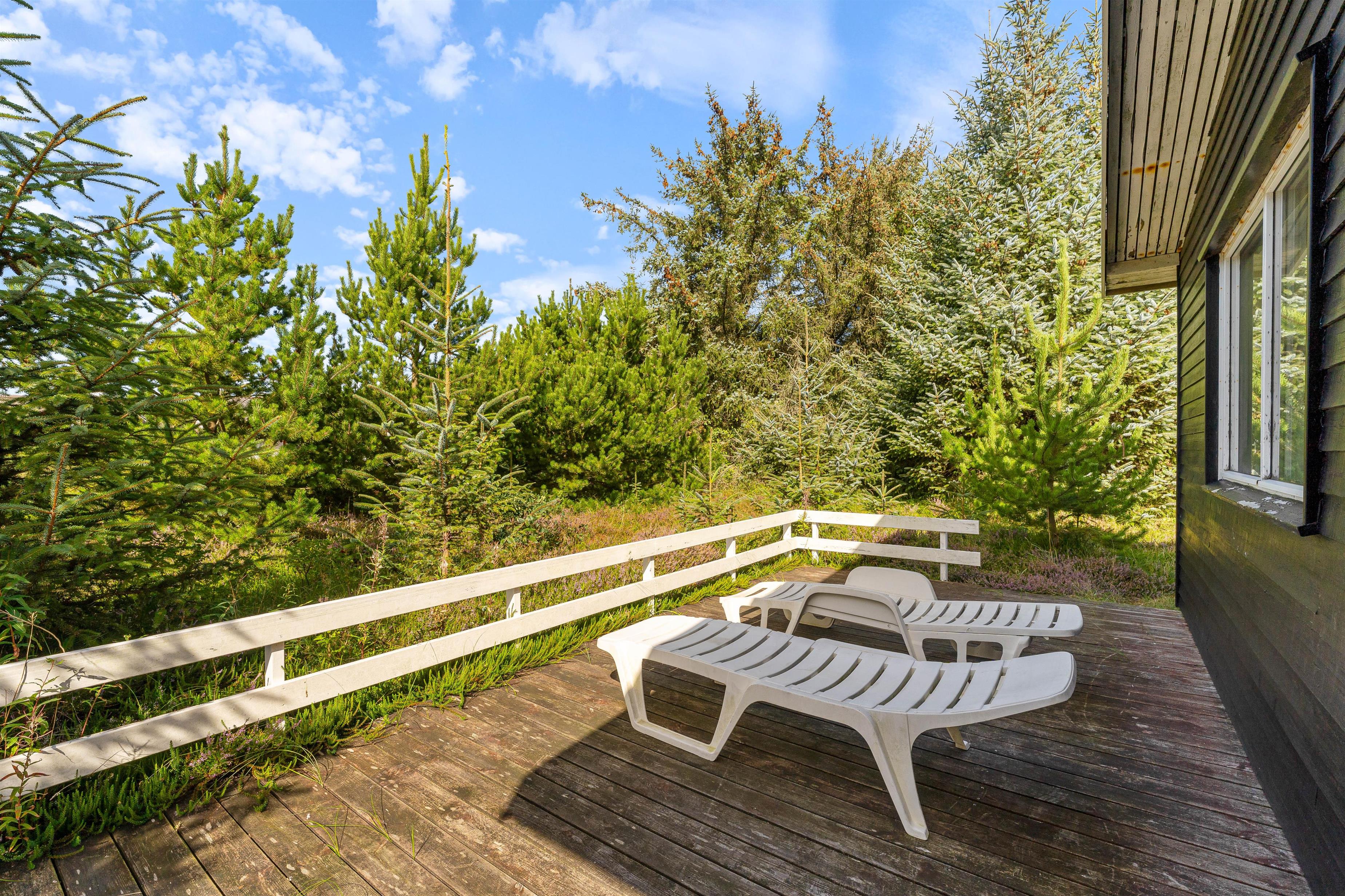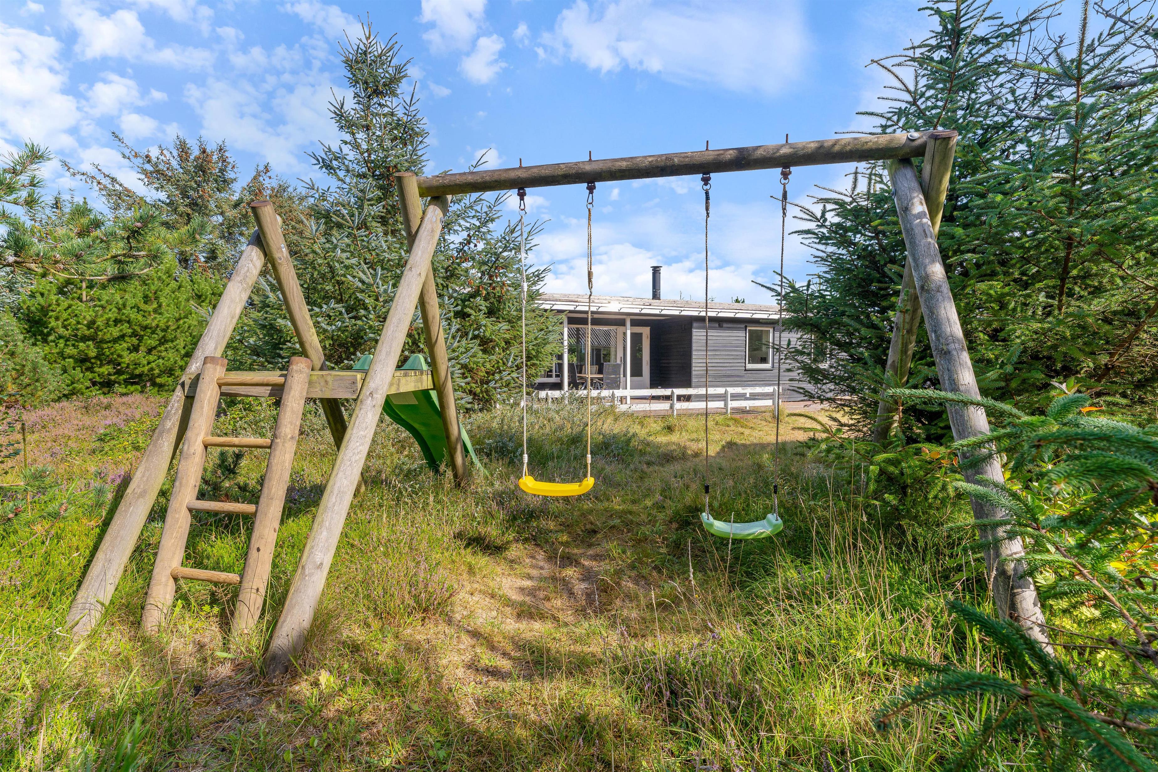 Udendørsområderne ved dette sommerhus i Søndervig er ideelle til både afslapning og leg. Den overdækkede terrasse er perfekt til hyggelige grillaftener med venner og familie. Med tilhørende havemøbler kan I nyde de lange sommeraftener sammen. For børnene er der opsat en gynge, som vil give mange timers sjov. Naturgrunden på 2286m2 giver masser af plads til leg og udforskning. Grunden ligger blot 650 meter fra havet, så I kan nemt tage en forfriskende dukkert eller en afslappende spadseretur langs stranden.