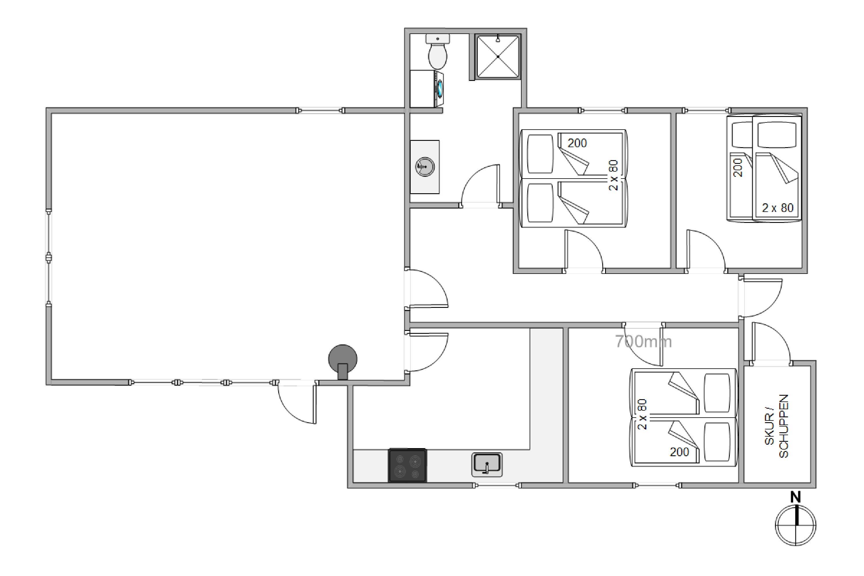 Samlet set består huset 78m2. Sommerhuset byder på tre hyggelige soverum, hvoraf to er udstyret med dobbeltsenge. Uanset om I kommer som familie eller venner, vil I finde sovepladserne bekvemme og afslappende. Det tredje soverum kan tilpasses jeres behov og sikrer en god nattesøvn til alle gæster. Med gulvvarme på badeværelset kan I glæde jer til en varm start på dagen, selv på kølige morgener.