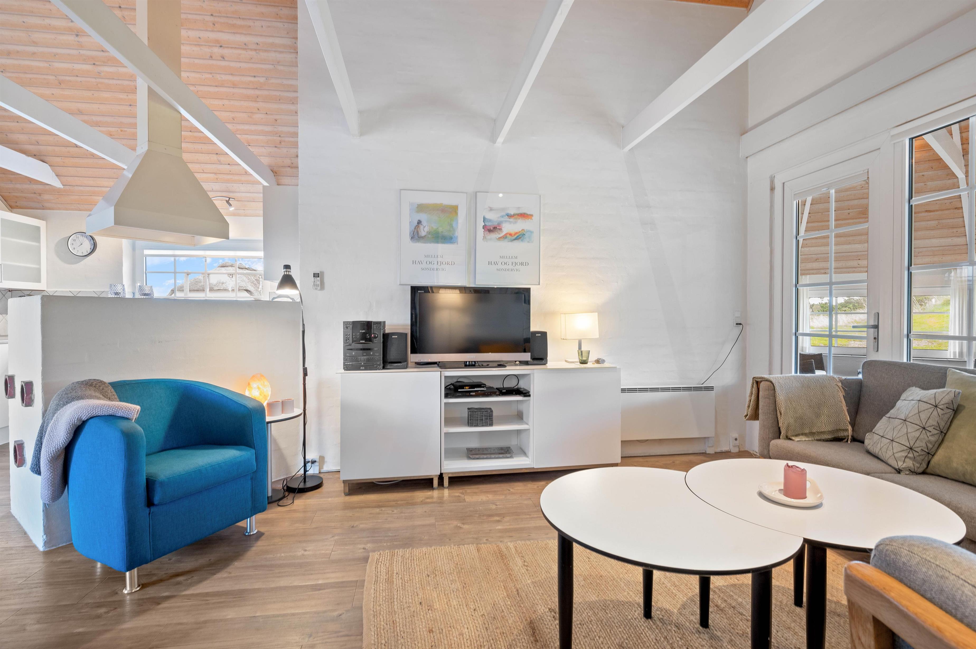Indenfor bydes I velkommen af en pæn og lys indretning, hvor der synlige loftbjælker og træpaneler. Der er praktiske og rengøringsvenlige gulve i huset, og er man mange, er det skønt med 2 badeværelser. Børn vil nyde den store runde spa. Der er den store Boxer-TV-pakke i huset, med mange danske kanaler. Sommerhuset er på 117 m2 og fordeler sig på 4 soverum, hvoraf de 3 har dobbeltsenge.