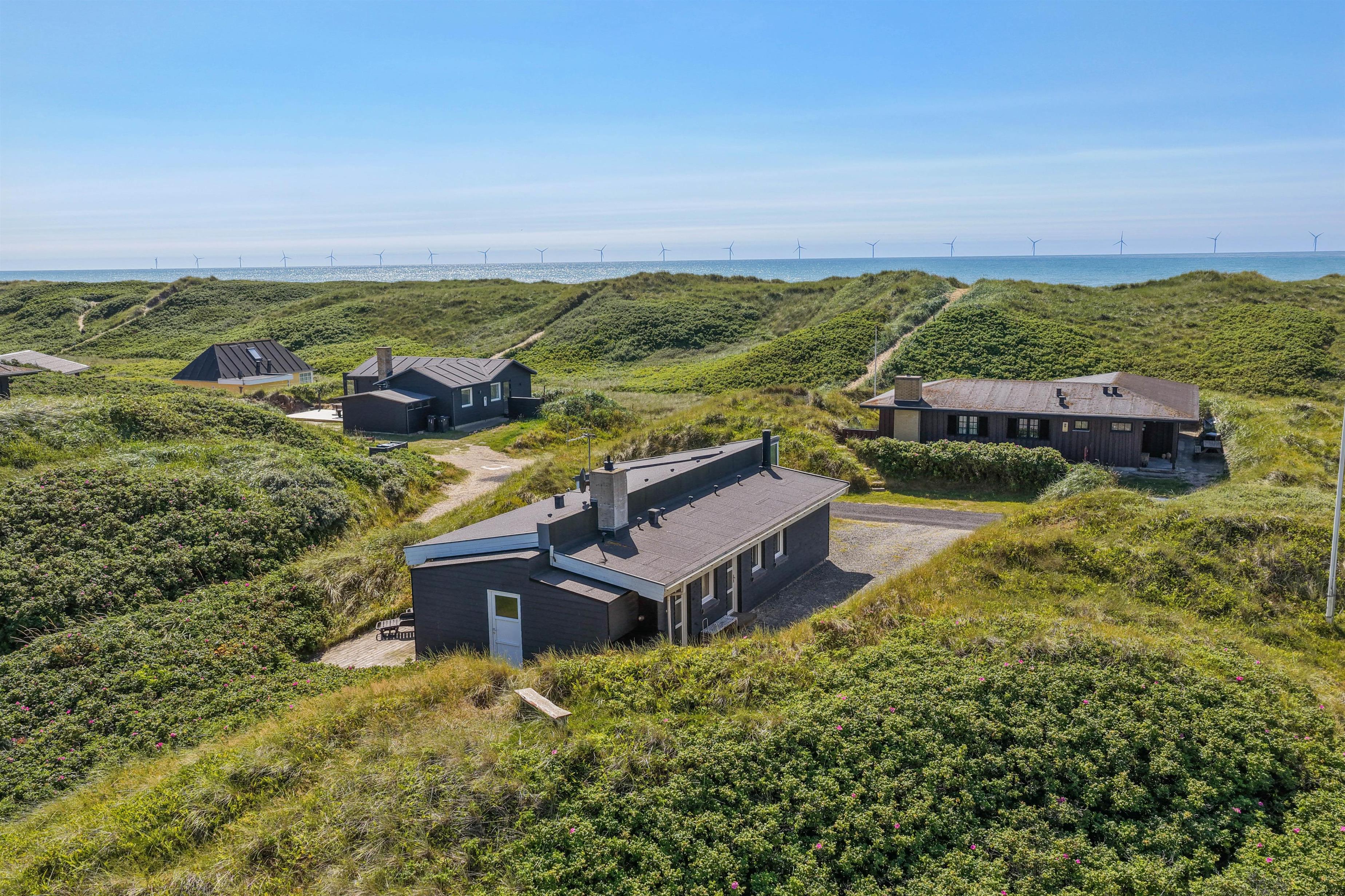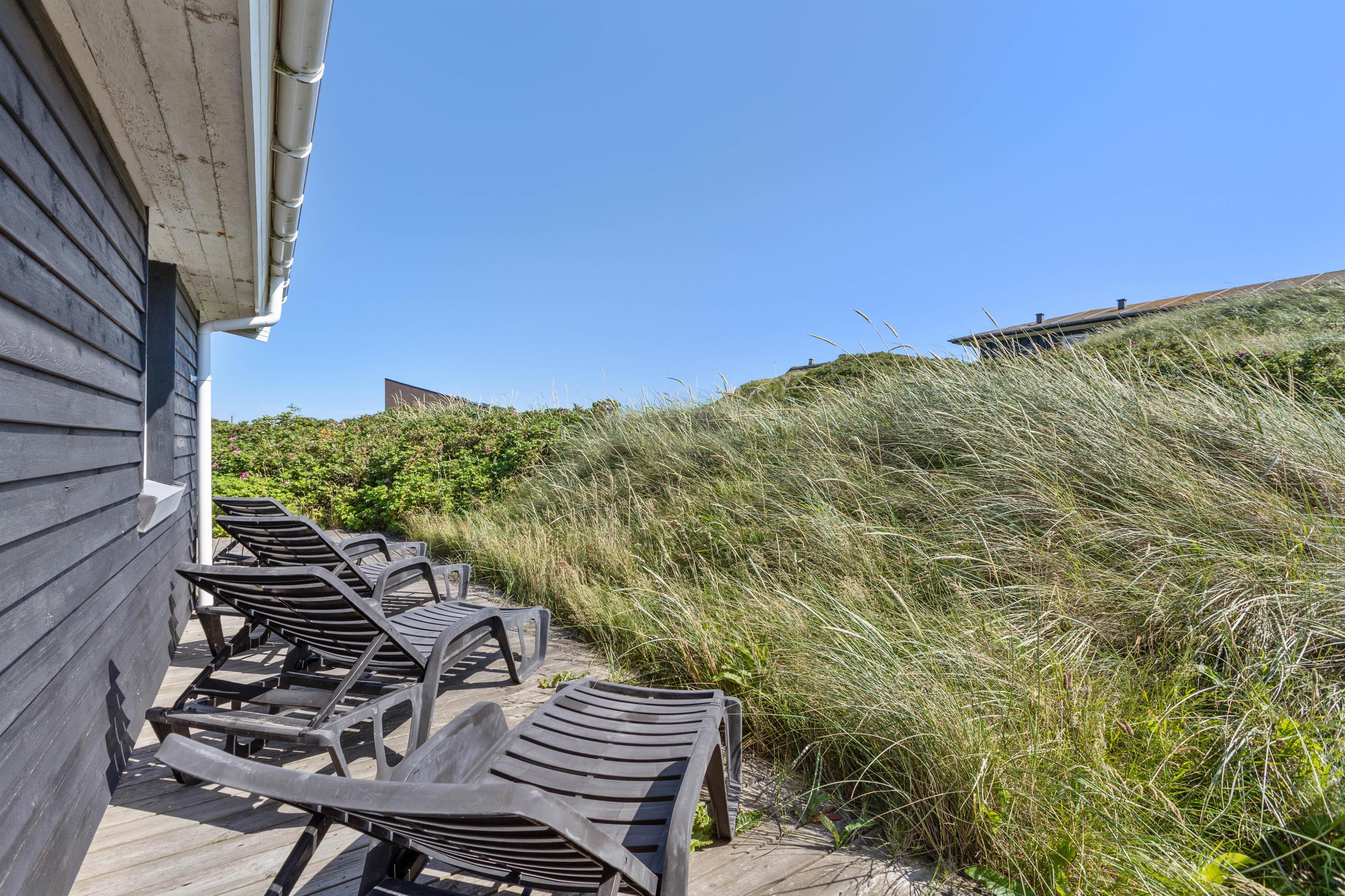 Hvis du søger fred og ro, kan du lade blikket vandre over klitterne og lytte til lyden af havet. På kølige aftener sørger brændeovnen i feriehuset for hyggelig varme og en afslappende udsigt til flammerne. Her kan du runde ferien af med et glas vin. Stuens store vinduespartier, der går fra gulv til loft giver jer, inviterer også den skønne natur helt indenfor