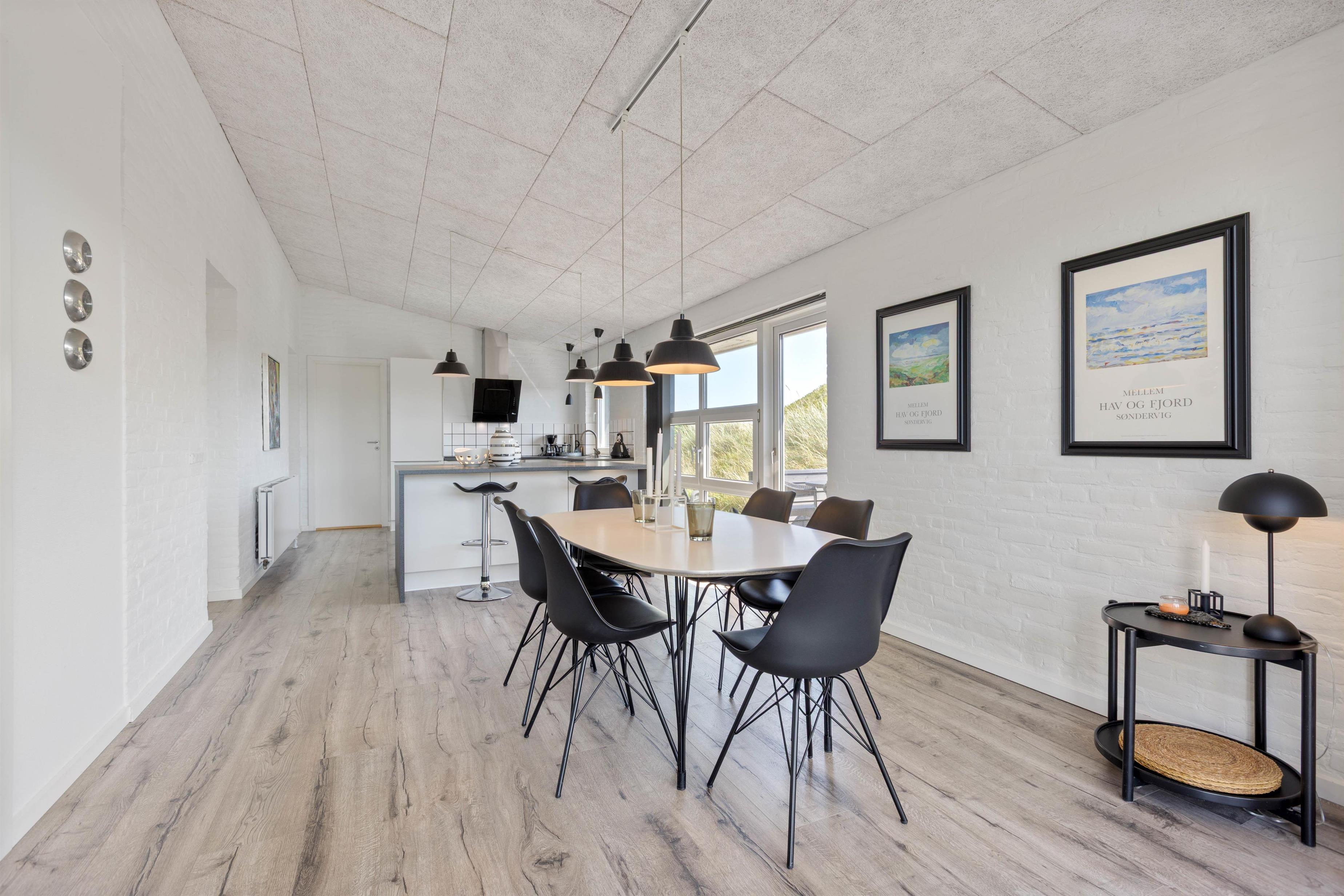 De lyse lofter og vægge reflekterer lyset godt og sørger for en dejlige varm og indbydende atmosfære i indretningen. Samtidig sørger de store vinduespartier også for et godt lysindfald. De mørkere møbler og køkkenbordplade skaber samtidig en god og moderne kontrast i indretningen. Husets udstyret med et stort køkken-alrum som også er opdelt i to afdelinger. I den ene afdeling finder i sofa-møblementet og fjernsyn, der især lægger op til afslapning efter en lang dag hvor I har udforsket lokalområdet.