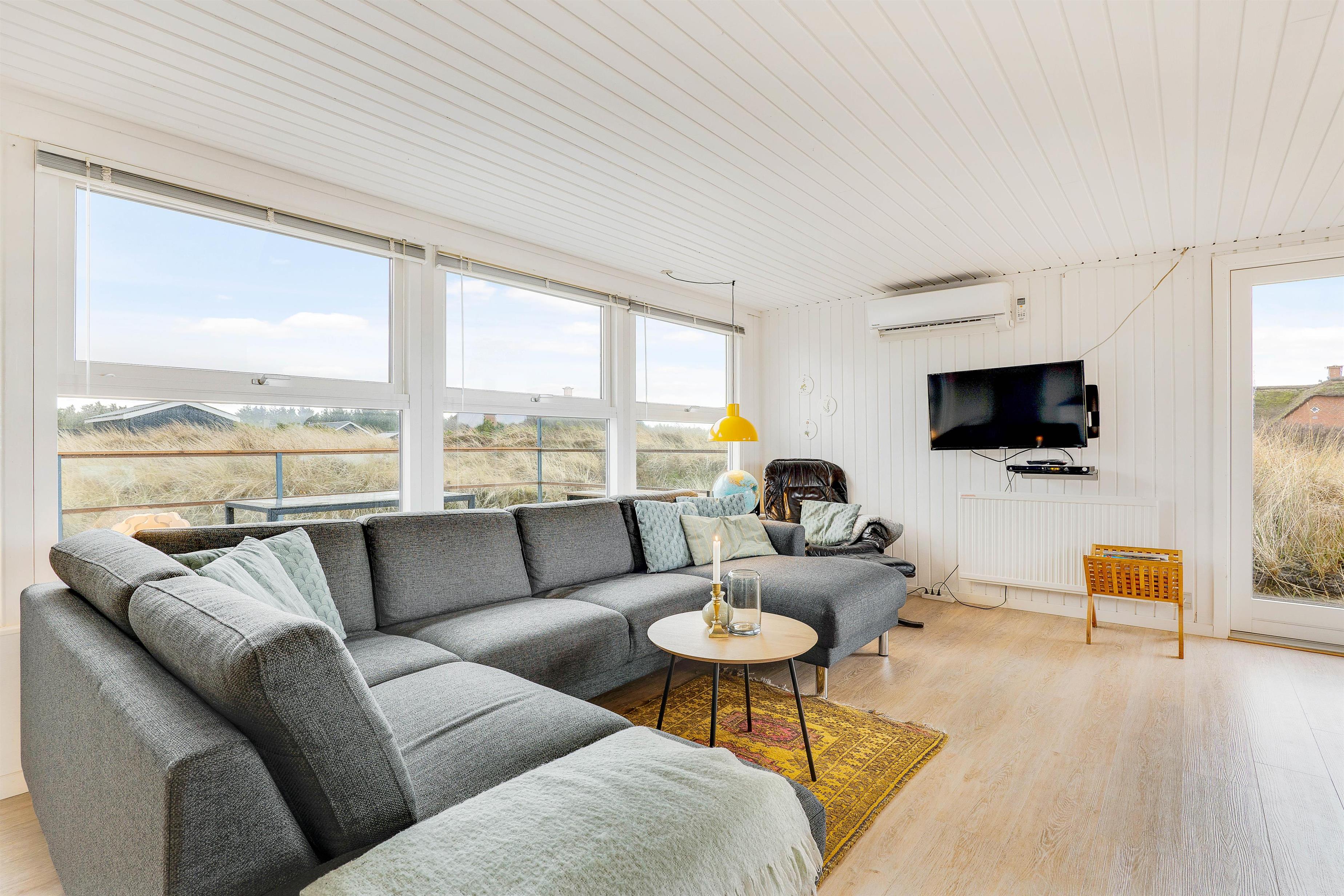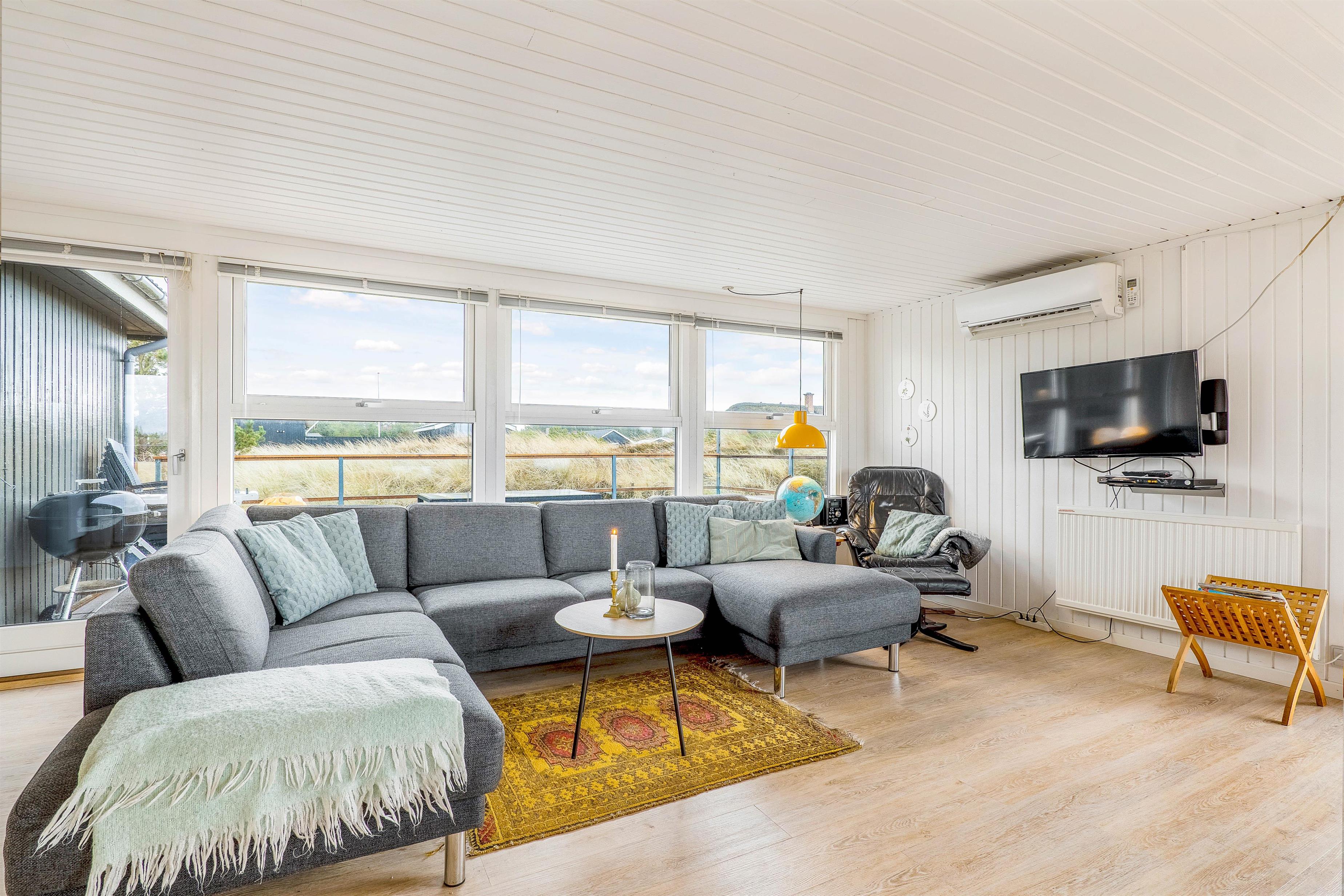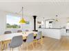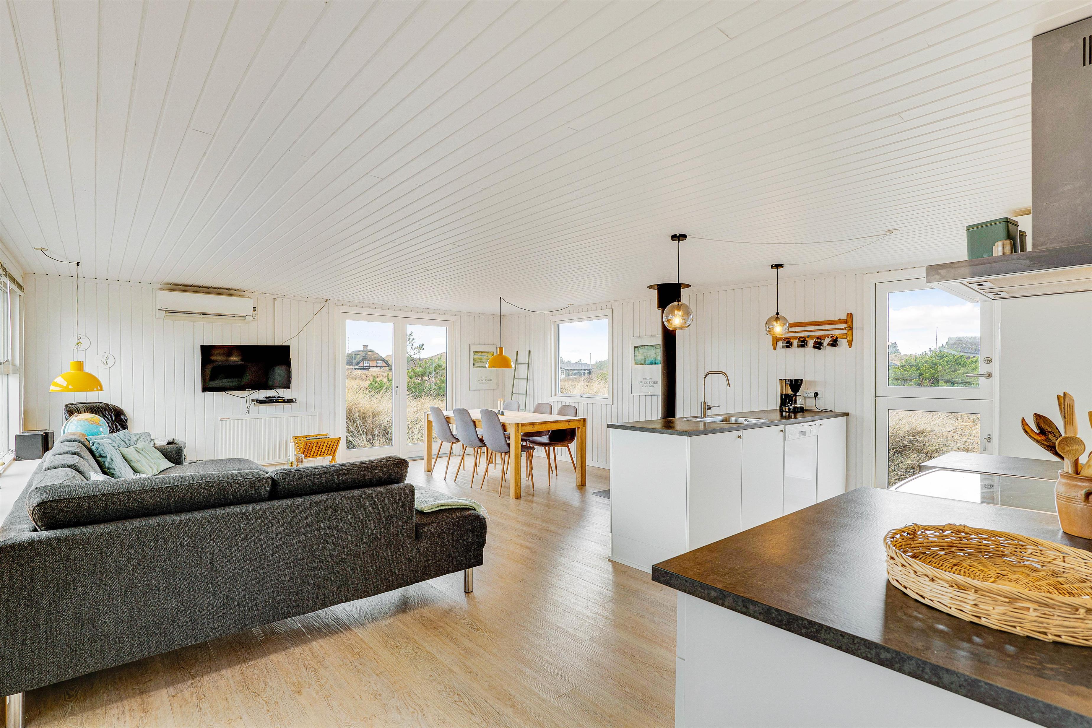 Det åbne opholdsrum fungerer som sommerhusets hjerte, og her er køkken og stue slået sammen til ét stort fællesrum. I centrum står den klassiske brændeovn, som spreder masser af god stemning og varme på de kølige feriedage. Er brændeovnen ikke i gang, har i mulighed for at bruge den energibesparende luft til luft varmepumpe.