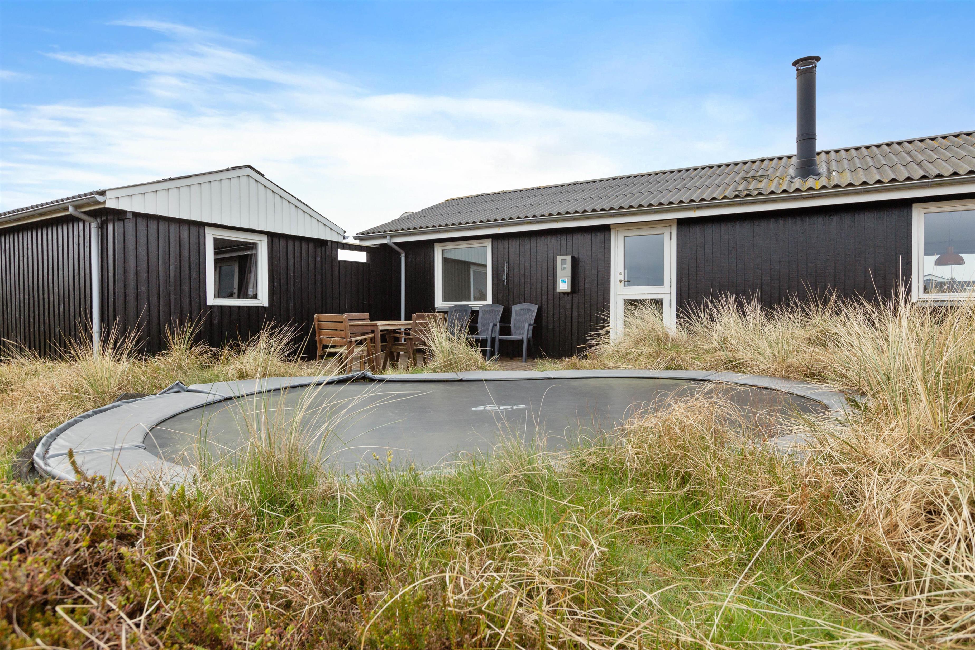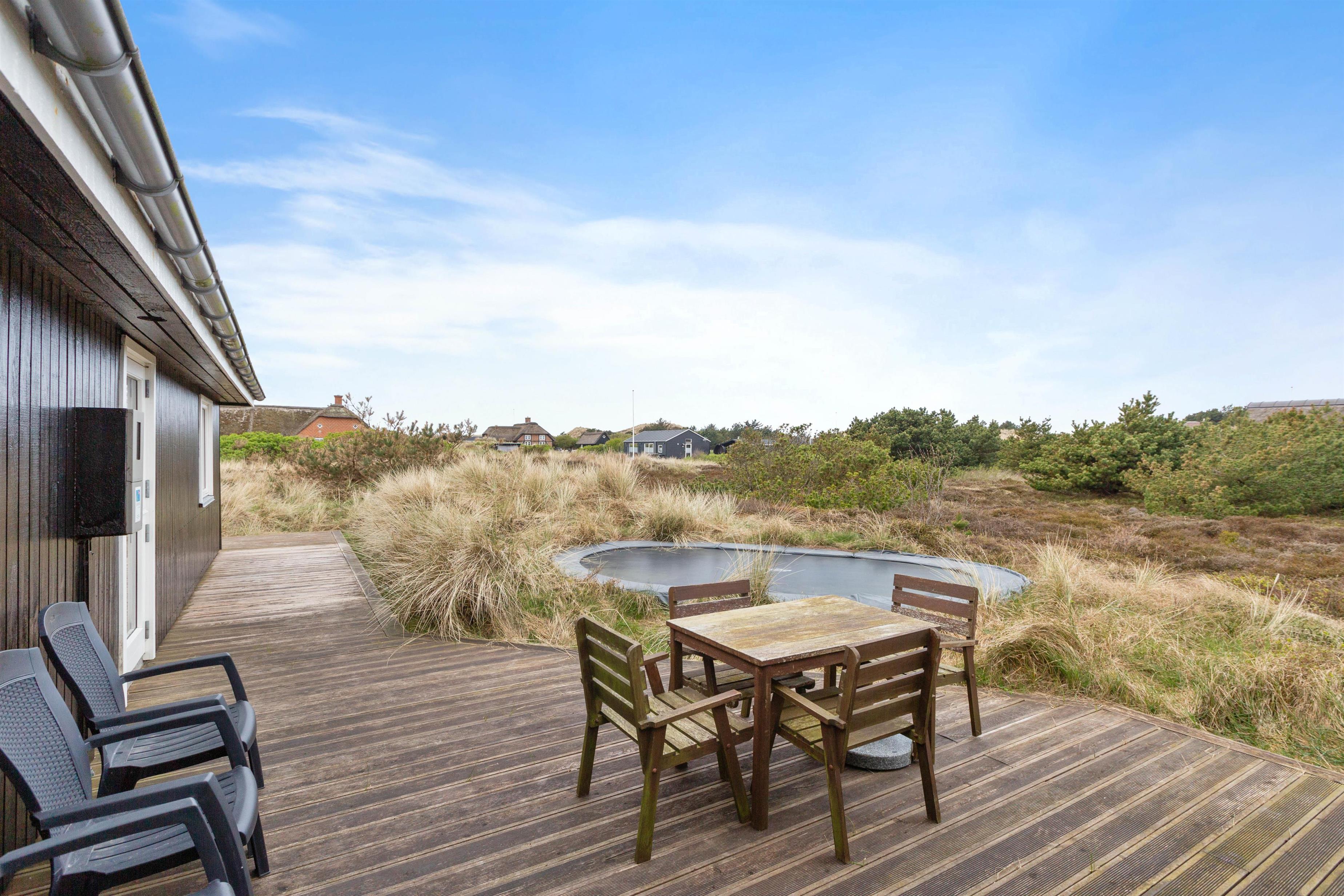 Fra stueafdelingen kommer I ud på den afskærmede terrasse, hvor I helt ugeneret kan nyde det gode vejr og den friske havluft. Der er god læ, og selv på en blæsende efterårsdag kan I tage kaffen med udenfor. Her kan i sidde og hygge jer mens ungerne hopper en tur på trampolinen.