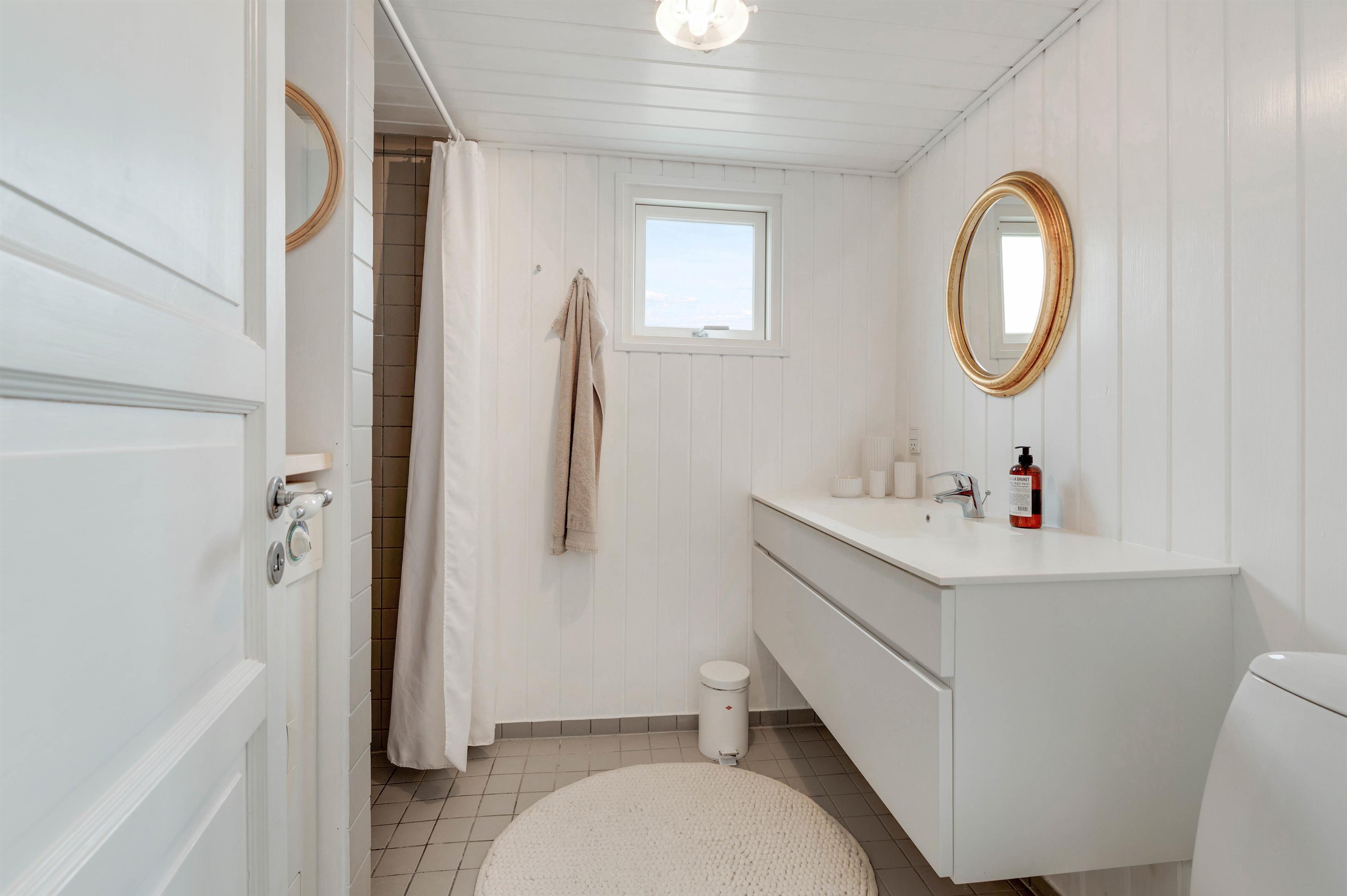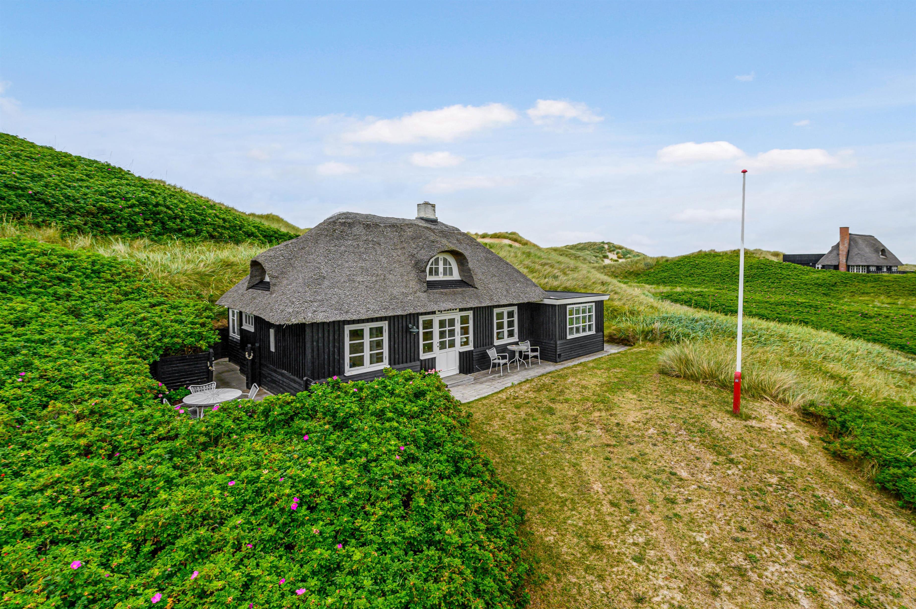Sand Holms Vej 33 ligger smukt på randen af en klit. Det giver en skøn udsigt over området og dejlig læ for vestvinden. Hele vejen rund om huset er der anlagt terrasser, så I kan følge solen og altid finde et læhjørne, når der er behov for det. Når I sidder udenfor huset og nyder noget udetid, kan I ret høre lyden af havets bølger som en dejlig og afslappende baggrundslyd.