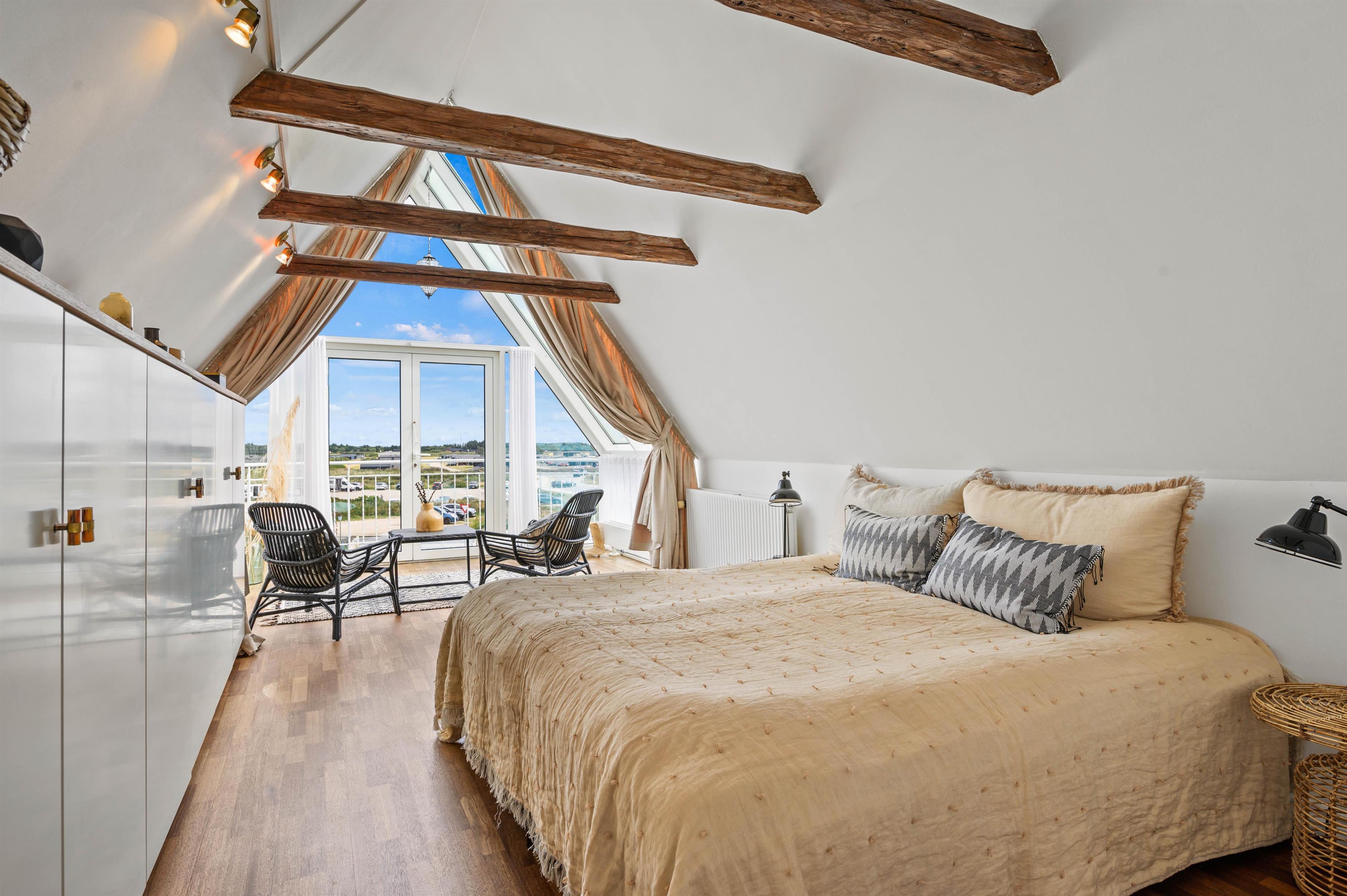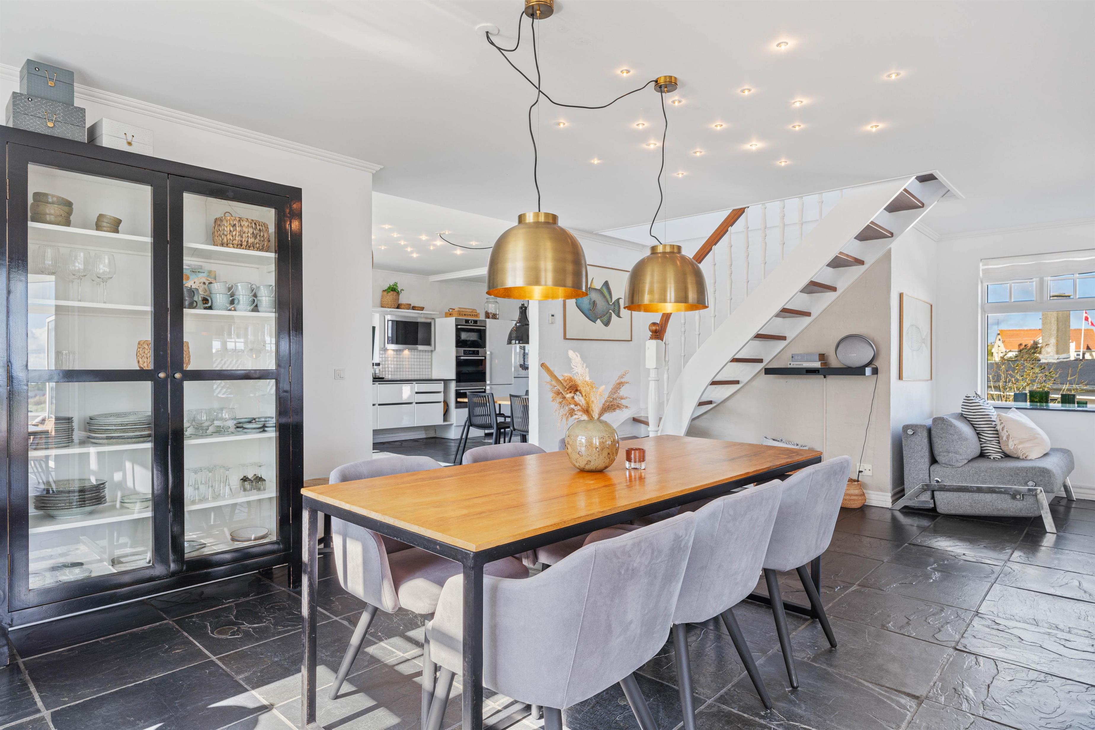 I dette lækre feriehus kan man nyde en høj kvalitet i alle detaljer og en rigtig spændende indretning fra House Doctor. Feriehuset er bygget i to plan og er på i alt 160 kvadratmeter, hvilket betyder at der er rigelig plads til en familie, og i alt fem glade feriegæster, som er det huset tillader. Ovenpå er der to soveværelser og det store badeværelse. Soveværelset mod øst har en fantastisk udsigt og glaskarnappen er et skønt område til afslappende læsning. Bemærk dog, at den ene soveplads er at finde i stuen, hvor der er en sovesofa. Huset er beliggende som nærmeste nabo til butikken ”In and Out”.