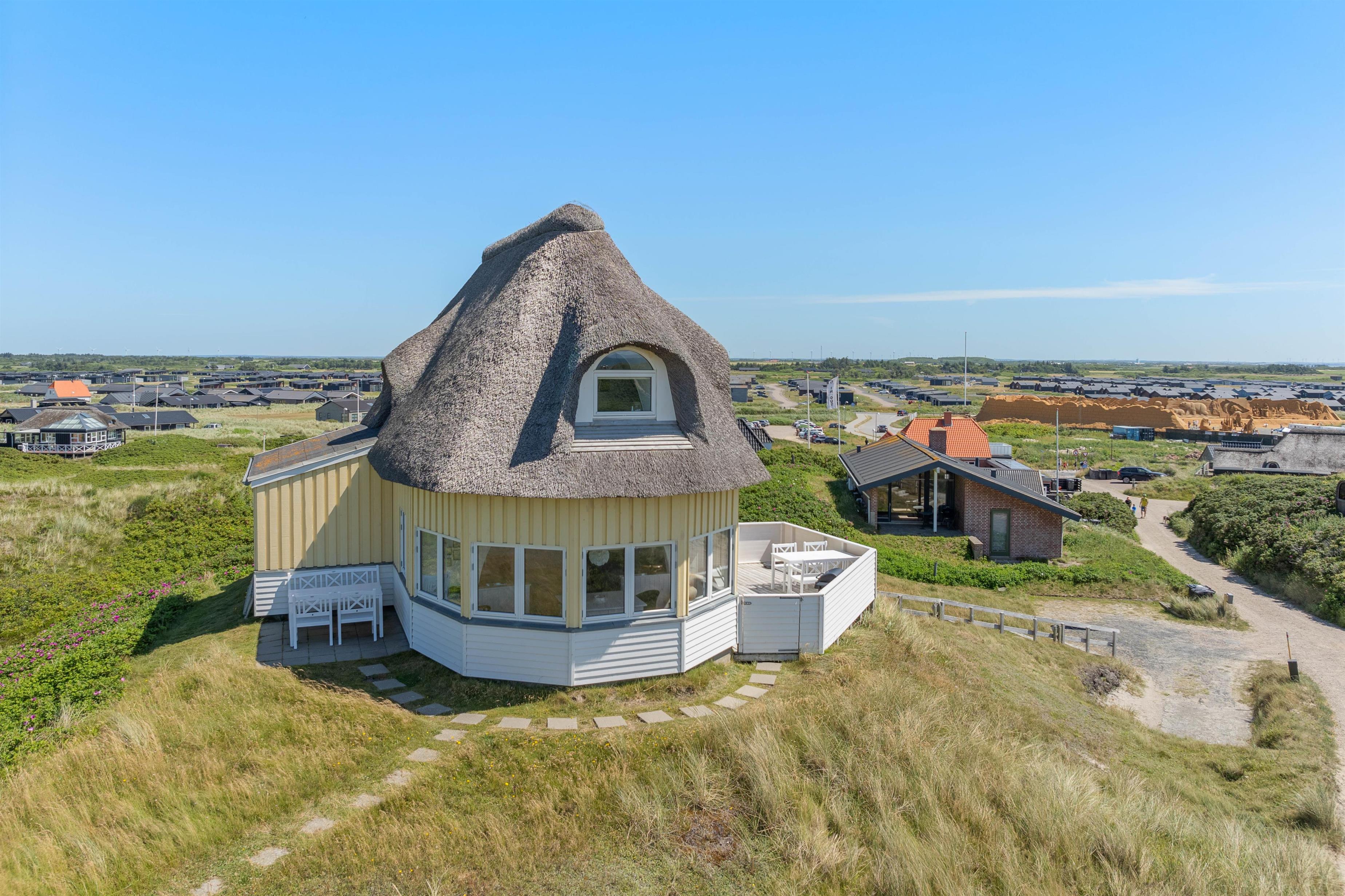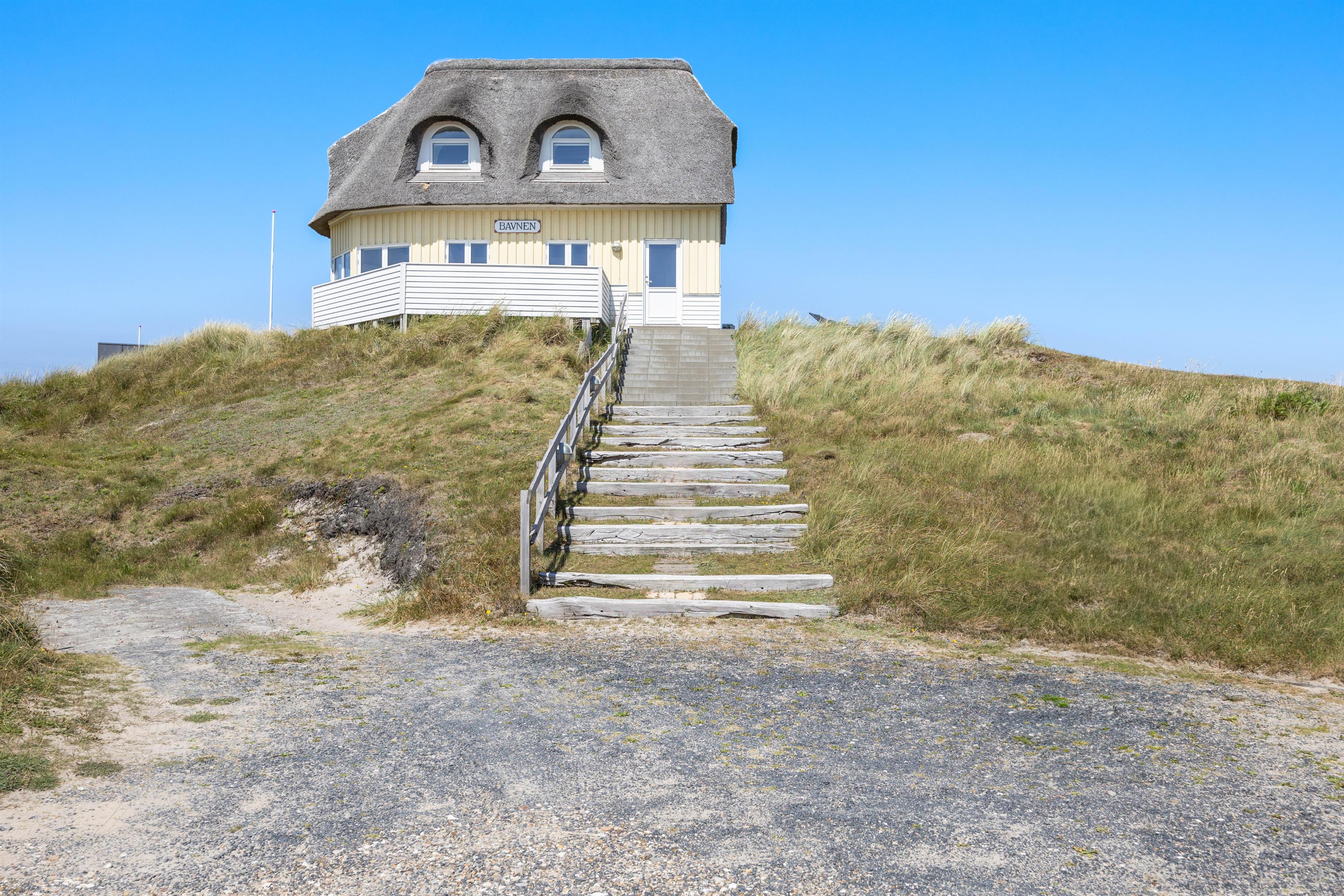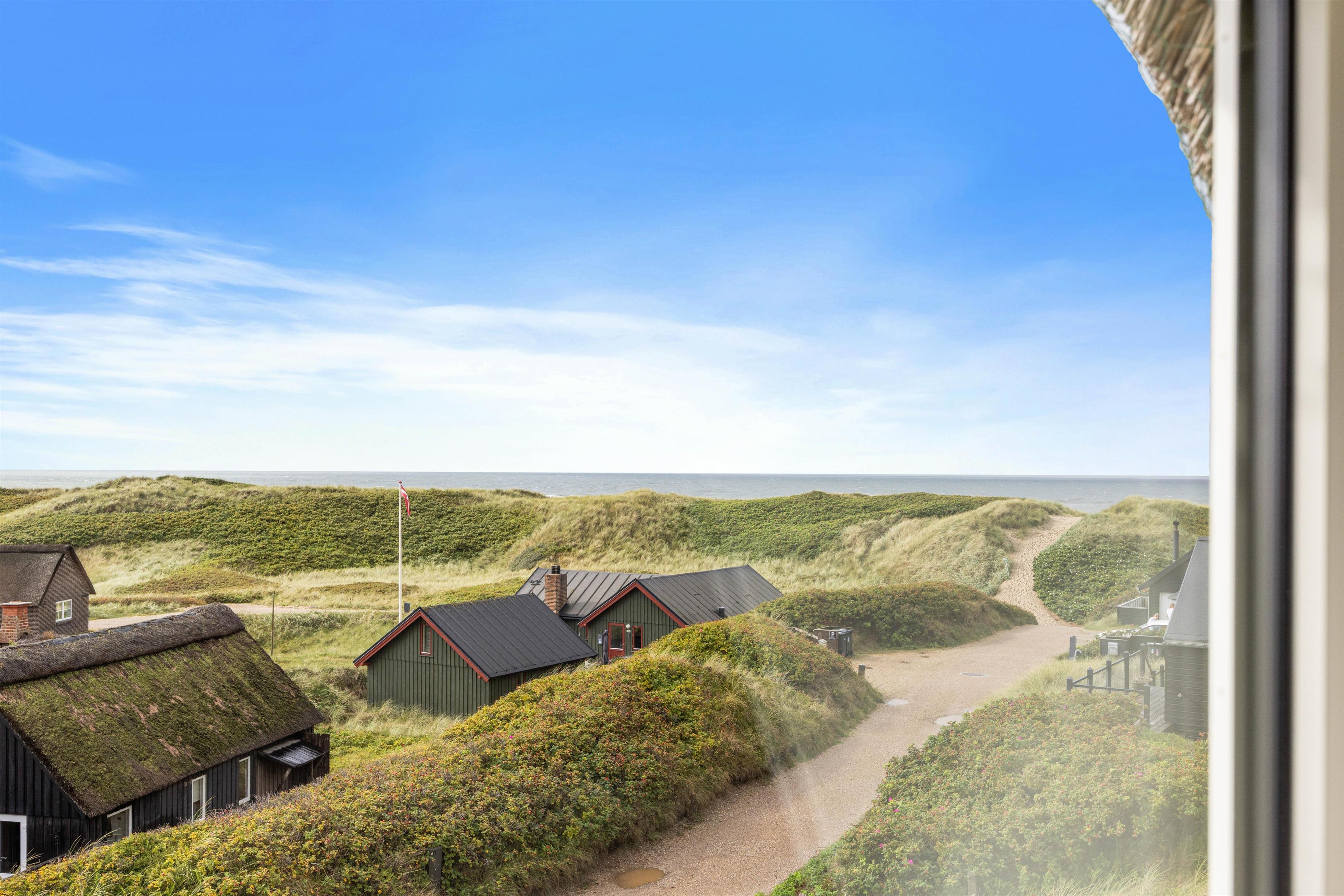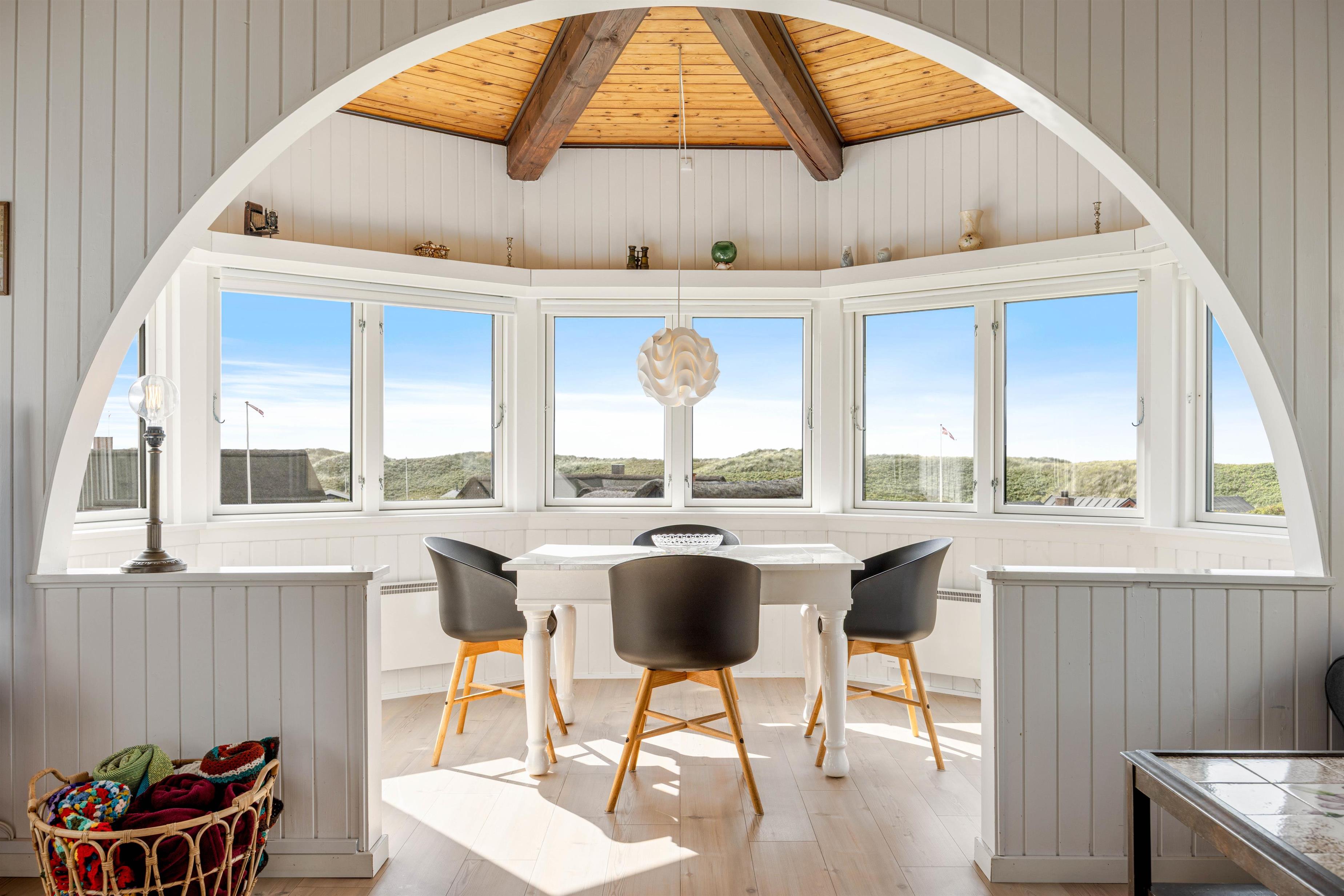 Det er ikke kun indvendigt, sommerhuset emmer af ferieidyl. Den fantastiske beliggenhed på en af Søndervigs højeste klittoppe med udsigt hele vejen rundt sætter prikken over i'et. På den nye terrasse kan I mod vest nyde havudsigten og mod sydøst se hele vejen ud over Søndervig og Ringkøbing Fjord.