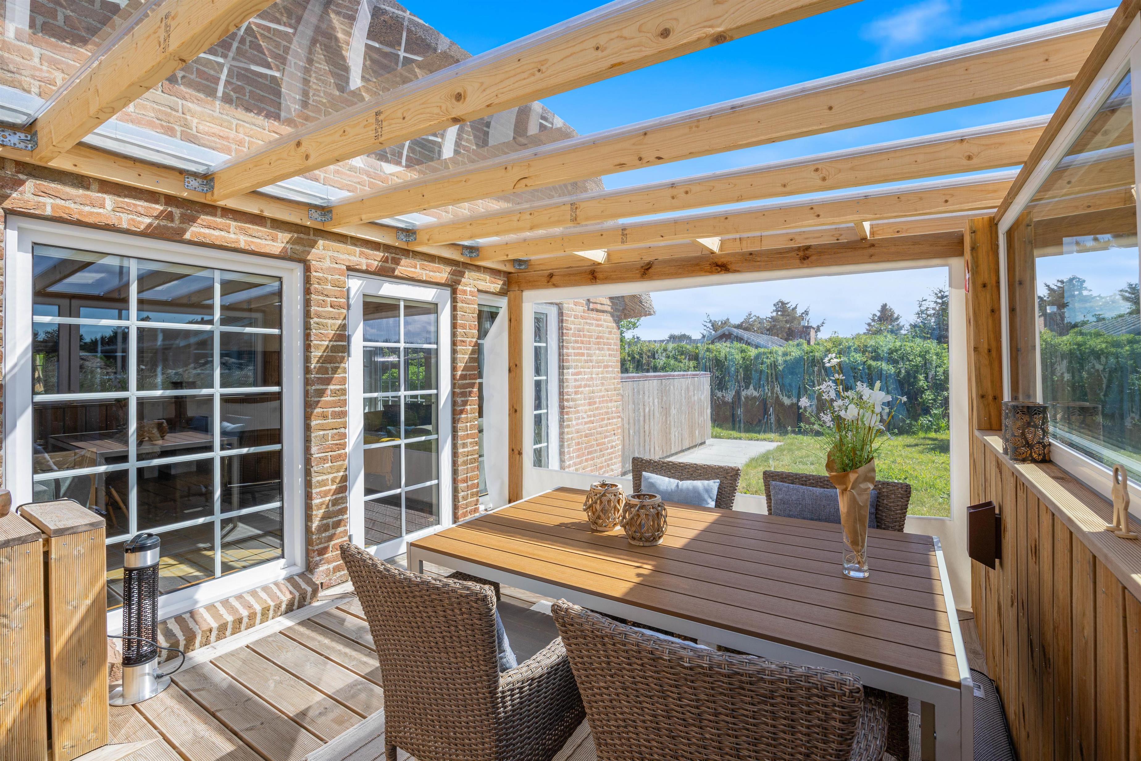 Husets veludstyrede køkken ligger i åben forbindelse med stuen. Det skaber et stort rum med masser af luft, hvor familien kan være sammen – også selv om I laver forskellige ting. Fra stuen er der udgang til husets udeareal. På en varm sommerdag er det oplagt at åbne døre og vinduer og lade lyden af den danske sommer strømme ind i huset. Husets terrasse er dejligt, afskærmet, så I kan sidde i fred og ro og nyden ferien. Her er der højt til loftet og plads til afslapning og kvalitetstid med familien.