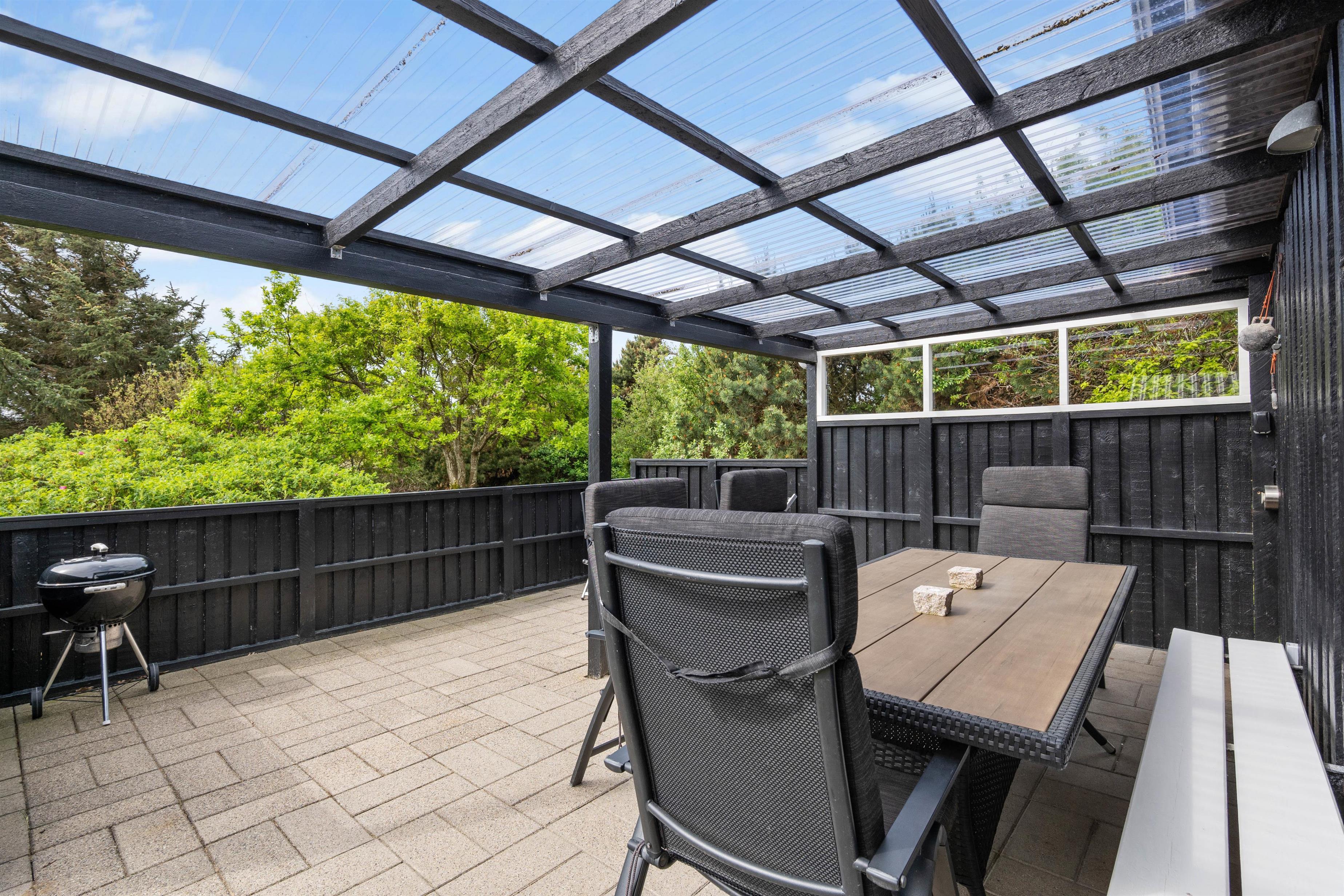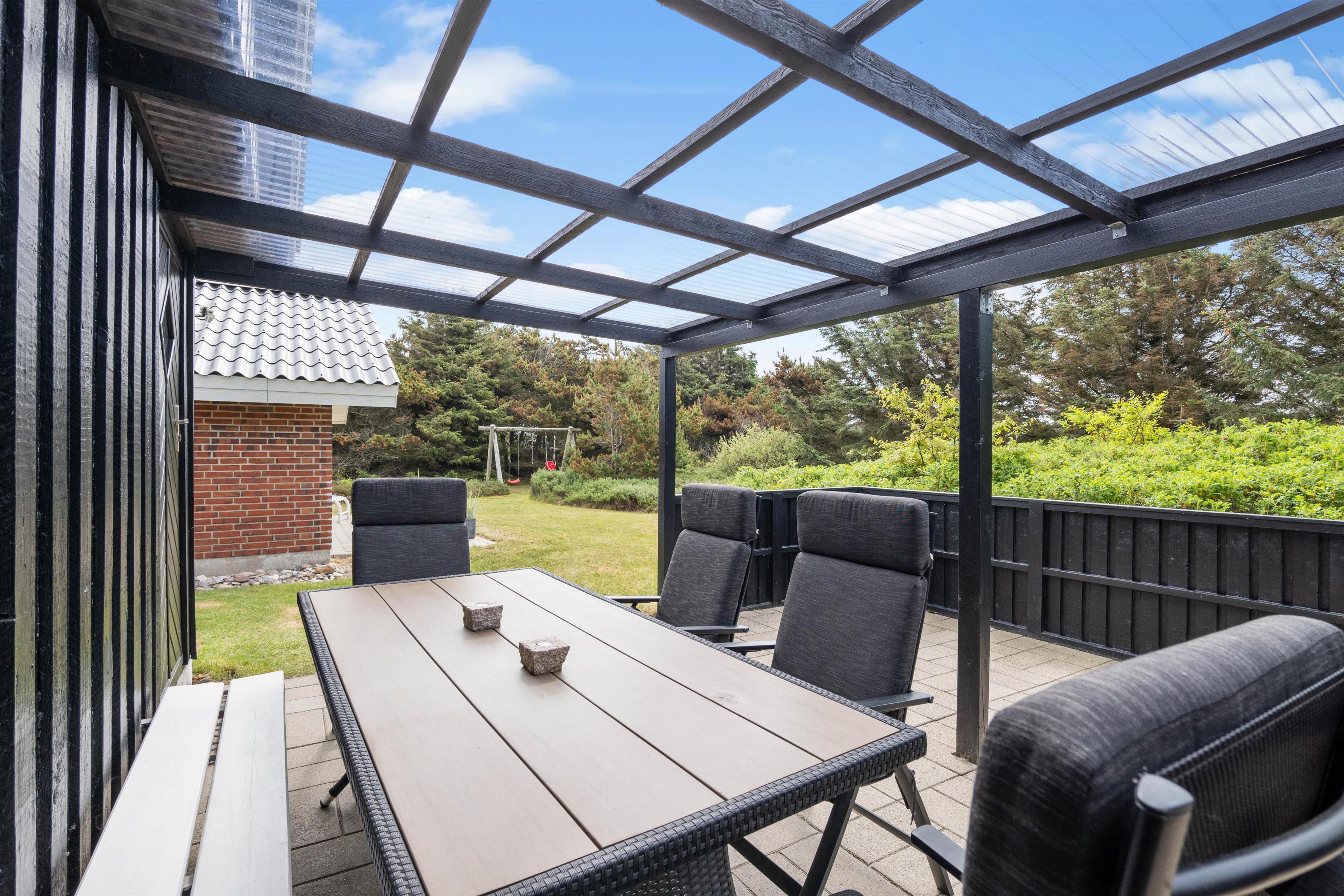 Der er gode muligheder for at finde både læ og sol på de flere forskellige terrasser, som alle er placerede mod syd. Der er desuden en stor overdækket terrasse, som sikrer at I kan nyde noget udetid, ligegyldigt om det regner eller blæser, samt til de hyggelige grillaftener i de varme måneder hvor I kan blandt andet kan nyde en lækker middag tilberedt ved hjælp af sommerhusets grill. Vesterhavet er kun en kort gåtur på cirka 550 meter fra huset, og har I cykler med, kan disse opbevares i skuret. Søndervig er kun 2,5 km væk, har et stort og godt udvalg af butikker og restauranter.