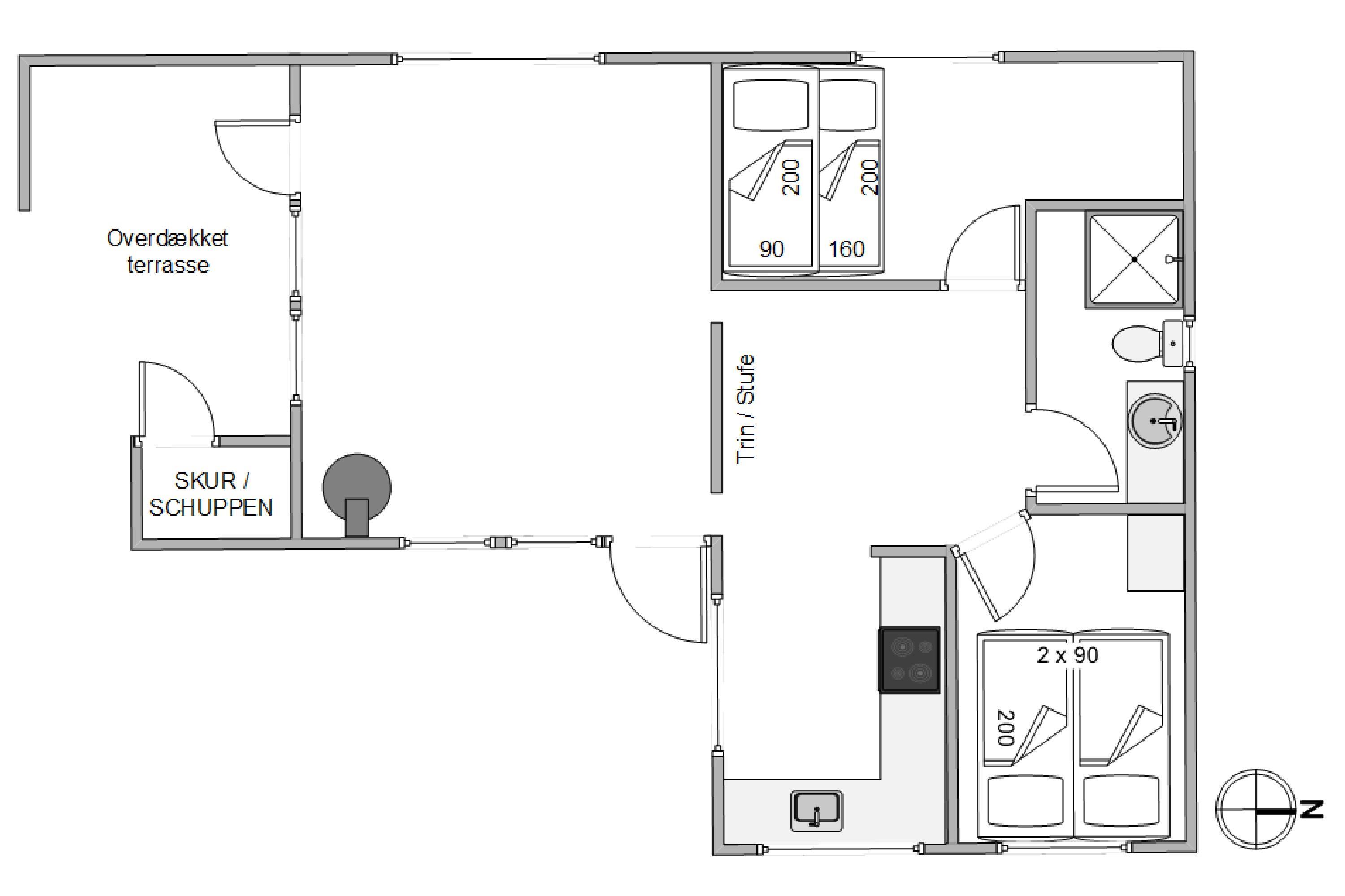 Sommerhusets sovepladser er fordelt på to soveværelser, hvor der er to dobbeltsenge, hvor der over den ene er en overkøje. Yderligere har sommerhuset et badeværelse med gulvvarme, hvor I ikke kommer til at fryse jeres fødder. Sommerhusets køkken er ikke det største, men det er virkelig pænt og veludstyret, hvilket giver jer mulighed for at lave en lækker aftensmad.