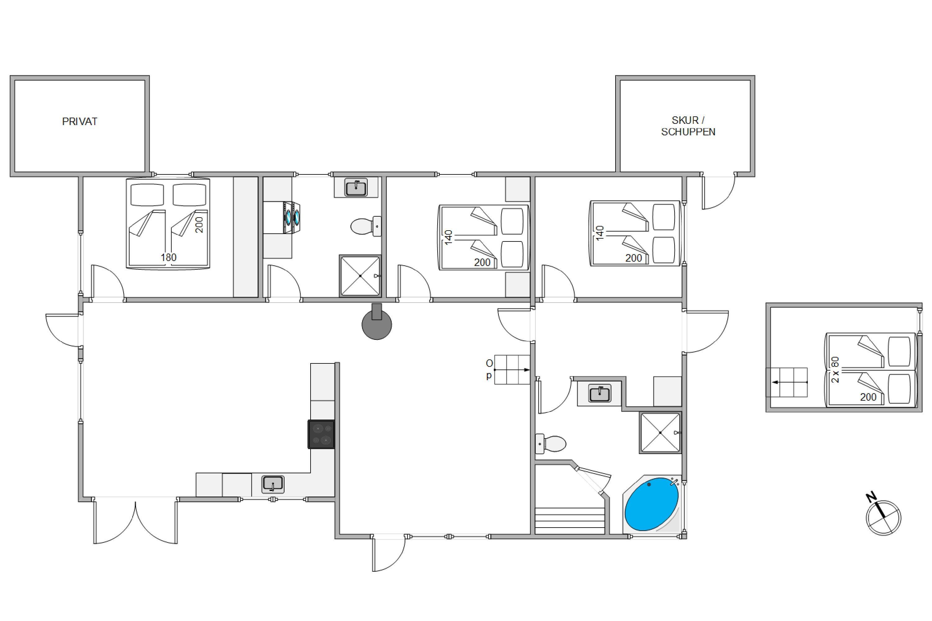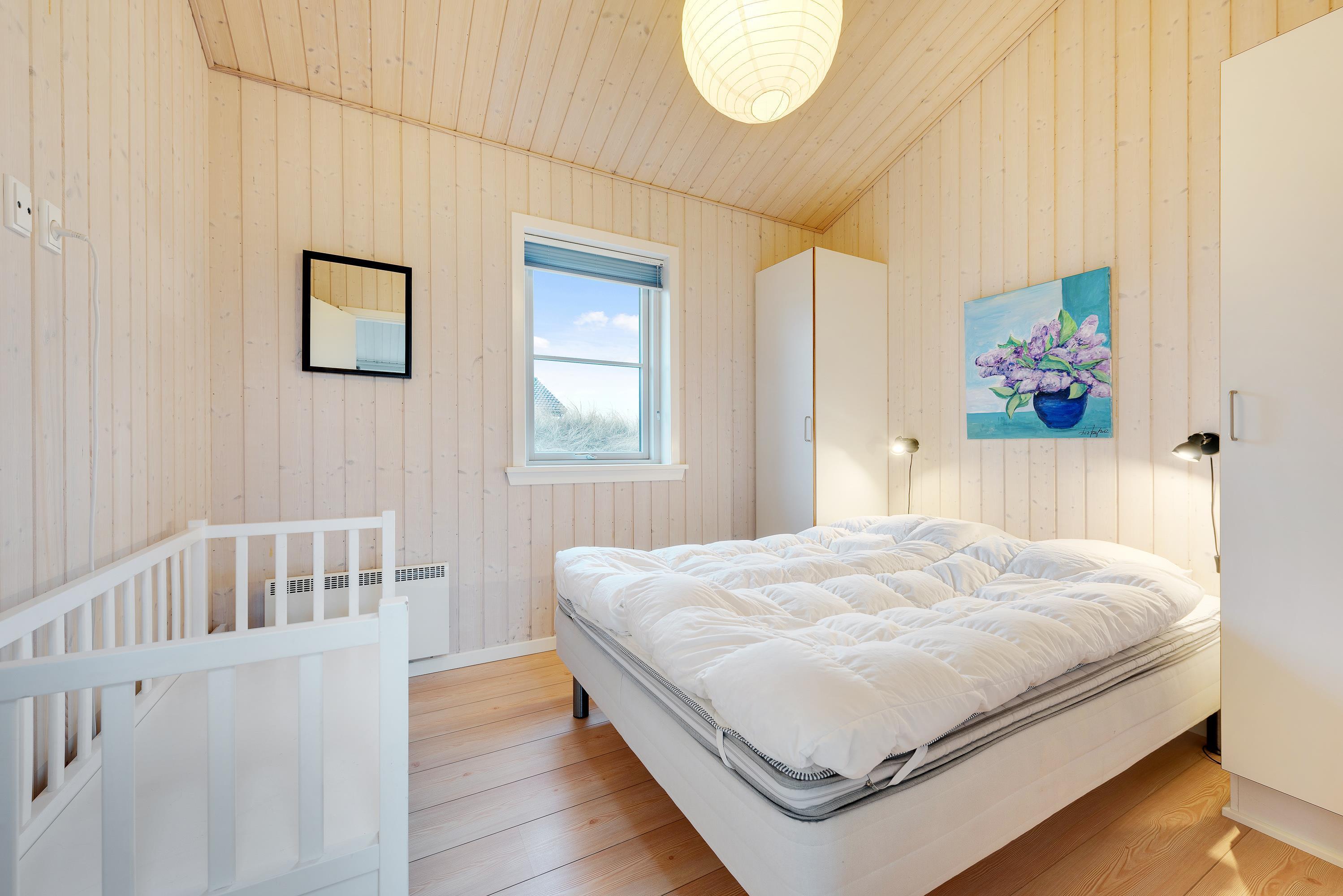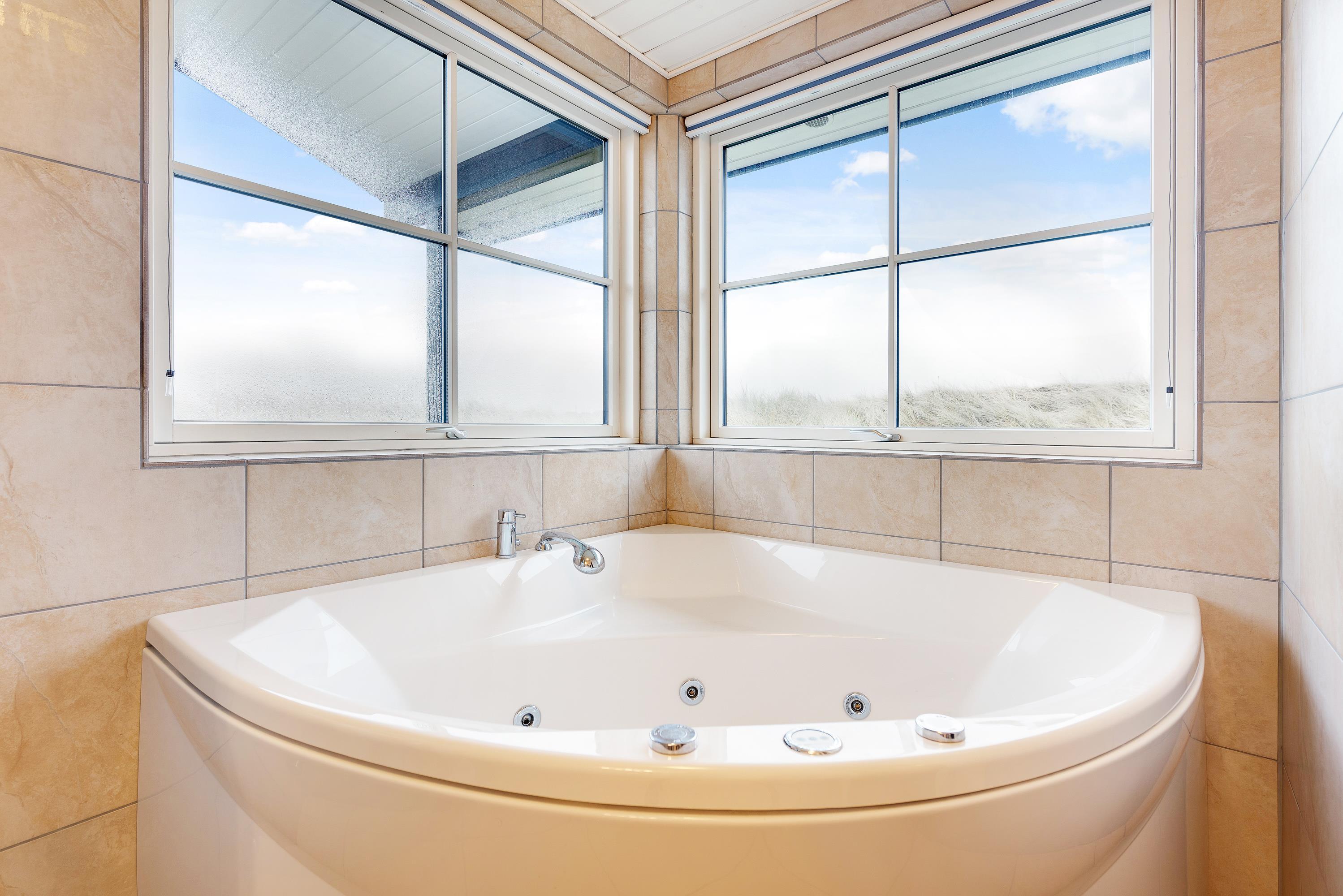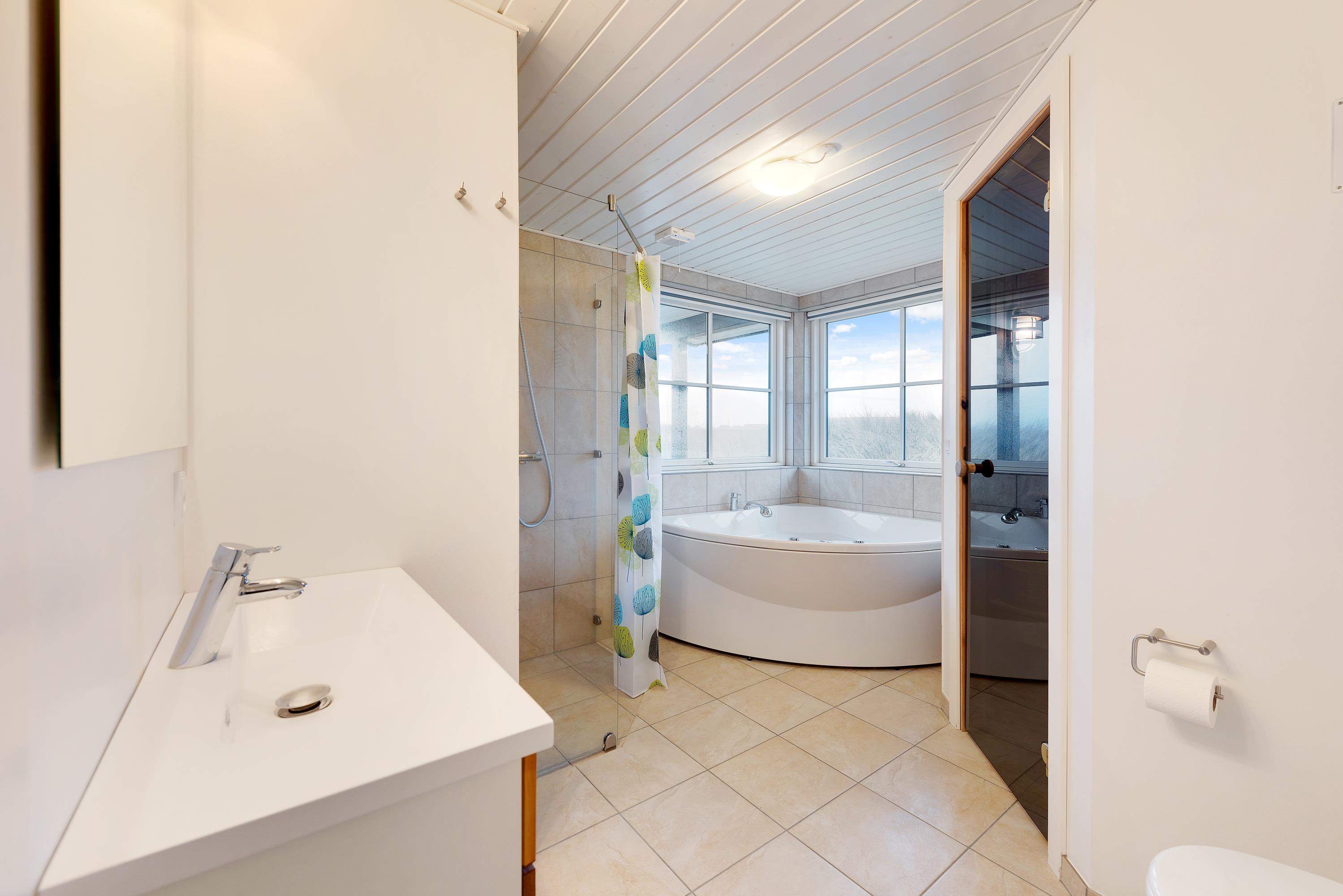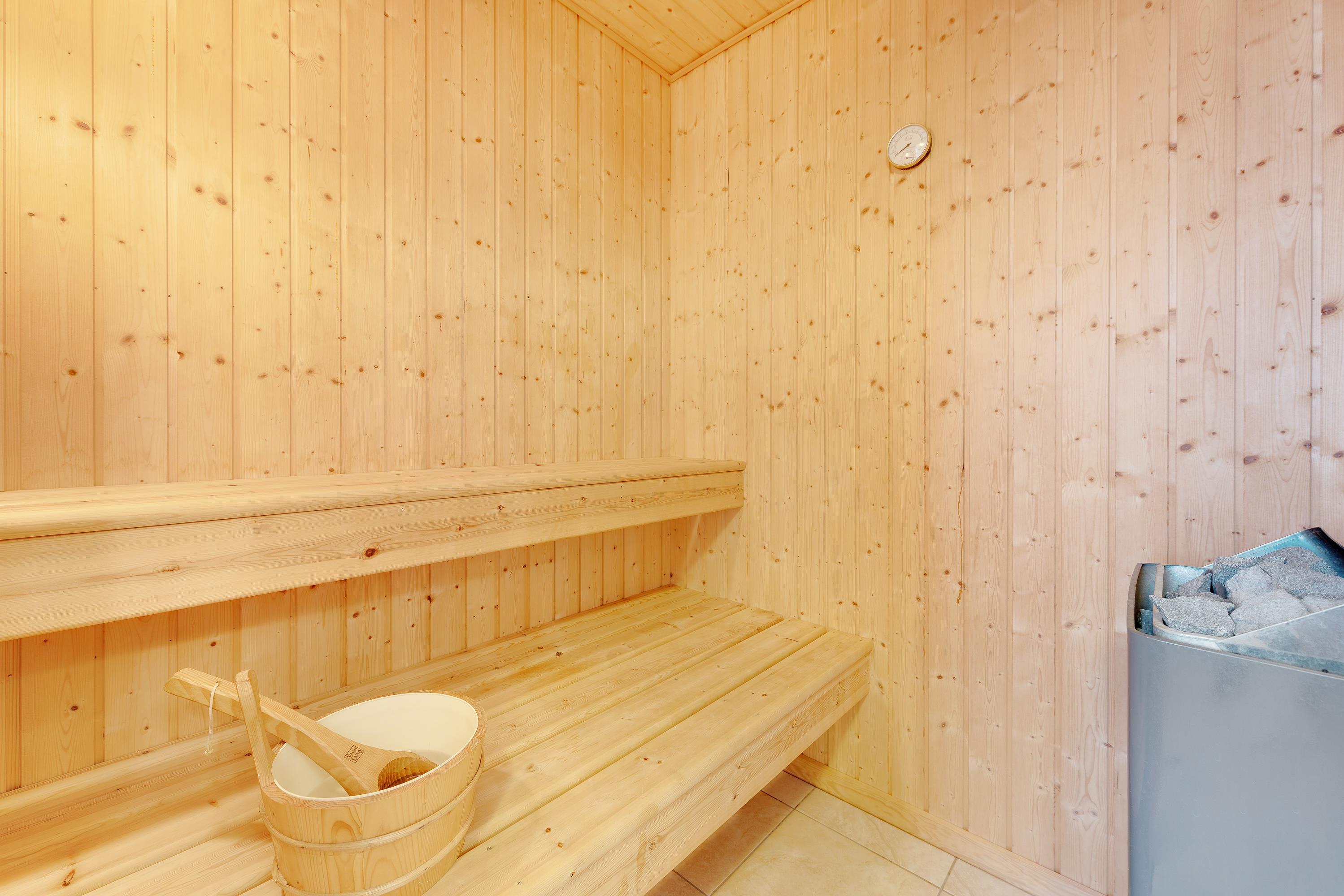 Dette dejlige feriehus har tre gode soveværelser med skabsplads og gode senge. Her er to soveværelser med 3/4 senge og et enkelt soveværelse med en fuld dobbeltseng. Alle værelser har trægulve. Her er to badeværelser med gulvvarme, hvor det største af dem kan give jer mulighed for at slappe ekstra meget af. Her er nemlig installeret et boblebad til to personer, og her er også indgang til husets sauna hvor I virkelig kan blive varmet igennem.