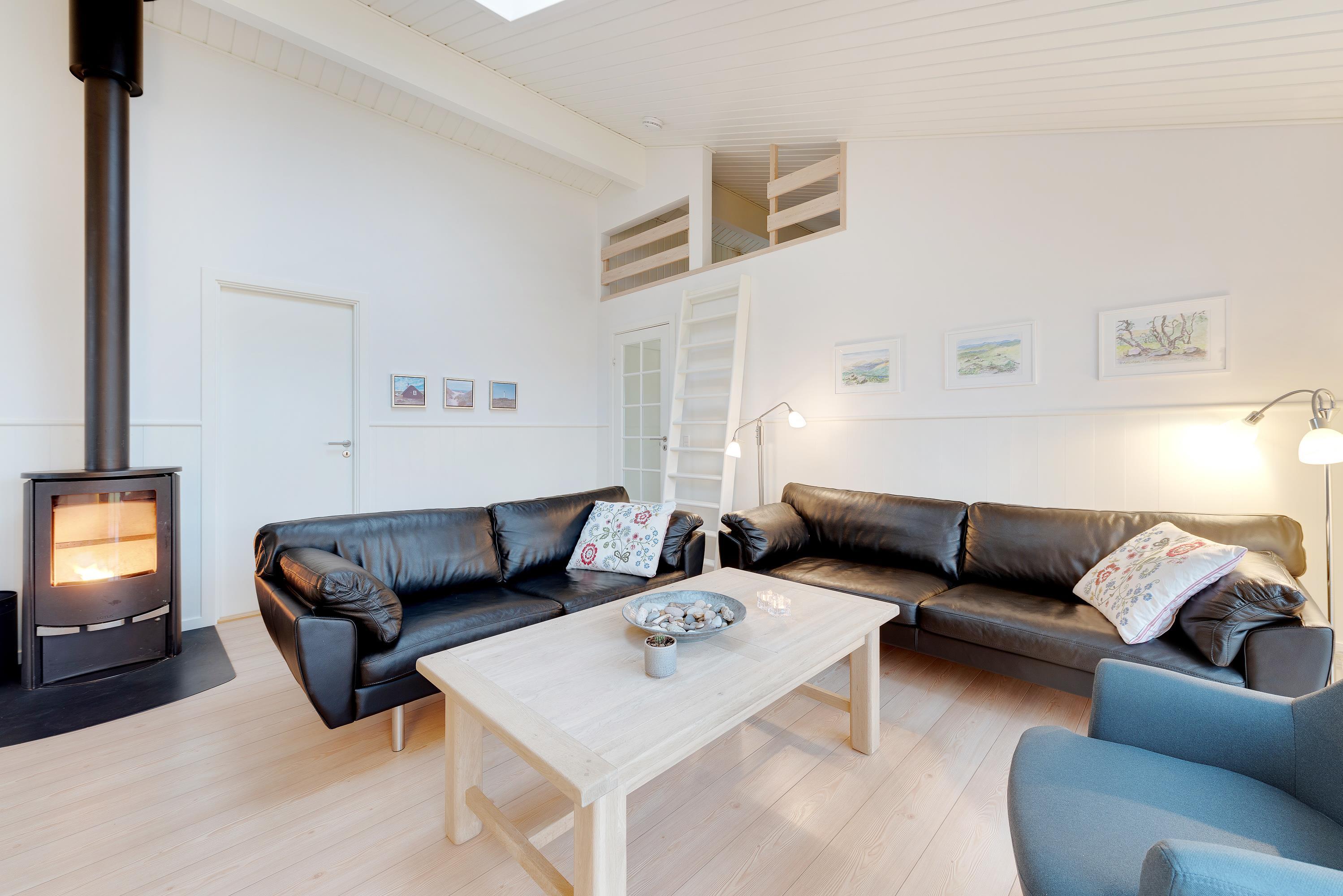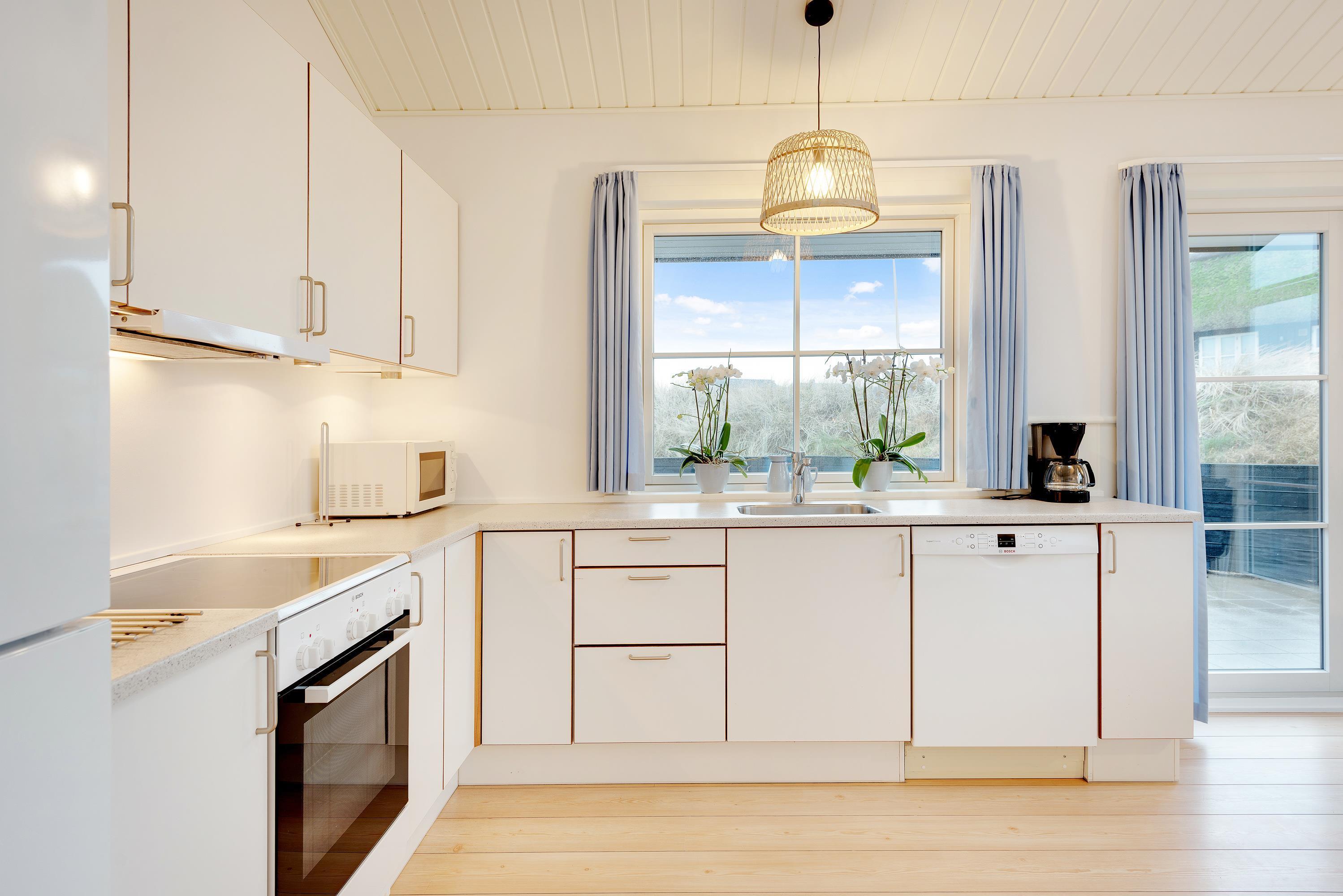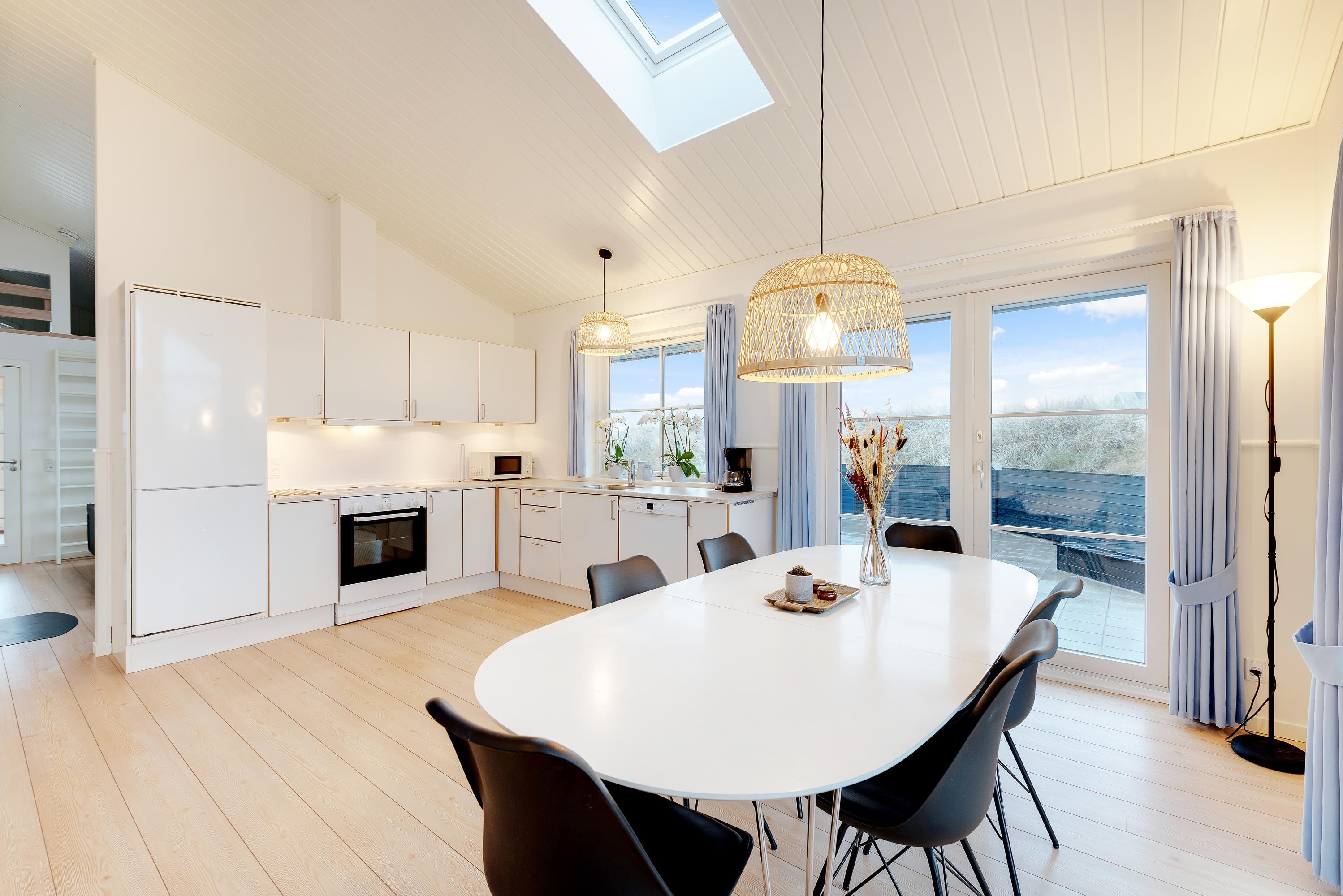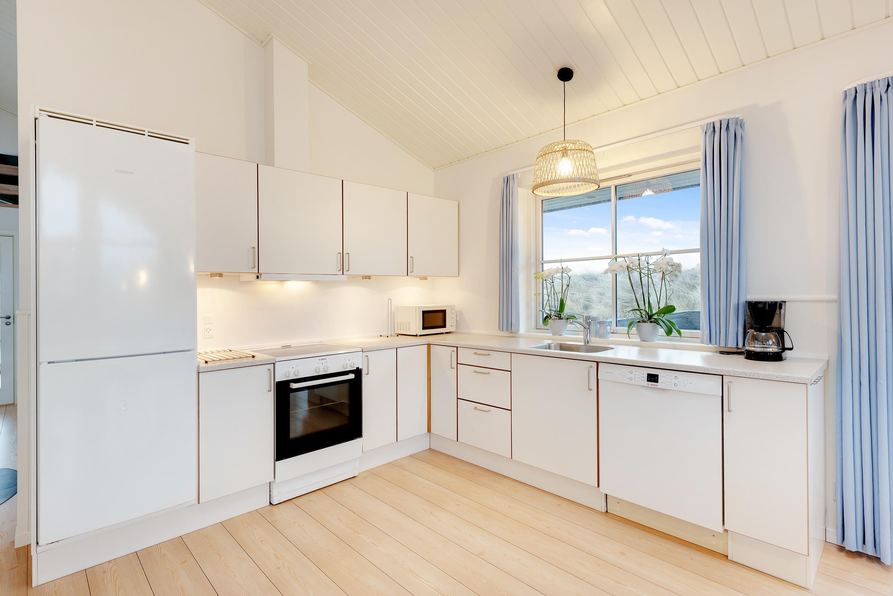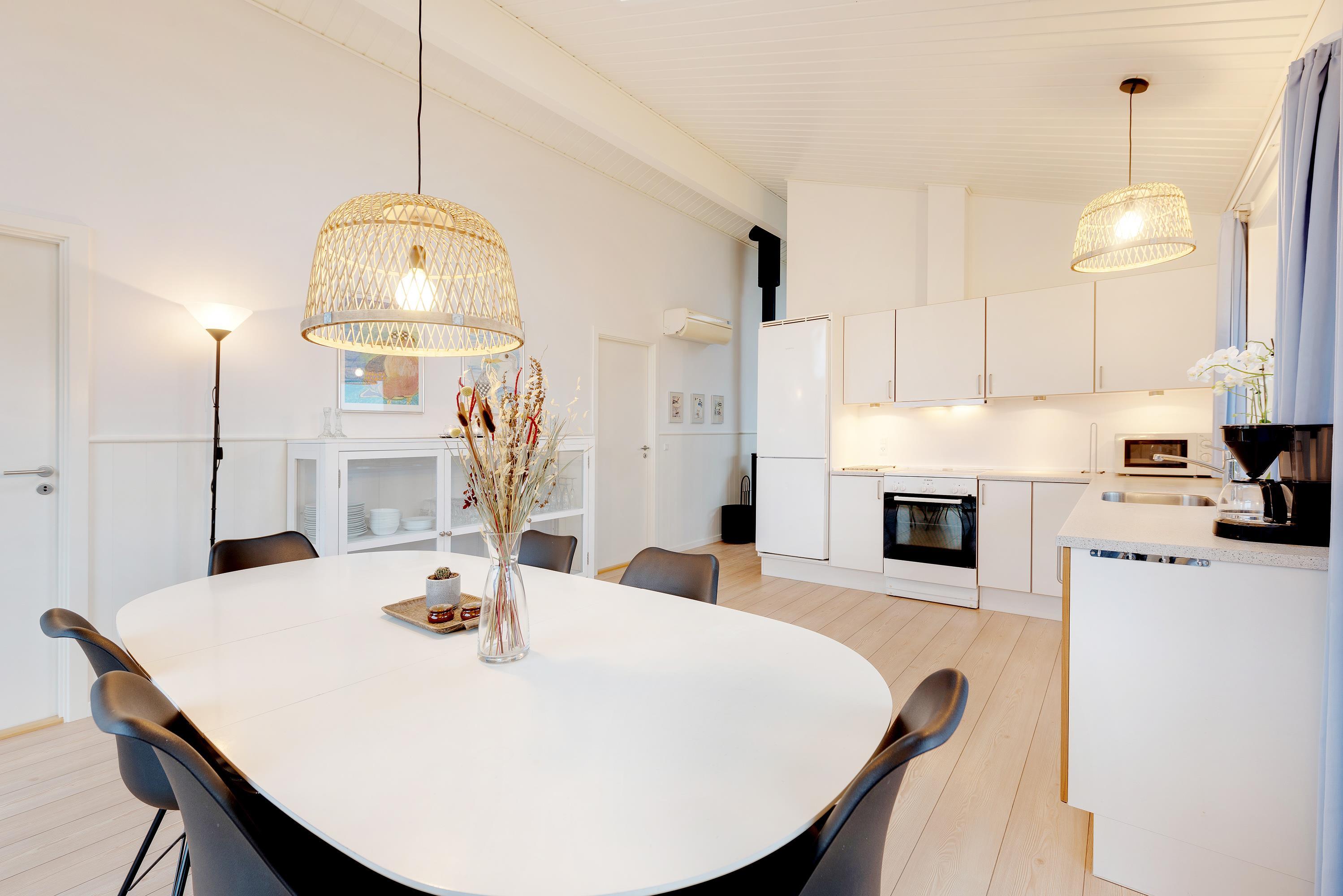 Det velindrettede køkken har opvaskemaskine, mikroovn og køleskab med separat fryser på 80 liter. Køkkenet står i åben forbindelse med stuen, som er flot indrettet med komfortable møbler, brændeovn og fladskærm. I huset er der også en hems med 2 sovepladser samt gratis adgang til trådløst internet. Huset er isoleret after de nyeste foreskrifter og er udstyret med en energibesparende varmepumpe, hvilket gør sommerhuset billigt at varme op.