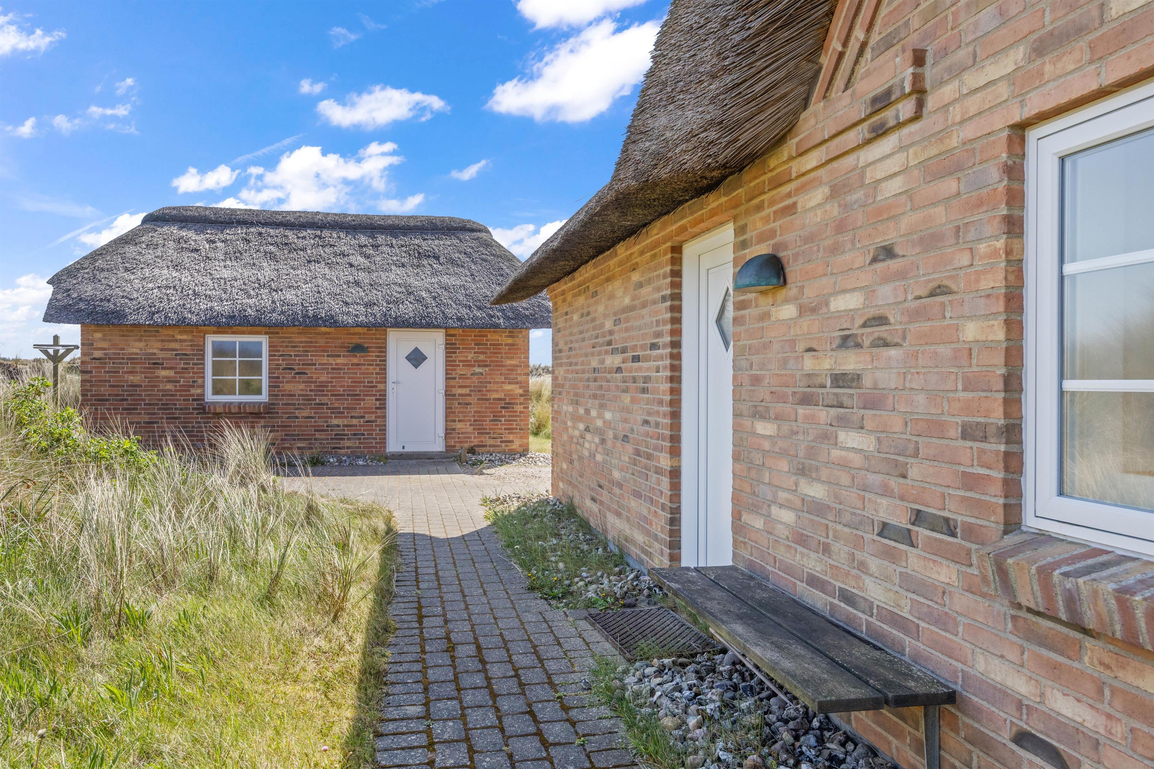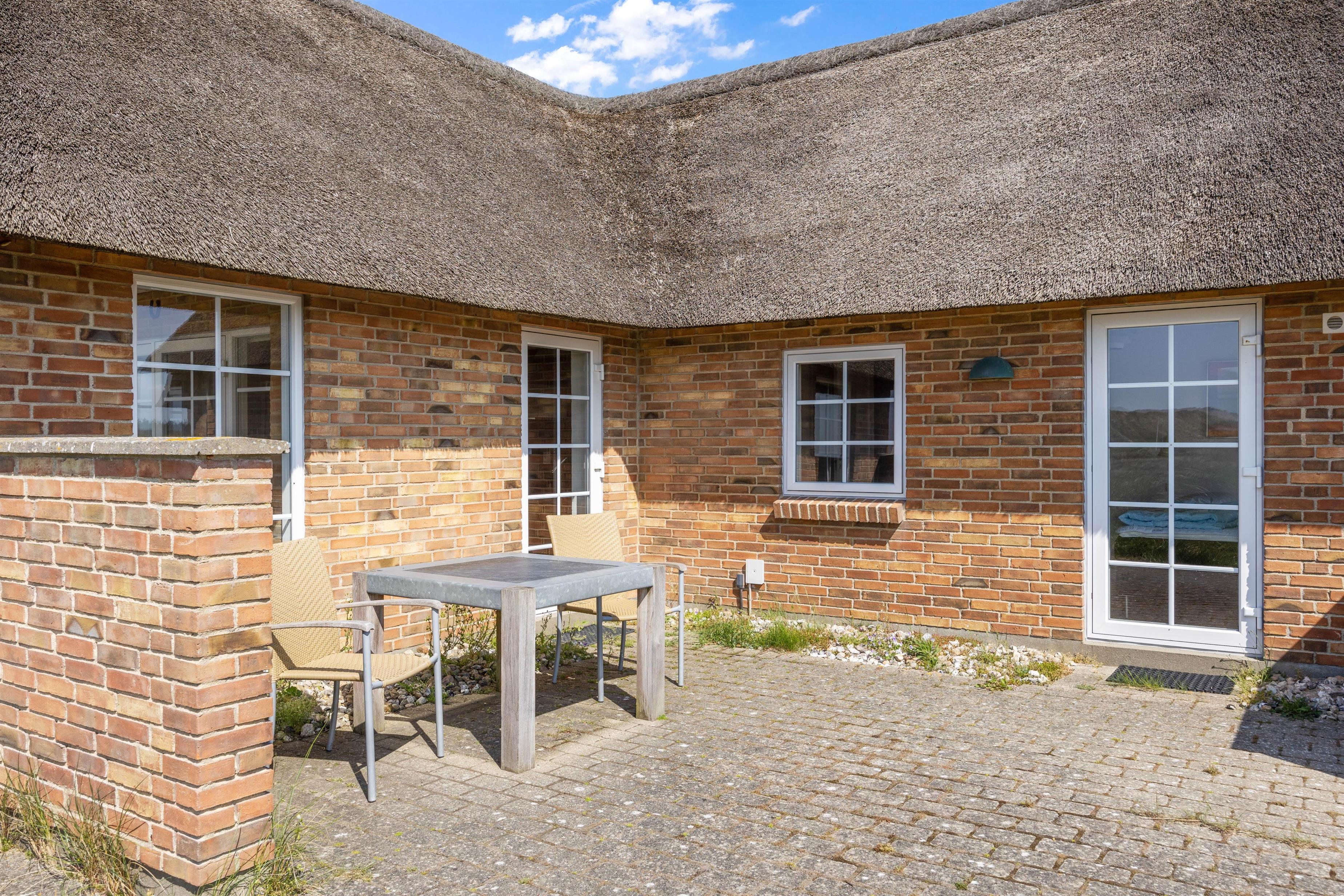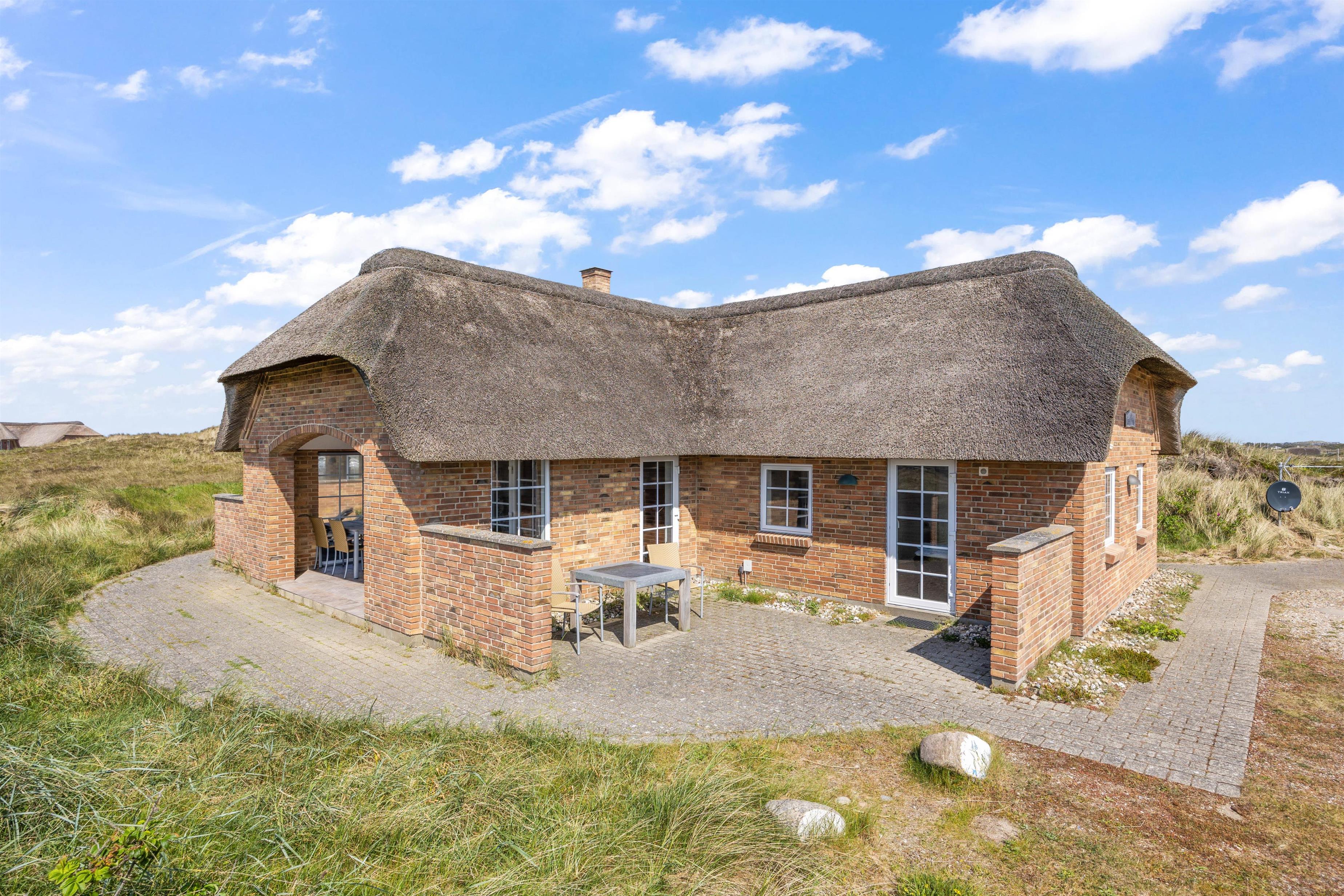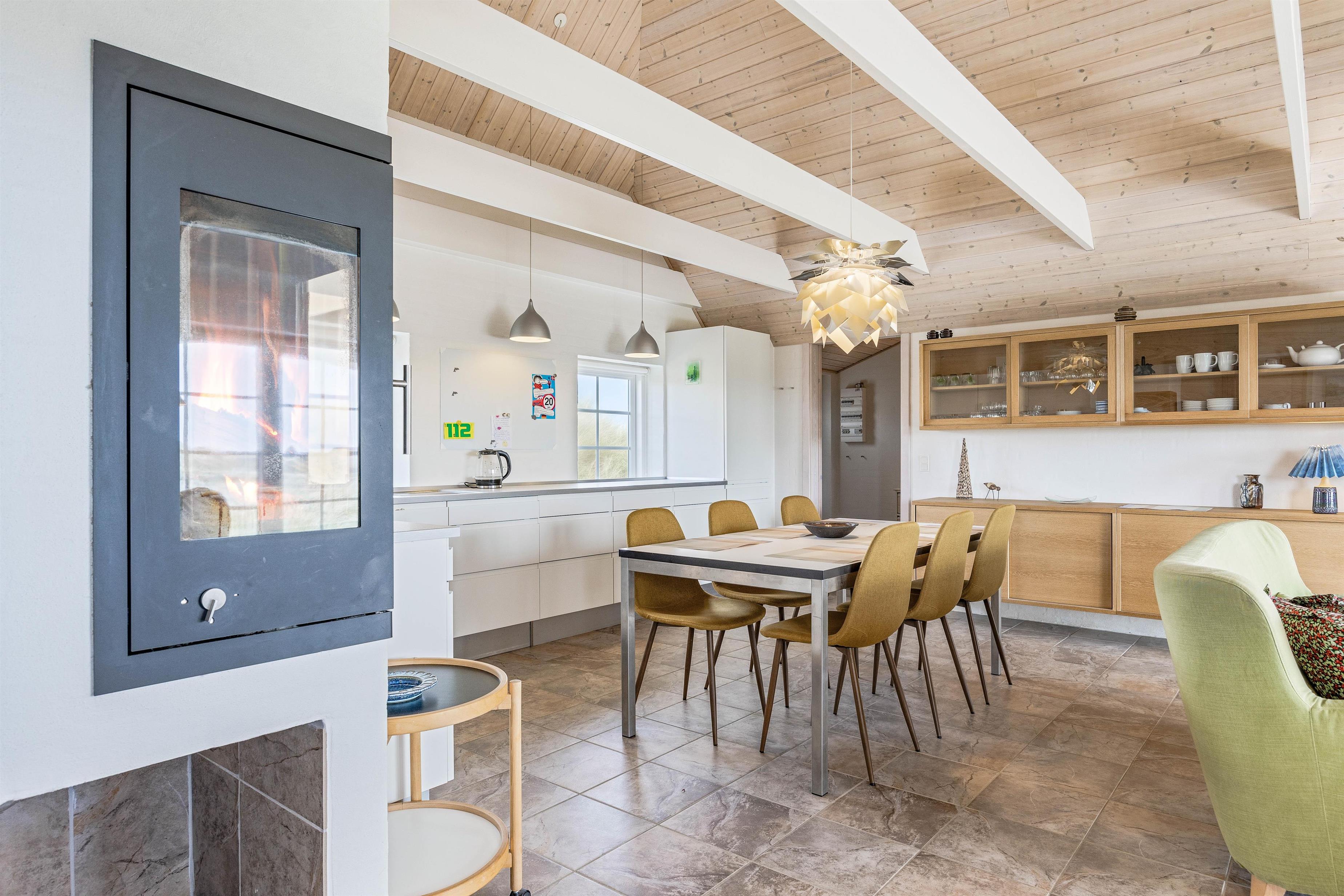 Hjertet i det stråtækte feriehus er den store opholdsstue, som forbinder køkken, stue og spiseafdeling. Her kan I tilbringe tid sammen, spille spil, lave mad eller nyde panoramaudsigten over det omkringliggende klitlandskab. Det er skønne opholdsrum går til kip og har synlige træbjælker hvilket er et fryd for øjnene. For at undgå kolde fødder på køligere dage er feriehuset udstyret med gulvvarme i opholdsrummet, badeværelserne og soveværelserne, som kører via en luft/vand-varmepumpe.