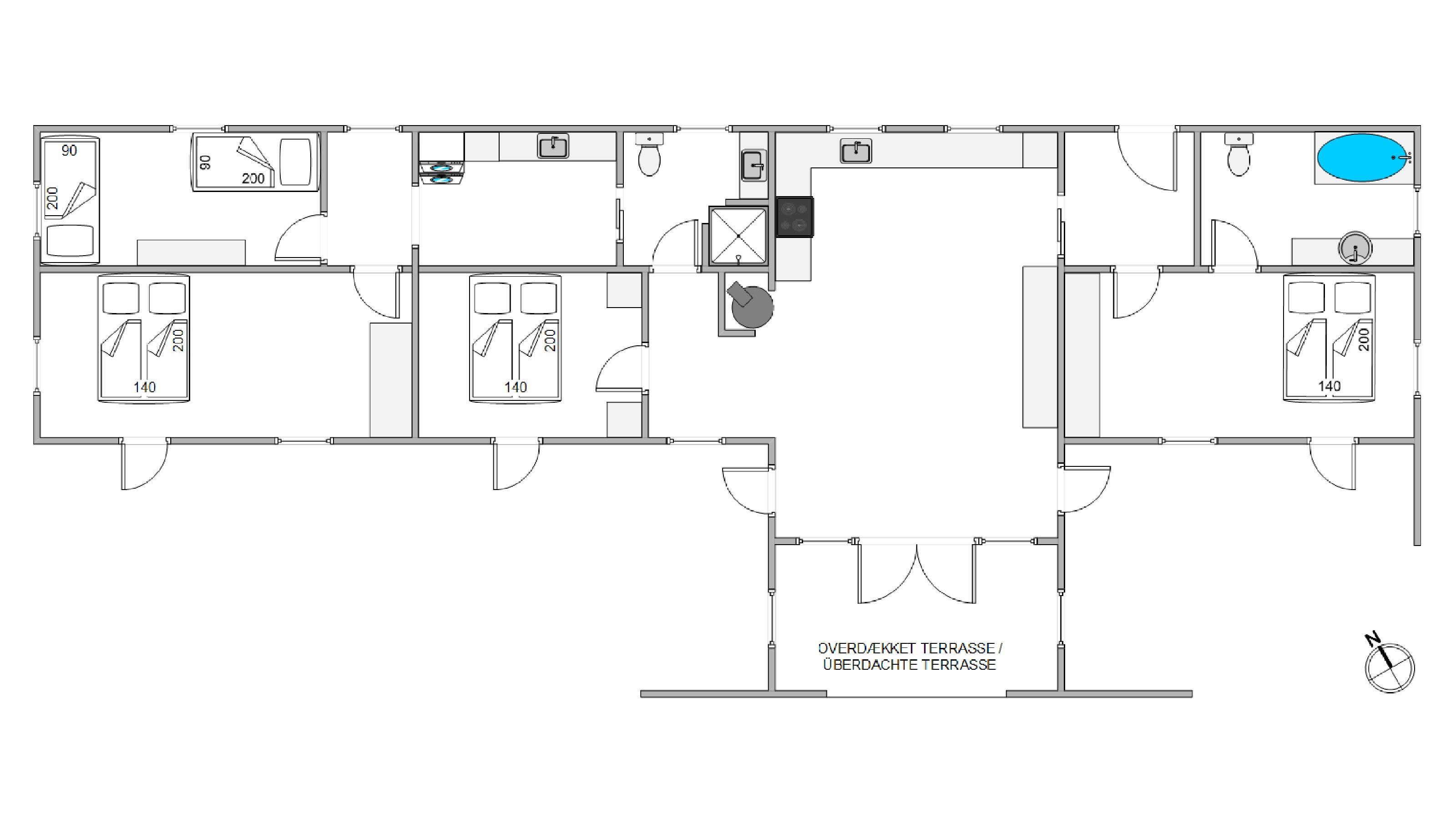 Efter en lang og begivenhedsrig dag kan I brede jer ud i feriehusets 4 soveværelser for at lade batterierne op til næste dag. Af de 4 soveværelser er 3 af dem udstyret med en dobbeltseng, og i det sidste soveværelse finder I 2 enkeltsenge. Da ferieboligen er udstyret med 2 badeværelser, giver ferieboligen jer privatliv, selv hvis I tager på ferie med en ven. Efter en lang gåtur på stranden kan I varme jer op i badekarret i et af de to badeværelser.