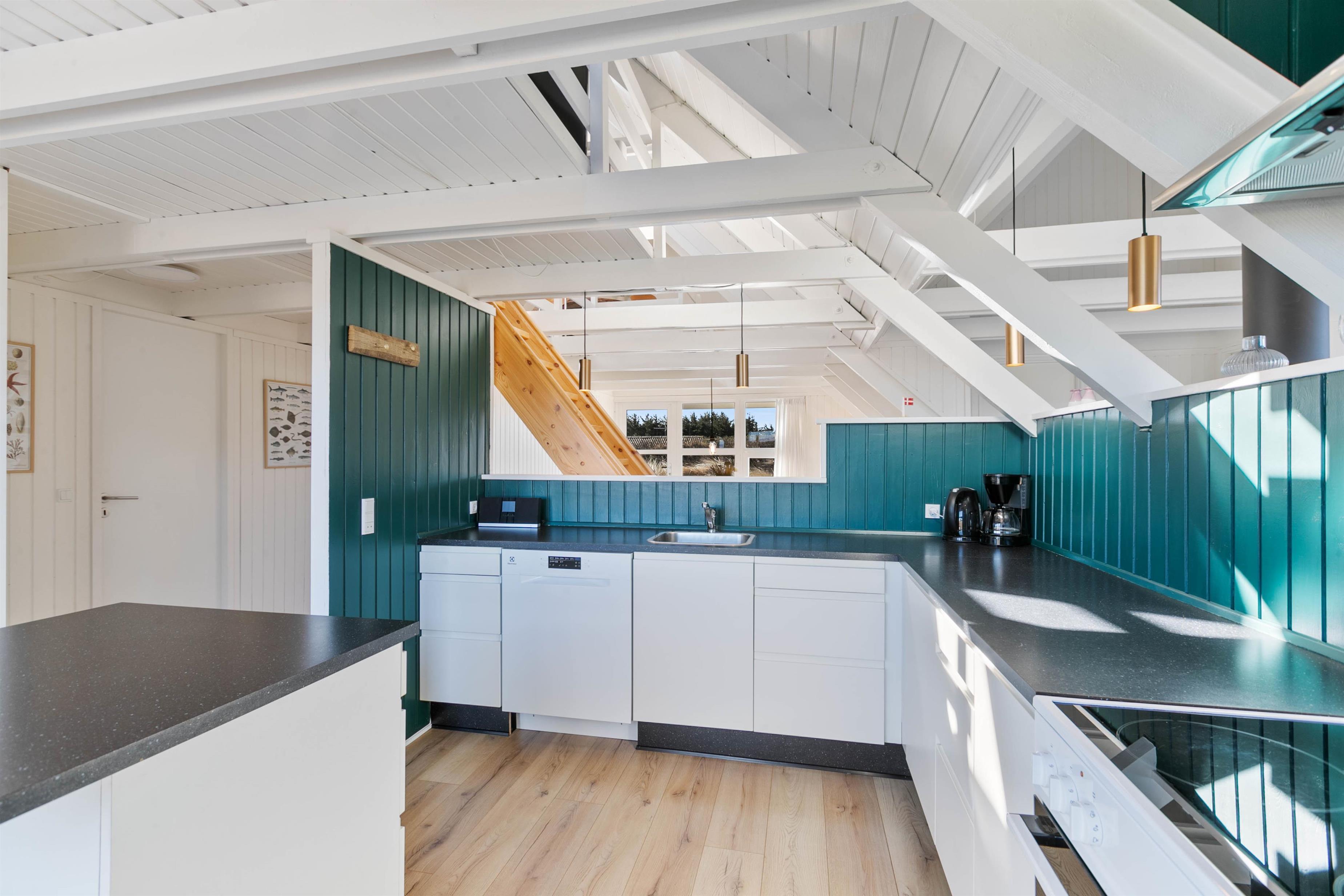 Med højt til loftet og store vinduer, der giver et kig til Søndervigs klitter, er der skabt en åben atmosfære og en rummelighed der sikrer, at I med det samme falder til I jeres hjem for ferien. For at give jer flere muligheder for at slappe af, er huset udstyret med to stuer med en både i stueplan og en enkelt på husets hems. På hemsen finder I også et lille spisebord med tilhørende stole, og her vil I kunne hygge jer omkring nogle af jeres medbragte brætspil.