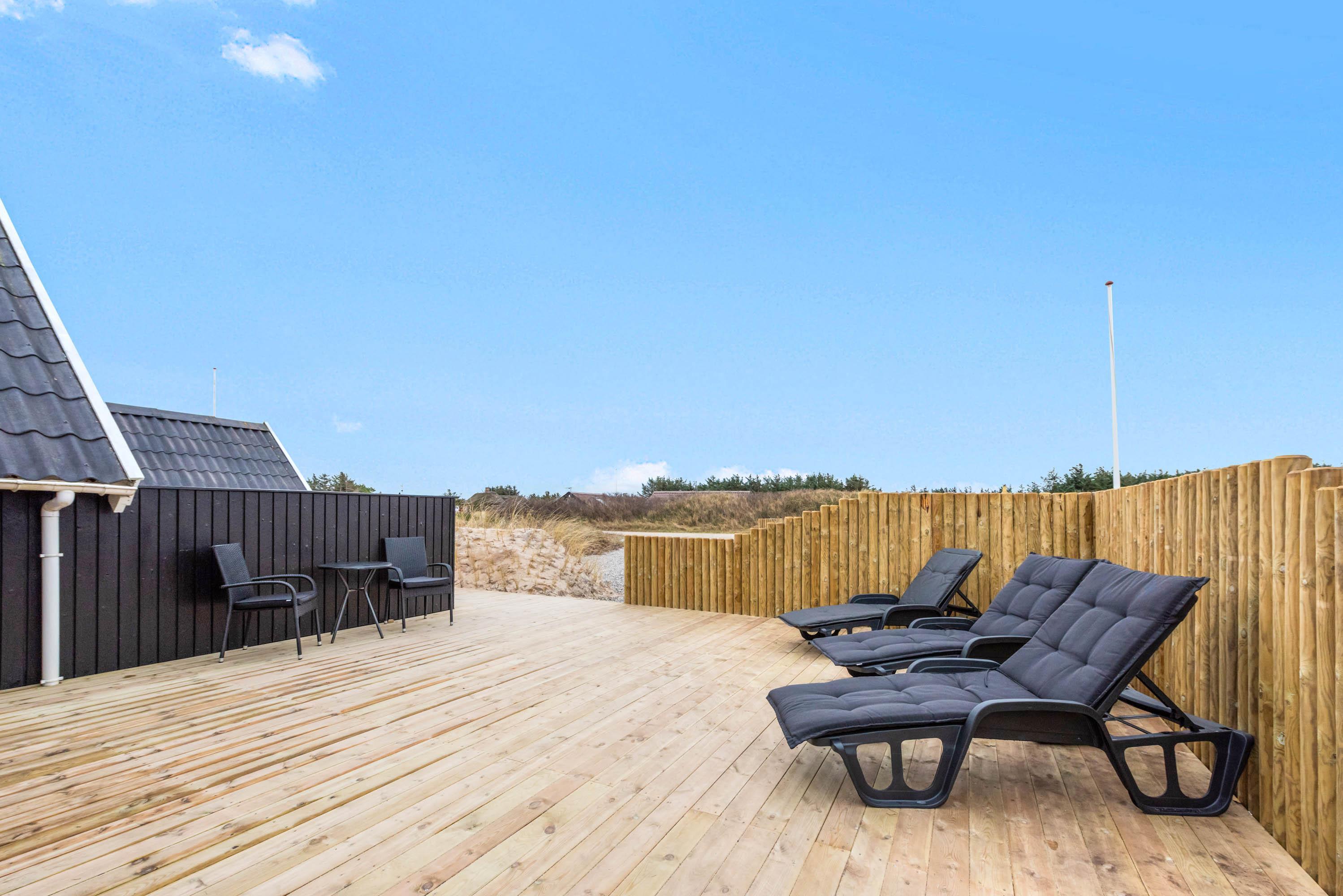 Et af feriehusets højdepunkter er den fantastiske, store træterrasse. Med både en afskærmet og overdækket del kan I nyde den friske havluft hele året rundt, og der er sørget for gode havemøbler og liggestole til jer.