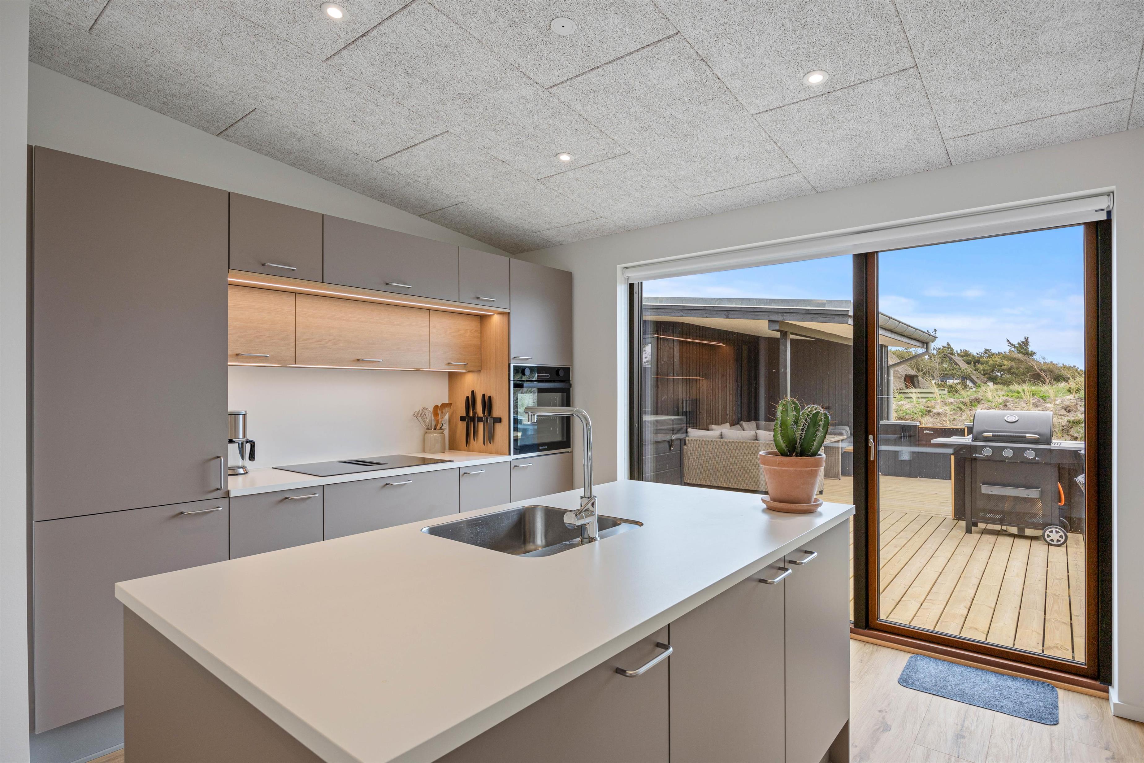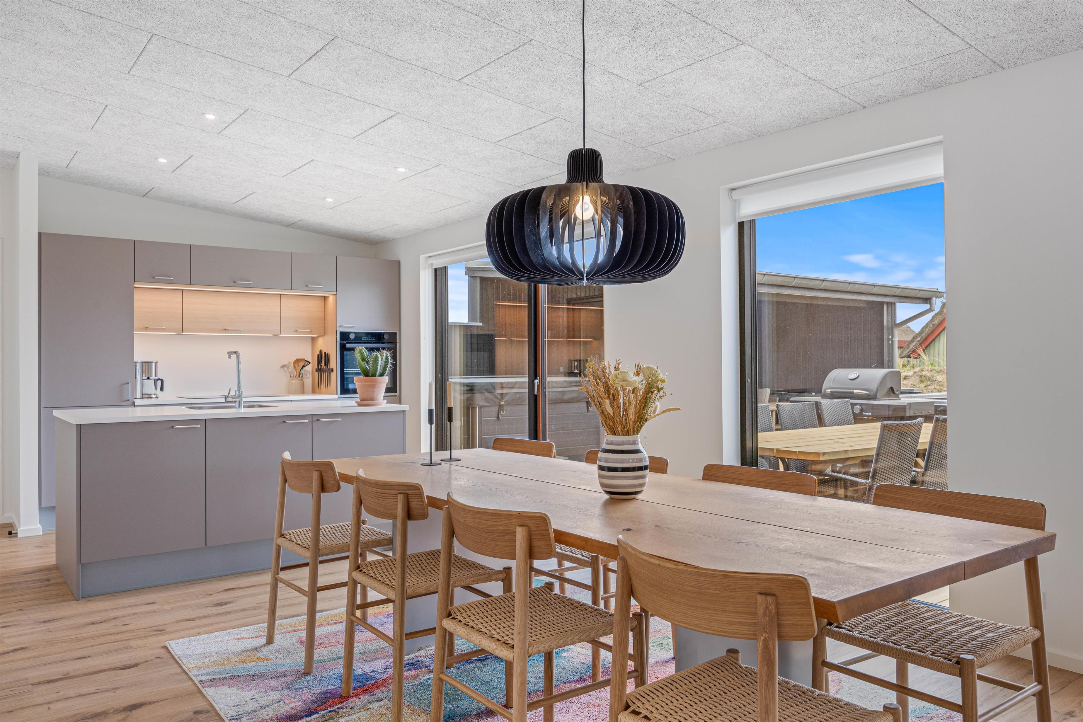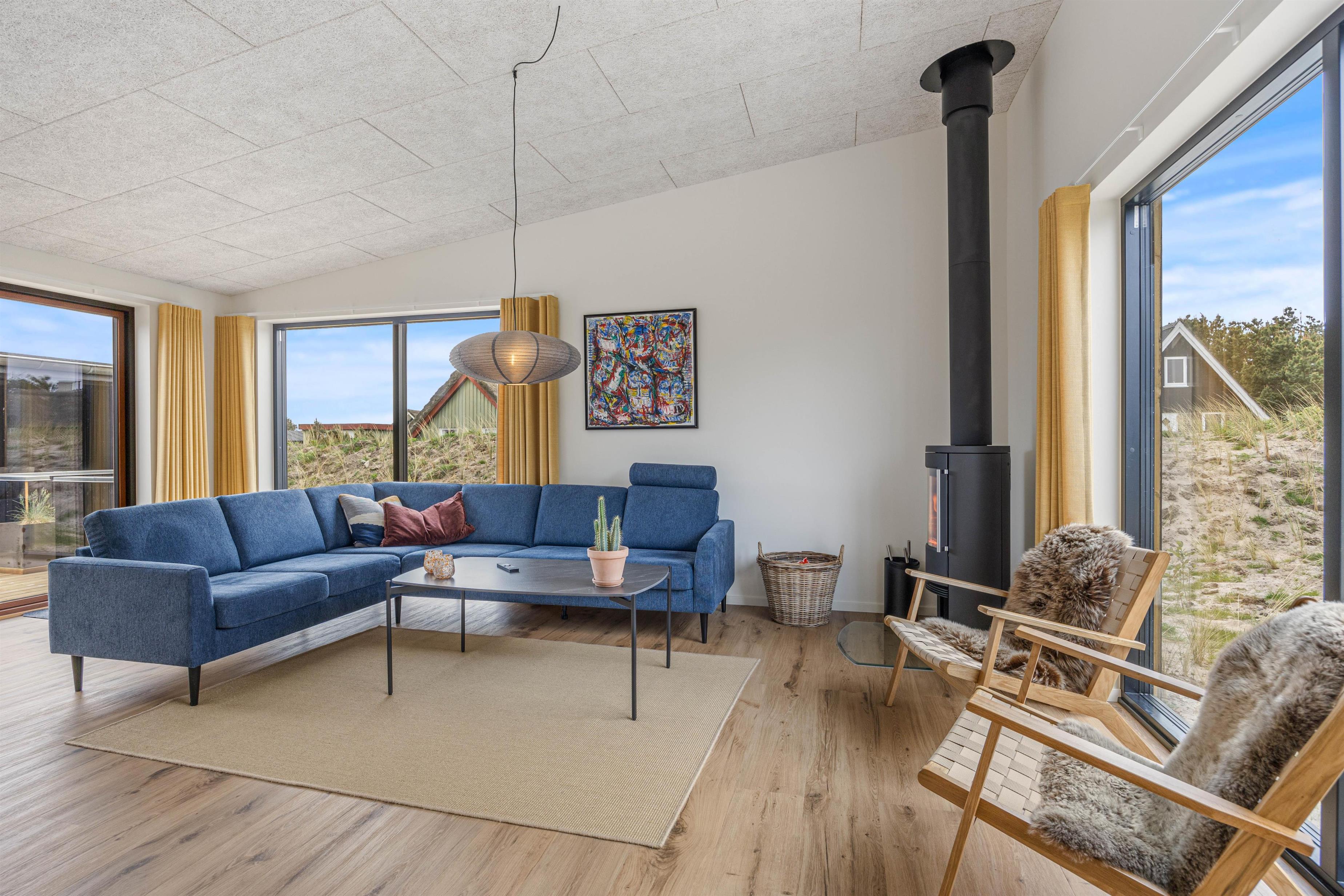 Husets naturlige samlingspunkt er det åbne køkken-alrum, hvor de store vinduespartier ikke blot giver en dejlig udsigt, men også lukker et behageligt lys ind. Køkkenet er veludstyret, og med den tilhørende opvaskemaskine slipper I for besværet med opvasken. Om I vælger at nyde måltiderne sammen ved spisebordet eller slapper af på sofaen, findes der en hyggelig krog for alle. På de køligere aftener kan I tænde op i pejsen, som skaber både varme og en indbydende, hyggelig stemning.