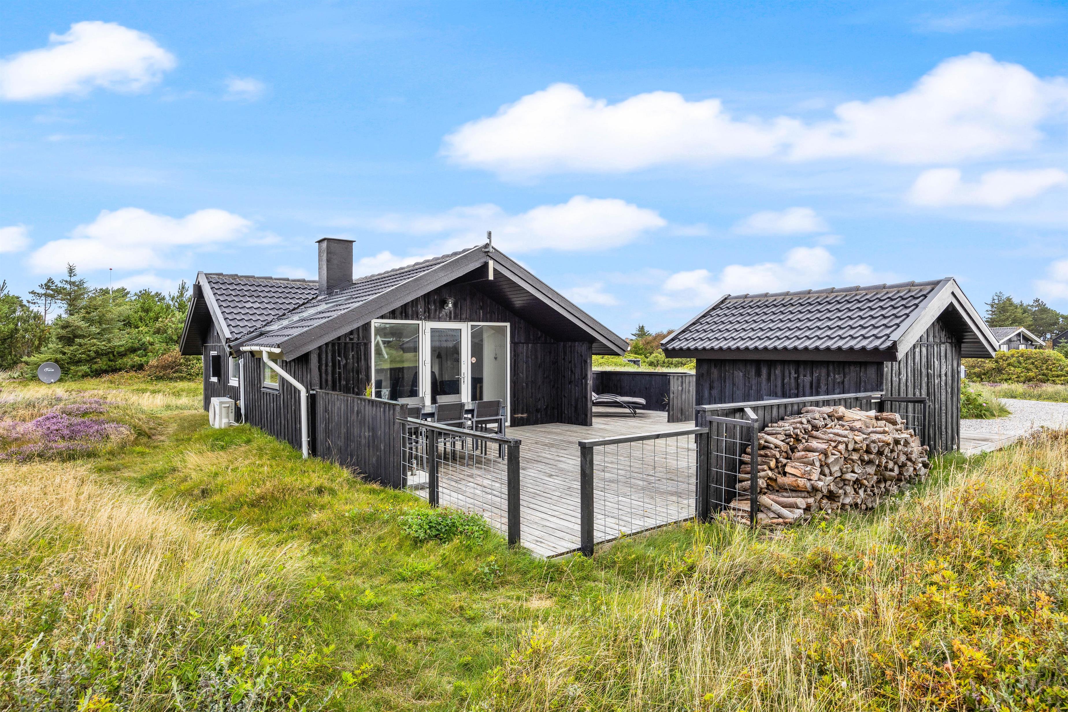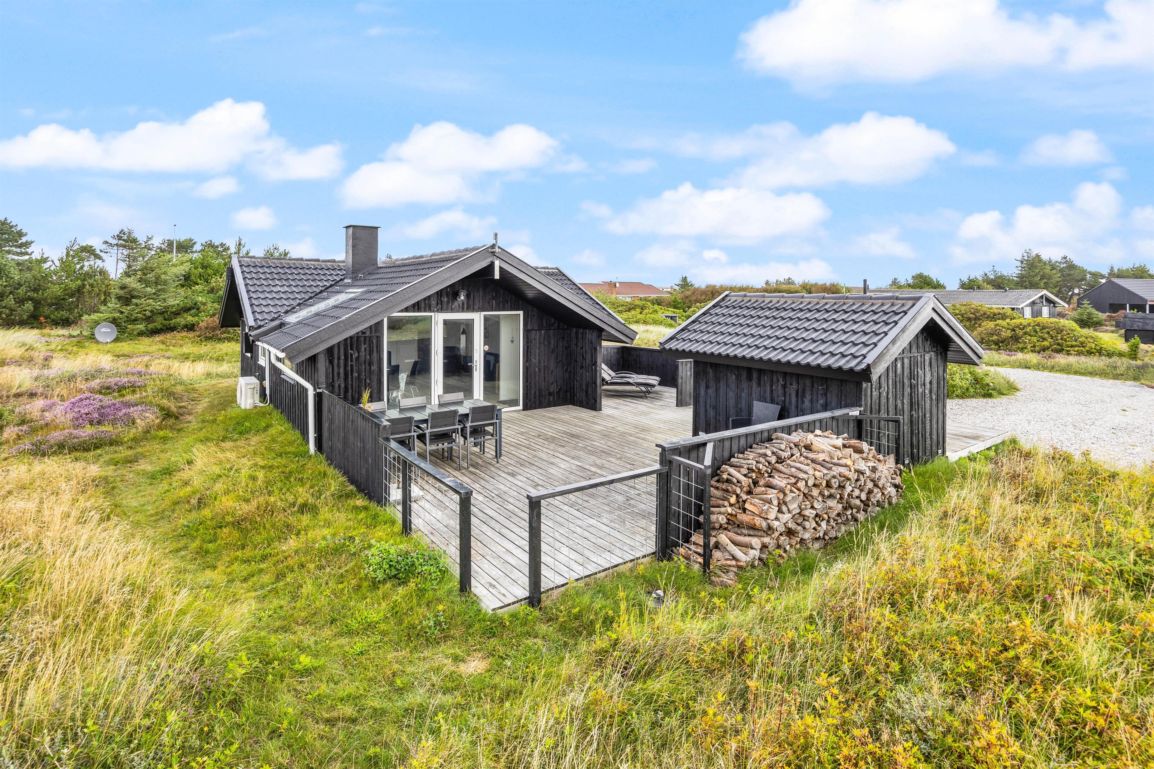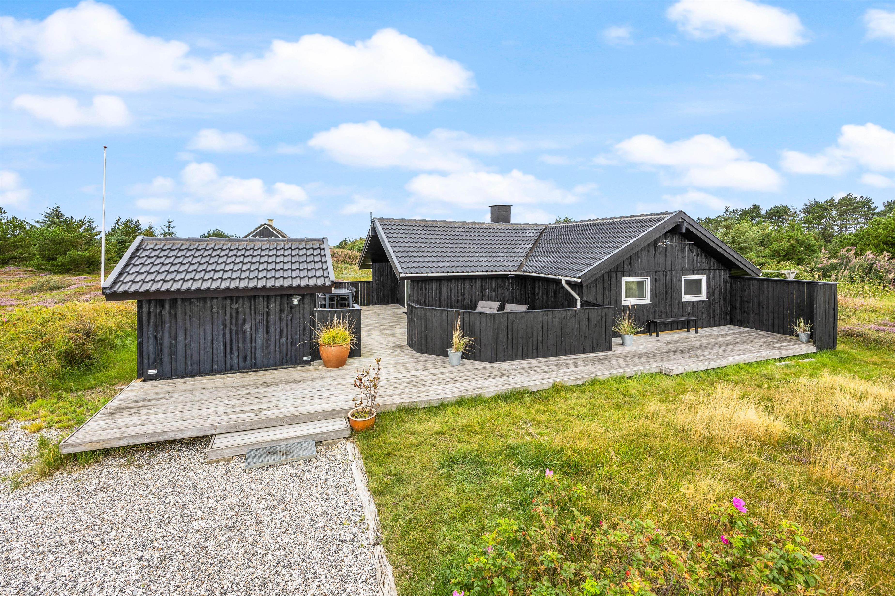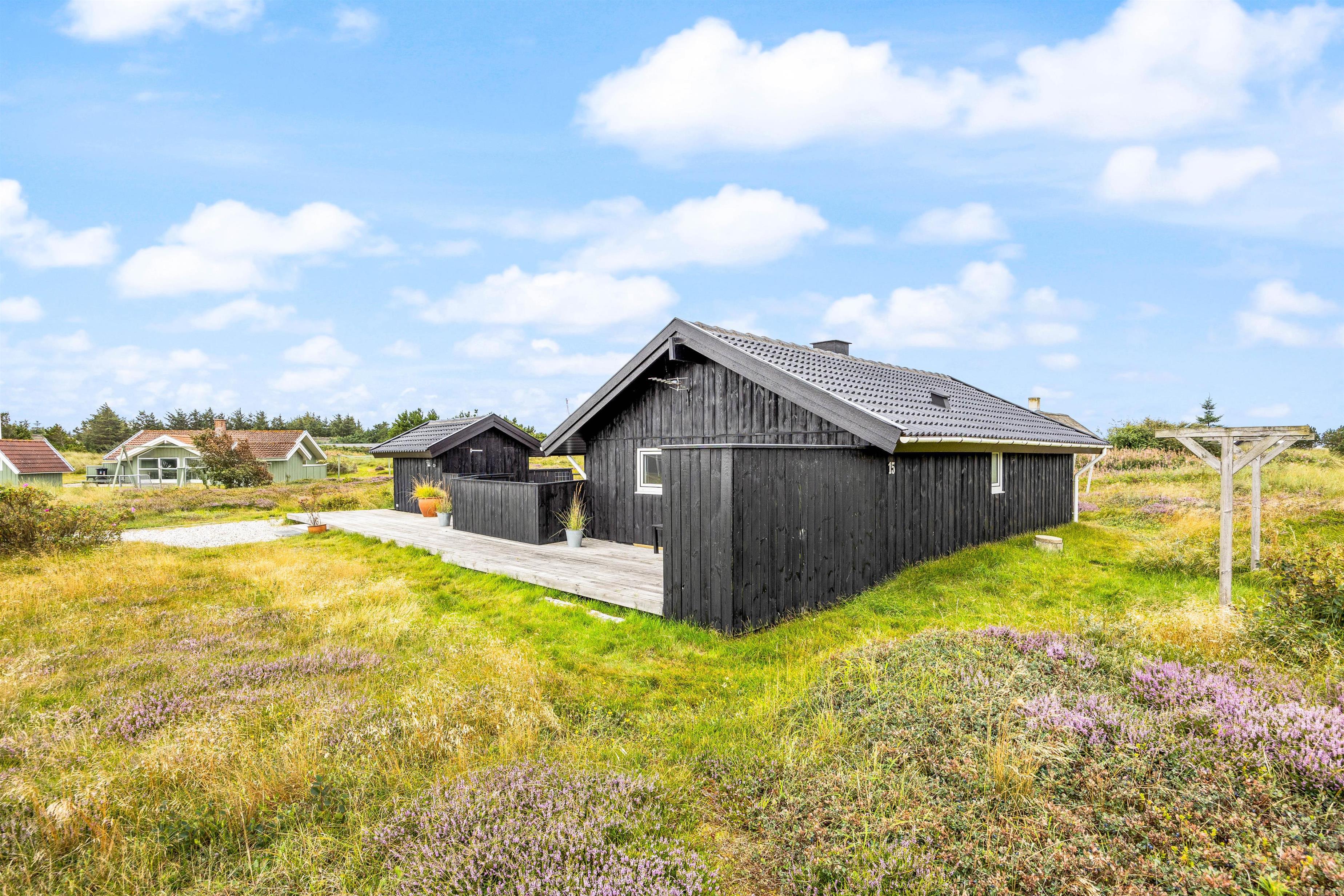 Sommerhuset på Frans Julius Vej 15 i Søndervig, ligger på en 2466 kvadratmeter stor lyngklædt naturgrund, kun 800 meter fra den kilometer lange sandstrand, og det betagende Vesterhav. Fra stuen har I direkte udgang til en dejlig stor terrasse, som er afskærmet og delvis lukket. Her har havemøbler, liggestole og naturligvis en grill til rådighed. Når mørket falder på, er det oplagt at tænde op for grillen, og lade feriens grillmester vise sine evner, og grille et lækkert måltid til hele familien. Til de mindste gæste er der opstillet en gynge, som helt sikkert vil bidrage med en masse timers sjov og leg.
