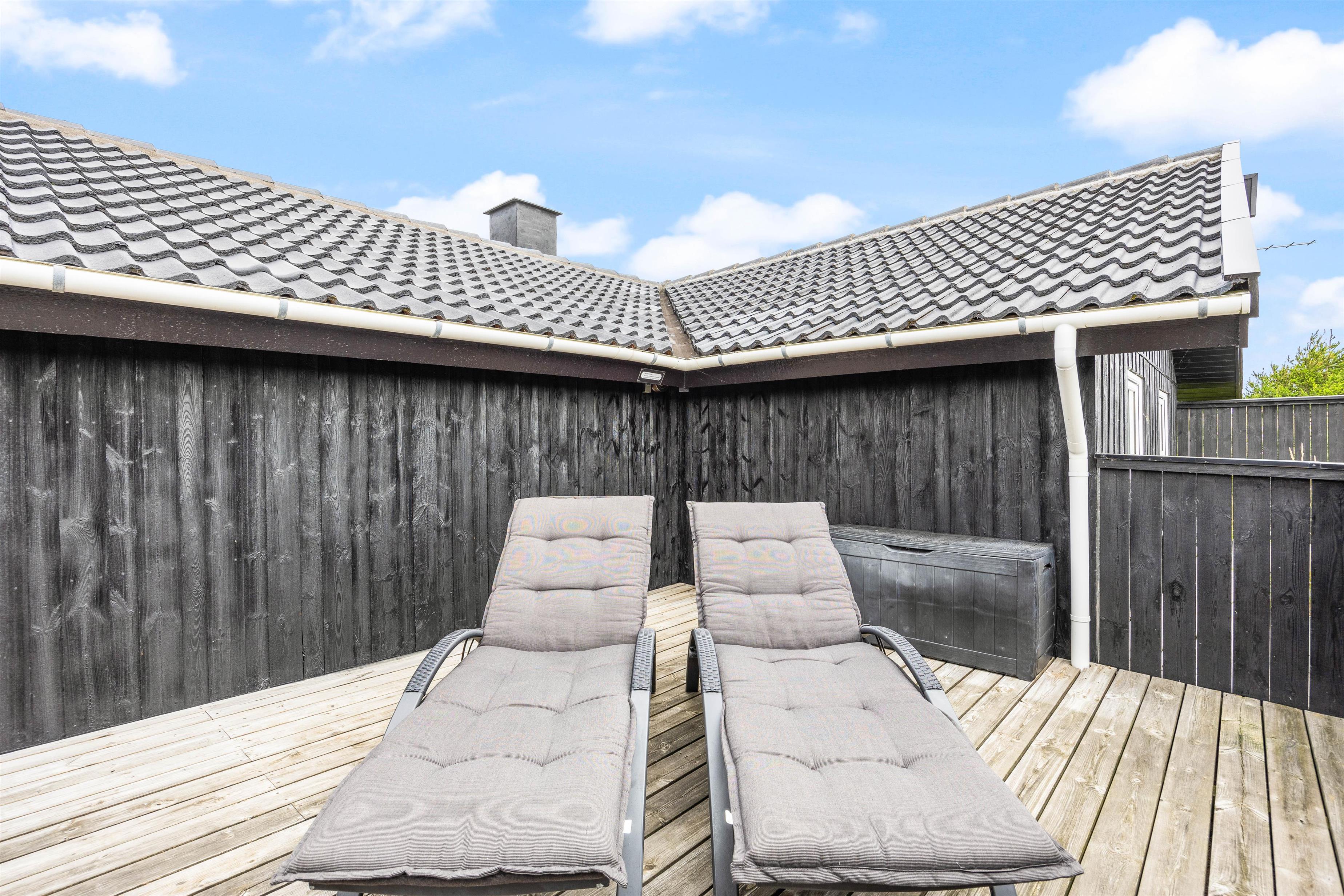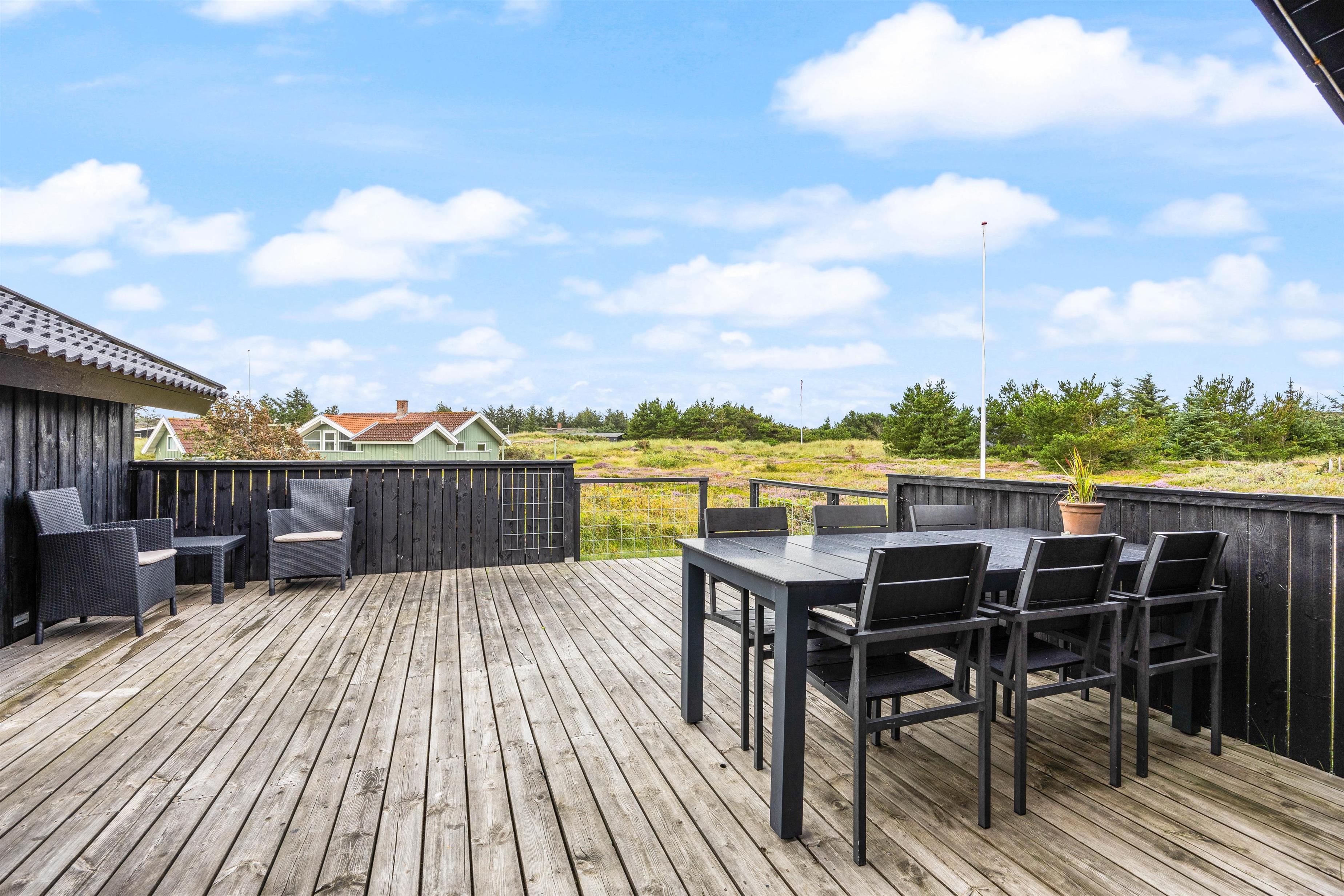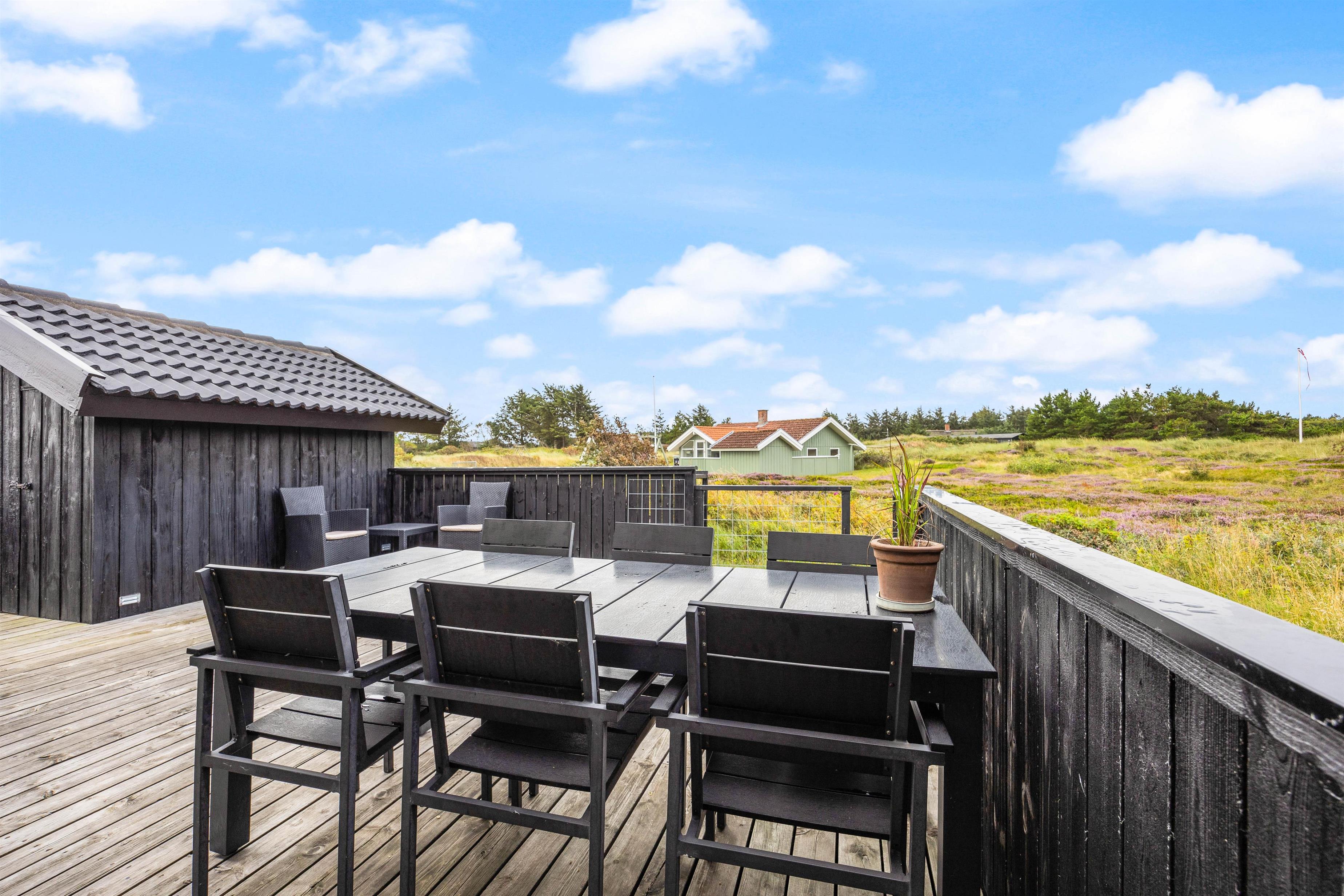 Sommerhuset på Frans Julius Vej 15 i Søndervig, ligger på en 2466 kvadratmeter stor lyngklædt naturgrund, kun 800 meter fra den kilometer lange sandstrand, og det betagende Vesterhav. Fra stuen har I direkte udgang til en dejlig stor terrasse, som er afskærmet og delvis lukket. Her har havemøbler, liggestole og naturligvis en grill til rådighed. Når mørket falder på, er det oplagt at tænde op for grillen, og lade feriens grillmester vise sine evner, og grille et lækkert måltid til hele familien. Til de mindste gæste er der opstillet en gynge, som helt sikkert vil bidrage med en masse timers sjov og leg.