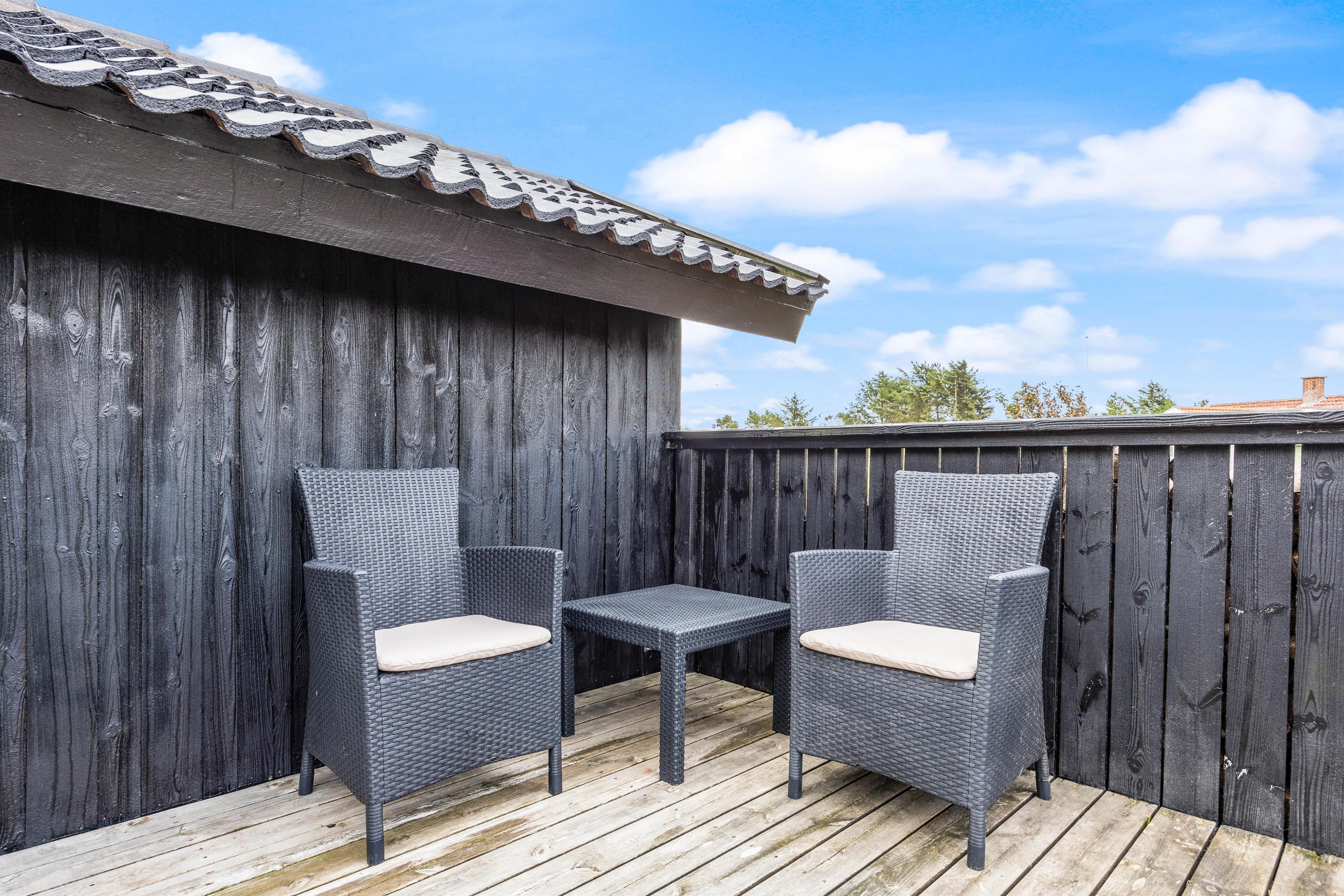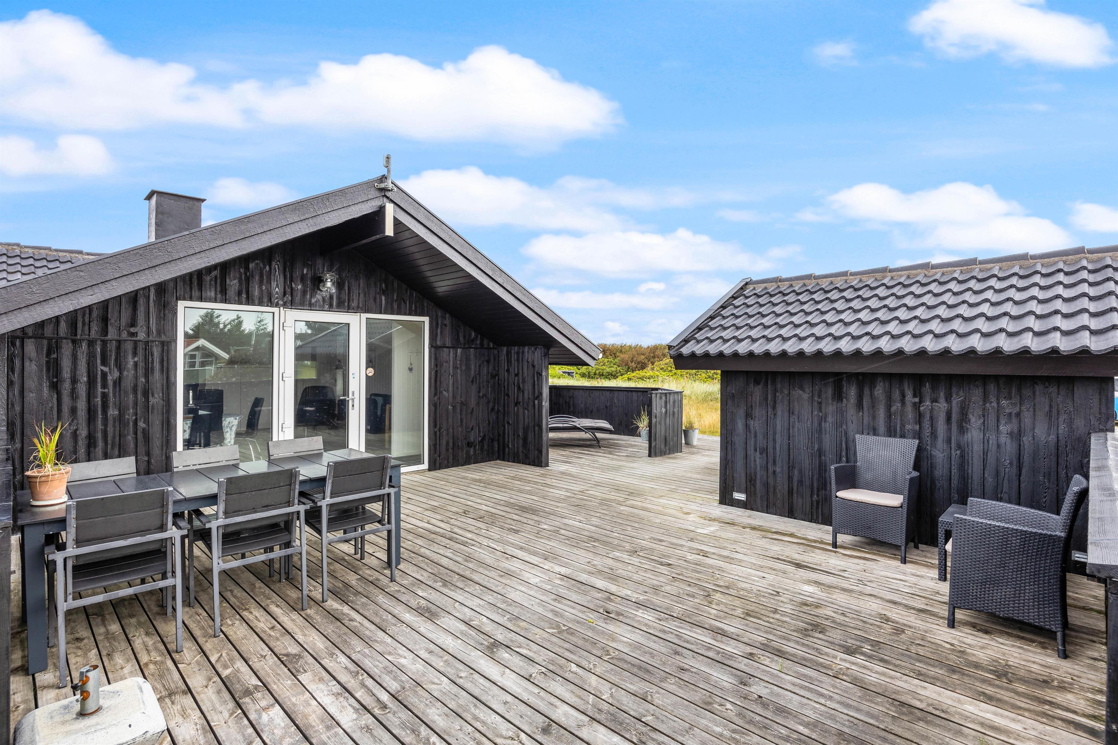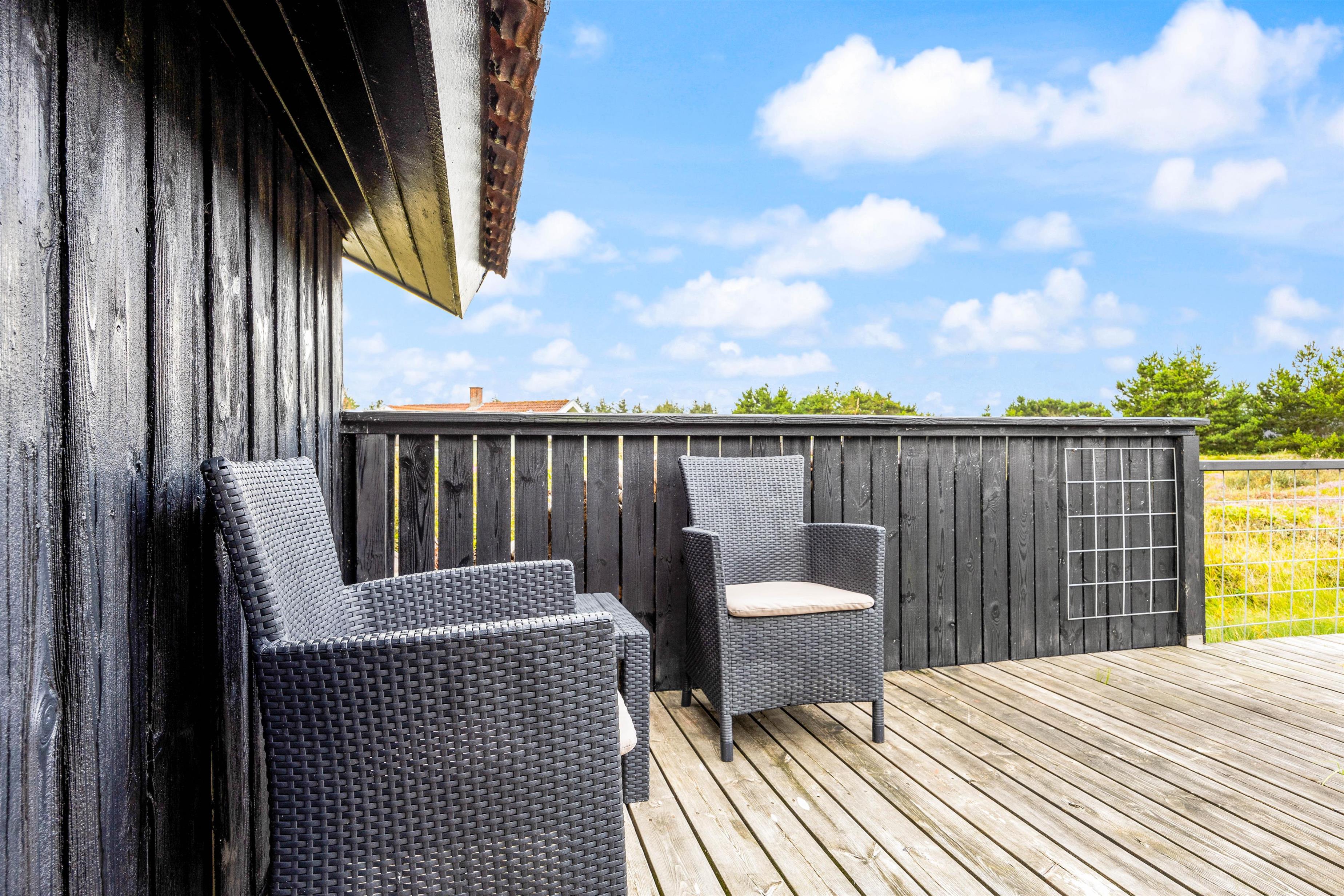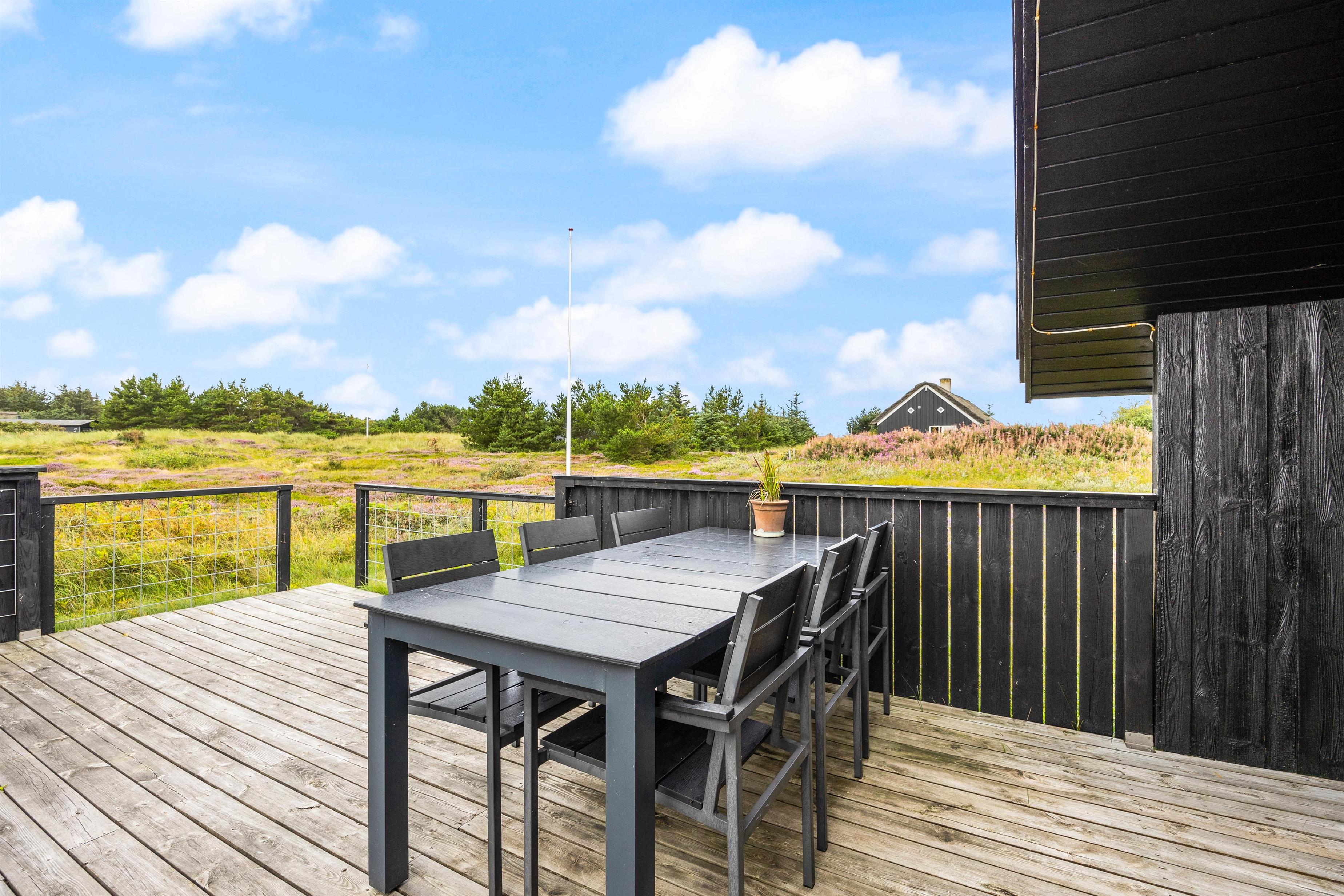 Sommerhuset på Frans Julius Vej 15 i Søndervig, ligger på en 2466 kvadratmeter stor lyngklædt naturgrund, kun 800 meter fra den kilometer lange sandstrand, og det betagende Vesterhav. Fra stuen har I direkte udgang til en dejlig stor terrasse, som er afskærmet og delvis lukket. Her har havemøbler, liggestole og naturligvis en grill til rådighed. Når mørket falder på, er det oplagt at tænde op for grillen, og lade feriens grillmester vise sine evner, og grille et lækkert måltid til hele familien. Til de mindste gæste er der opstillet en gynge, som helt sikkert vil bidrage med en masse timers sjov og leg.