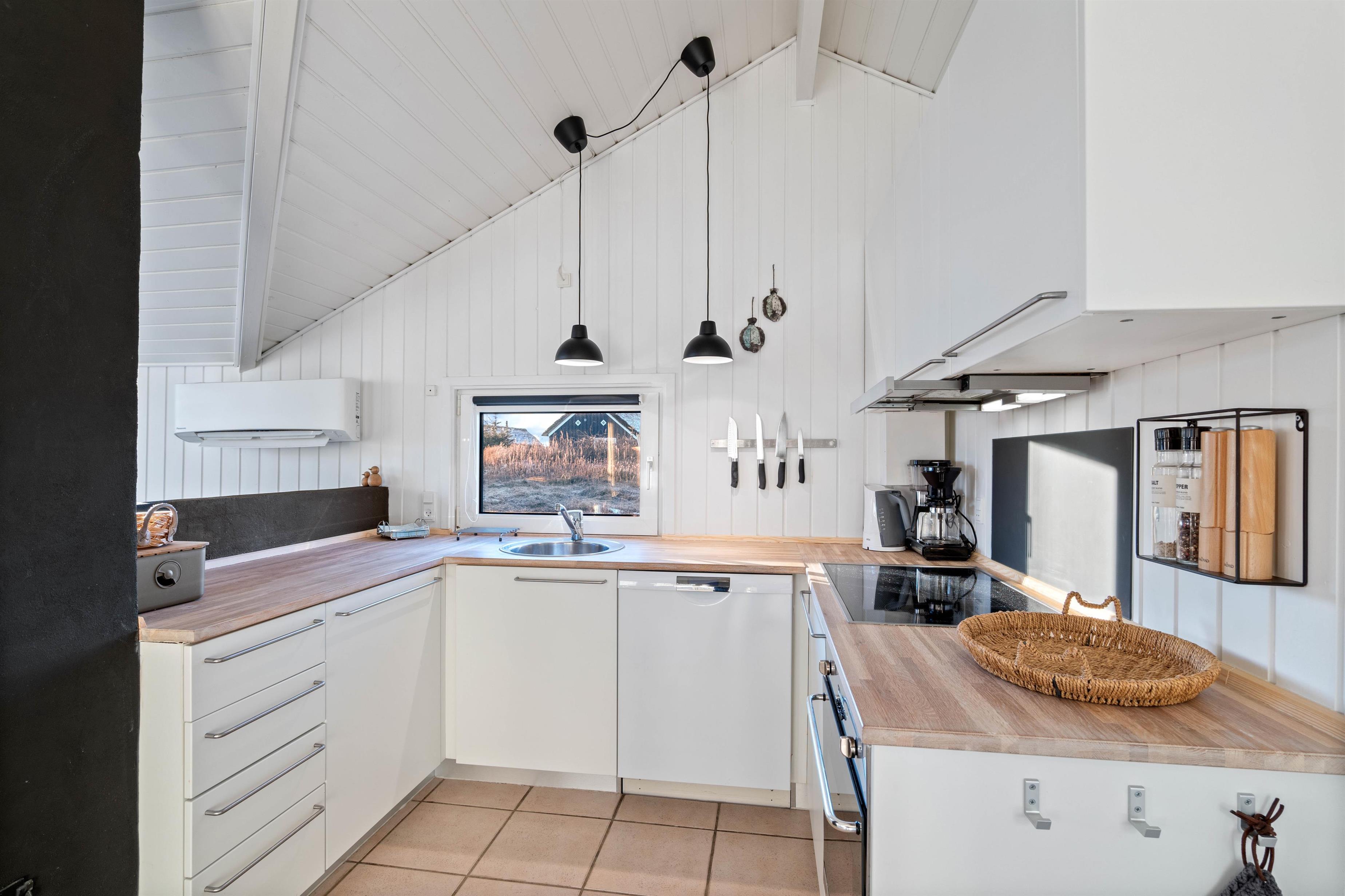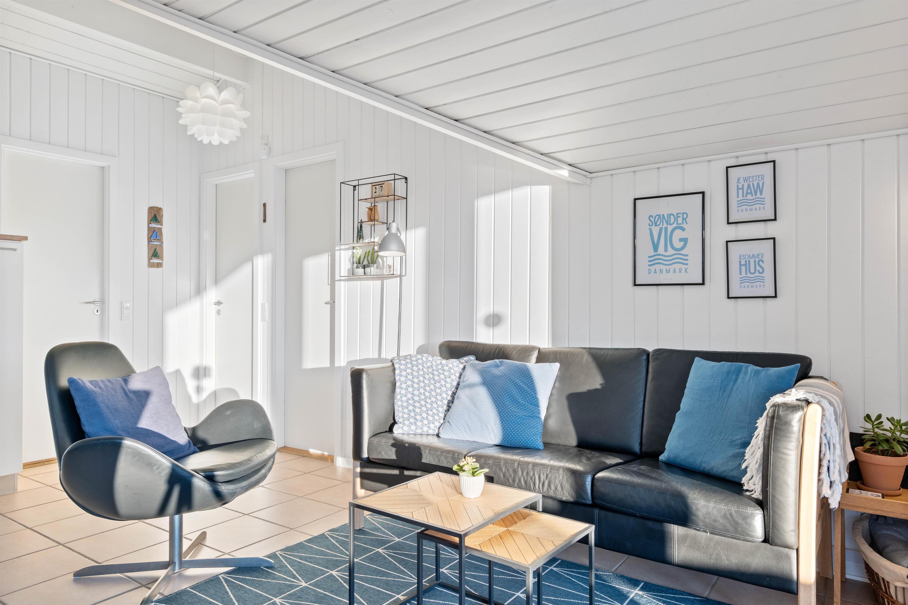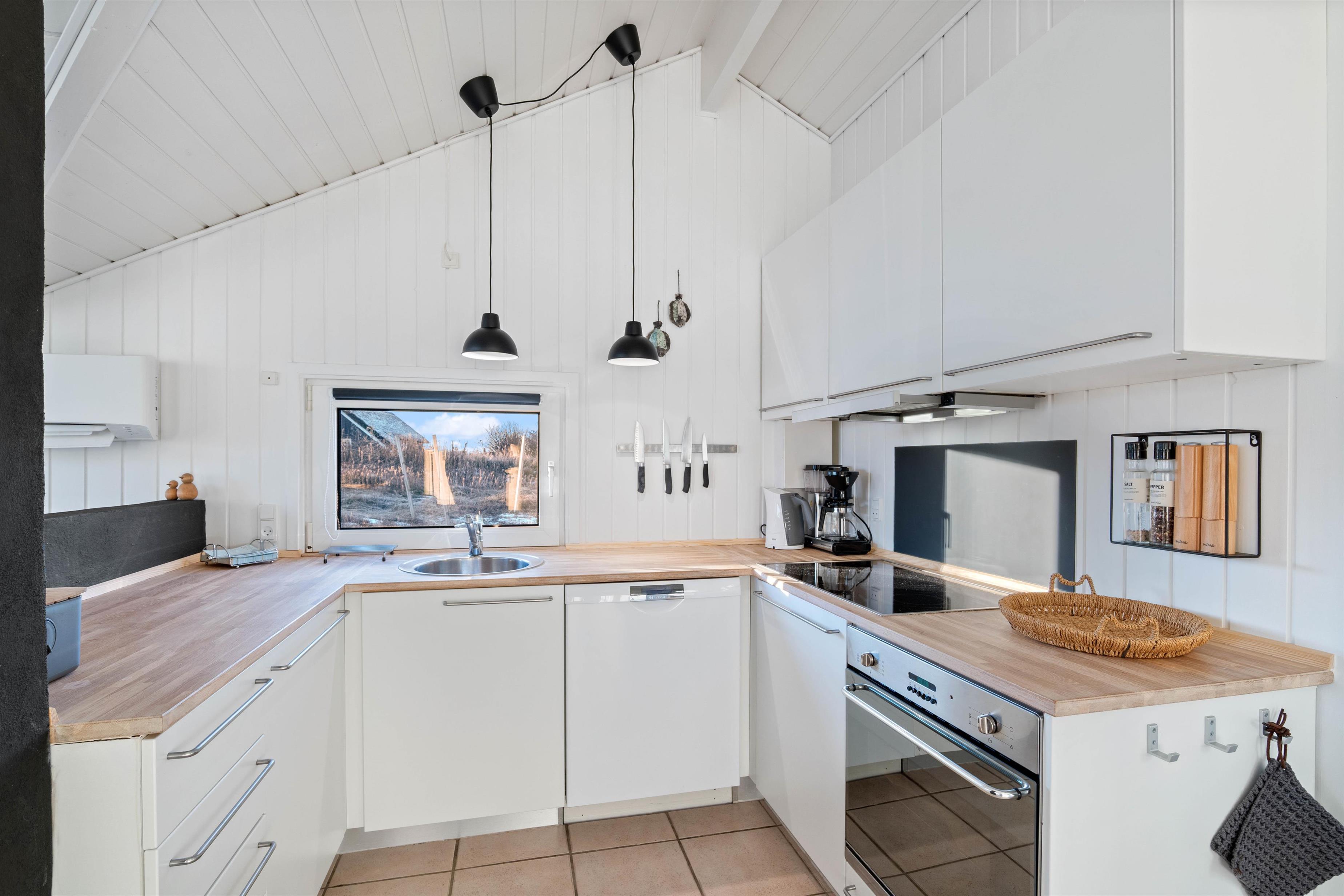 Køkken, stue og spisestuen/pladsen er et dejligt stort og lyst rum med praktisk klinkegulv, som er nemt at vaske over. Stuen er smagfuld indrettet med lyse møbler og fine detaljer. Køkkenet er funktionelt, og har alt hvad I skal bruge for at tilberede et lækkert feriemåltid. I køkkenet har I også en opvaskemaskine til rådighed, som vil sørge for den kedelige opvask. Et rigtig hyggeligt sommerhus, der lægger op til en masse samvær og afslapning.