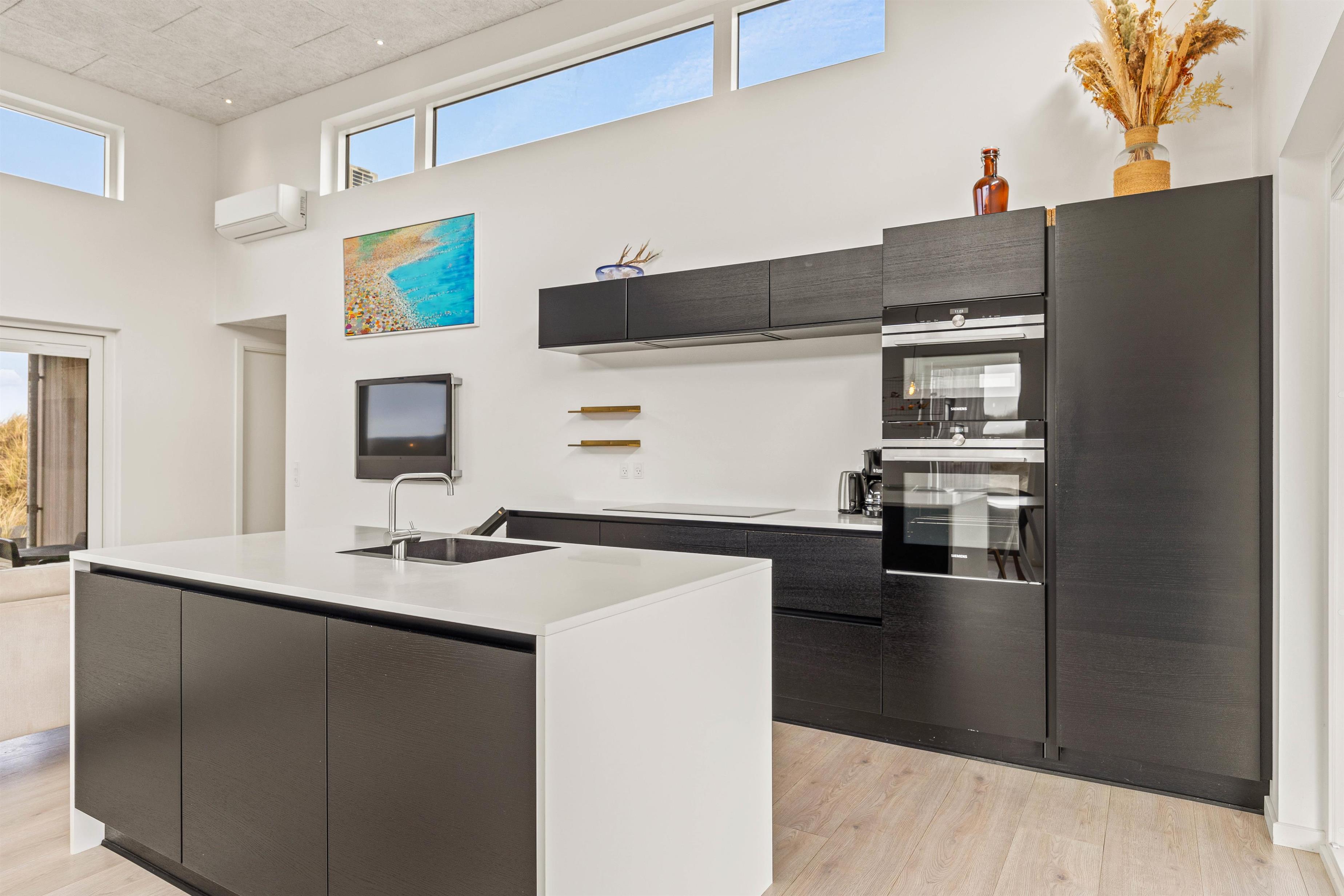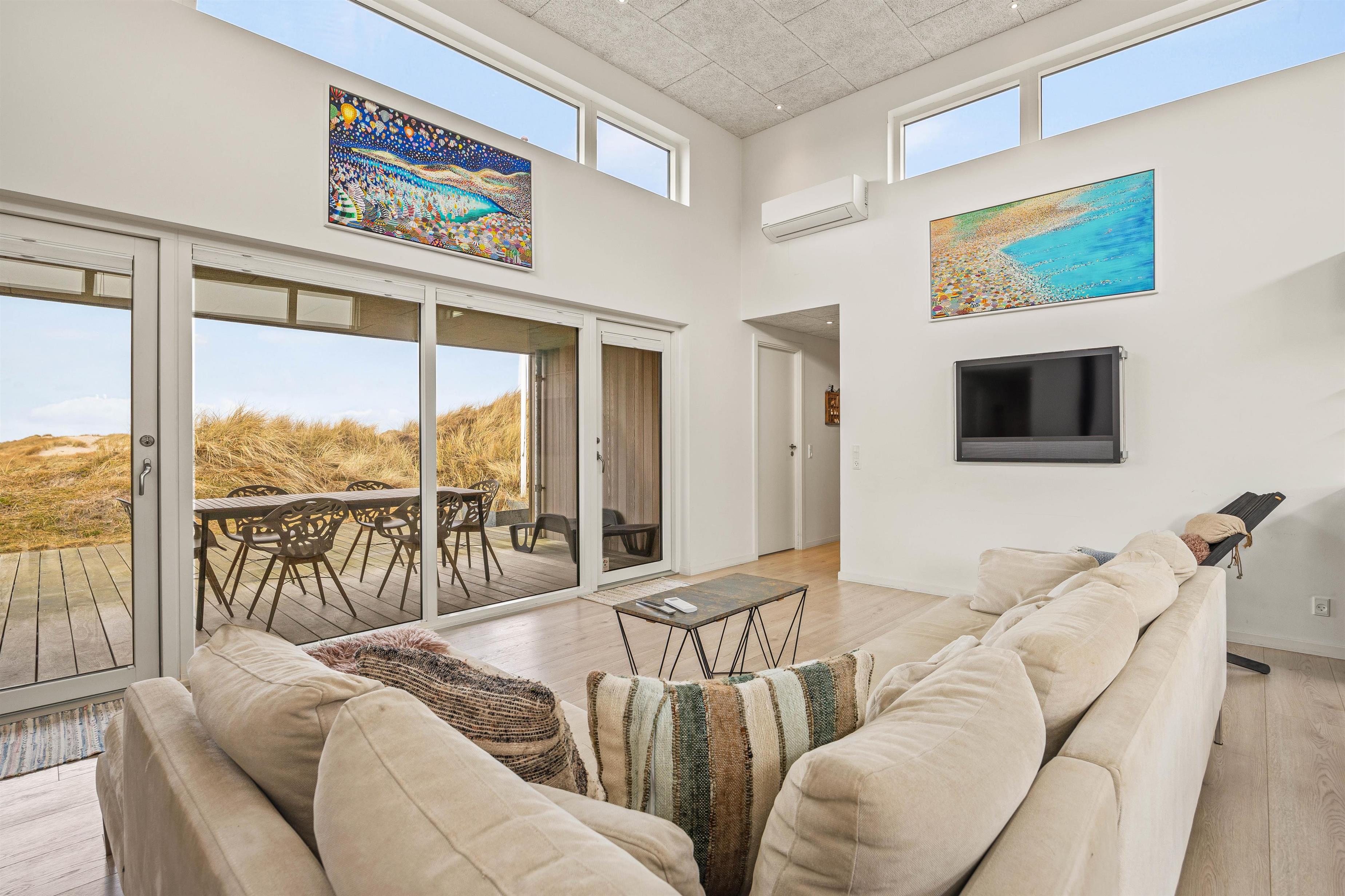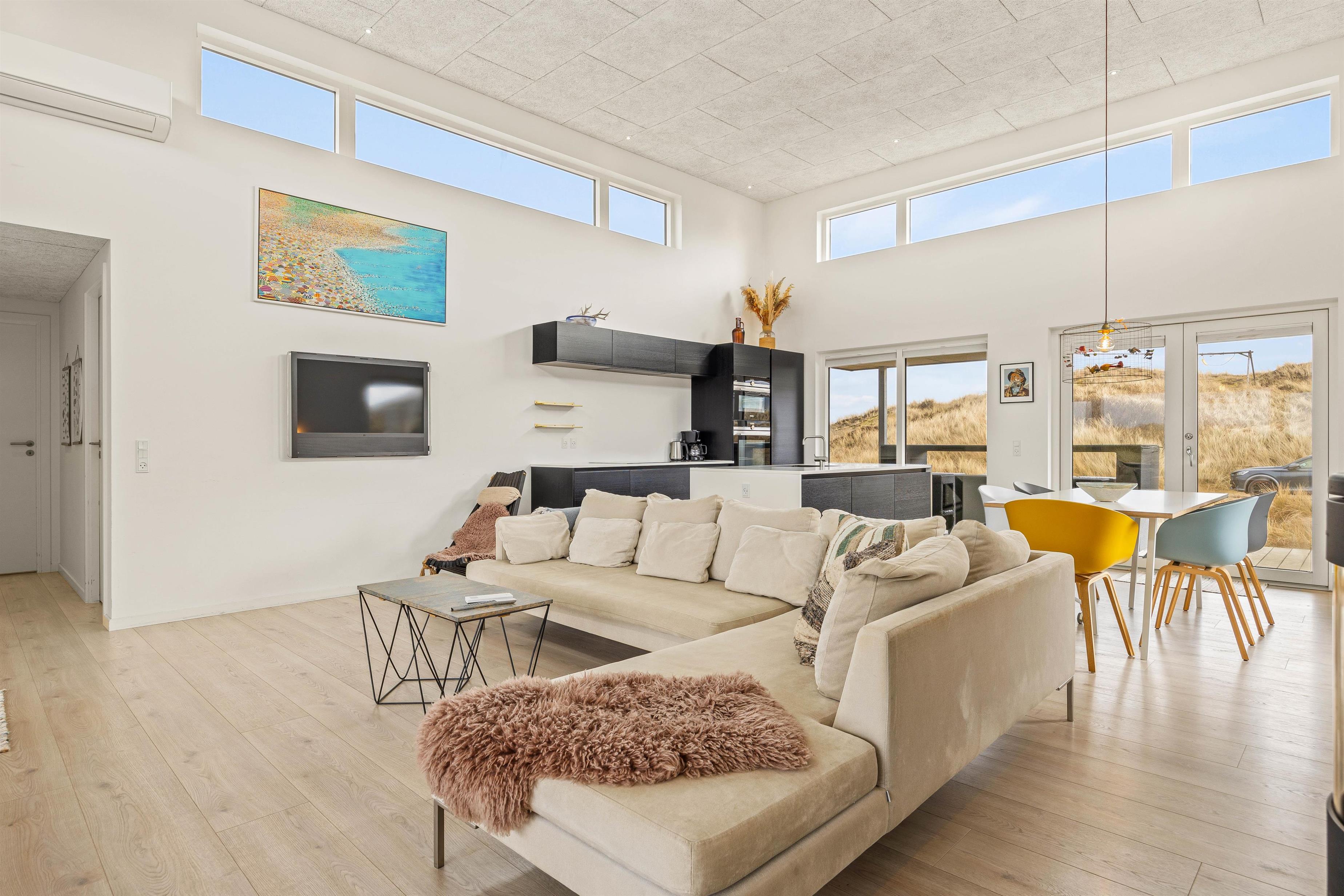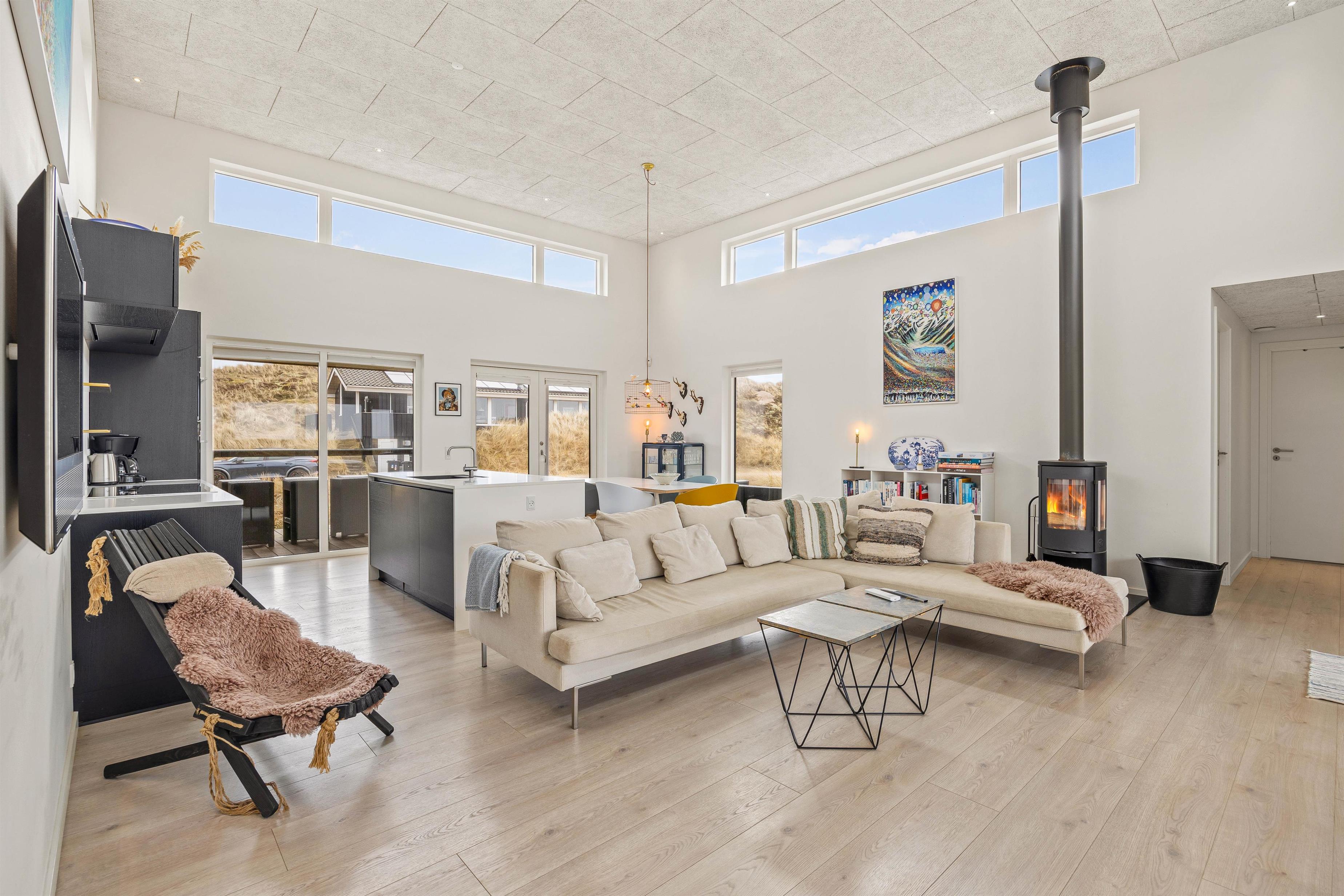De store glaspartier i stuen ud mod terrasserne byder på en fantastisk panoramaudsigt til havet og klitlandskabet, og de sørger samtidig for et skønt lysindfald i huset, så I kan nyde det helt særlige lys ved havet - også i de koldere måneder, hvor aftener tilbringes med hygge foran den knitrende brændeovn. Det åbne køkken med indbygget køleskab indbyder desuden til fælles madlavning og til at kræse lidt ekstra om menuerne i ferien. Her er også kræset for detaljerne, eftersom alle møbler er bevidst valg for at give jer komfort samt skabe en stilfuld indretning. Her er også højt til loftet, hvilket er med til at give rummene en dejlig rummelighed og få jer helt ned i gear.