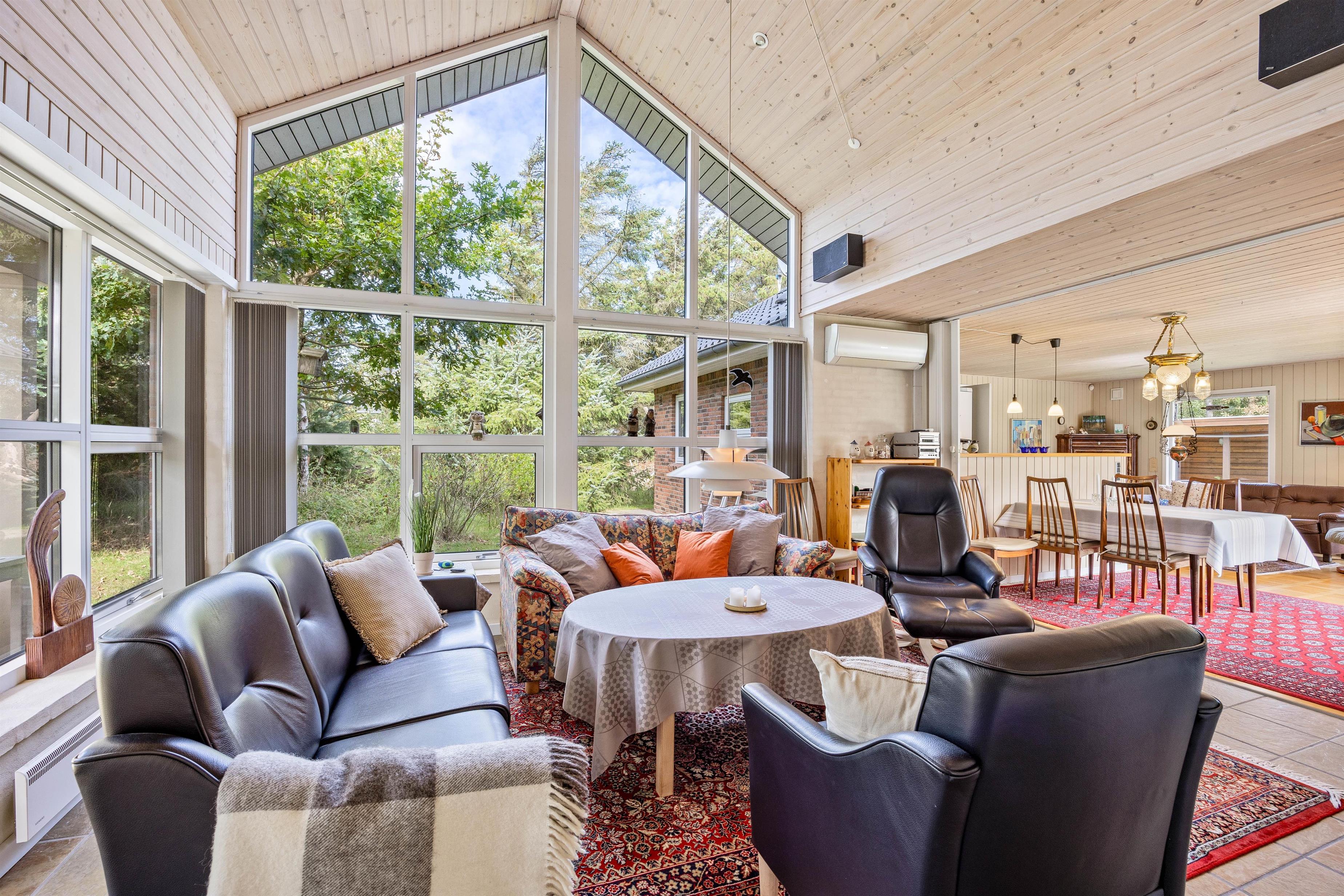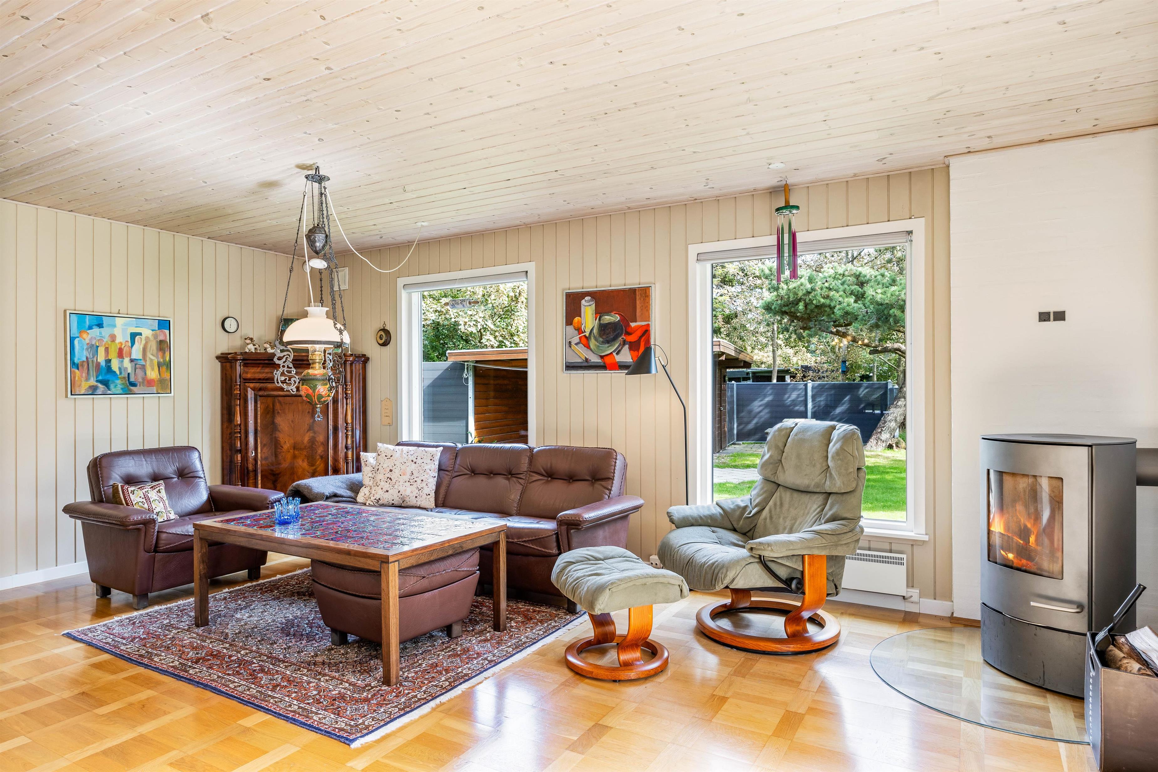 Indenfor er huset meget personligt indrettet. Grundet de mange og store vinduespartier er her lyst og pænt, og med hele 110 kvadratmeter er der er god plads. Særligt I husets ene stue, hvor loftet også går til kip er der dejligt. Den anden stue er også hyggelig med sine behagelige møbler. I kan nyde en behagelig aften foran brændeovnen, som giver rummet en hyggelig atmosfære, især på de køligere dage.