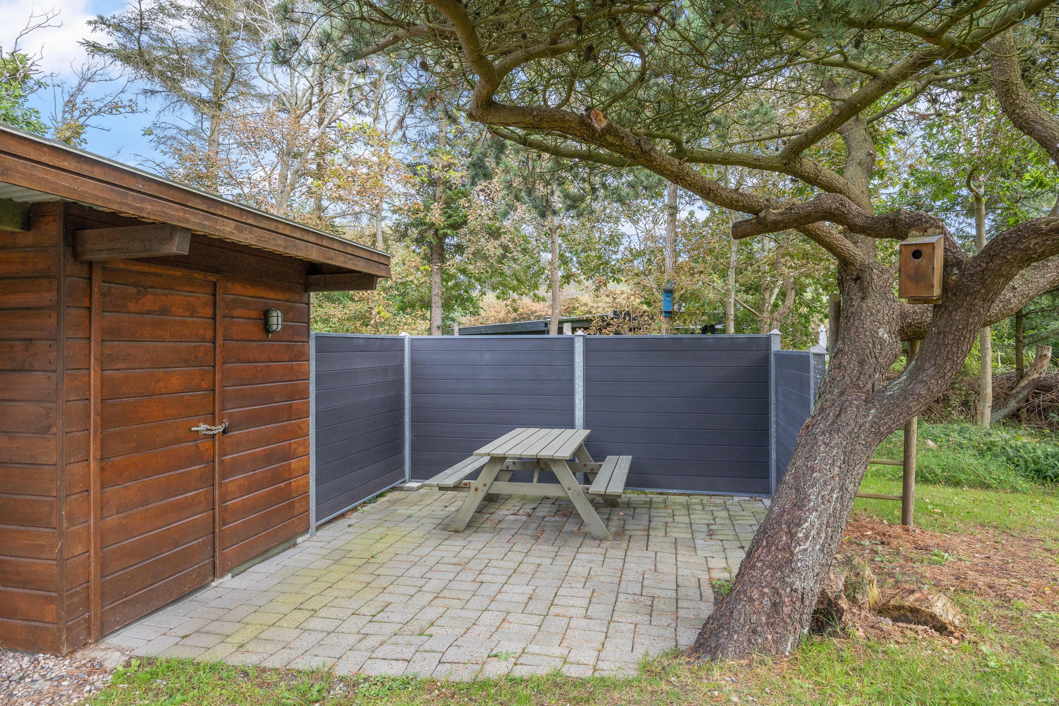Udenomsarealerne er hyggelige, her findes flere gode lækroge og træer der sørger for ugeneret beliggenhed. Der er flere gode steder hvor solen eller frokosten kan nydes i fred for vinden.
