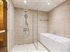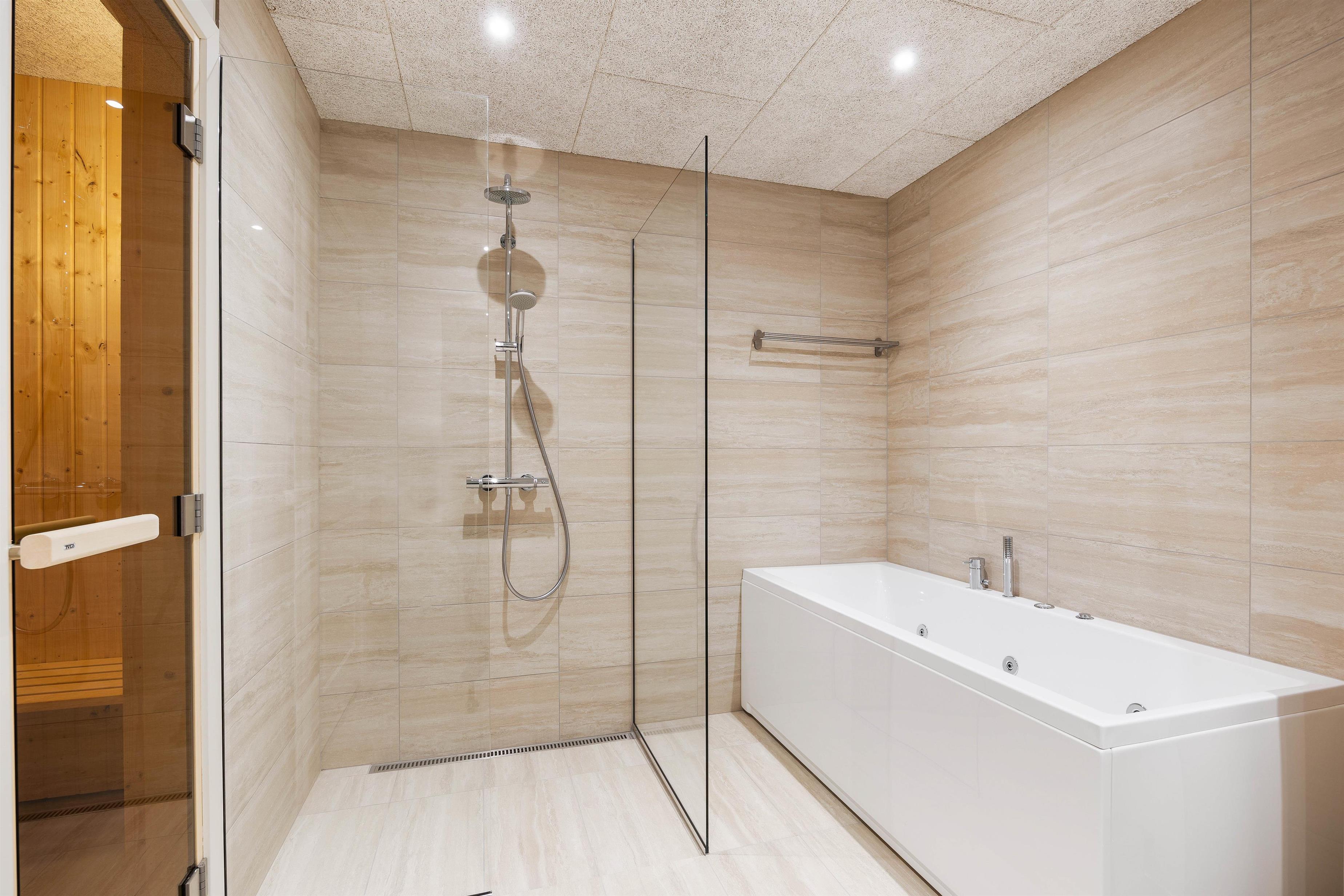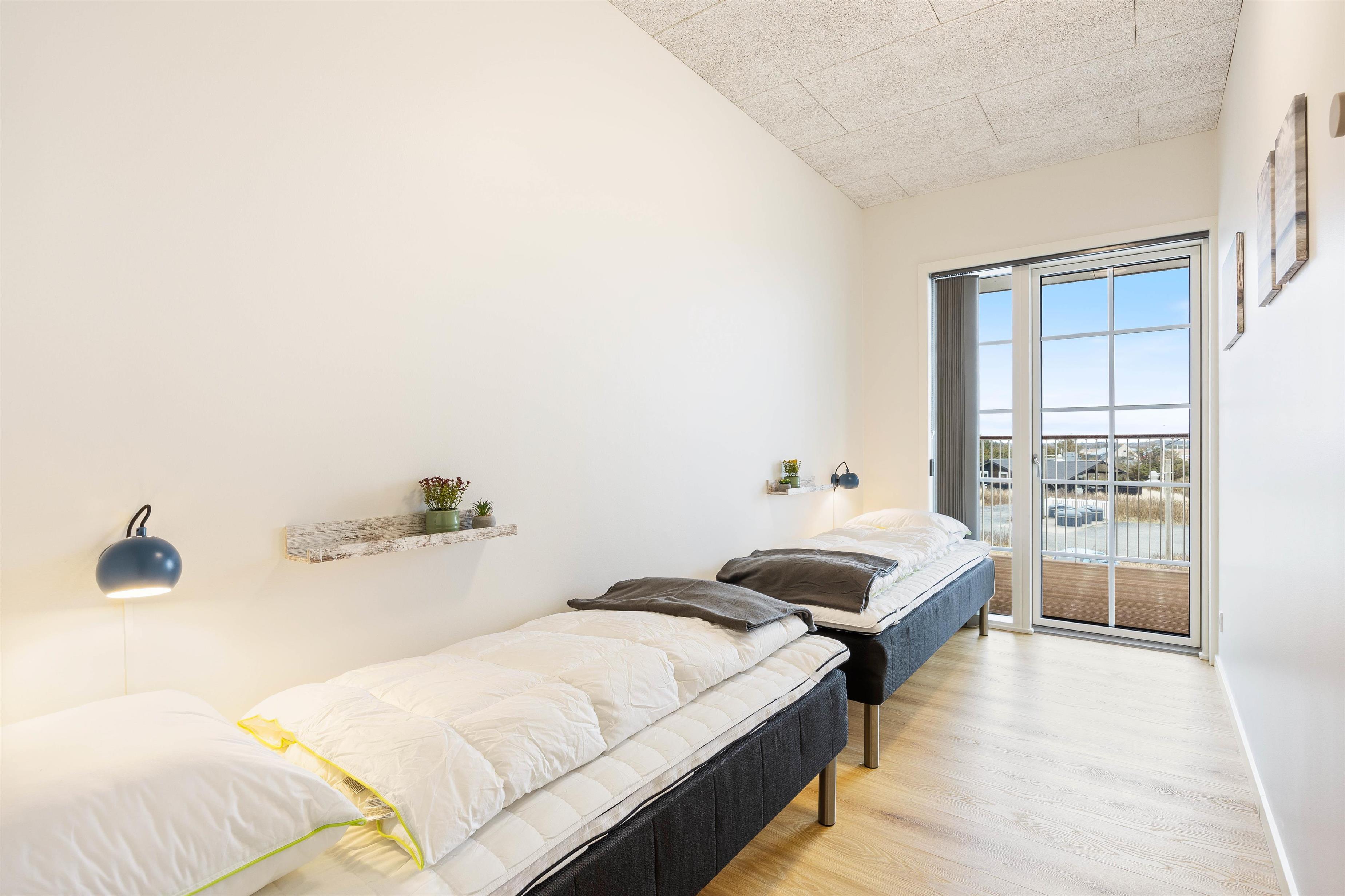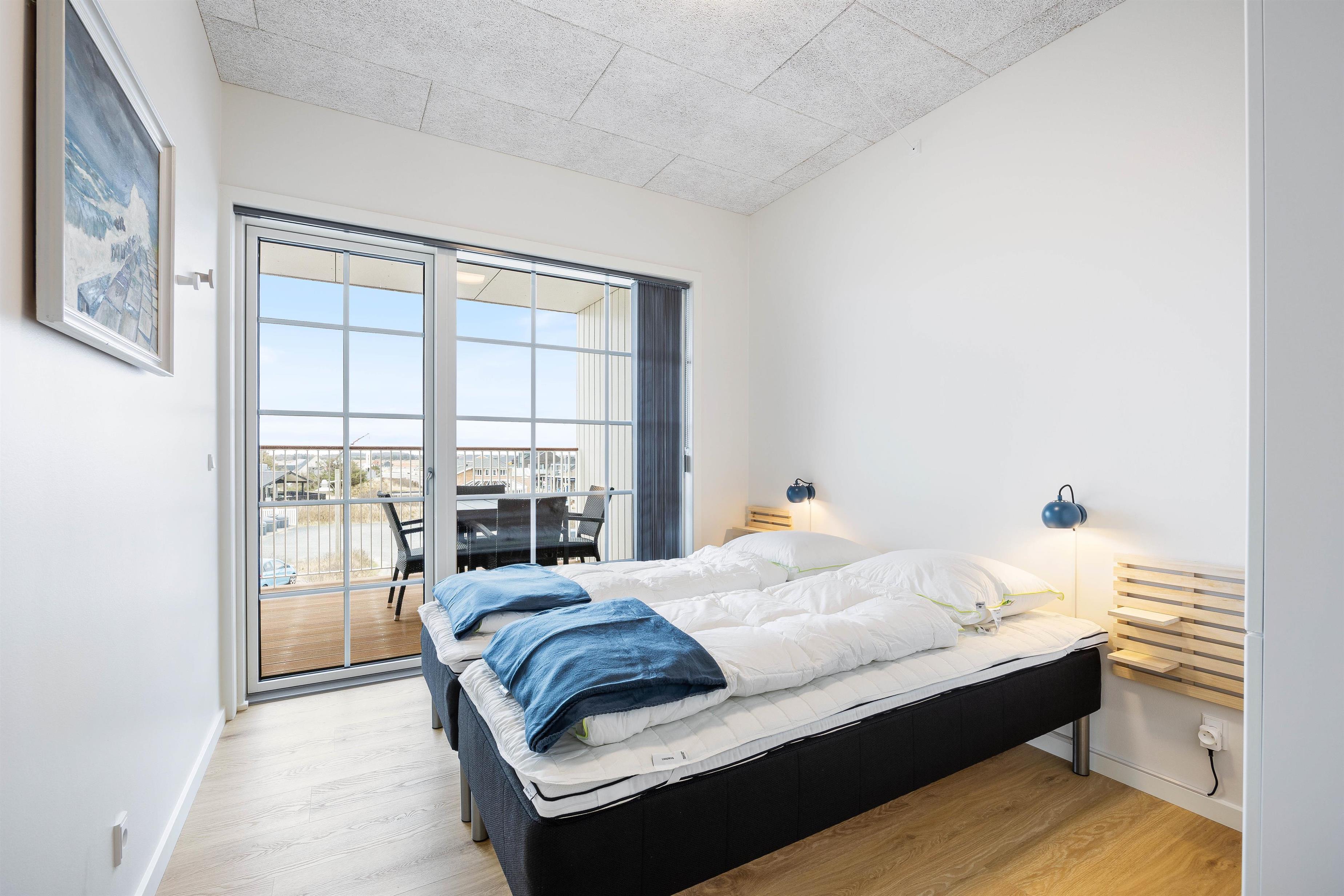 Fra stuen fører en trappe op til ferielejlighedens to soveværelser og det store badeværelse. Om aftenen kan I bruge ferielejlighedens to soveværelser og lade jeres batterier op. Det ene soveværelse er indrettet med en dobbeltseng, mens der er 2 enkeltsenge i det andet soveværelse. Når I kommer tilbage til ferielejligheden efter en lang gåtur på stranden, kan I tænde op i saunaen eller tømmespaen.