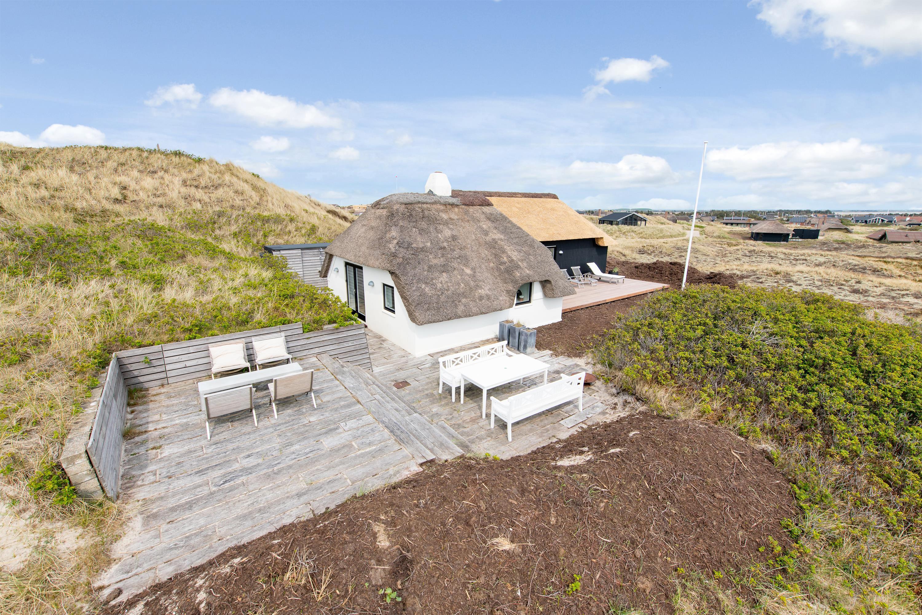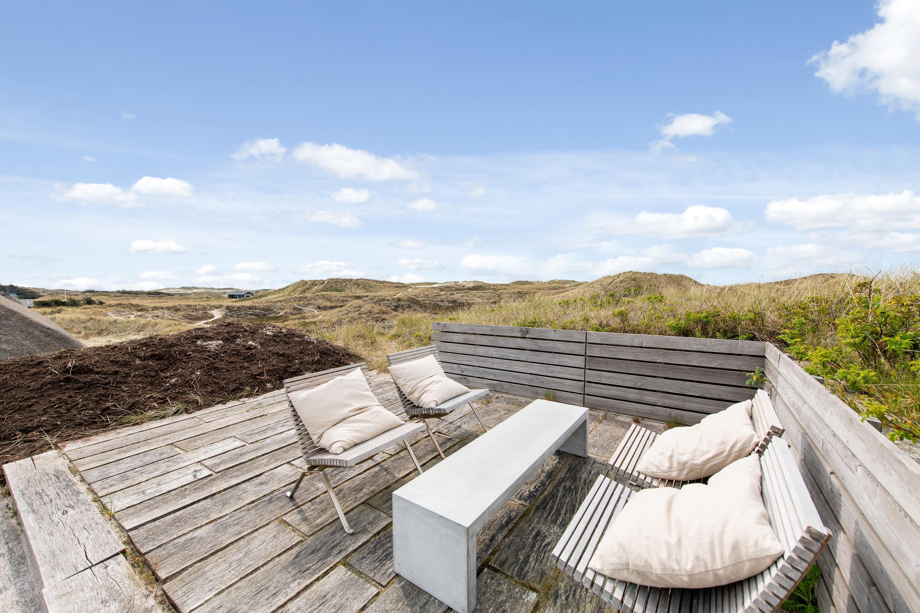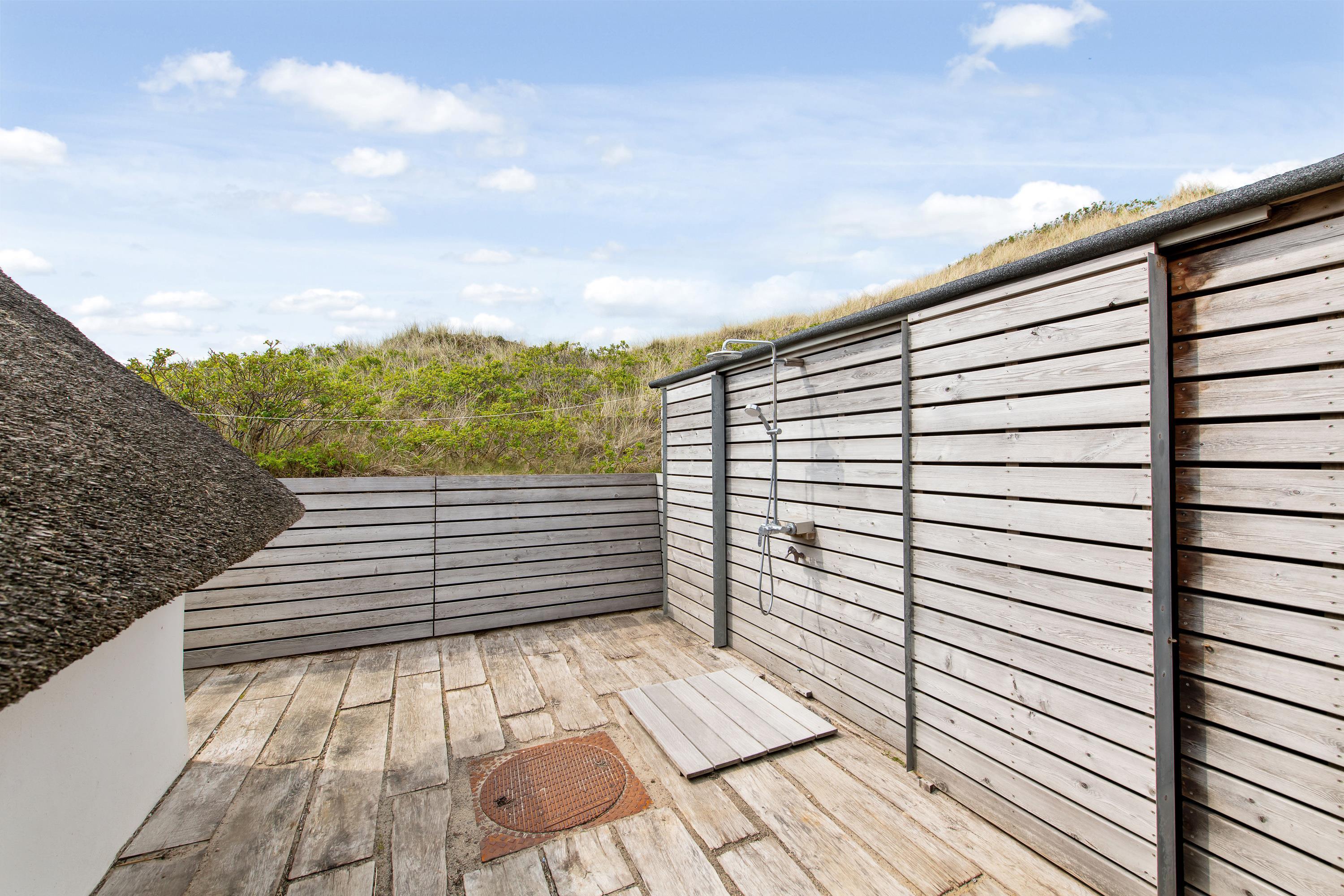 Nyd det smukke udeareal, der omgiver feriehuset. Den afskærmede terrasse med havemøbler indbyder til at tilbringe dejlige timer udendørs. På den unikke natur- og klitgrund forkæles I med en smuk panoramaudsigt ud over de betagende klitter. Som noget helt særligt kan I her ved huset nyde udesaunaen, der giver jer en uforglemmelig wellness-oplevelse, mens I slapper af midt i naturen. Dette område suppleres af en udendørs bruser, der – fra april til september – sørger for, at I kan skylle fødderne fri for sand, når I kommer fra stranden.