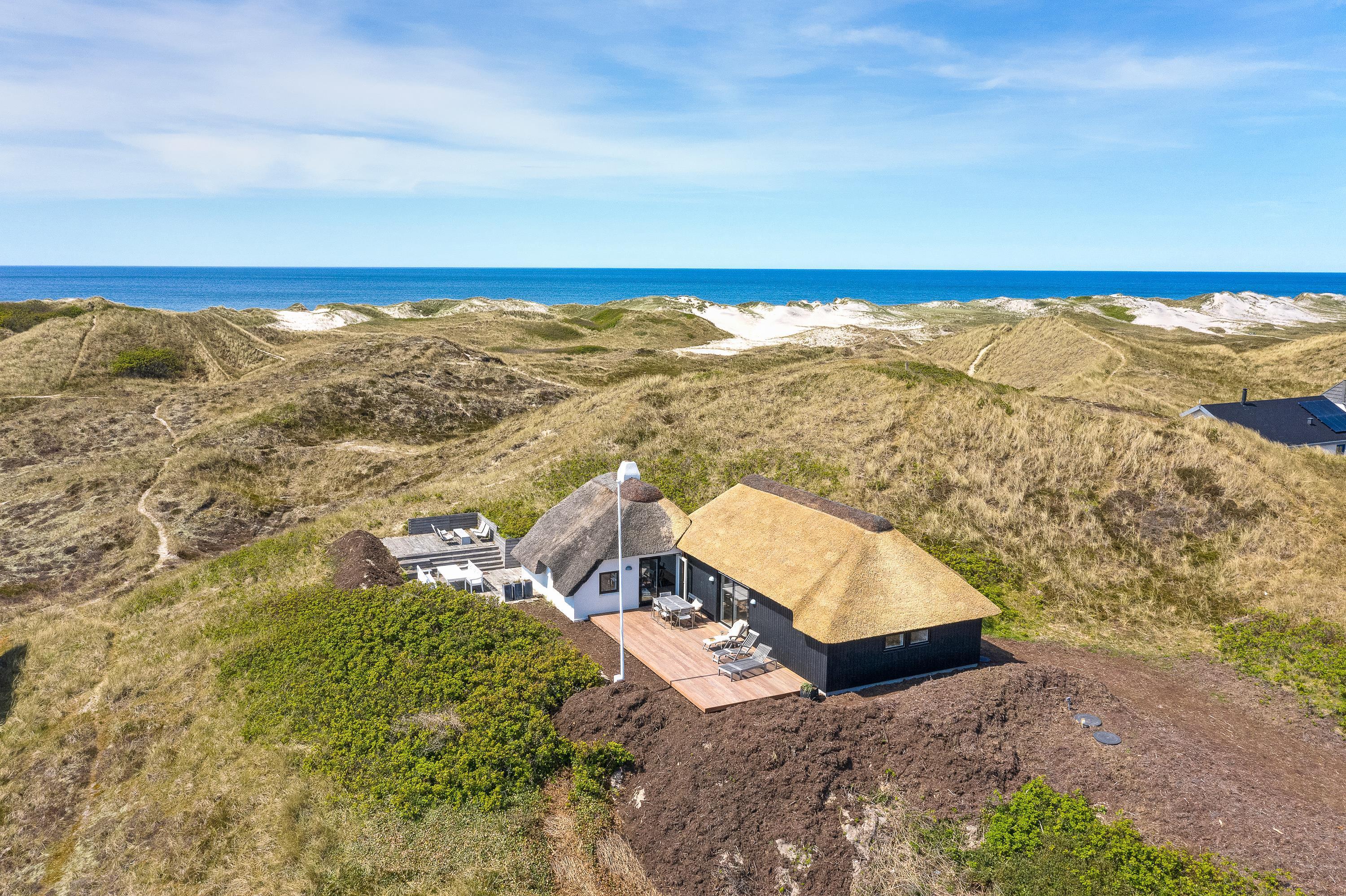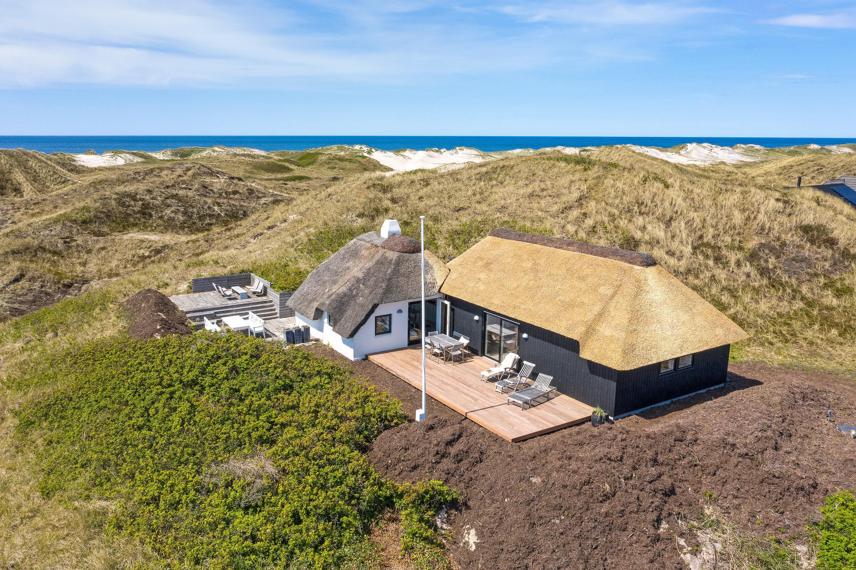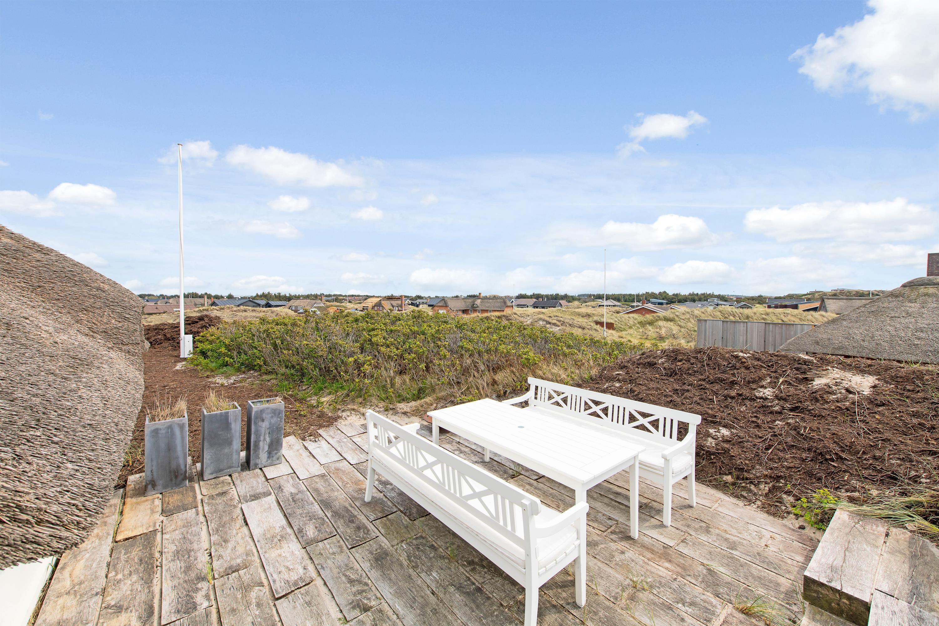 Nyd det smukke udeareal, der omgiver feriehuset. Den afskærmede terrasse med havemøbler indbyder til at tilbringe dejlige timer udendørs. På den unikke natur- og klitgrund forkæles I med en smuk panoramaudsigt ud over de betagende klitter. Som noget helt særligt kan I her ved huset nyde udesaunaen, der giver jer en uforglemmelig wellness-oplevelse, mens I slapper af midt i naturen. Dette område suppleres af en udendørs bruser, der – fra april til september – sørger for, at I kan skylle fødderne fri for sand, når I kommer fra stranden.