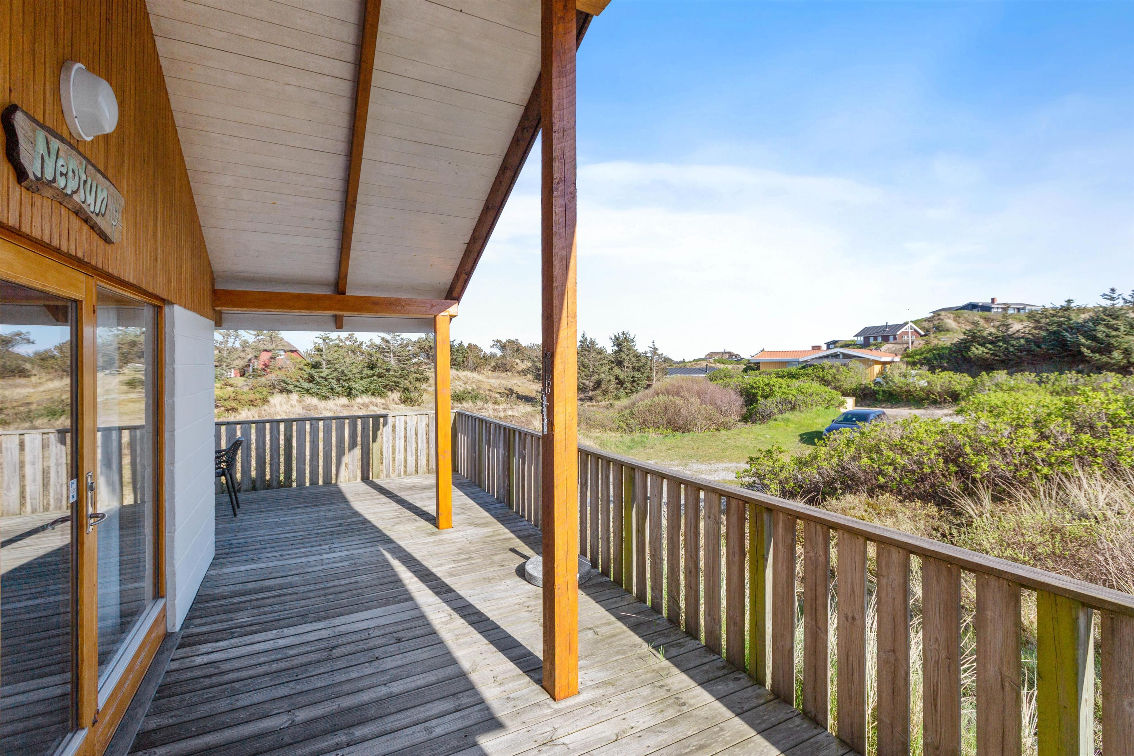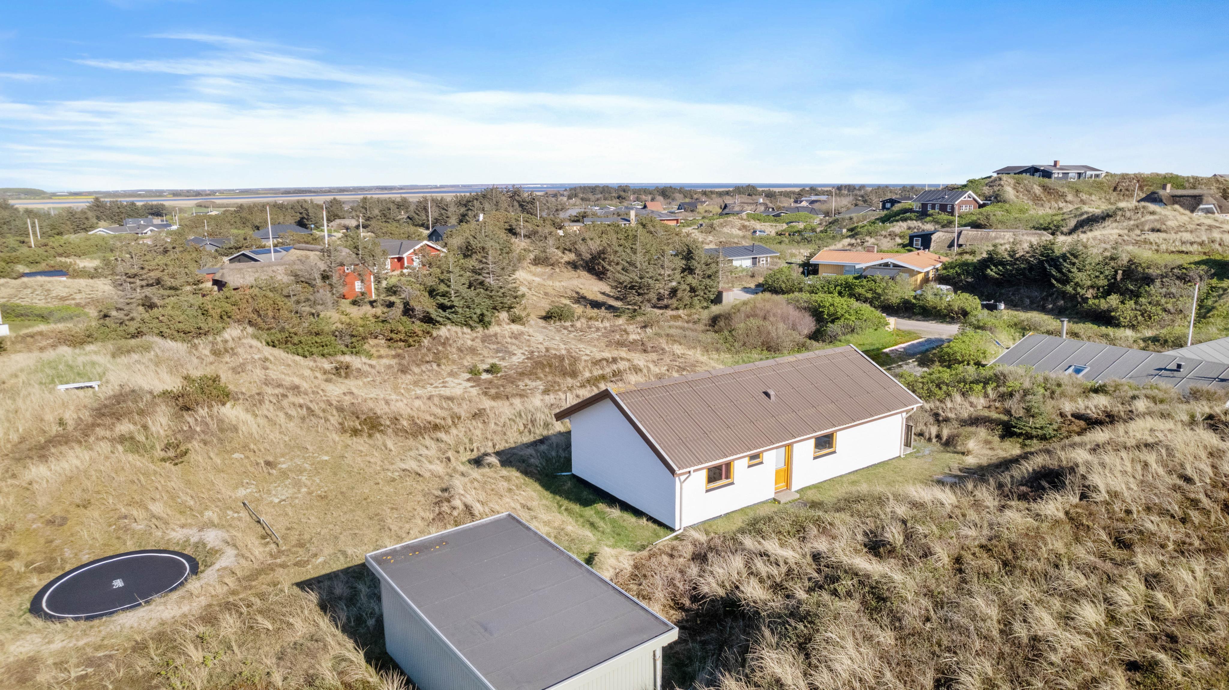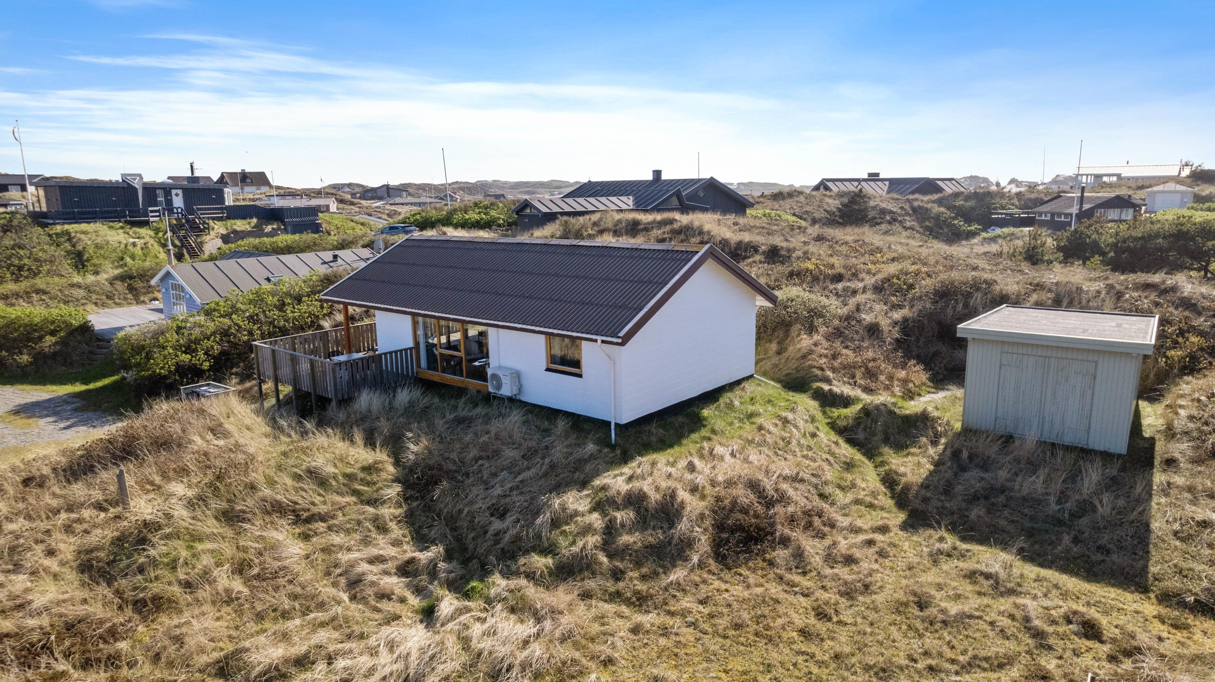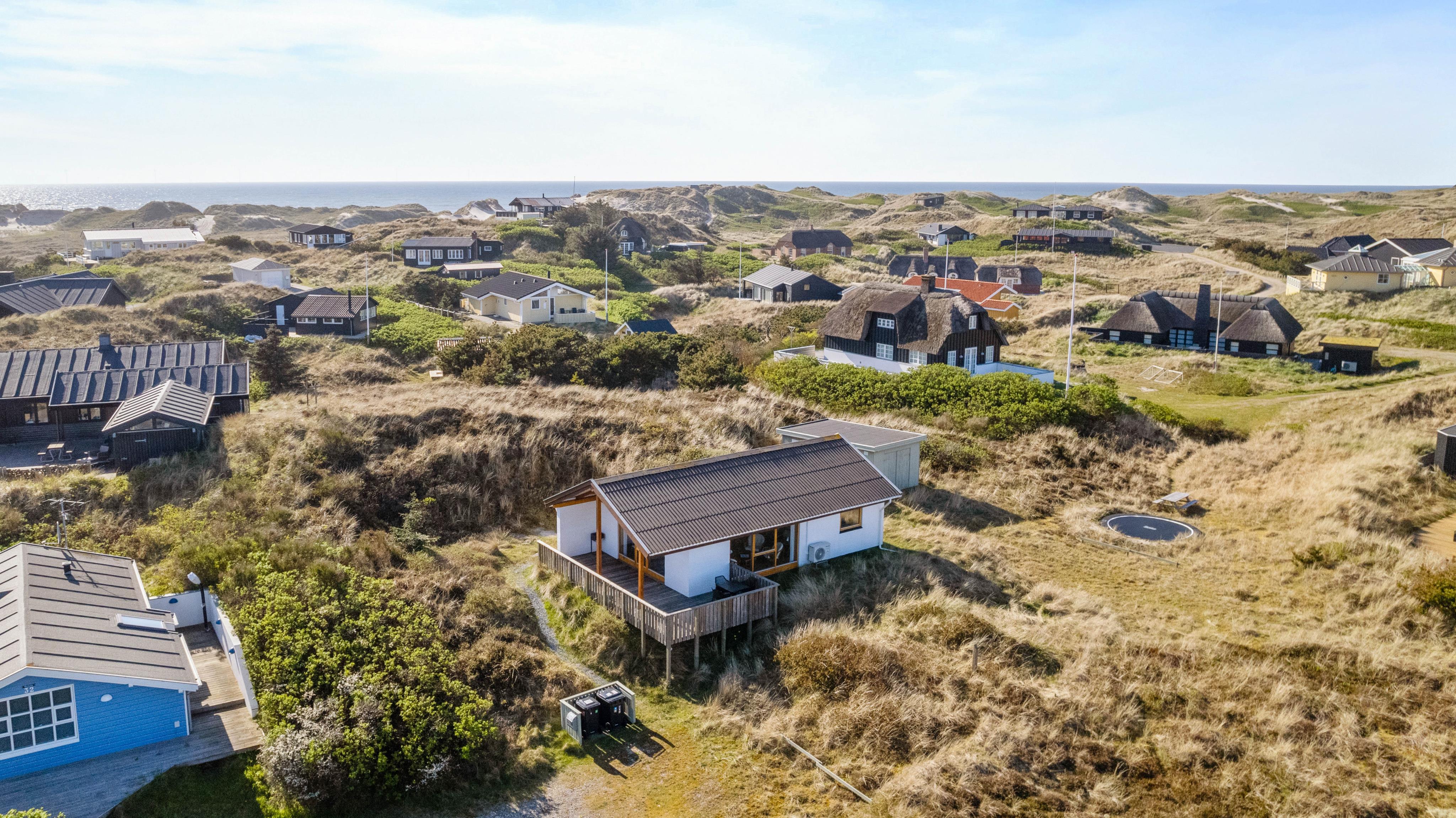 Sommerhuset er højt beliggende på en kuperet klitgrund blot få minutters gang fra Vesterhavet. Den forhøjede beliggenhed er med til at give huset det mere privatliv, som man jo ønsker på en ferie. Fra husets terrasse – der er delvist overdækket – kan I nyde den friske luft fra havet og den fine udsigt ud over græsser og marehalm.