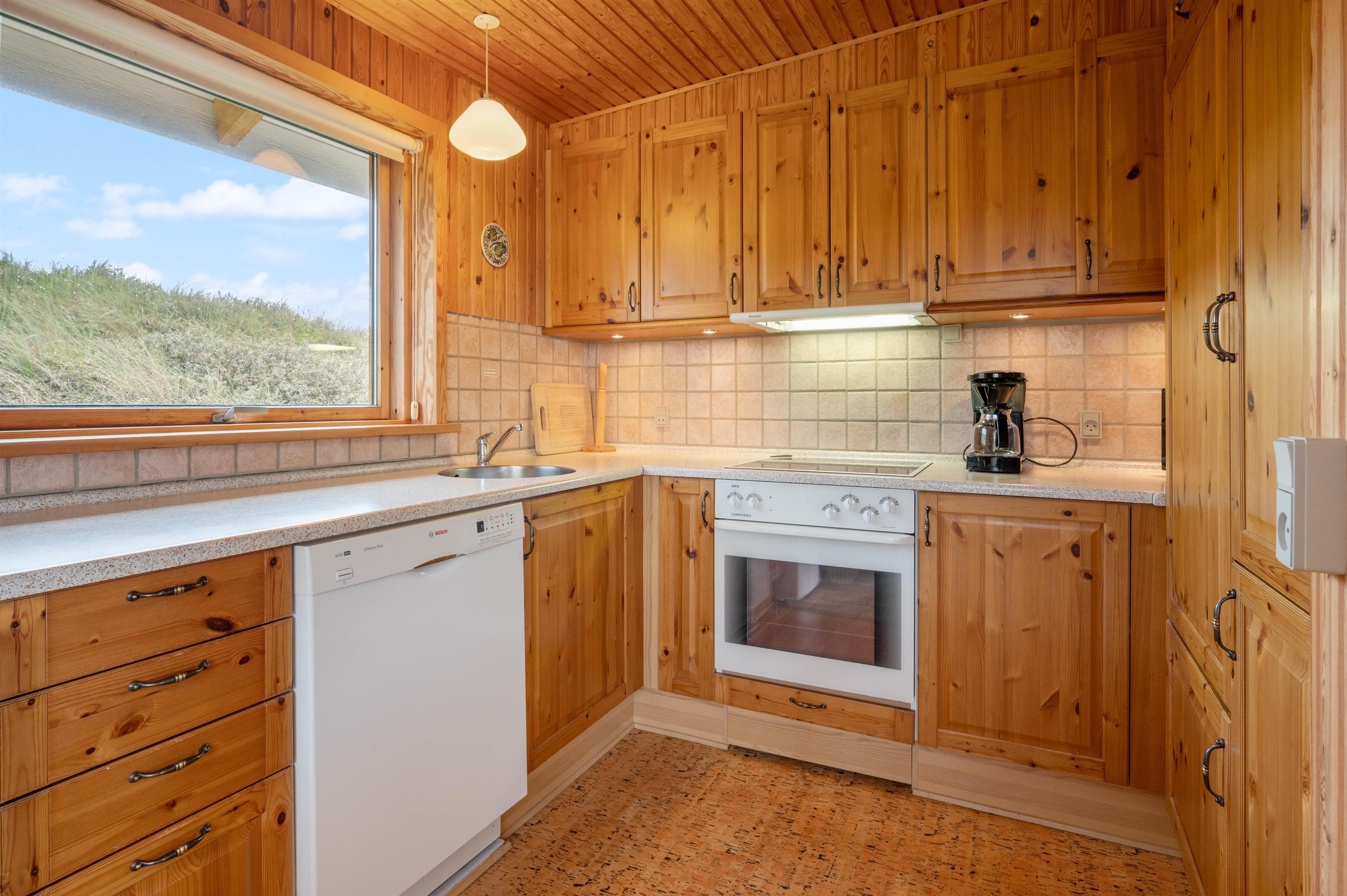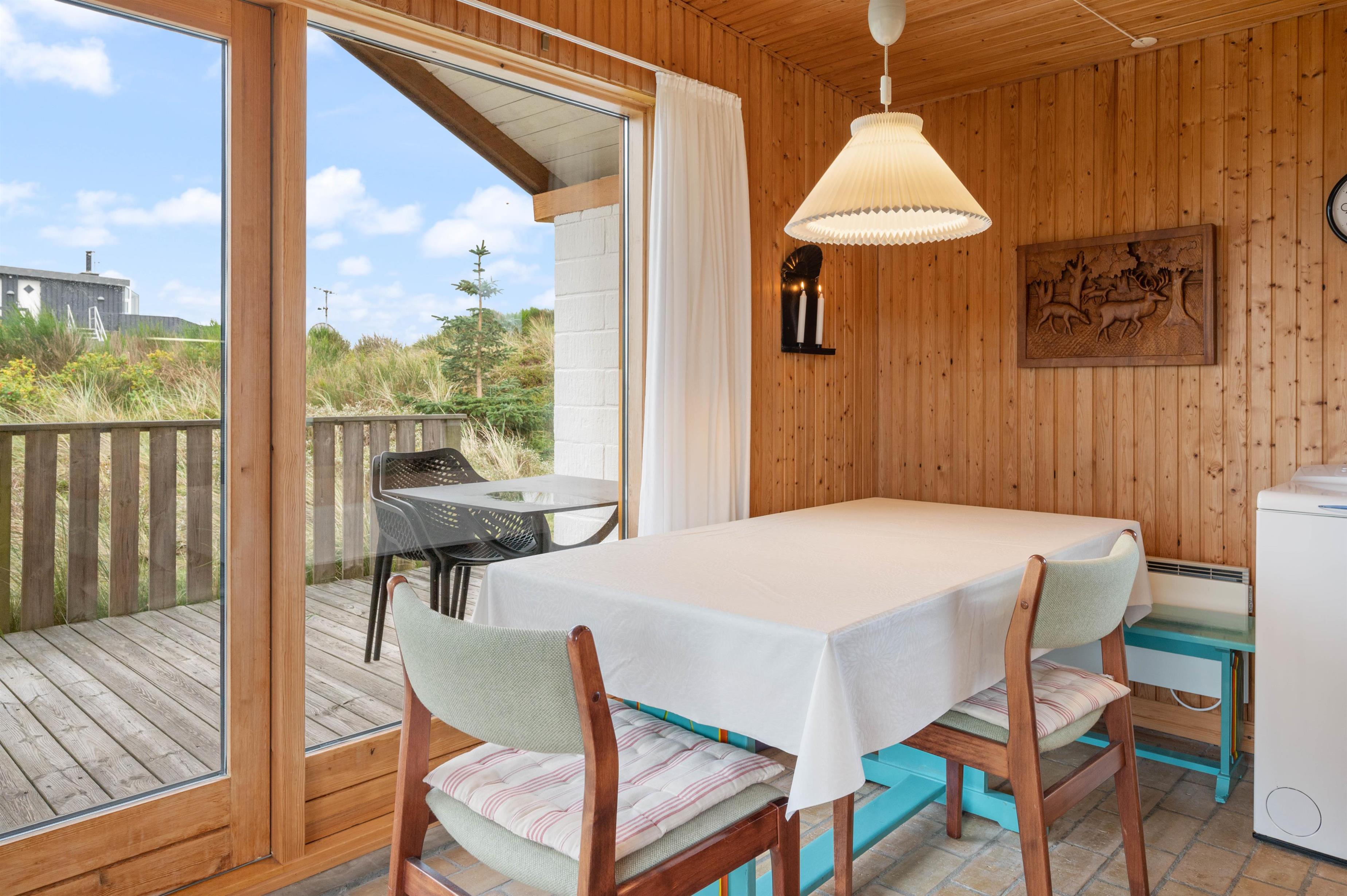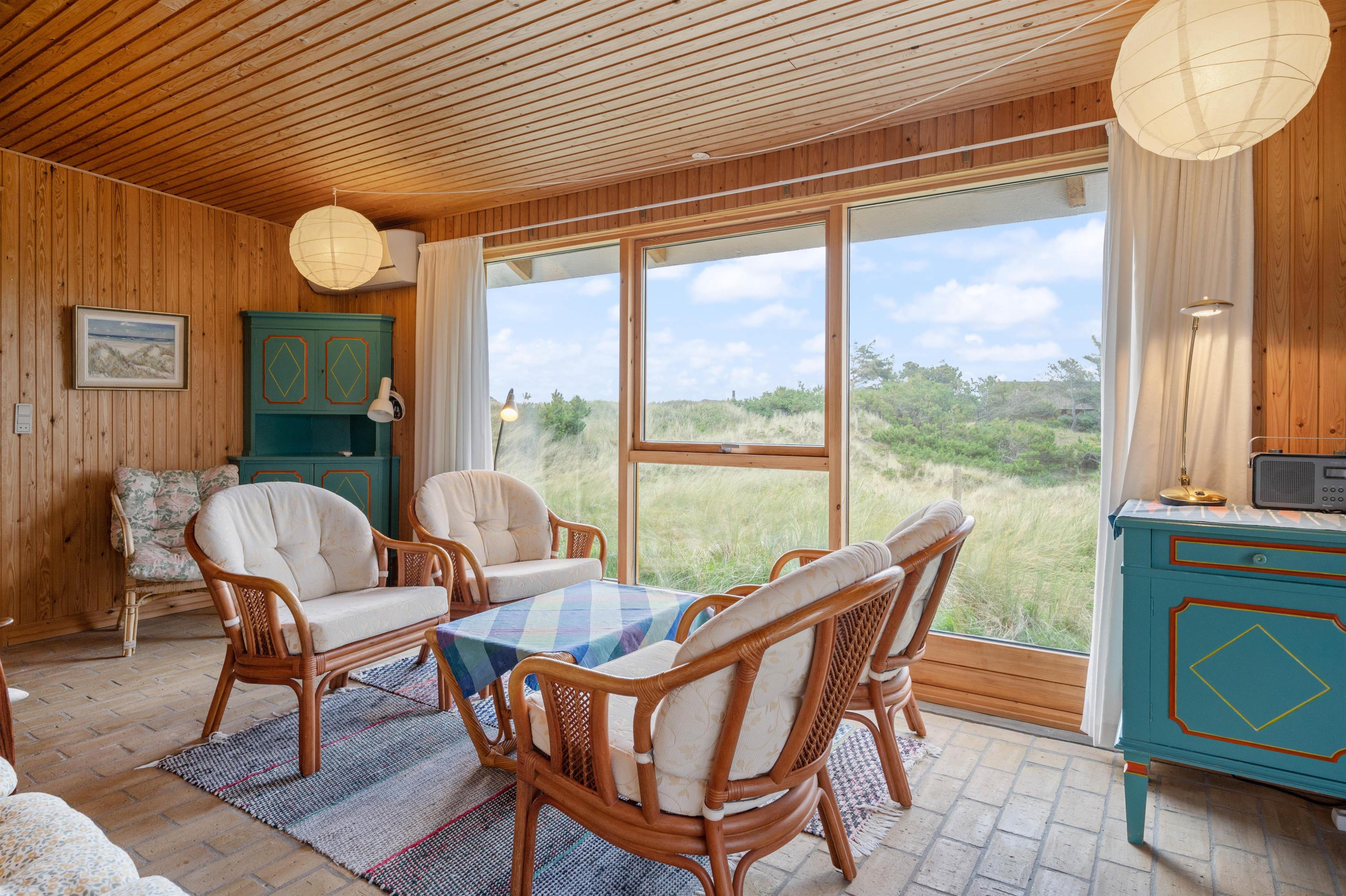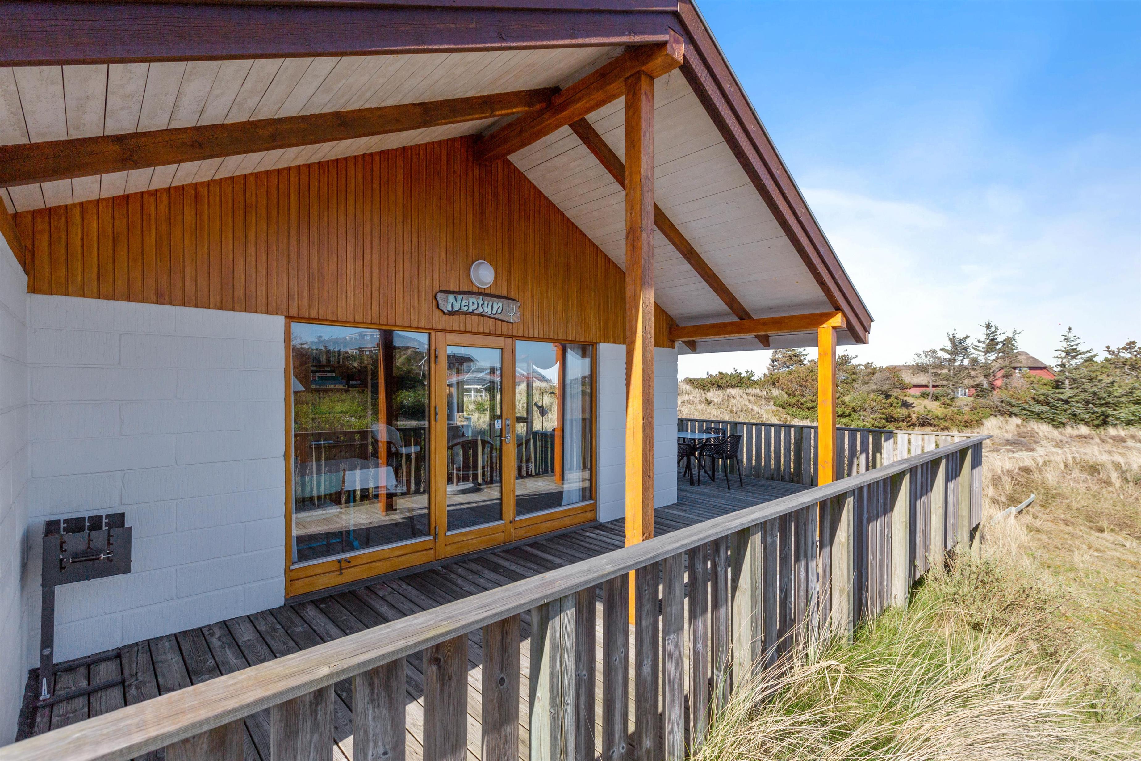 Sommerhuset er højt beliggende på en kuperet klitgrund blot få minutters gang fra Vesterhavet. Den forhøjede beliggenhed er med til at give huset det mere privatliv, som man jo ønsker på en ferie. Fra husets terrasse – der er delvist overdækket – kan I nyde den friske luft fra havet og den fine udsigt ud over græsser og marehalm.